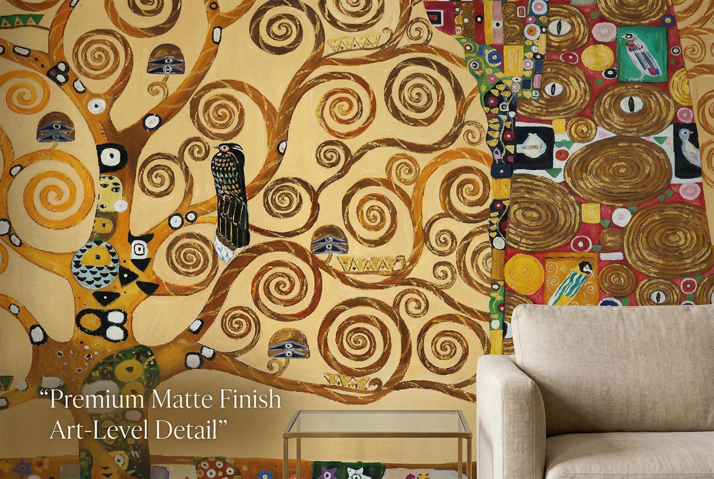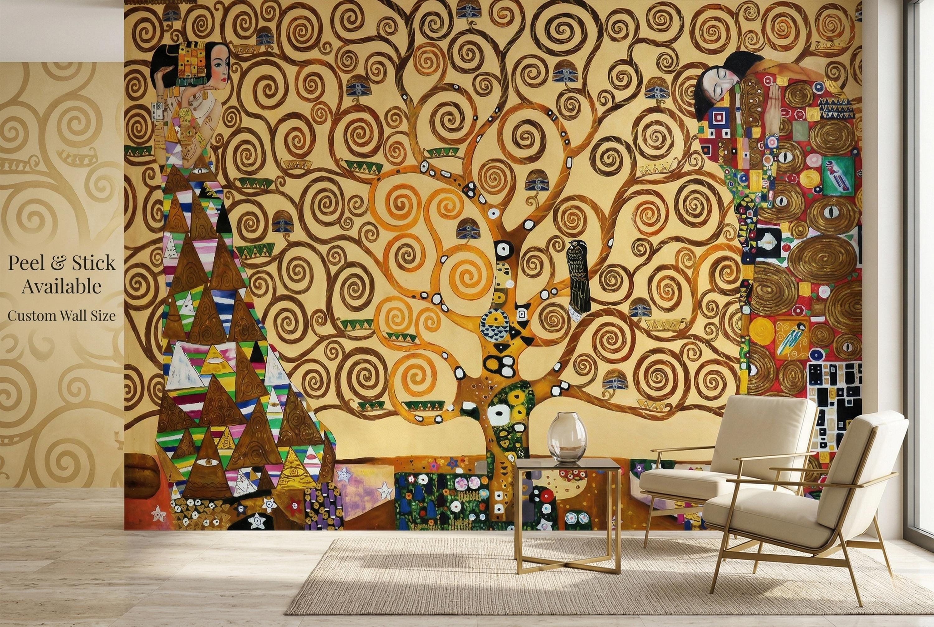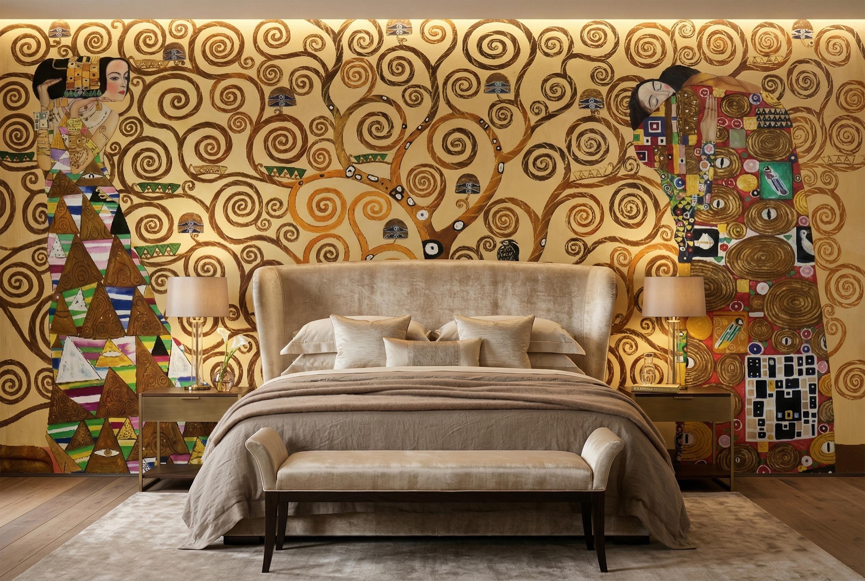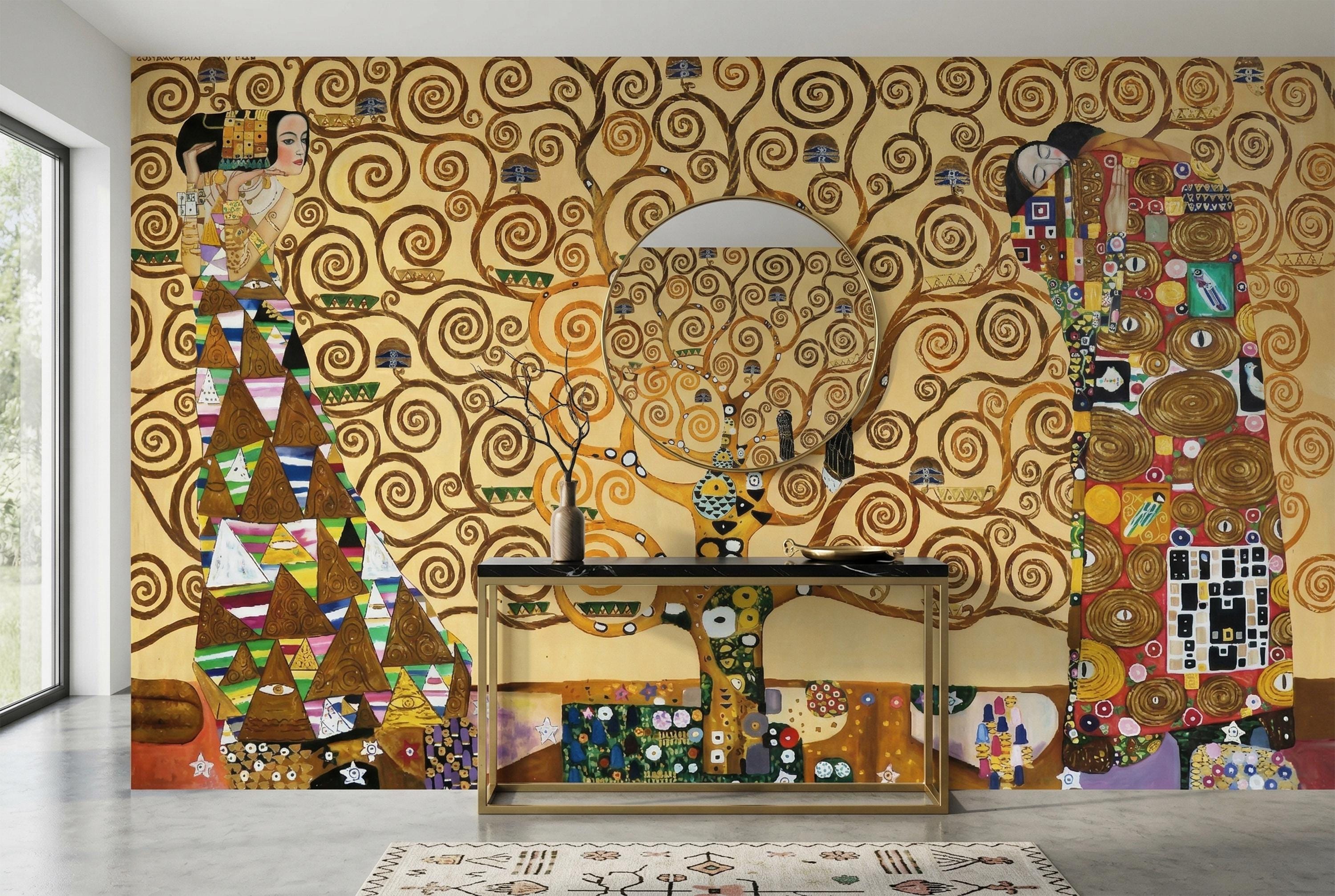 Bring timeless elegance into your space with this Klimt-inspired Tree of Life wallpaper mural. Rich golden tones, swirling branches, and symbolic figures create a warm, artistic atmosphere—perfect for statement walls and refined interiors.