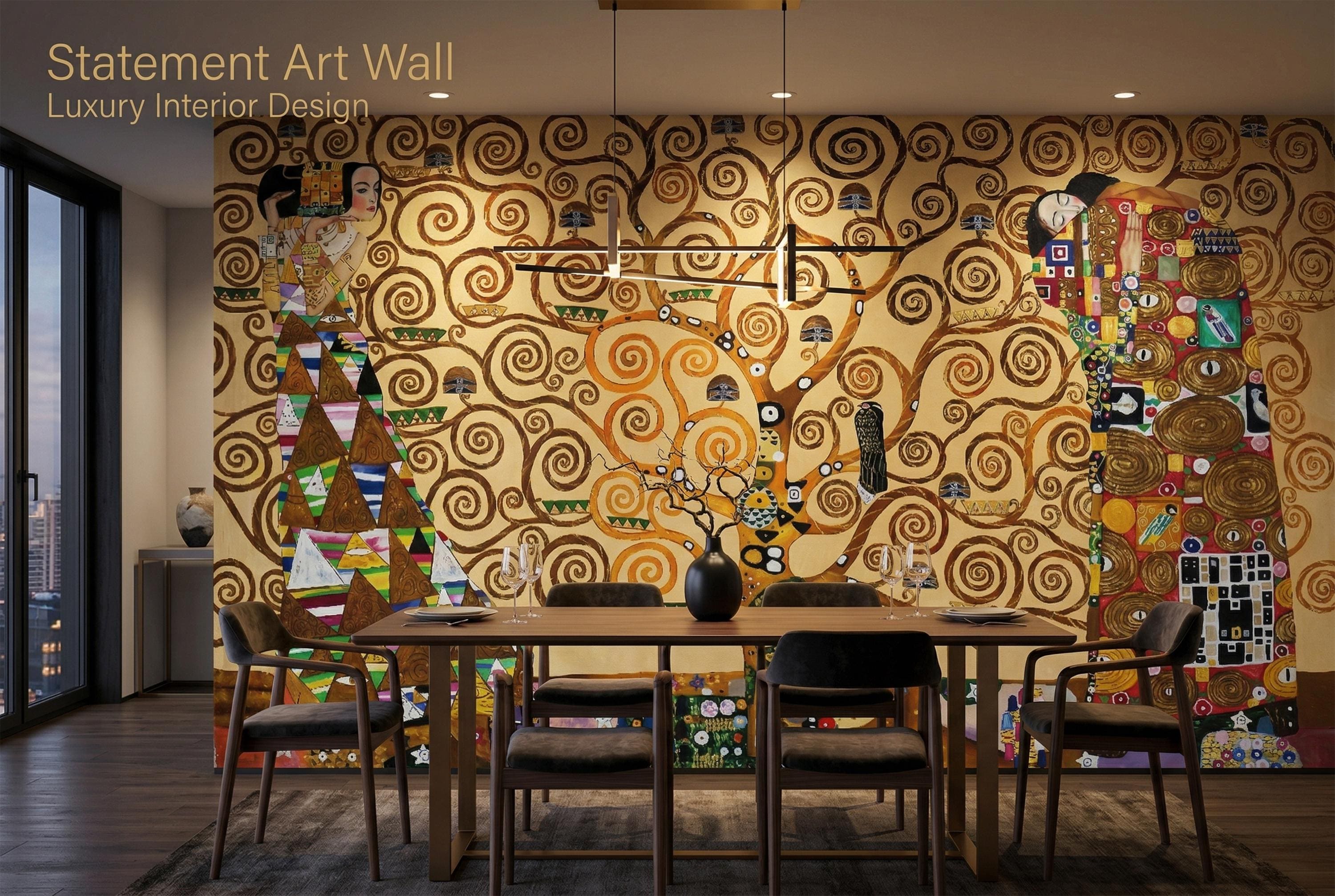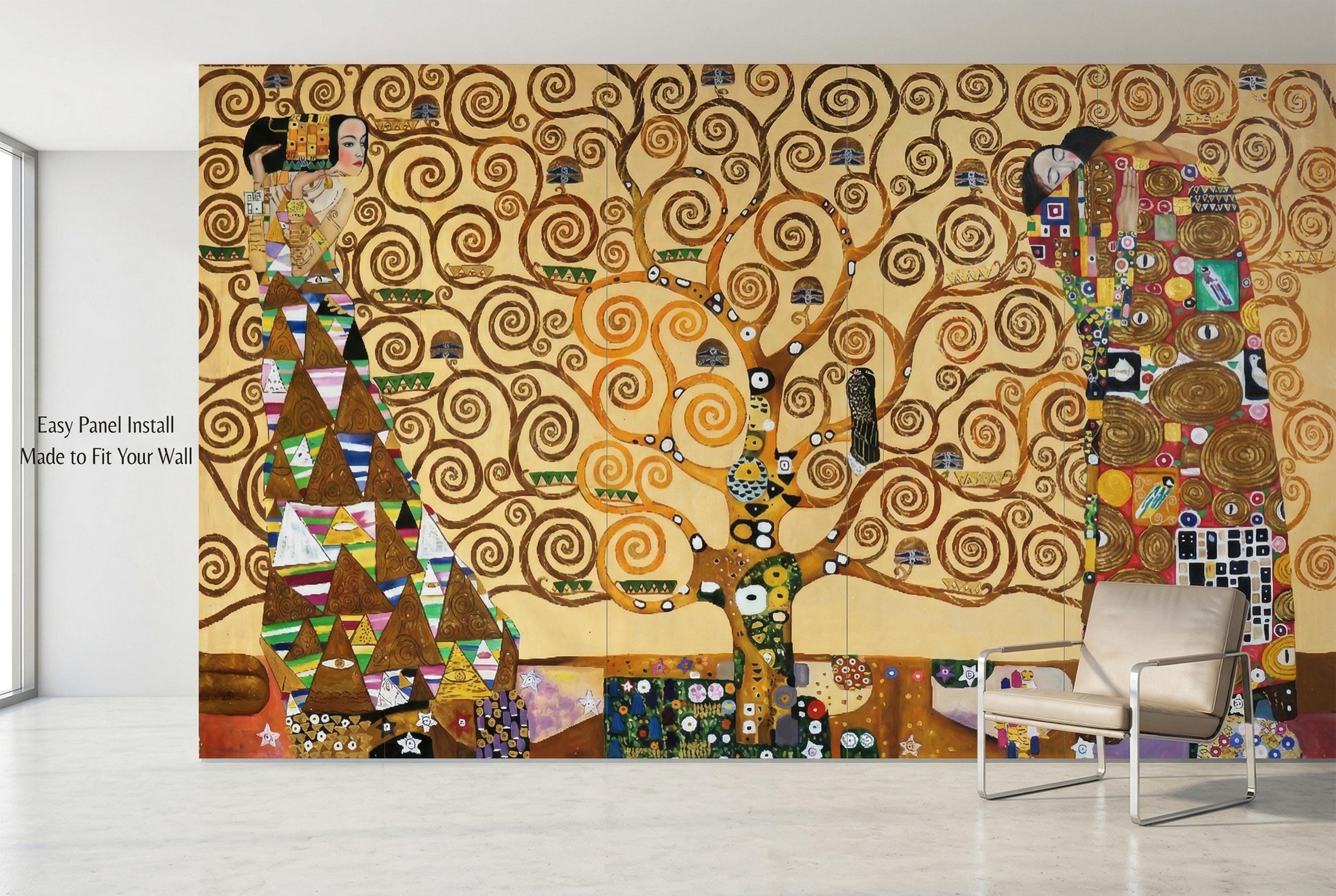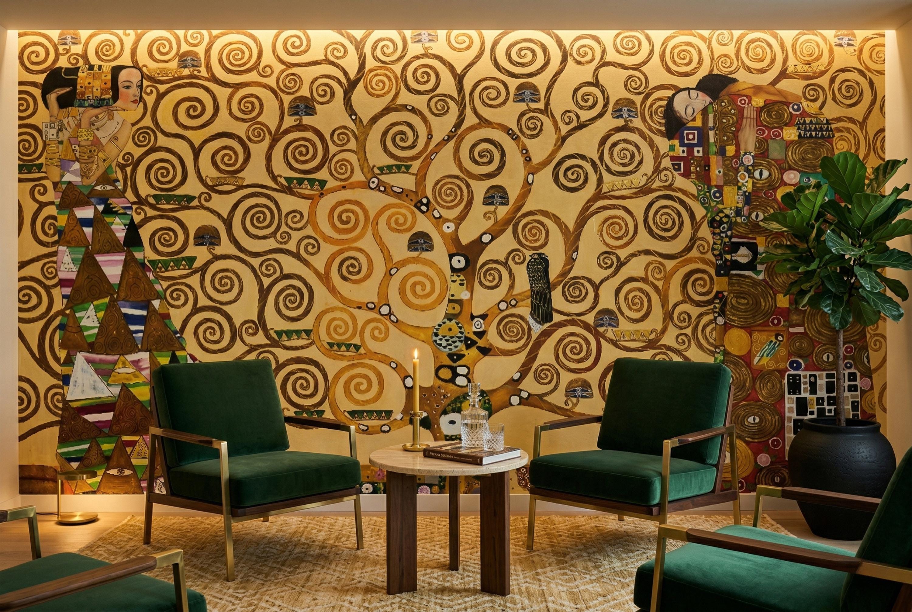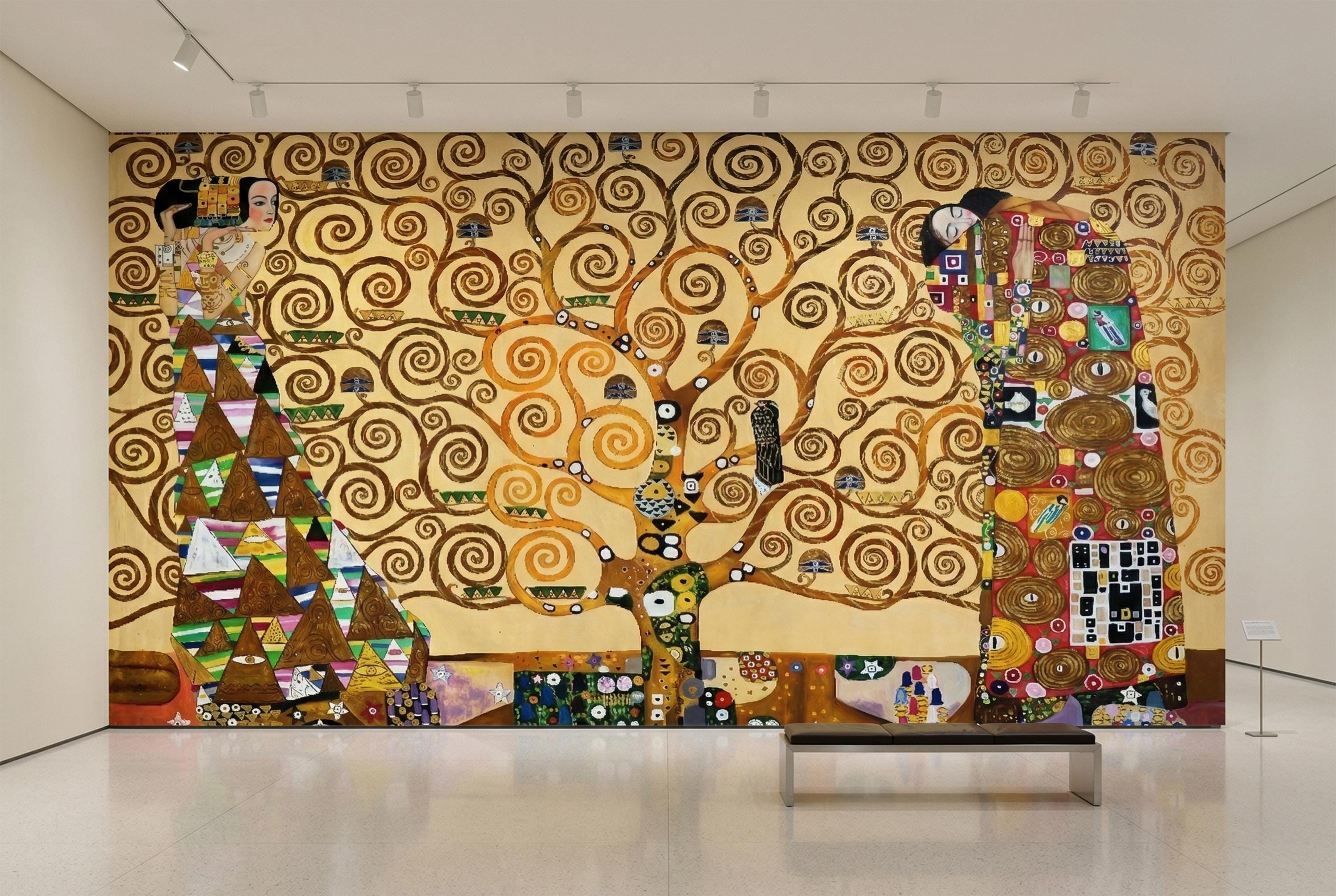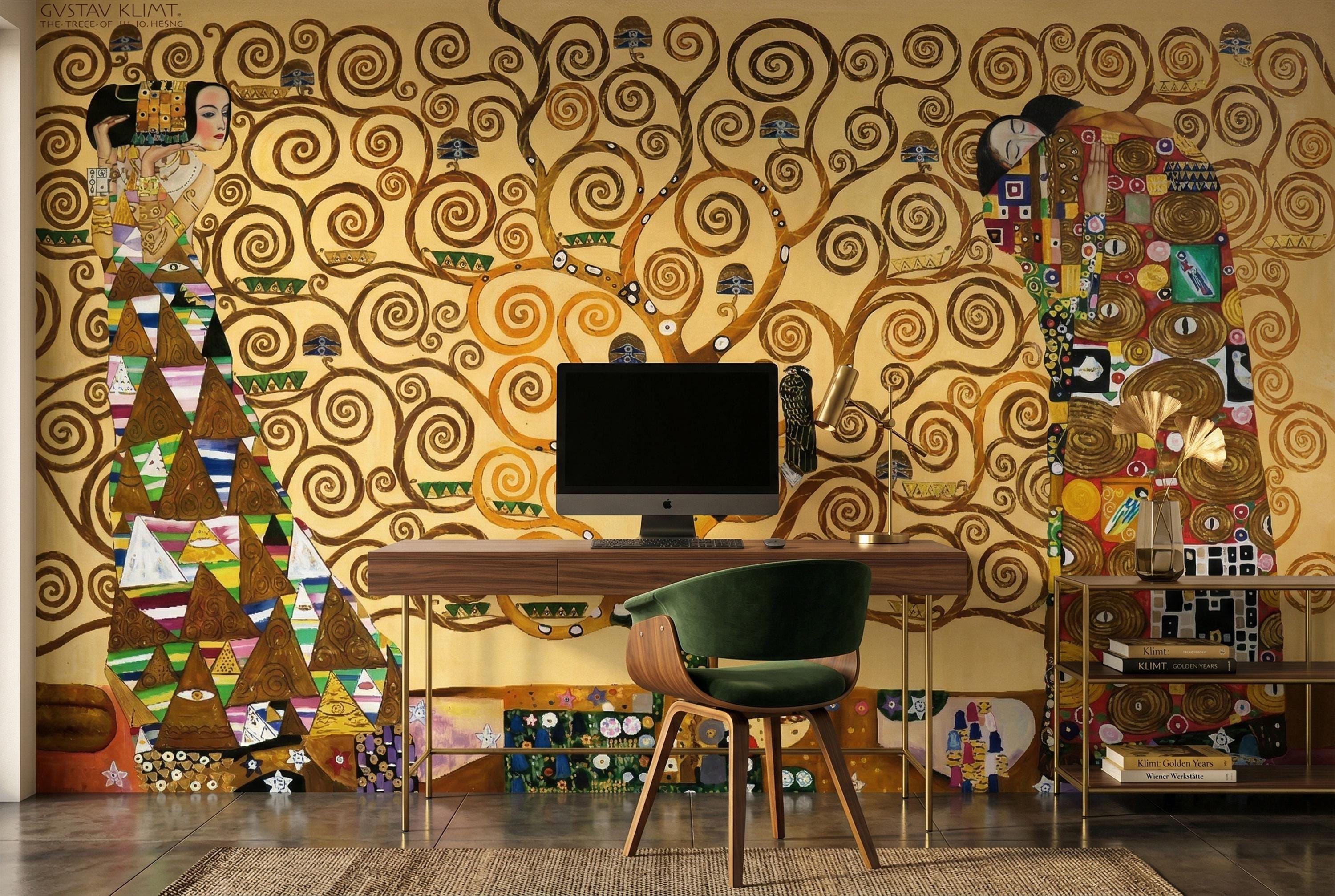 Bring timeless elegance into your space with this Klimt-inspired Tree of Life wallpaper mural. Rich golden tones, swirling branches, and symbolic figures create a warm, artistic atmosphere—perfect for statement walls and refined interiors.