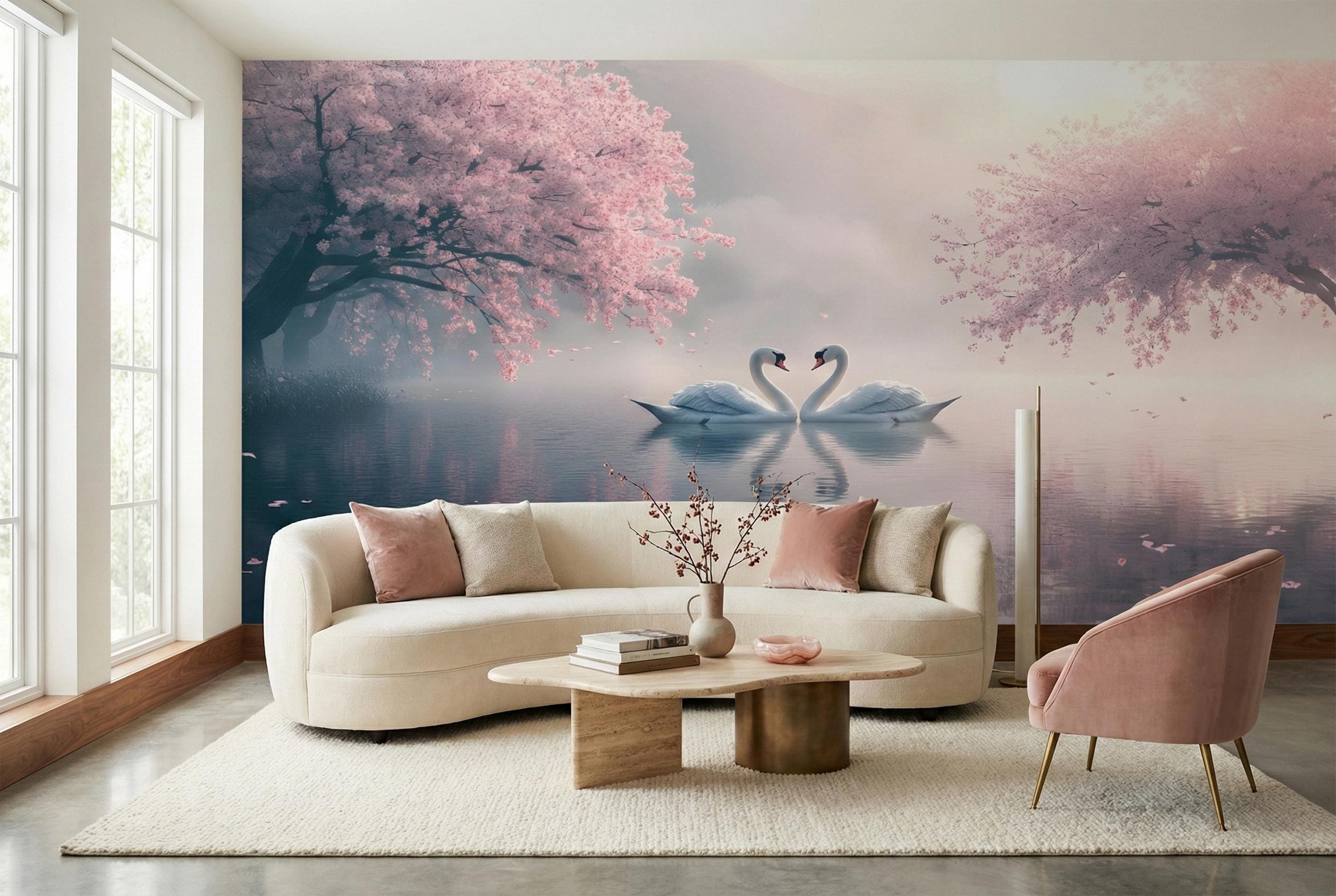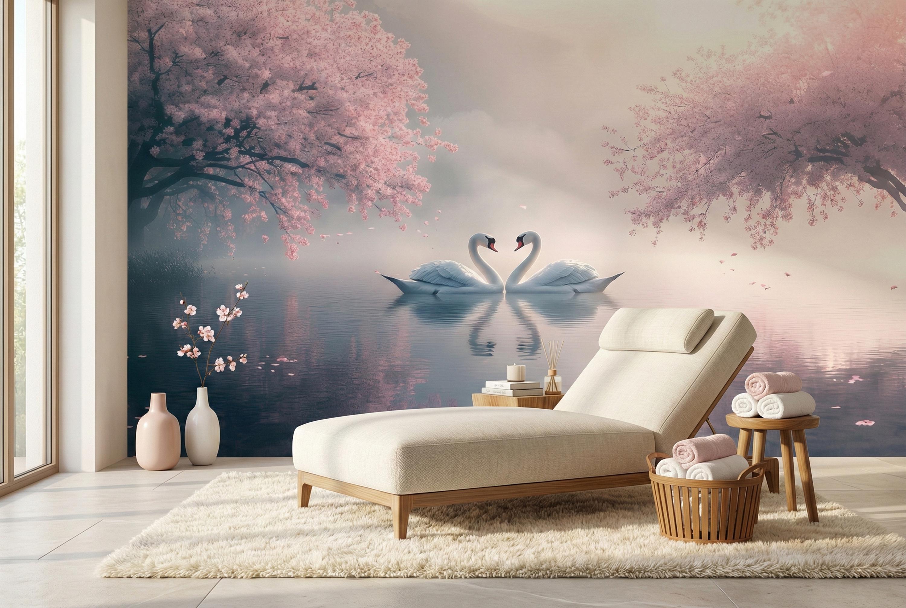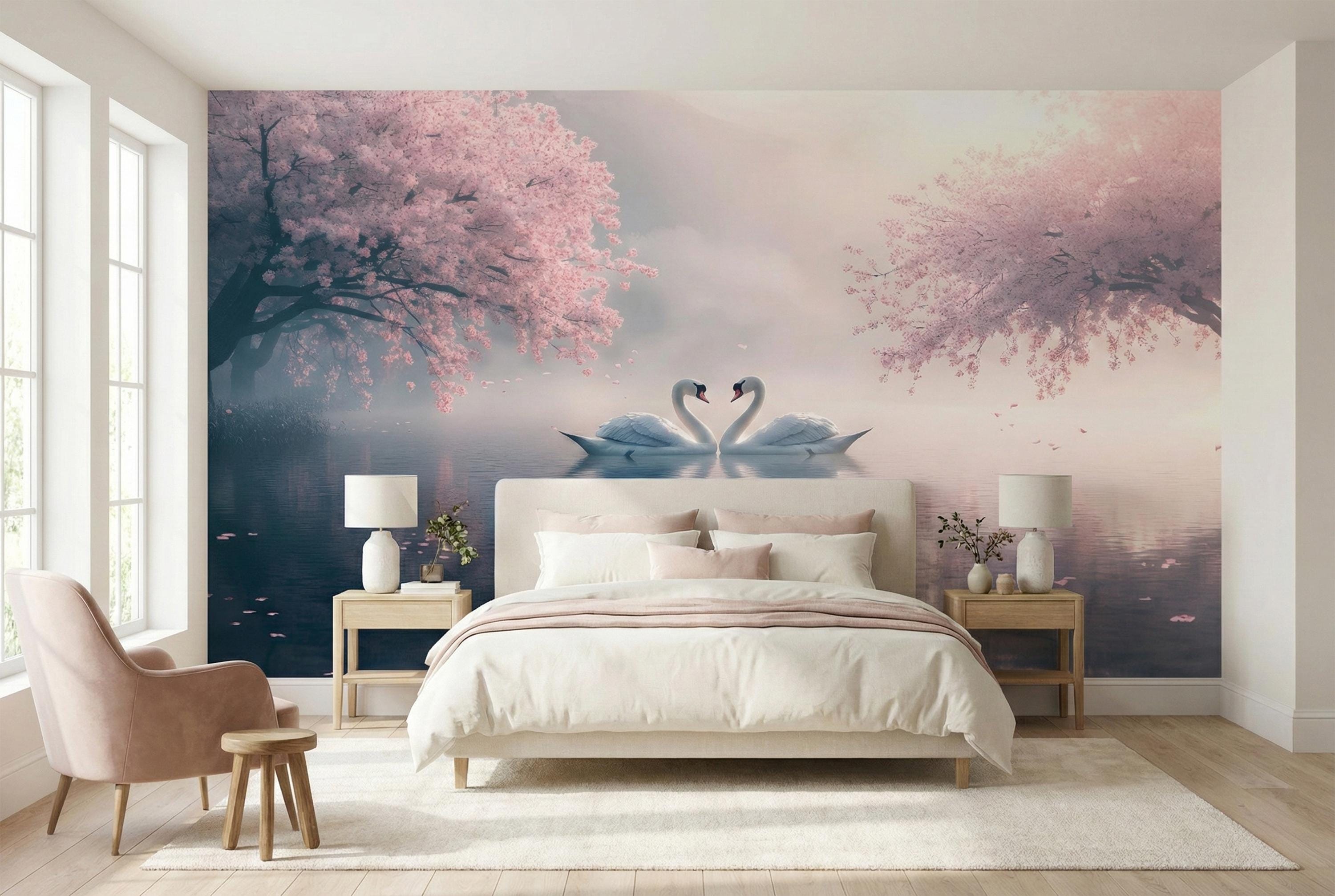 Let the graceful swans and gentle cherry blossoms create a romantic sanctuary on your walls, inviting a sense of calm and natural beauty into your home.