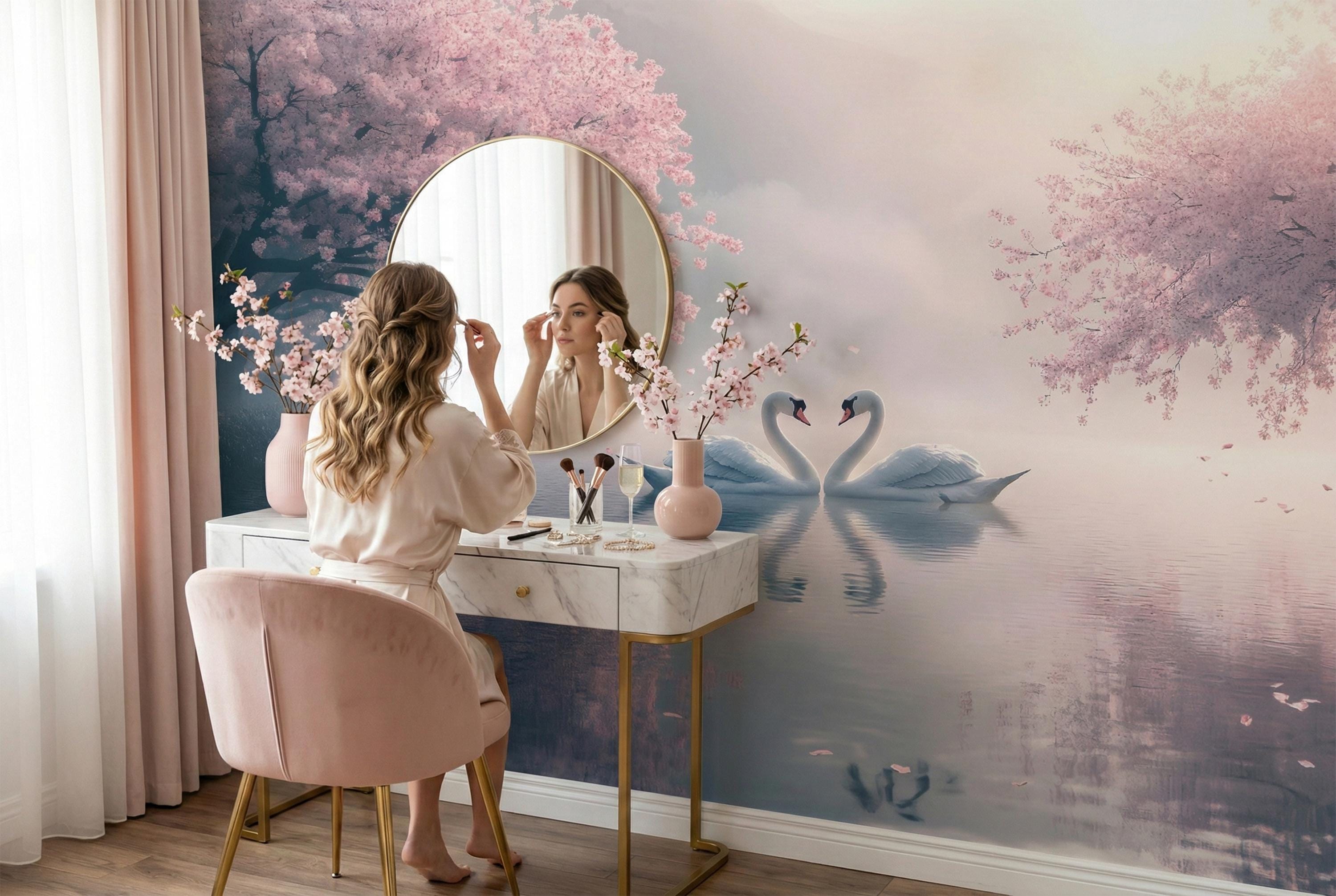 This pink cherry blossom swan wall mural captures a moment of quiet romance and timeless serenity. Delicate blush tones melt into a misty spring landscape, creating a dreamy atmosphere that feels calm, elegant, and effortlessly beautiful.
