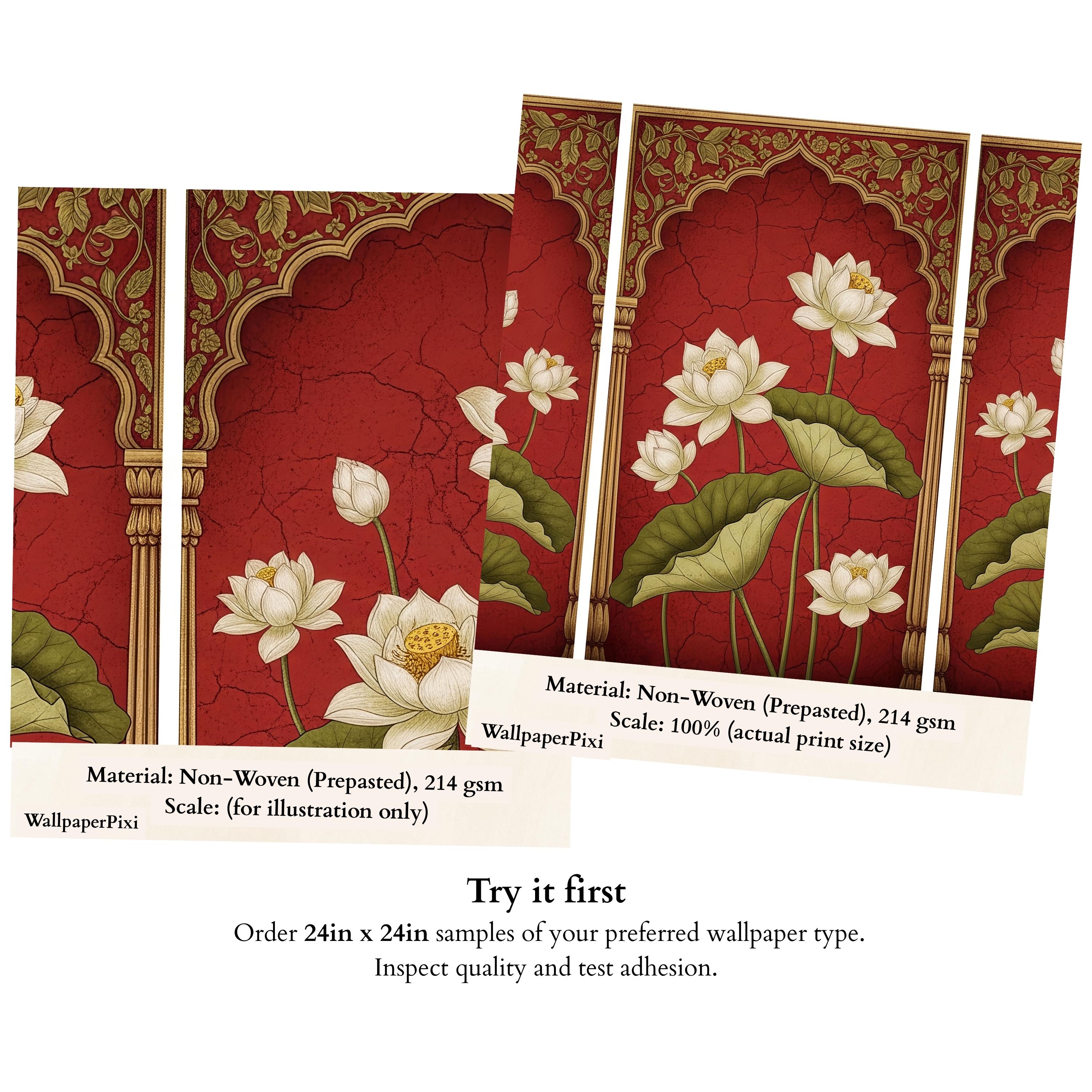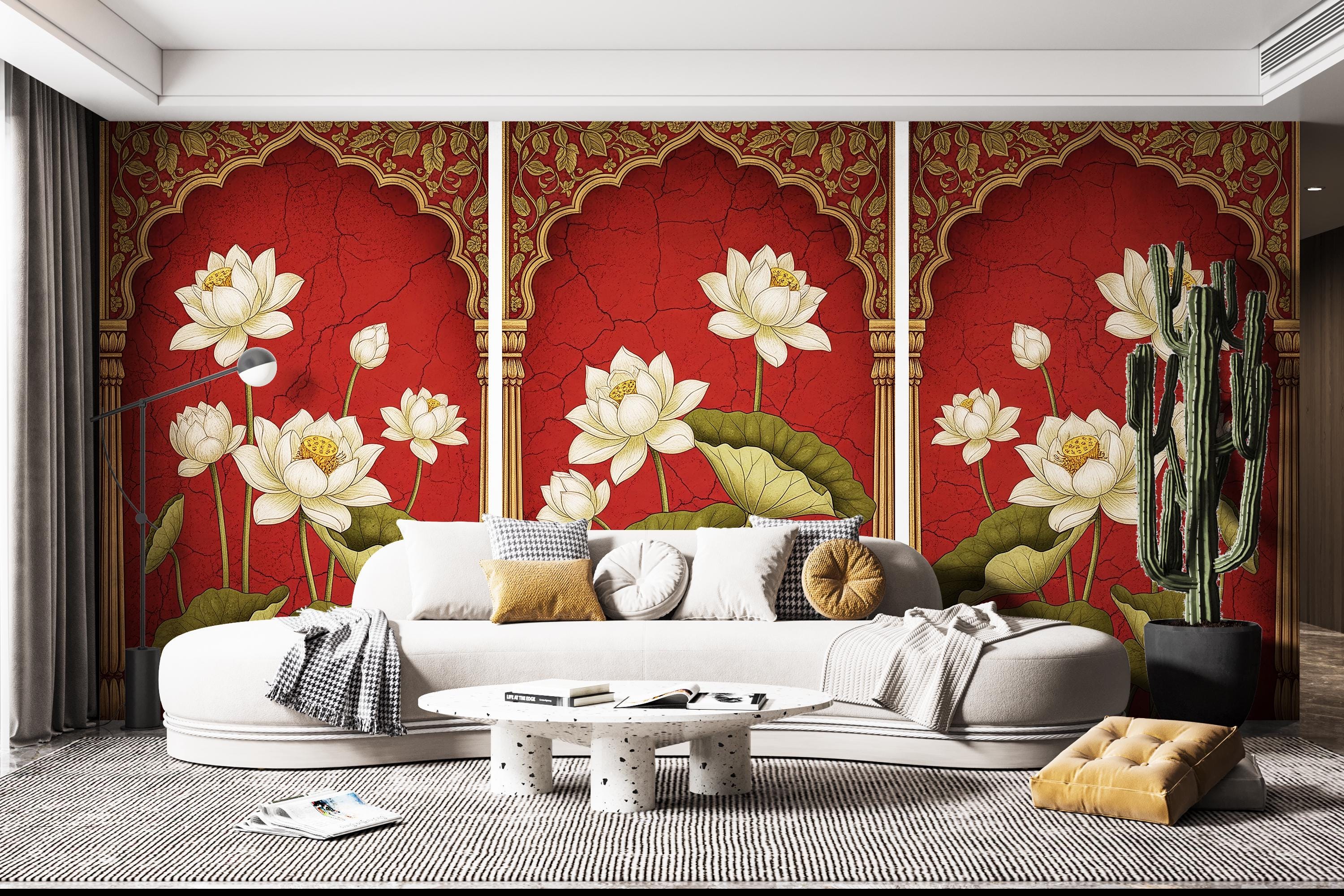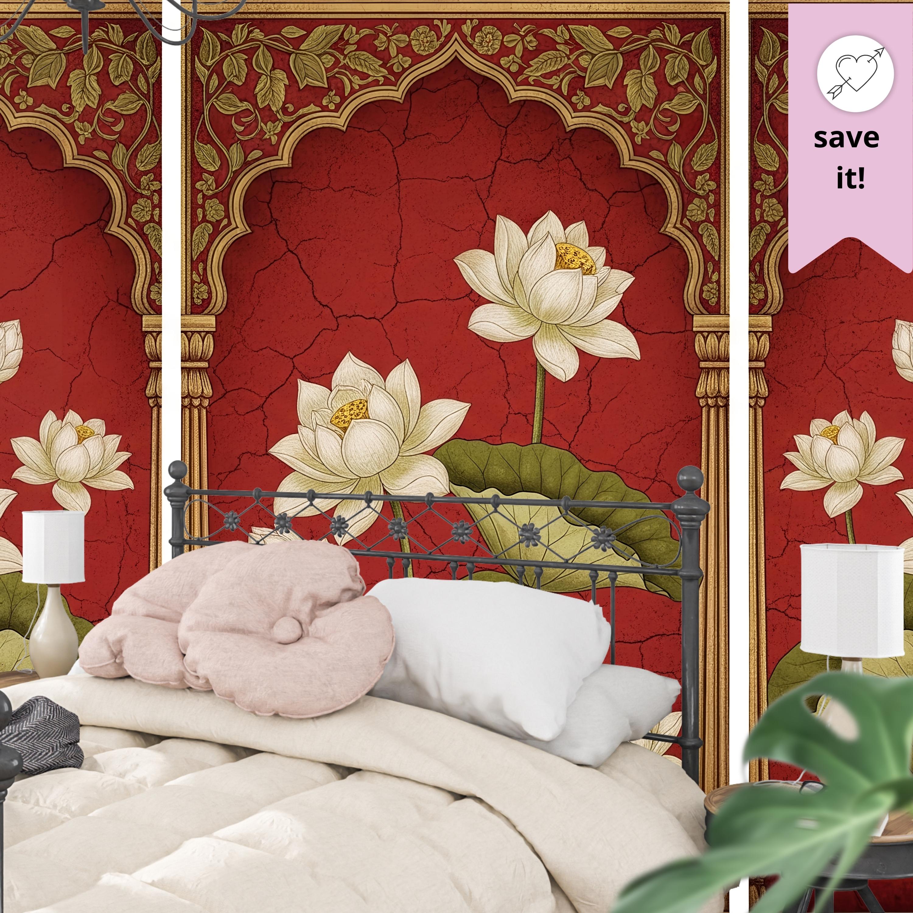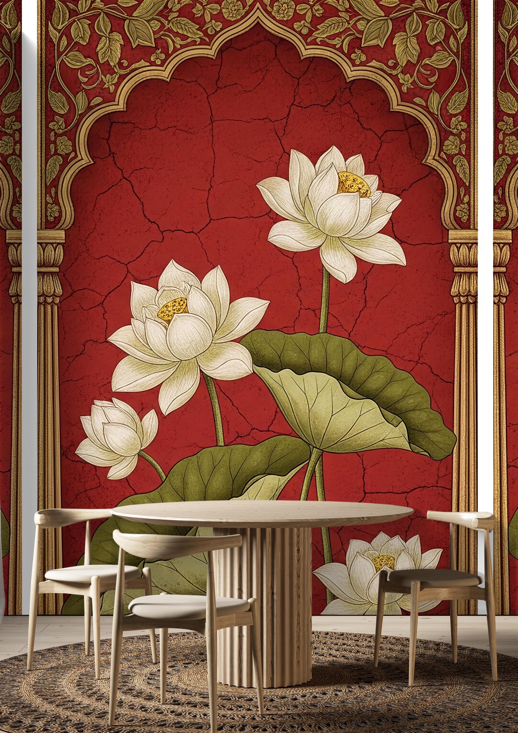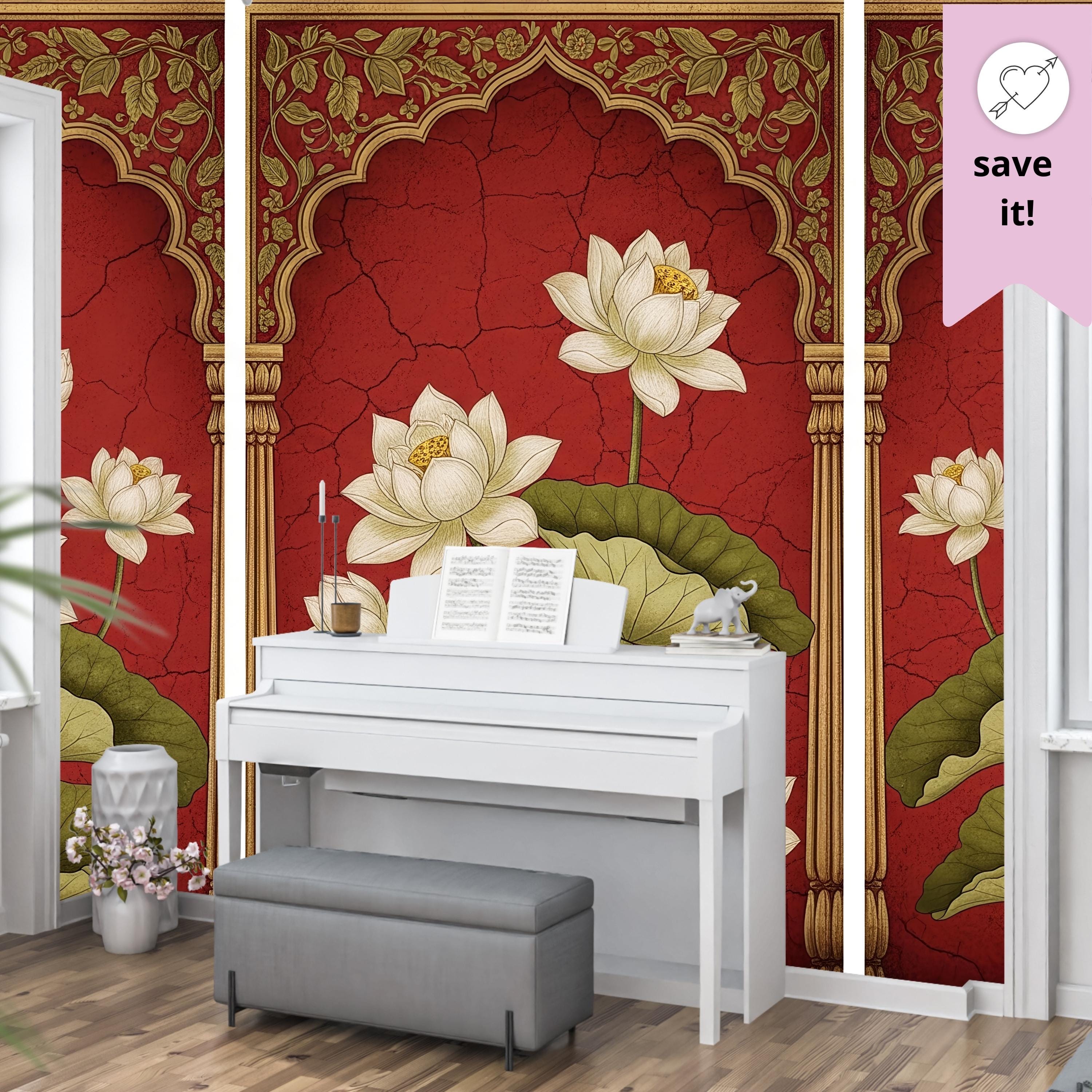 Transform your walls into a masterpiece with this Luxury Indian Floral Wall Mural featuring an ornate archway and blooming lotus designs. Inspired by vintage Indian artistry, this wallpaper combines elegance with timeless charm. Perfect for accent walls in living rooms, bedrooms, or offices, this mural adds sophistication and warmth to any space.