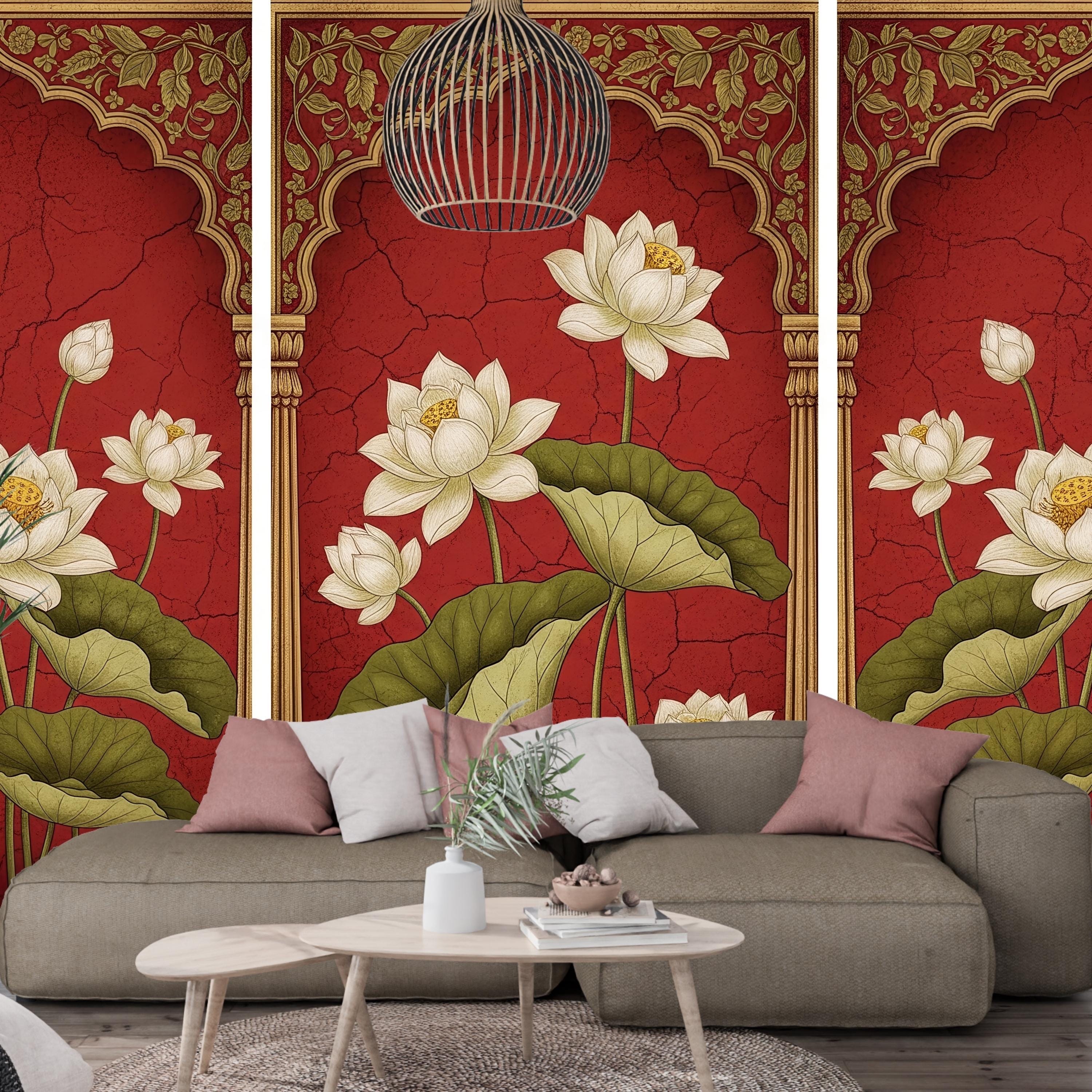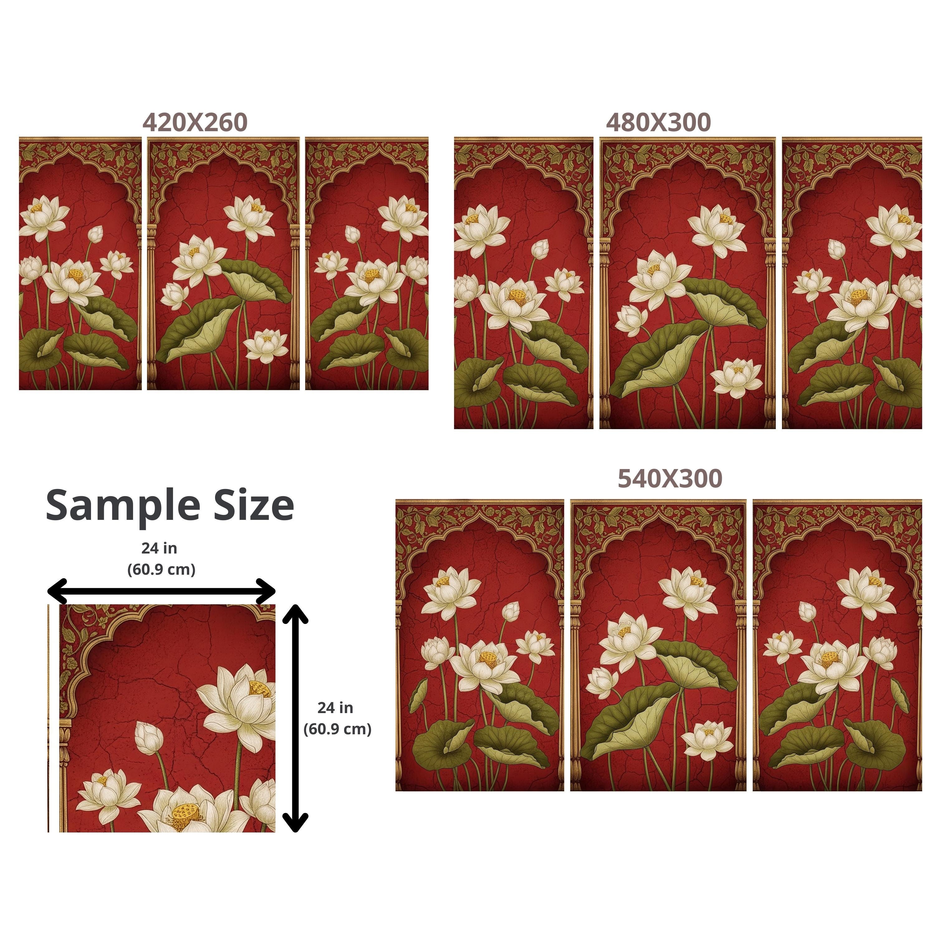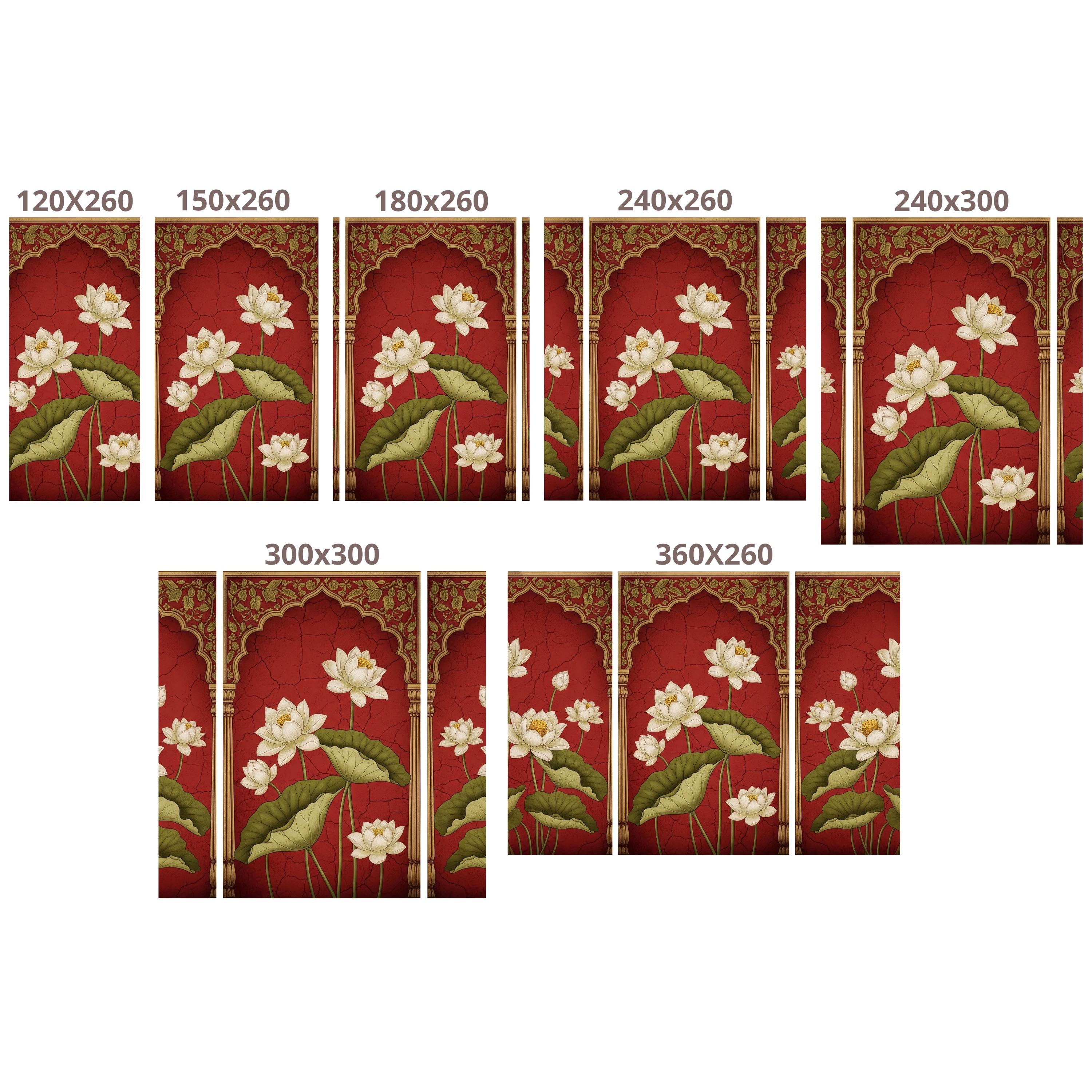 Design: Ornate archways with lotus and floral patterns in rich vintage tones.