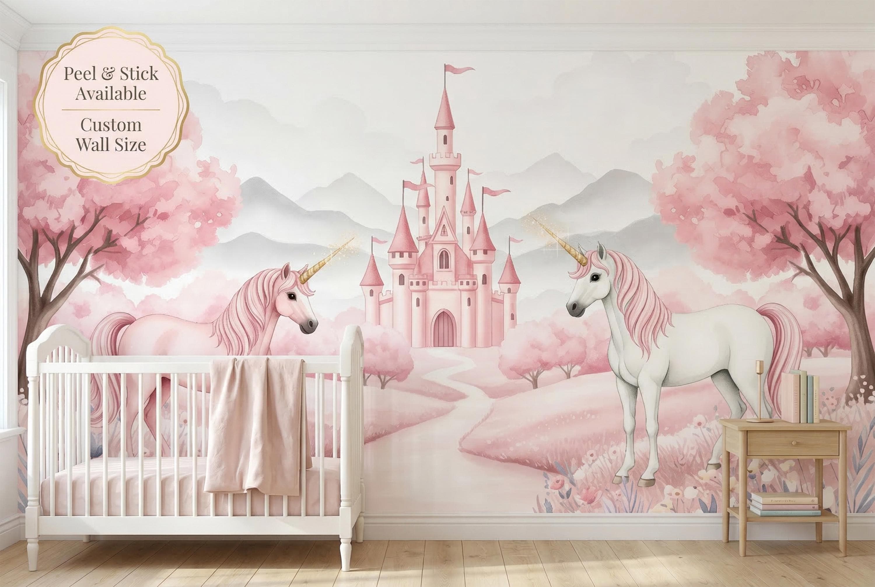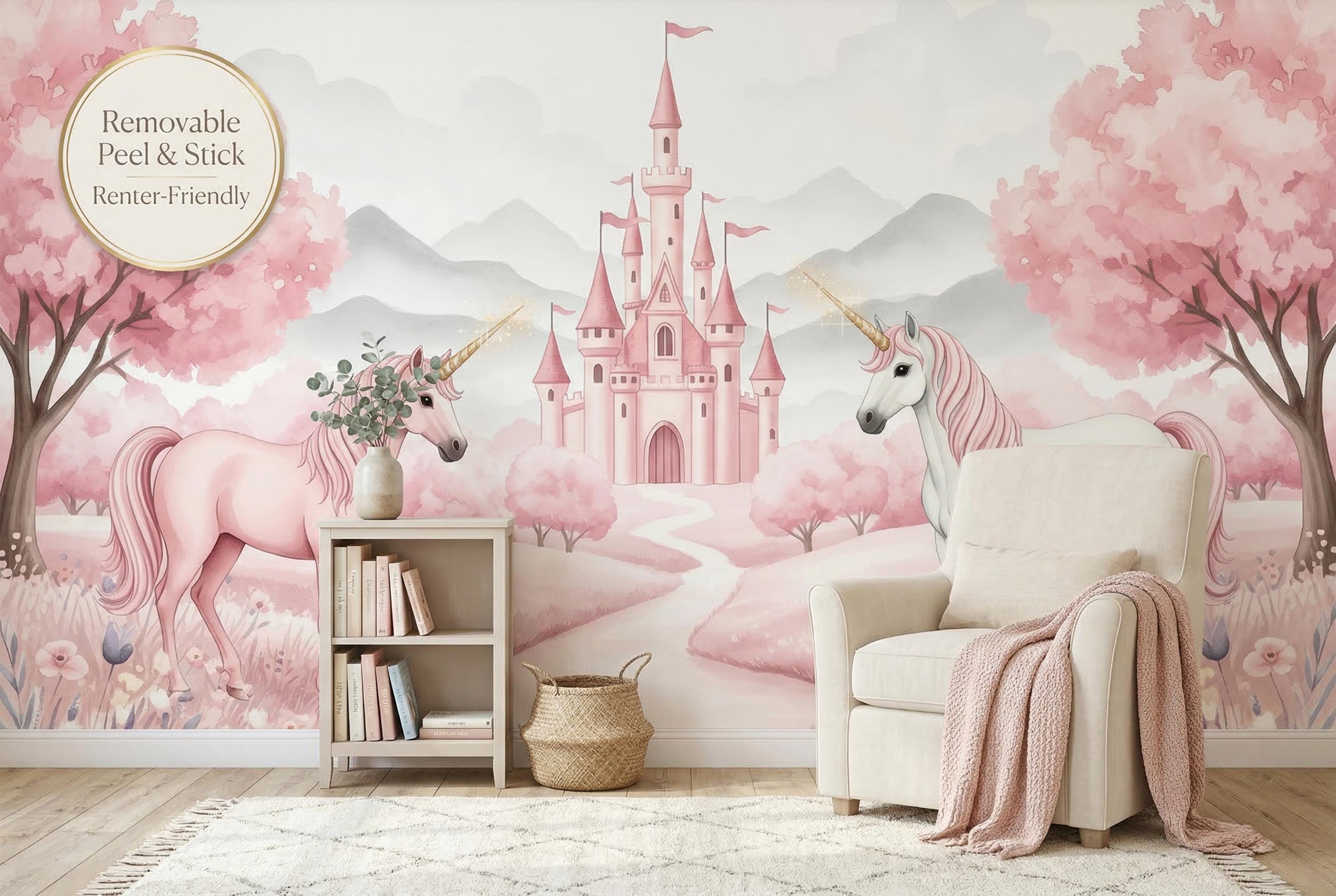 This pink unicorn castle peel and stick mural by WallpaperPixi is the softest, most romantic girls room design we have ever created. A blush-pink unicorn with a flowing rose mane and a glittering gold horn faces a white unicorn on a winding stone path — both leading toward a delicate pink castle with soaring spires and pink pennant flags, framed by full-bloom cherry blossom trees in every shade of rose.