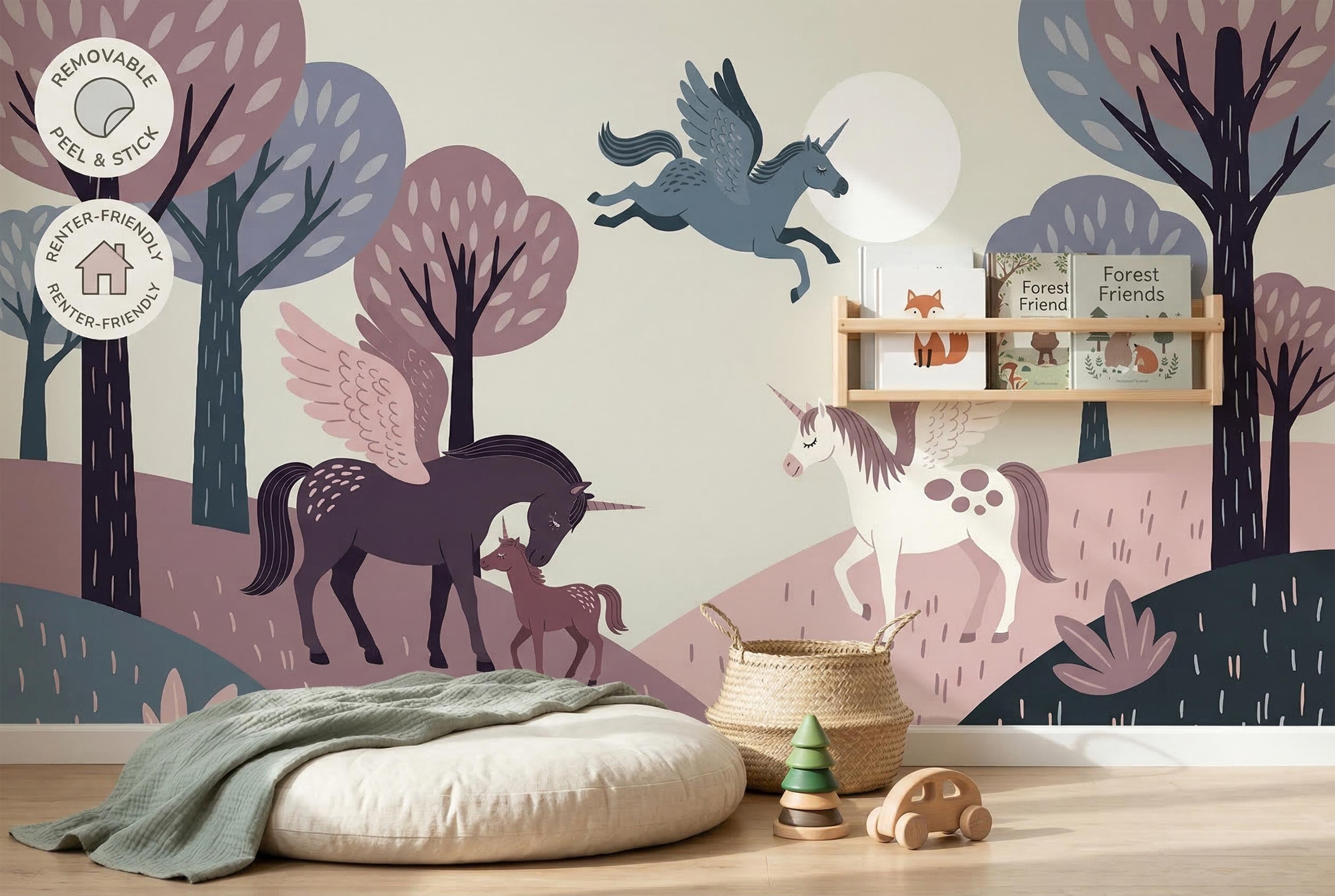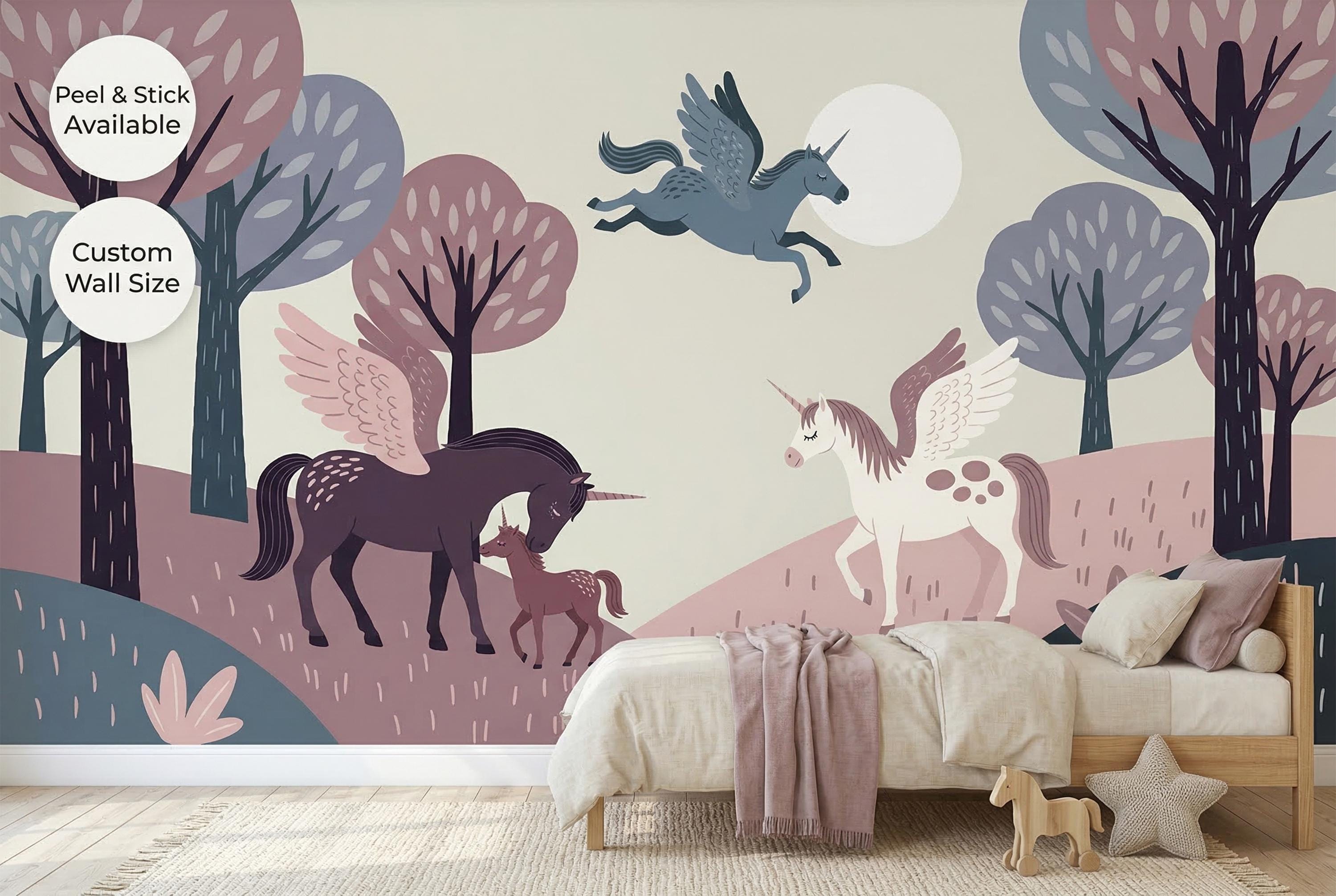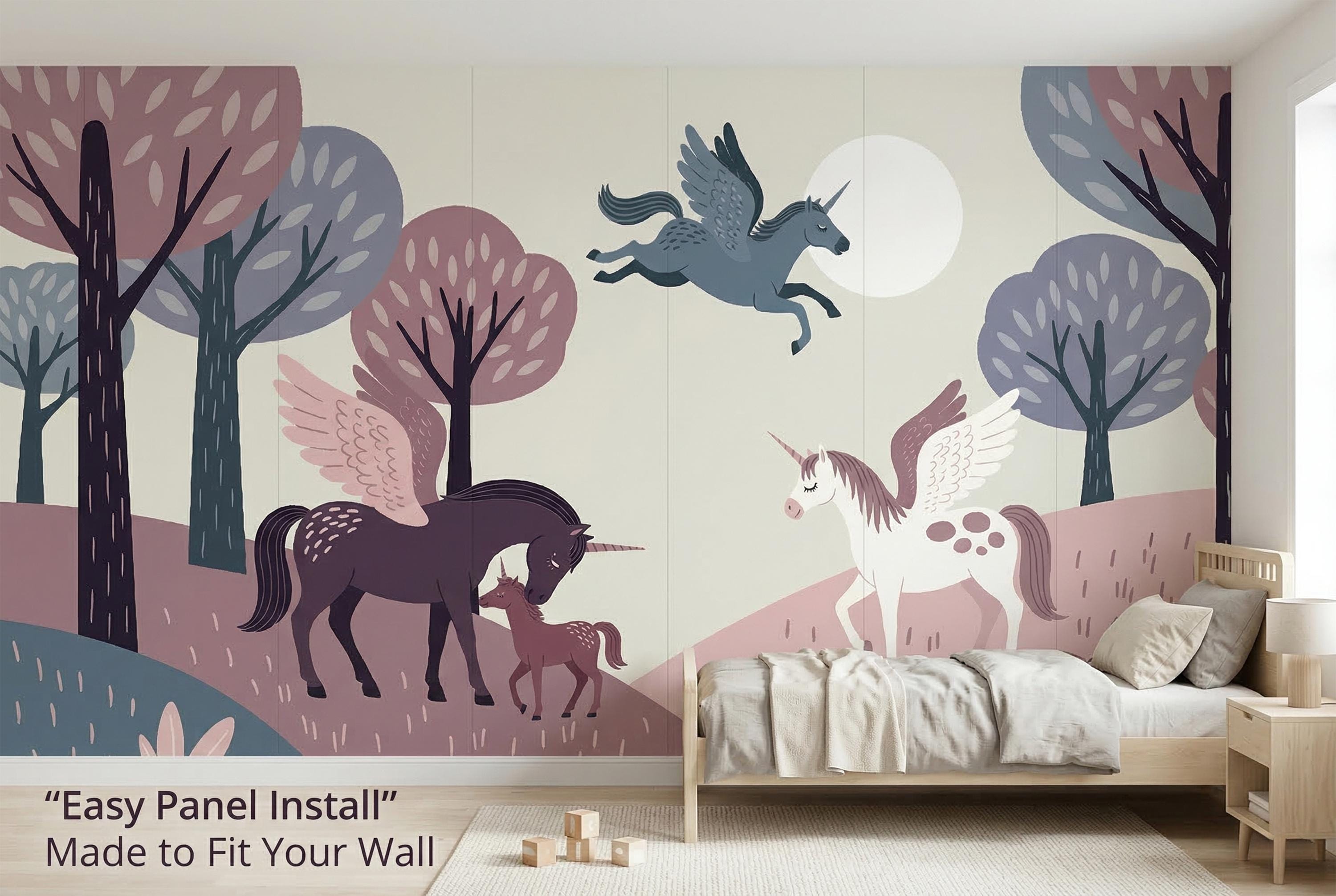 This unicorn family forest peel and stick mural by WallpaperPixi is unlike anything else in the children's room category. Four winged unicorns — a deep mauve mother with blush-pink feathered wings, her tiny brown foal, an elegant white alicorn, and a slate-blue flying unicorn soaring past a glowing full moon — inhabit a beautifully composed Nordic forest landscape of rolling hills and stylised blush, lavender, and teal trees.
