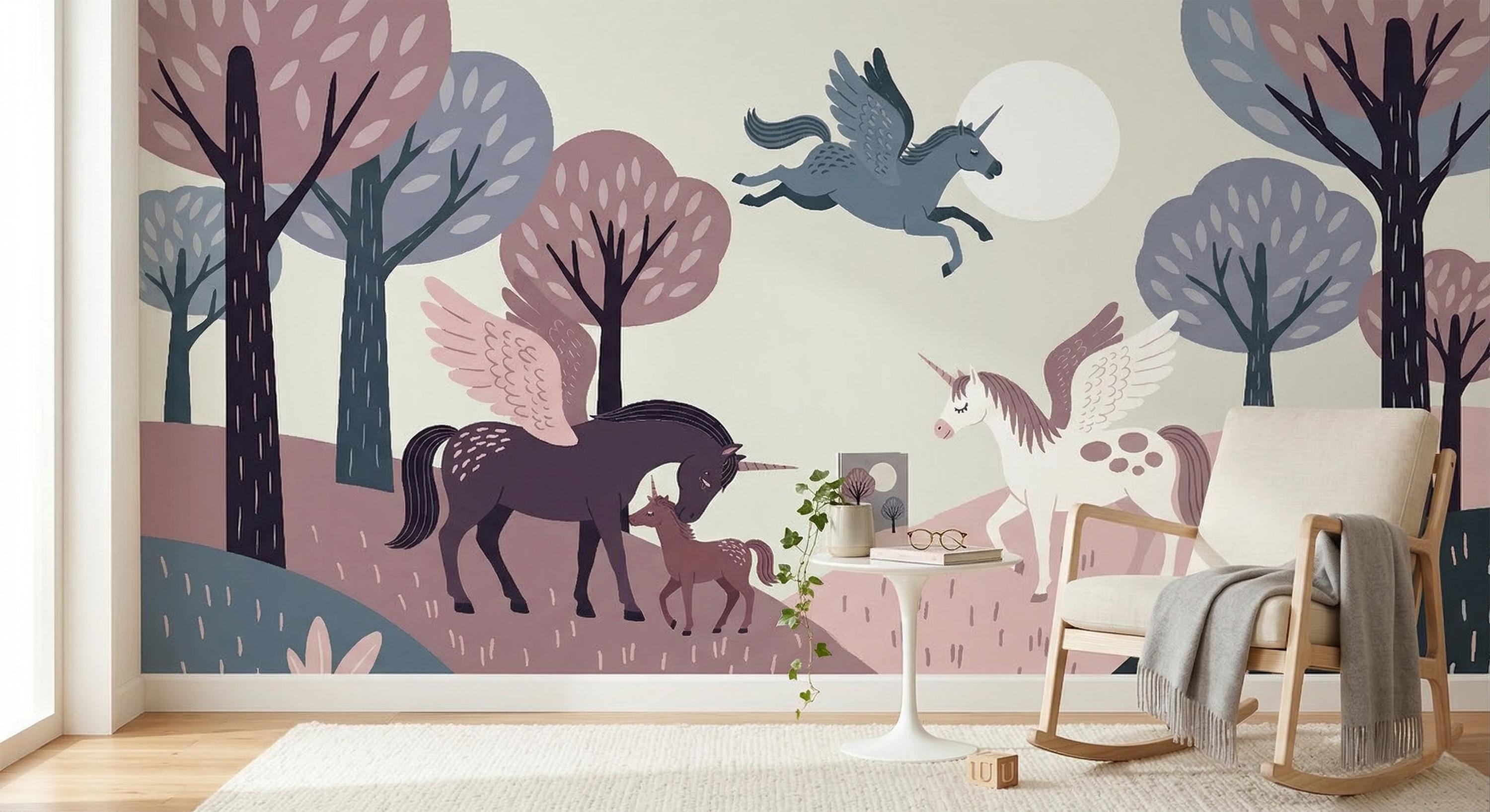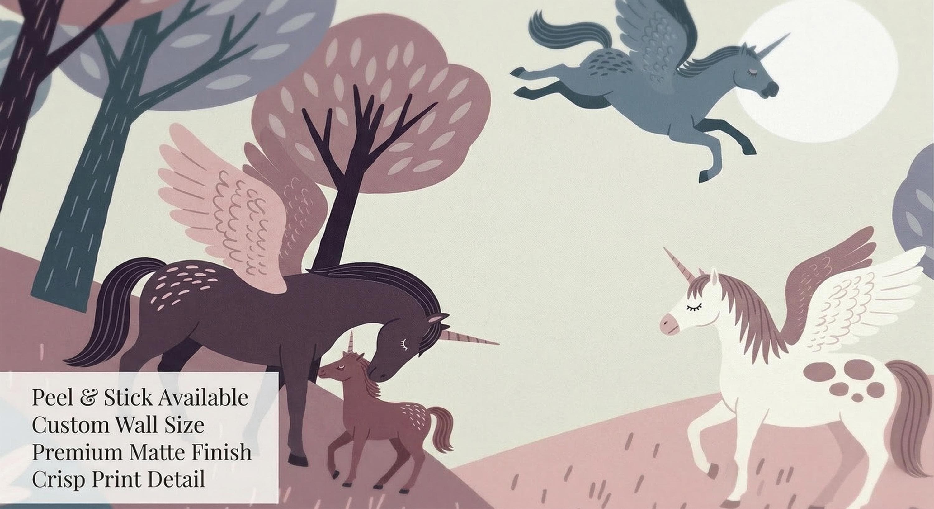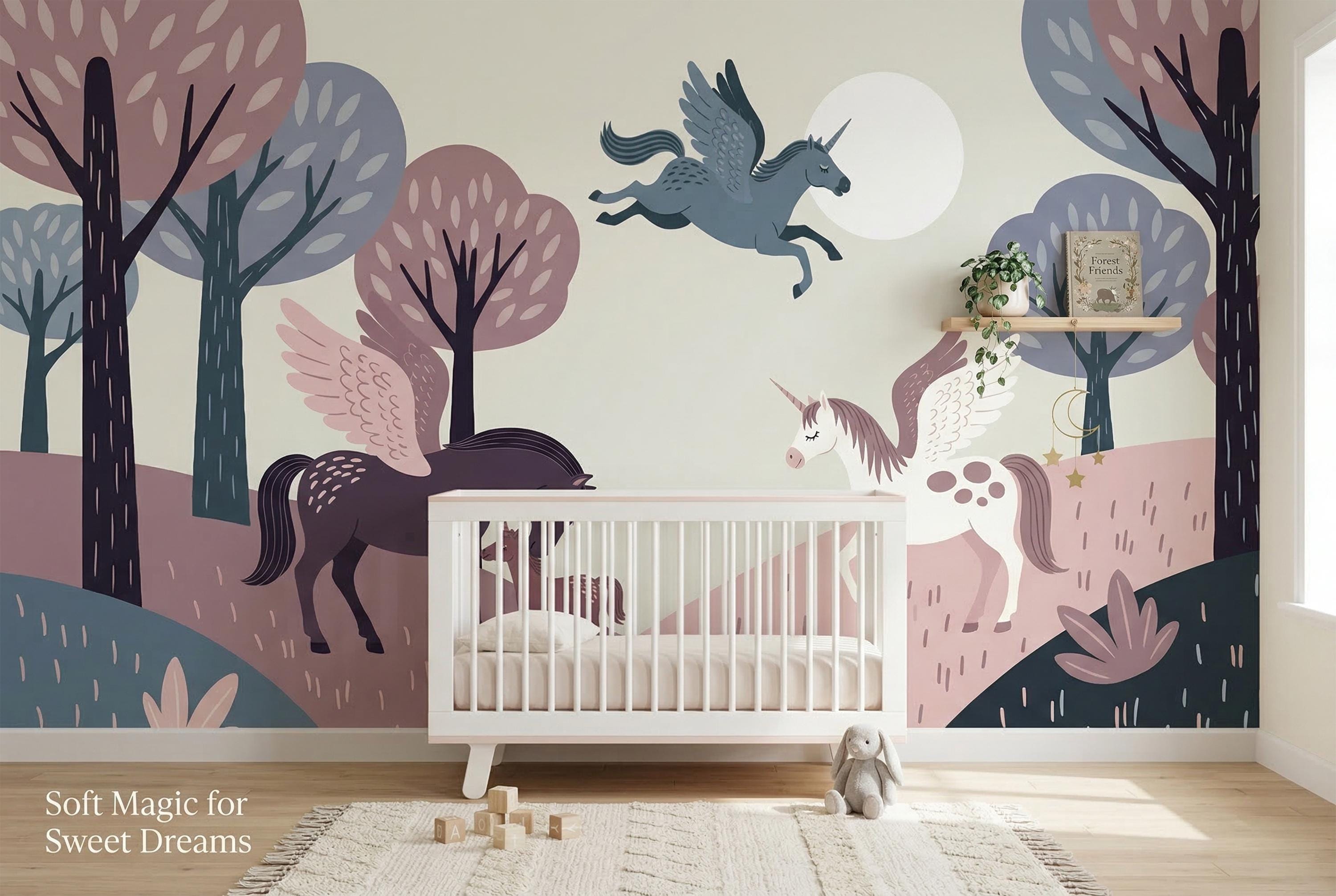 This unicorn family forest peel and stick mural by WallpaperPixi is unlike anything else in the children's room category. Four winged unicorns — a deep mauve mother with blush-pink feathered wings, her tiny brown foal, an elegant white alicorn, and a slate-blue flying unicorn soaring past a glowing full moon — inhabit a beautifully composed Nordic forest landscape of rolling hills and stylised blush, lavender, and teal trees.