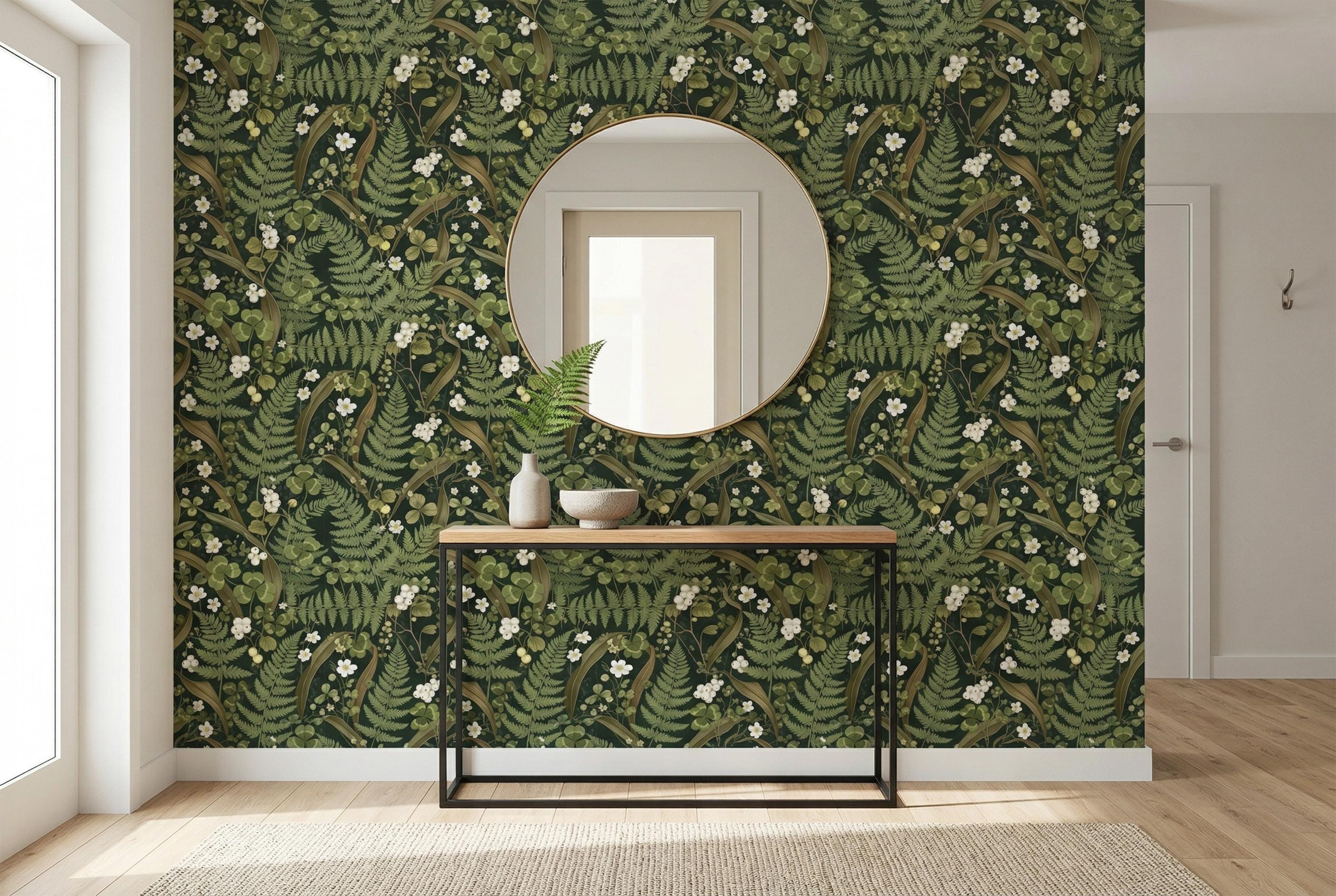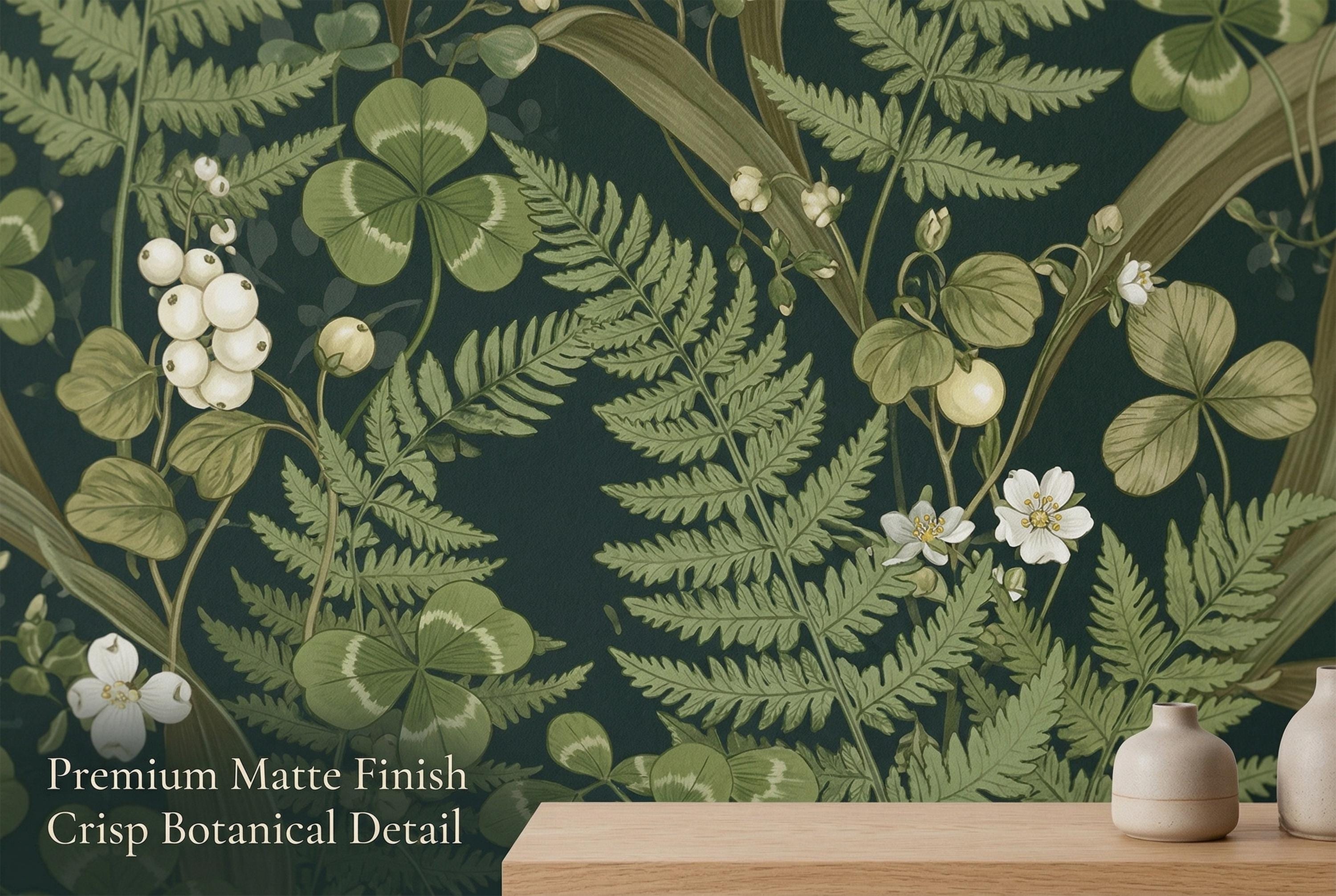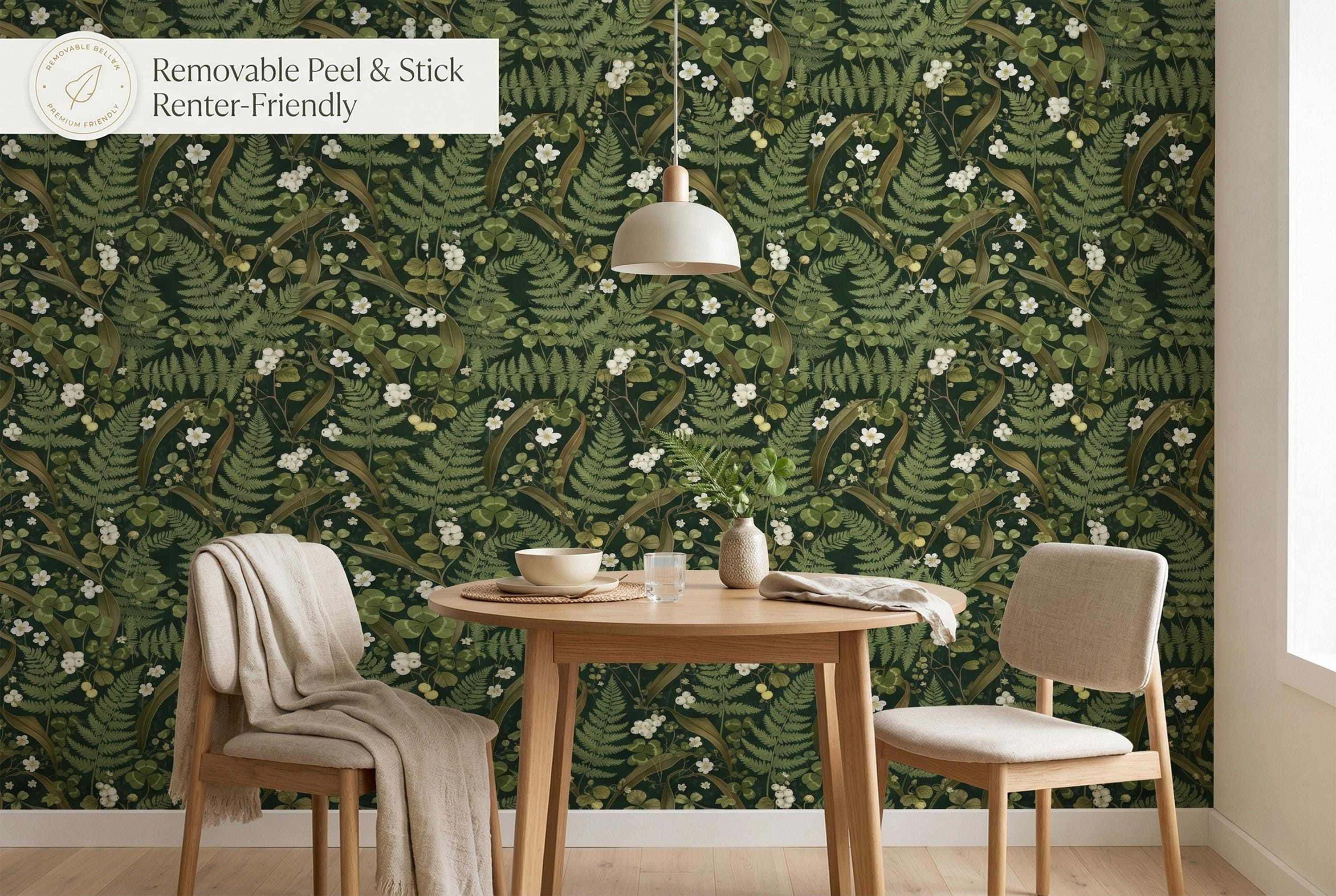 This dark botanical fern peel and stick wallpaper by WallpaperPixi is a masterclass in moody interior design. Dense layers of botanical illustration — feathery fern fronds at every scale, trailing clover, broad tropical leaves, delicate white wood anemone flowers, clusters of luminous white snowberries, and sinuous brown stems — fill every centimetre of a deep near-black forest green background with the richness and depth of an ancient woodland floor.