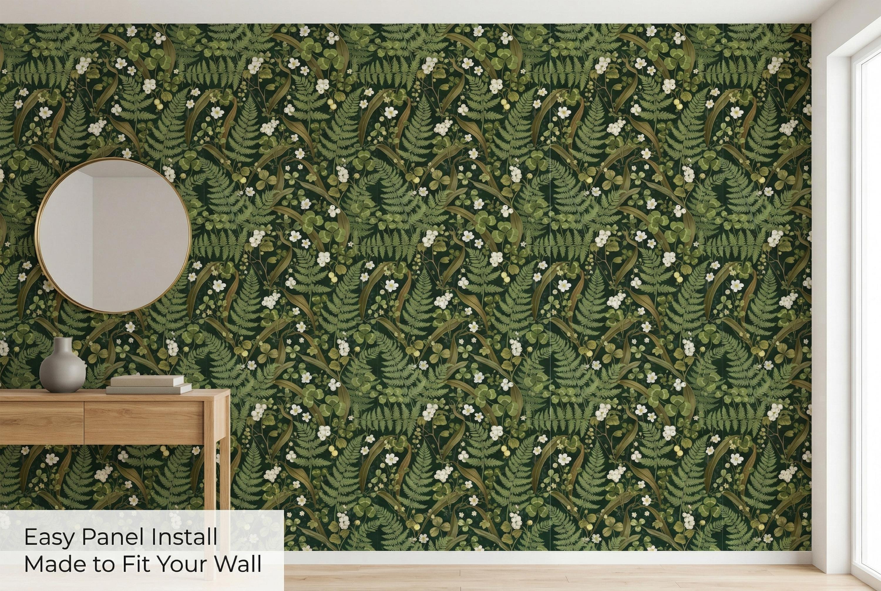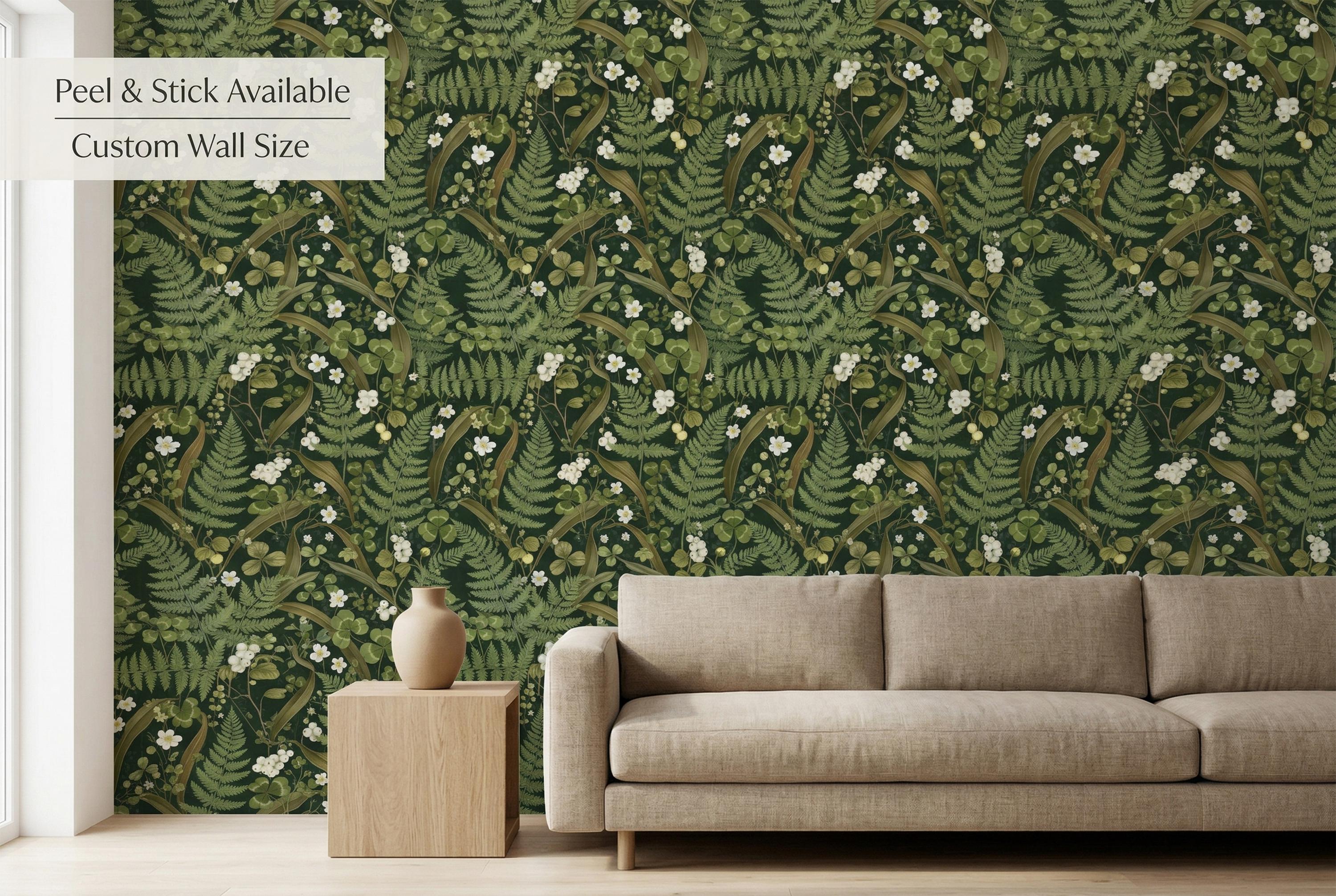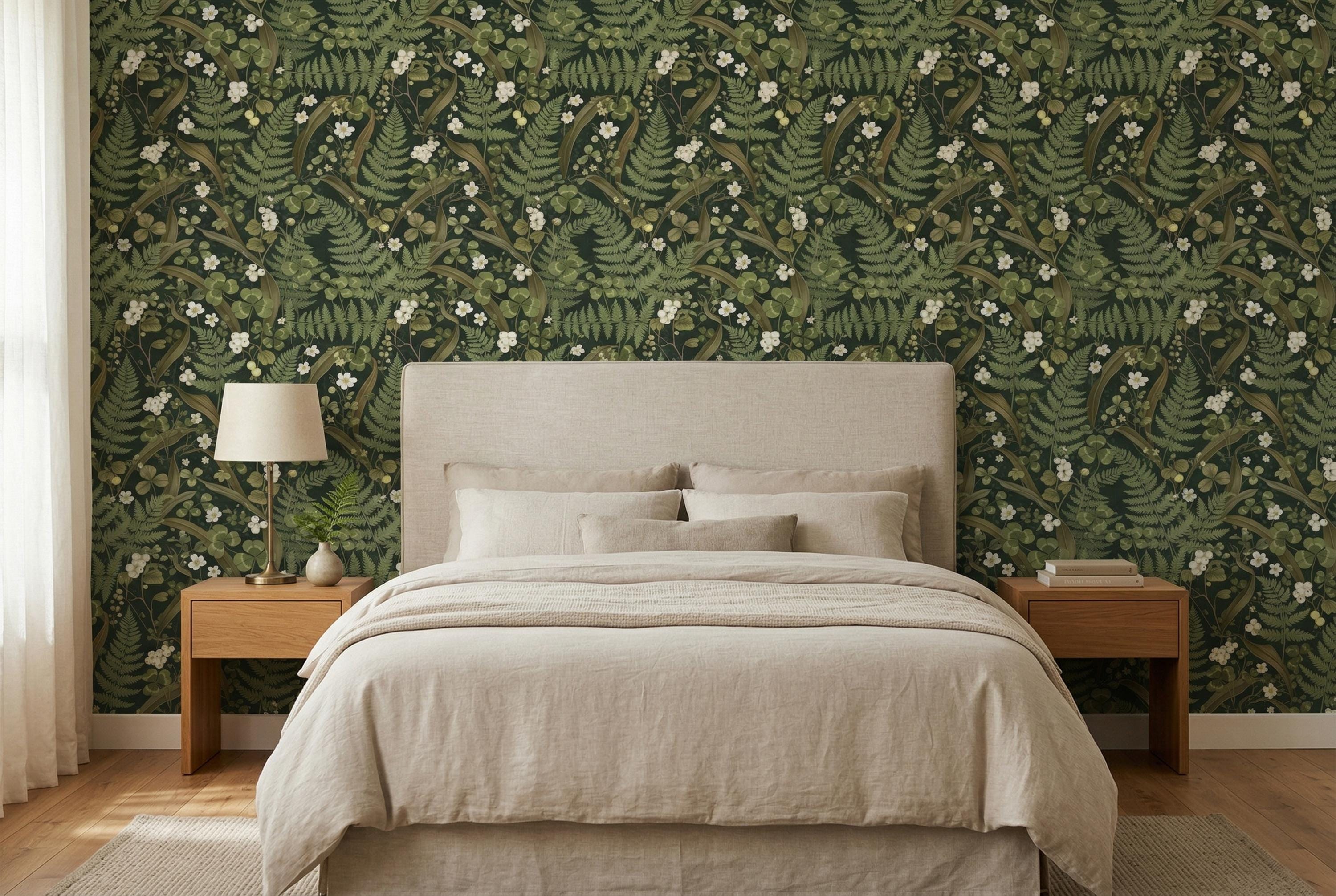 This dark botanical fern peel and stick wallpaper by WallpaperPixi is a masterclass in moody interior design. Dense layers of botanical illustration — feathery fern fronds at every scale, trailing clover, broad tropical leaves, delicate white wood anemone flowers, clusters of luminous white snowberries, and sinuous brown stems — fill every centimetre of a deep near-black forest green background with the richness and depth of an ancient woodland floor.