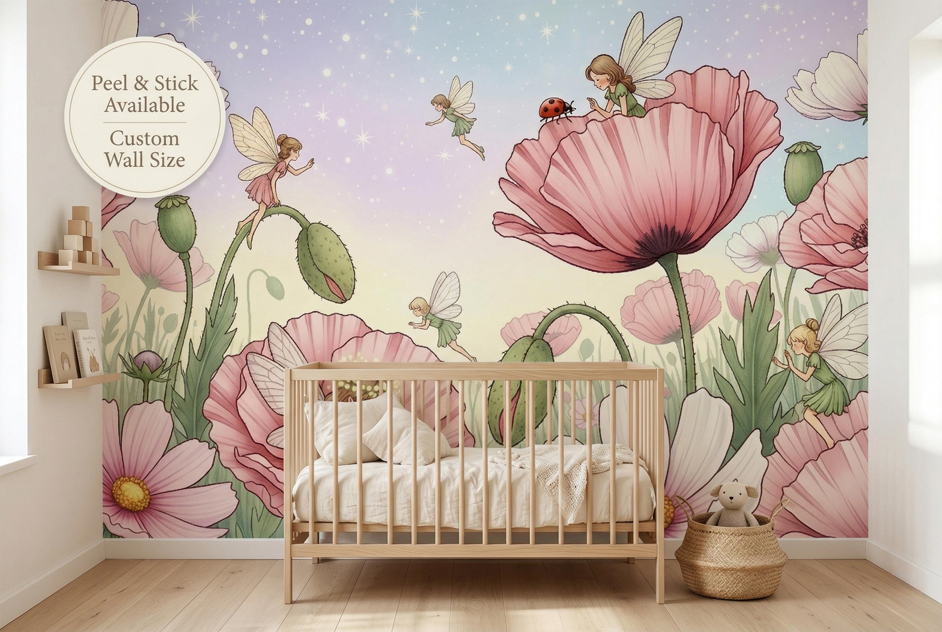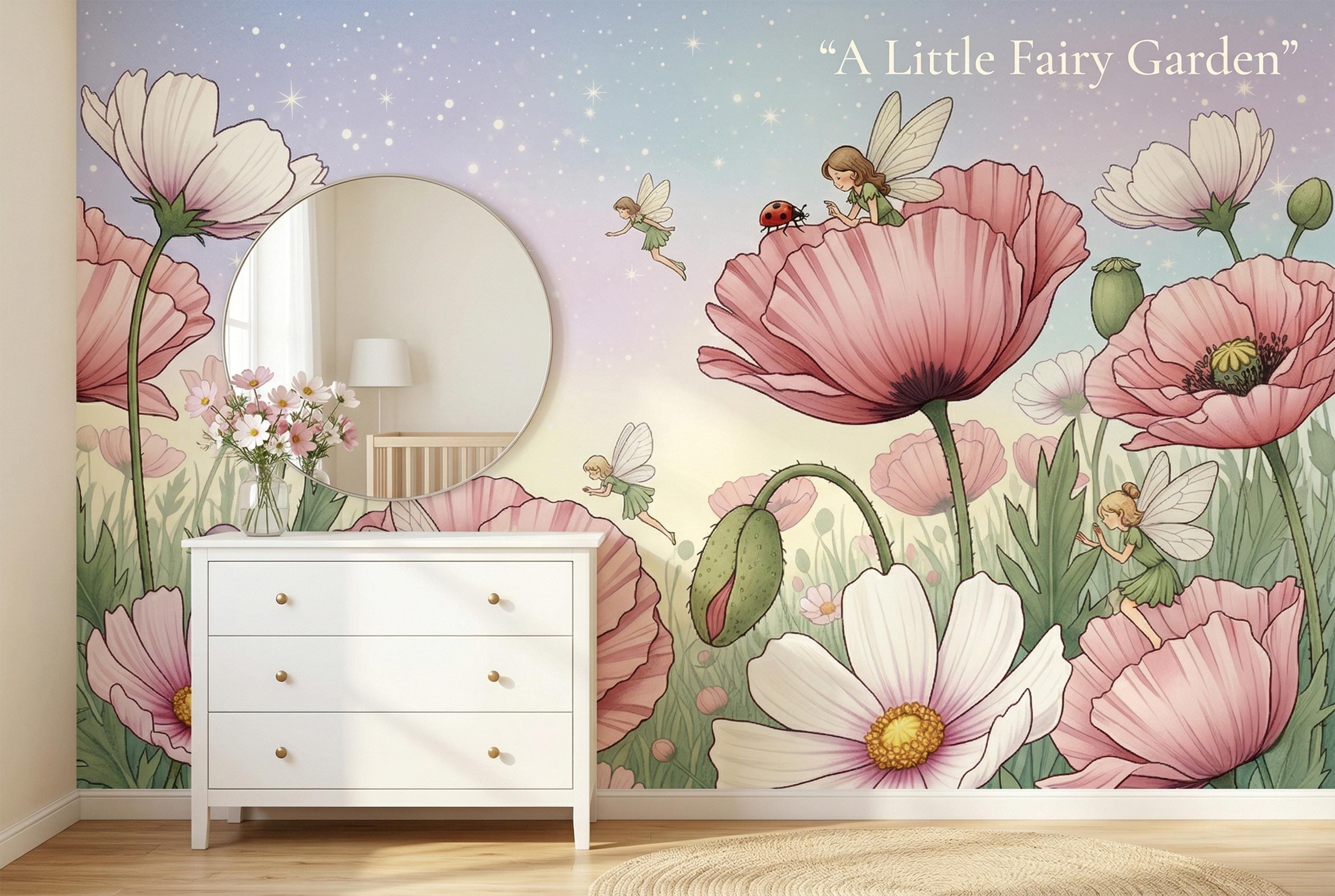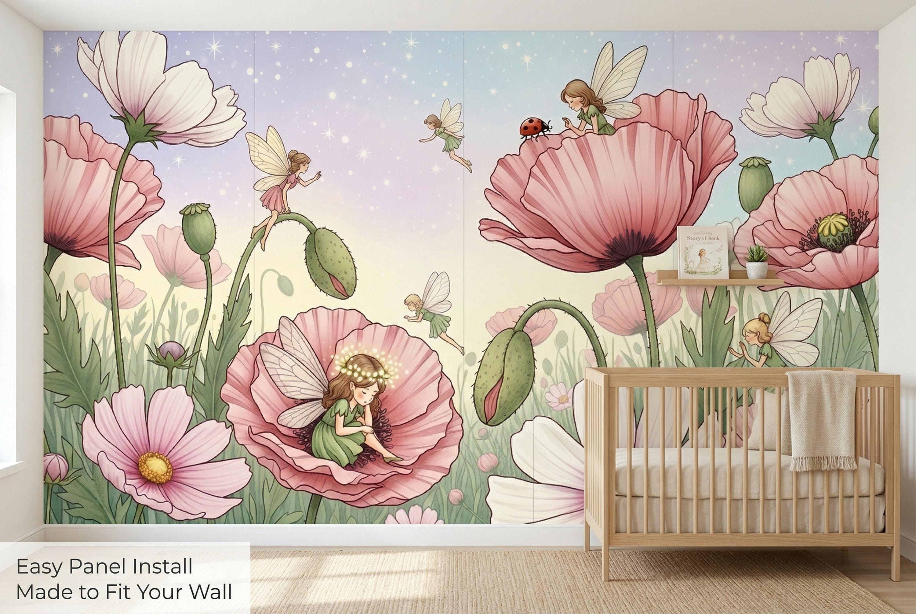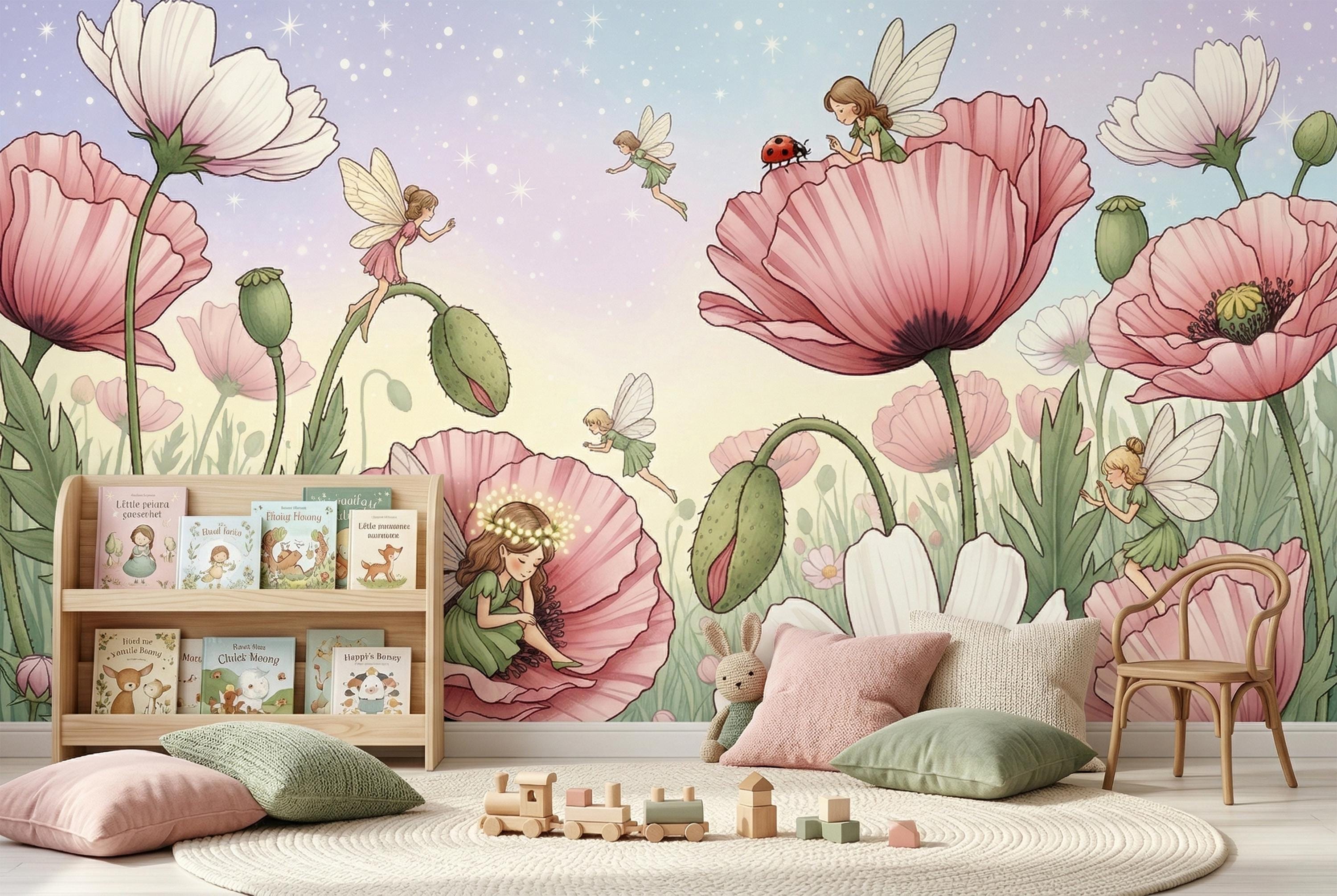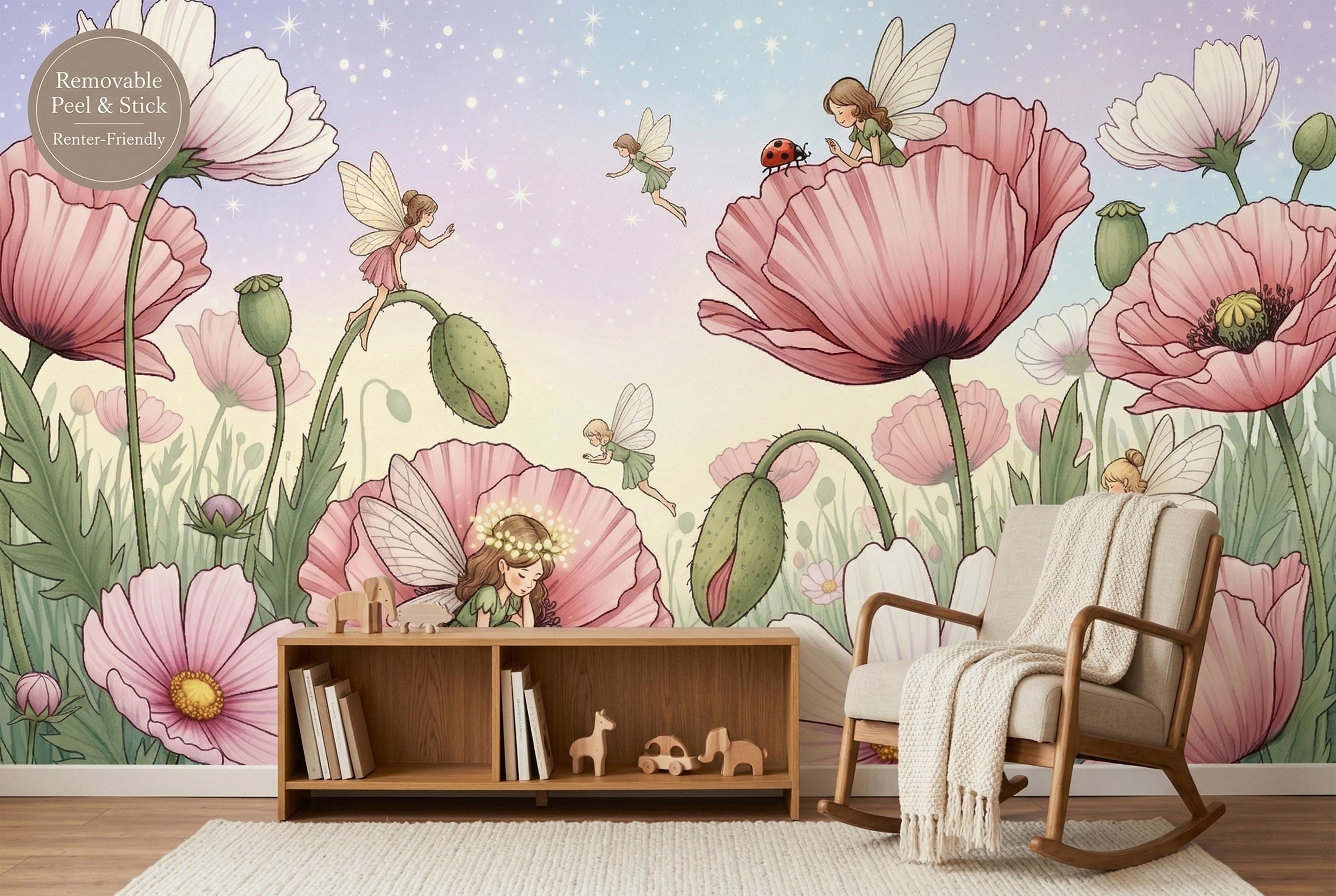 This fairy garden poppy peel and stick mural by WallpaperPixi is one of the most tender and imaginative children's room designs we have ever created. Five tiny fairy girls in soft pink and sage green dresses — each with delicate sheer dragonfly wings — inhabit a meadow of giant pink poppies and white cosmos flowers that tower above them like a magical forest.