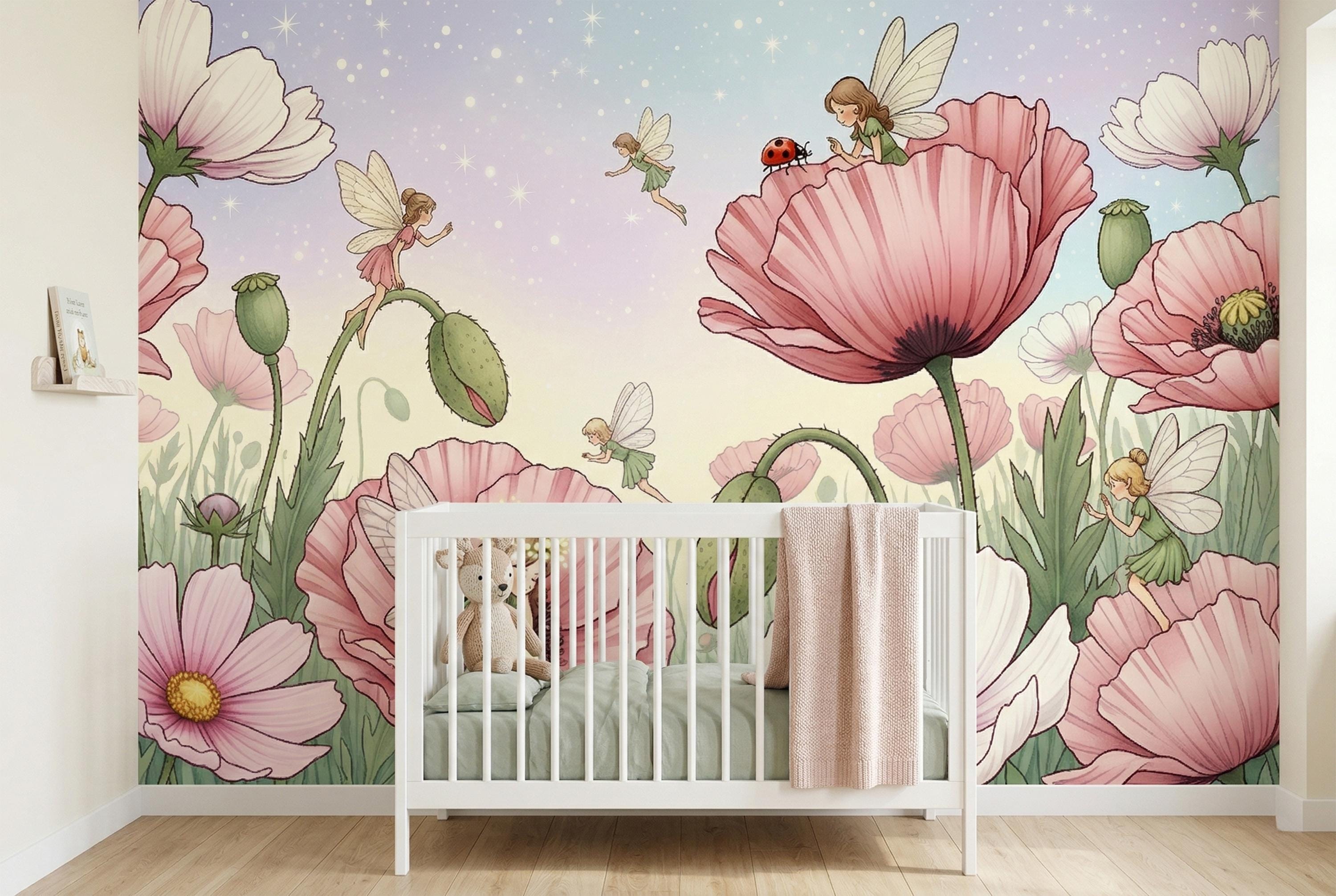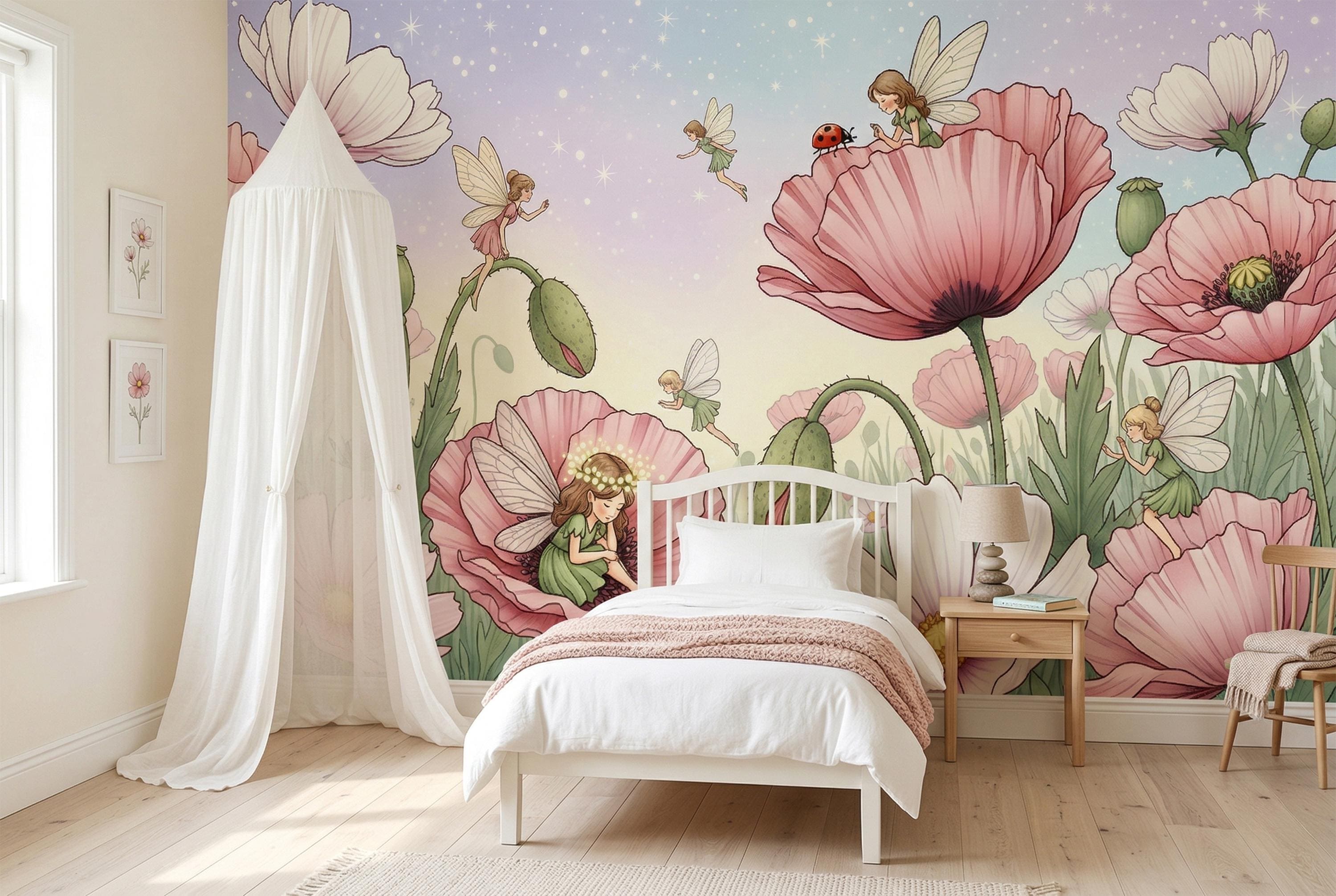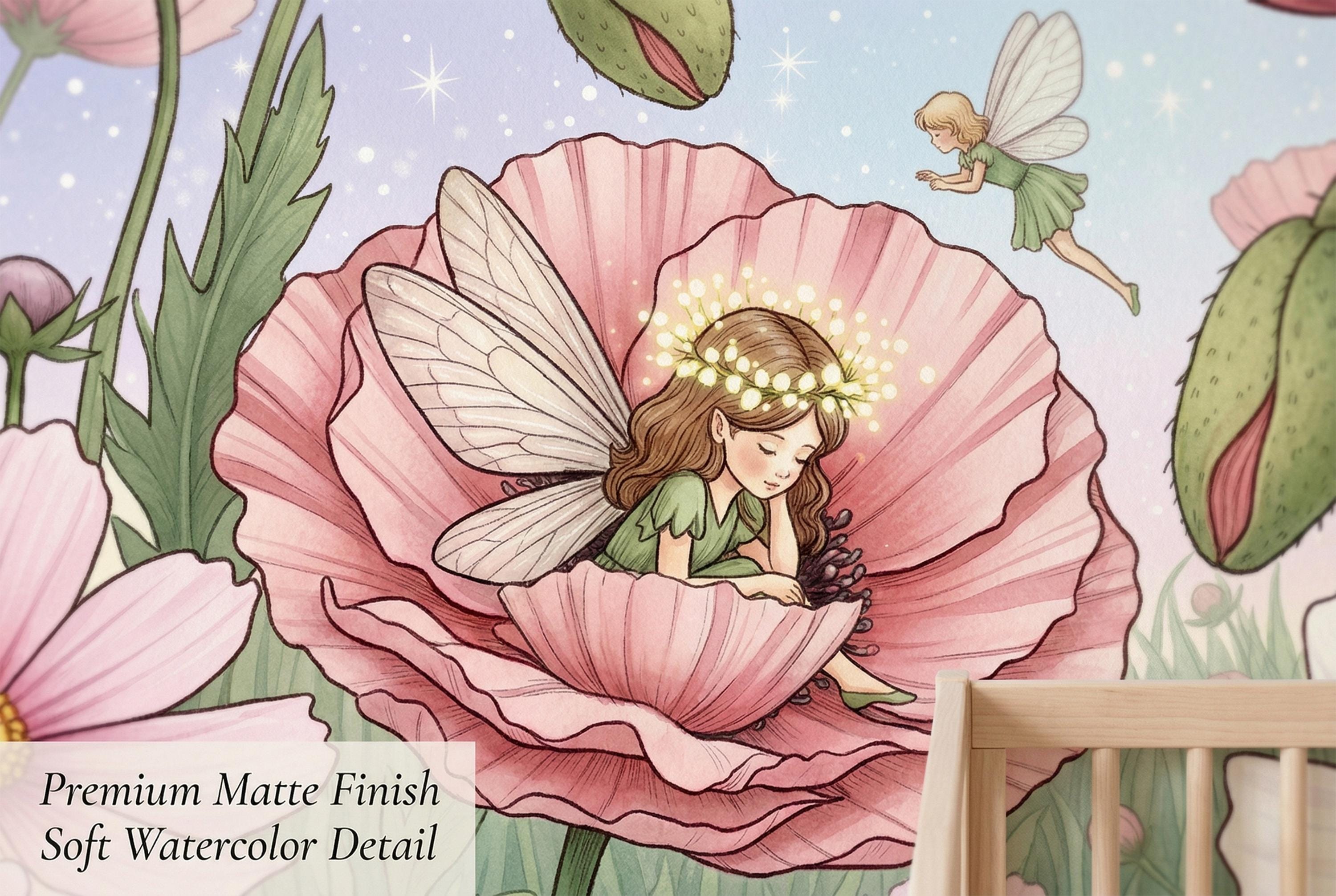 This fairy wall mural is exquisitely detailed — every wing vein, every petal fold, every poppy seed pod rendered with the precision of a classic botanical illustration fused with the warmth of a children's picture book. As a fairycore wallpaper it perfectly captures the cottagecore-fairy aesthetic dominating girls' room design right now — intimate, nature-connected, and softly magical rather than loud or cartoon-heavy.