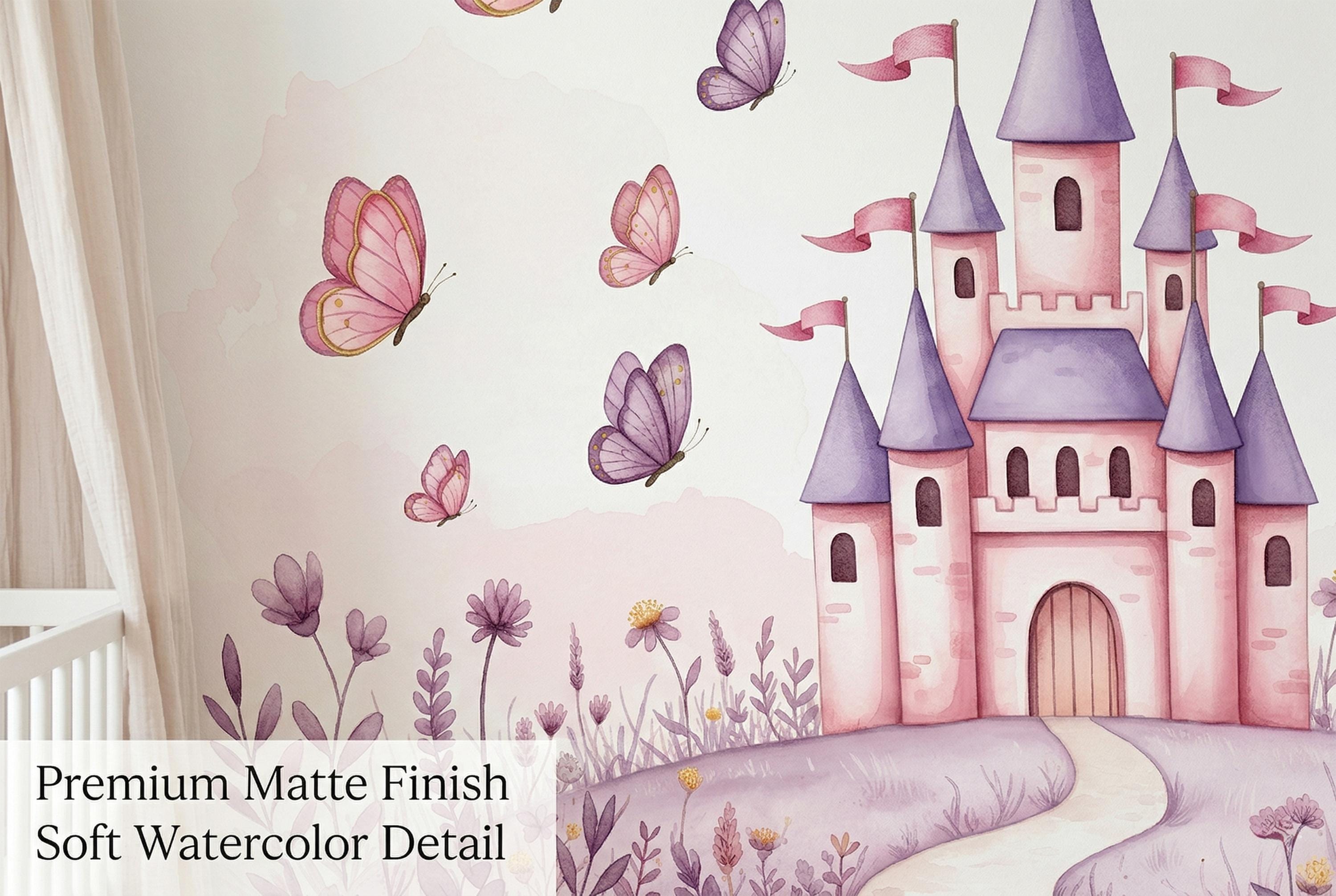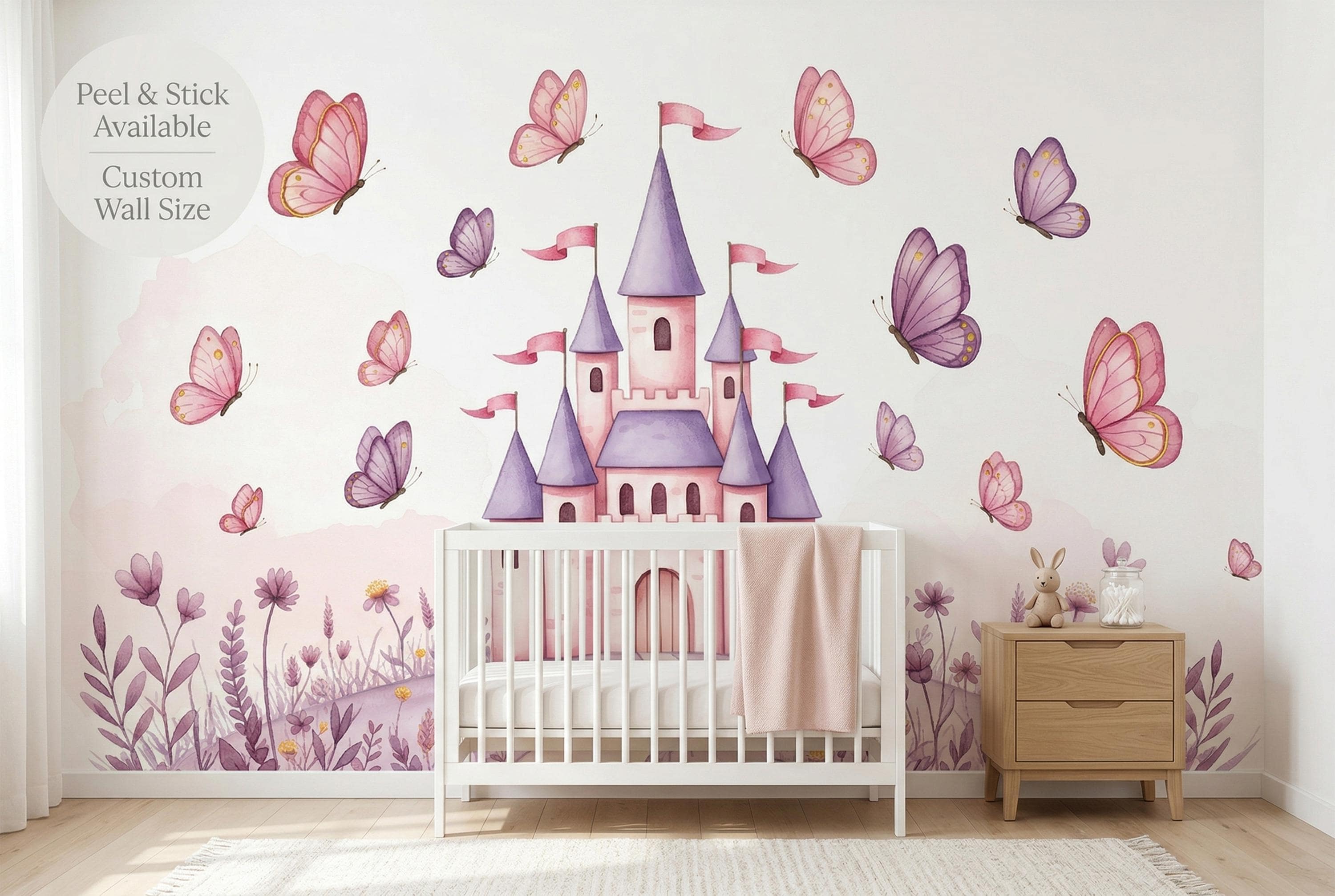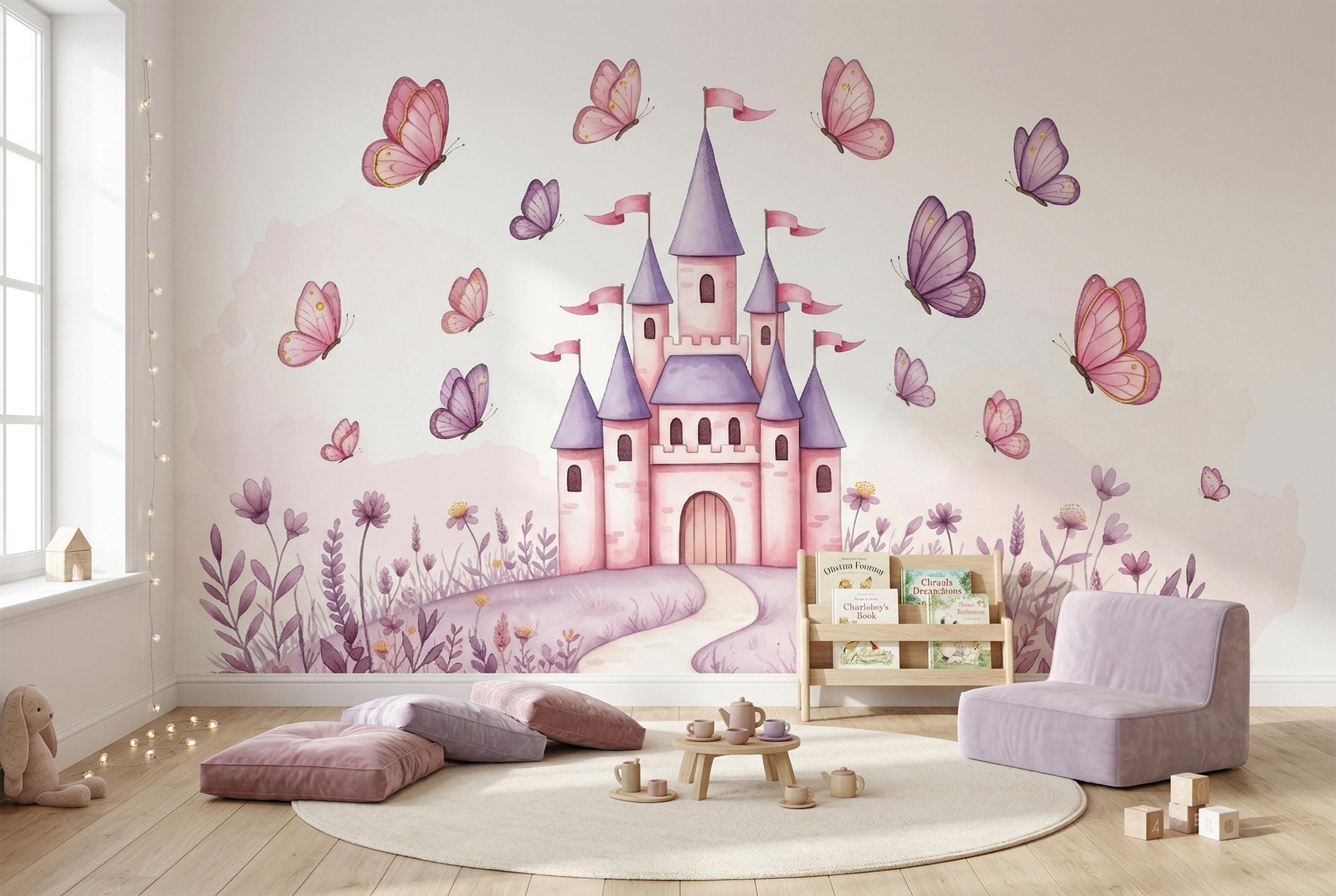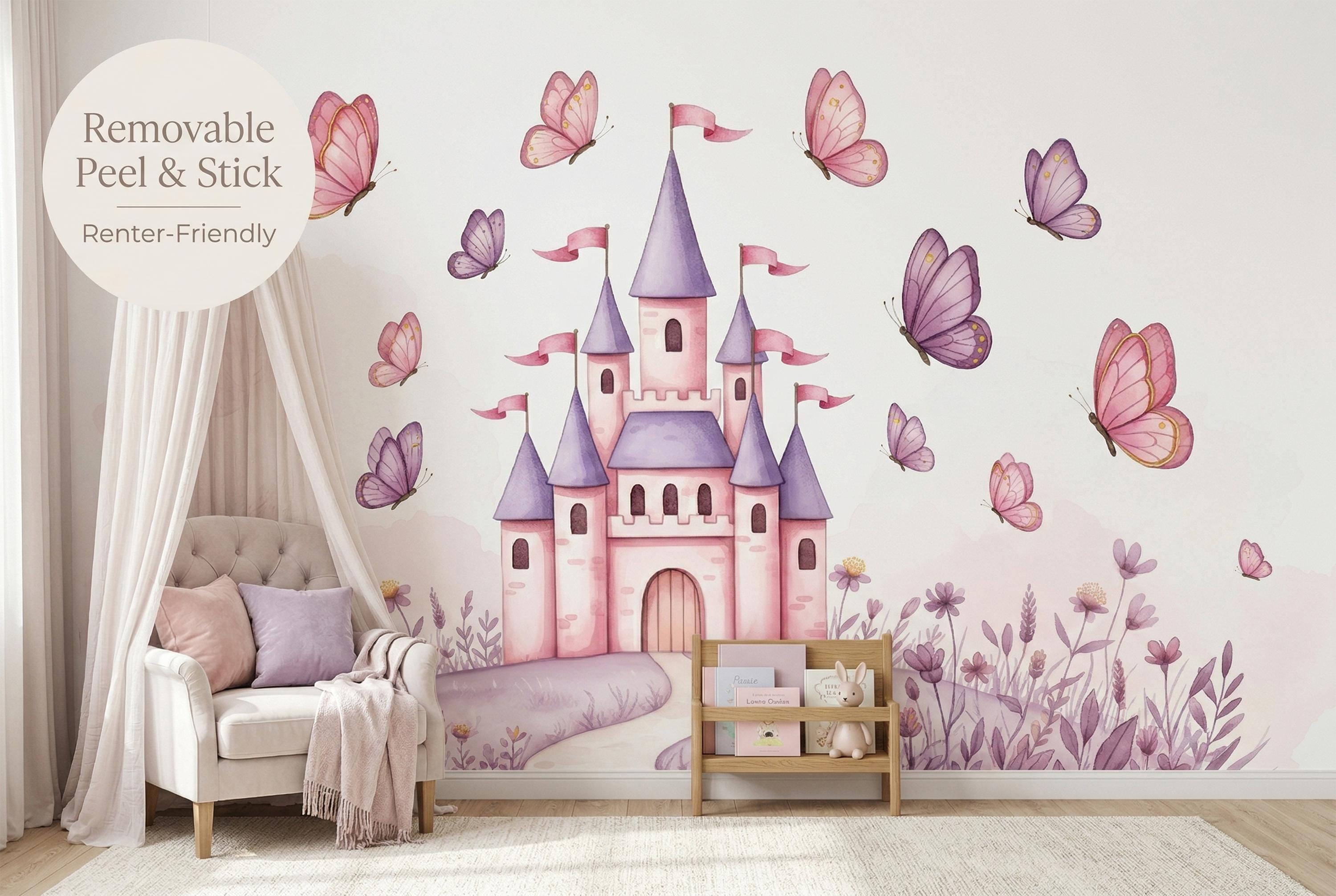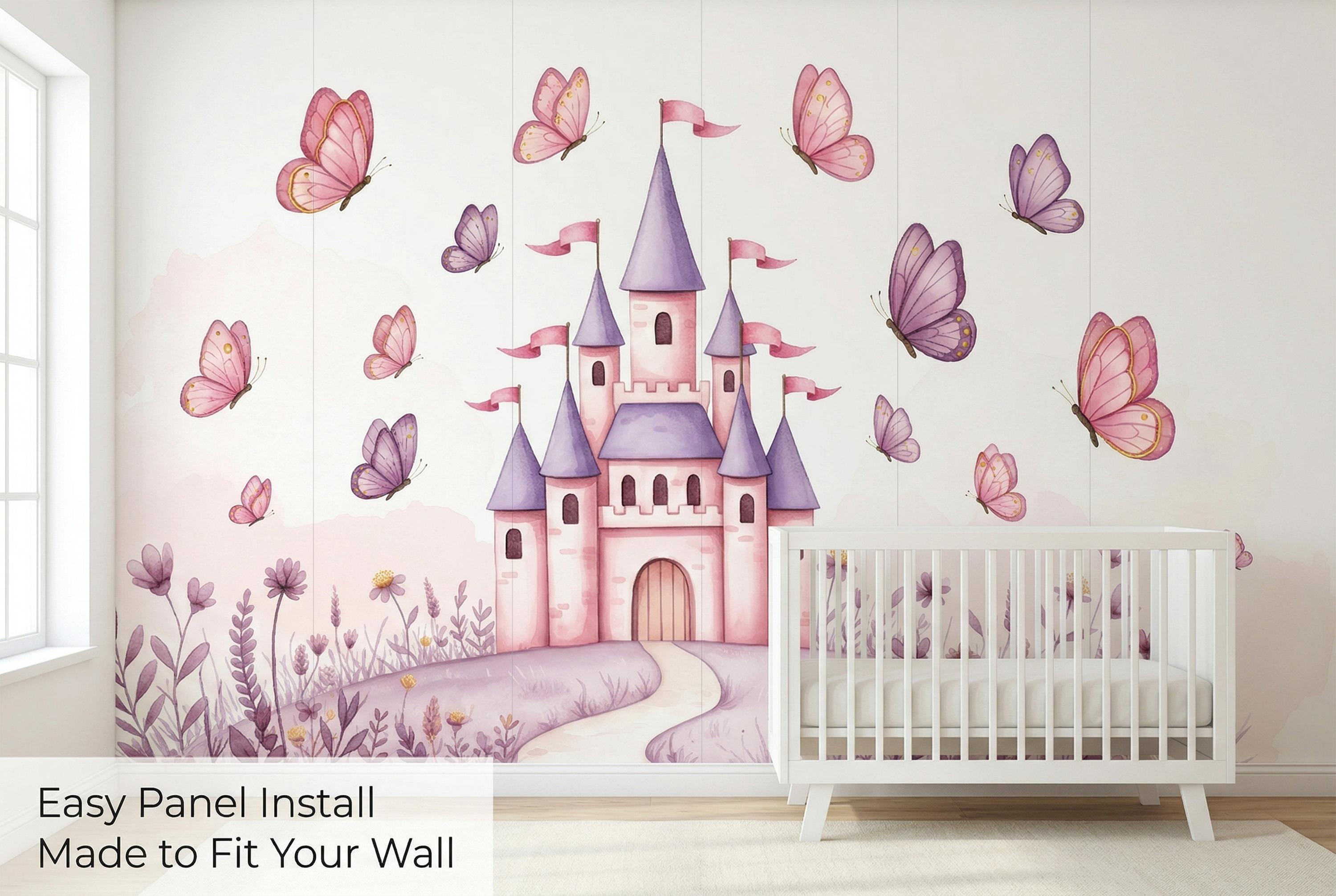 This princess castle butterfly peel and stick mural by WallpaperPixi is one of the lightest, most open, and most effortlessly feminine designs in our entire collection.