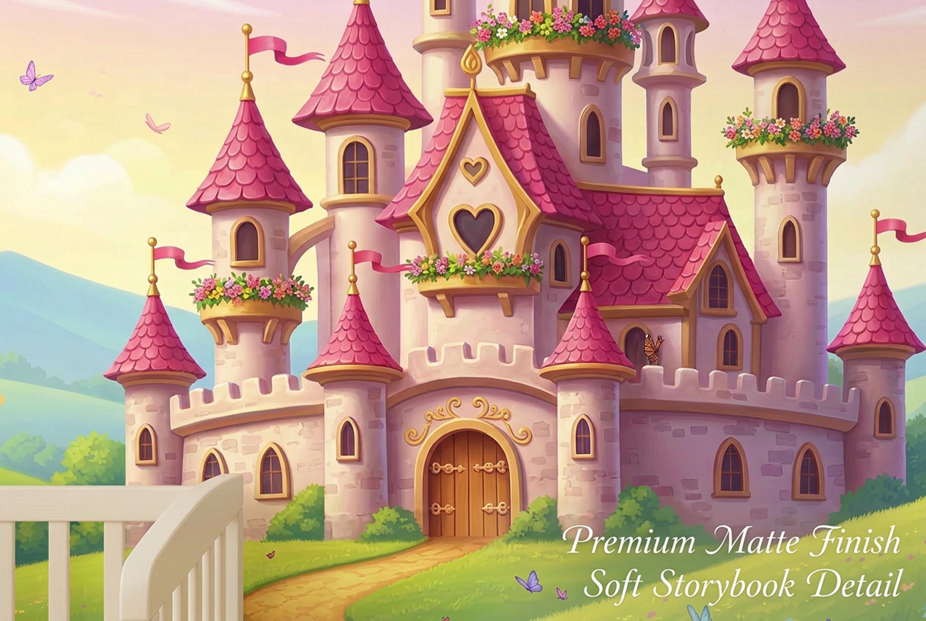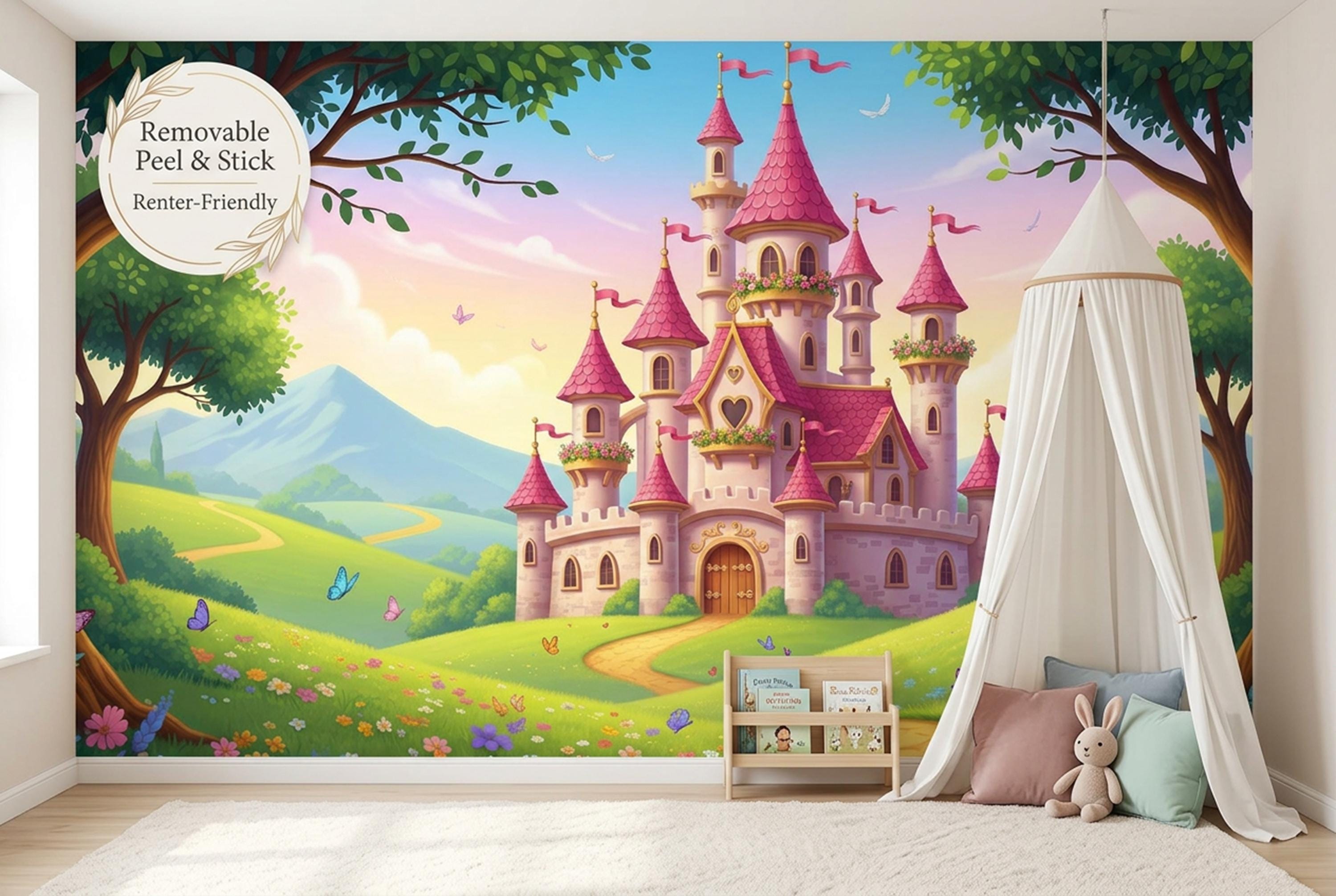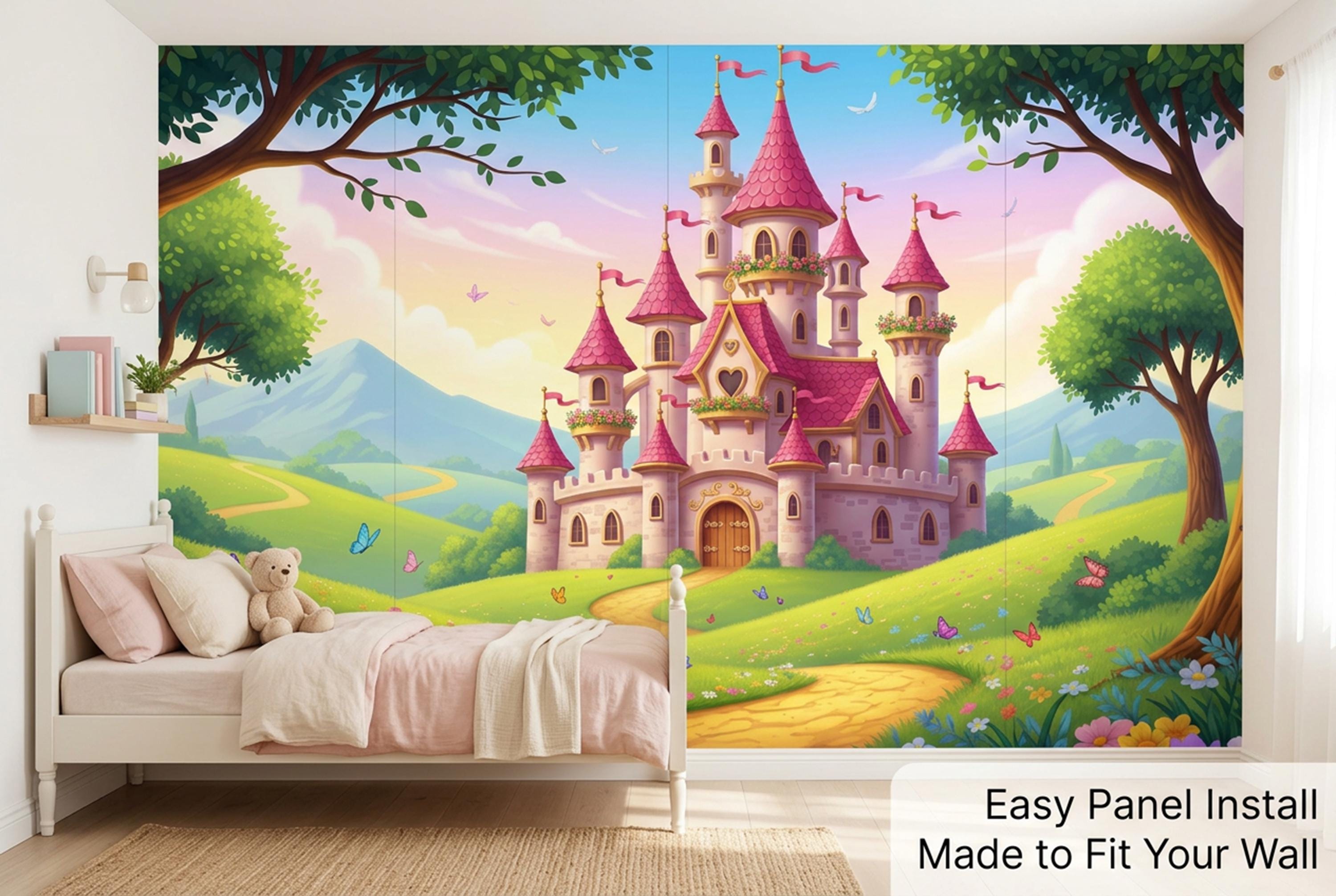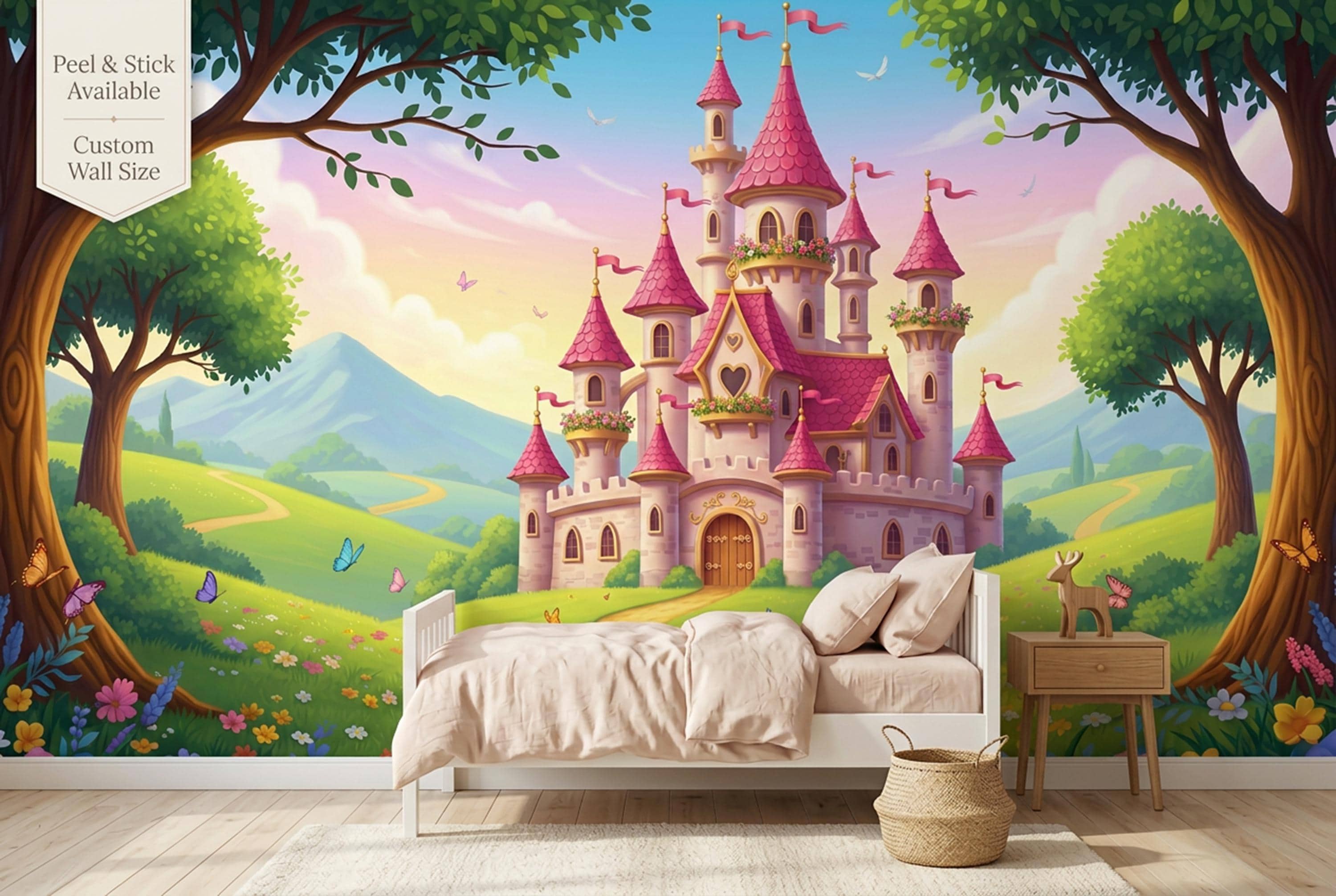 As a princess room wallpaper it is fully immersive — the framing oak trees give it depth and perspective that makes the castle feel genuinely reachable. As a castle wallpaper nursery or toddler girl princess wallpaper it works from the very earliest ages right through to school-age bedrooms. As a girl fairytale wallpaper it is saturated with detail that rewards every new look with something freshly discovered.