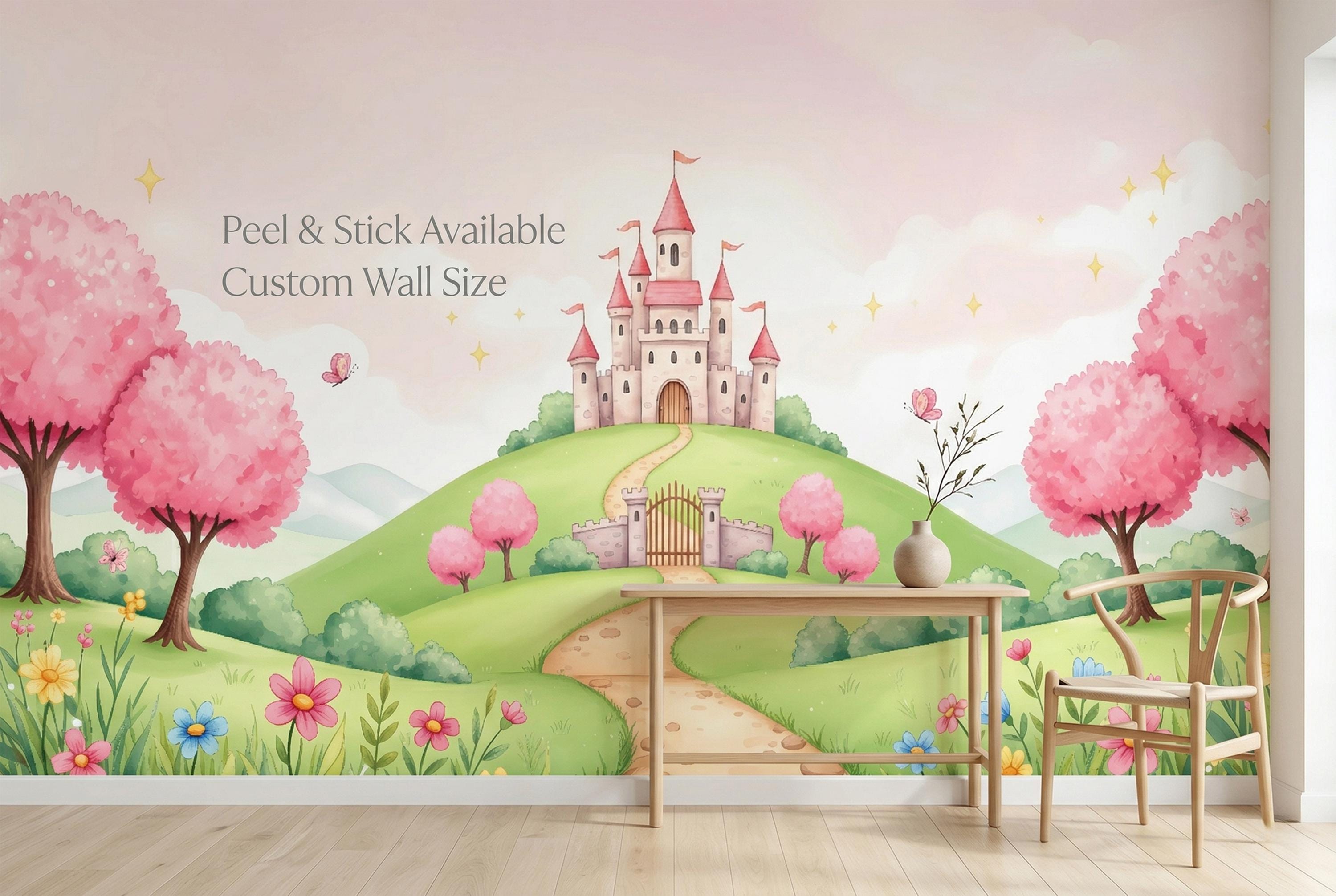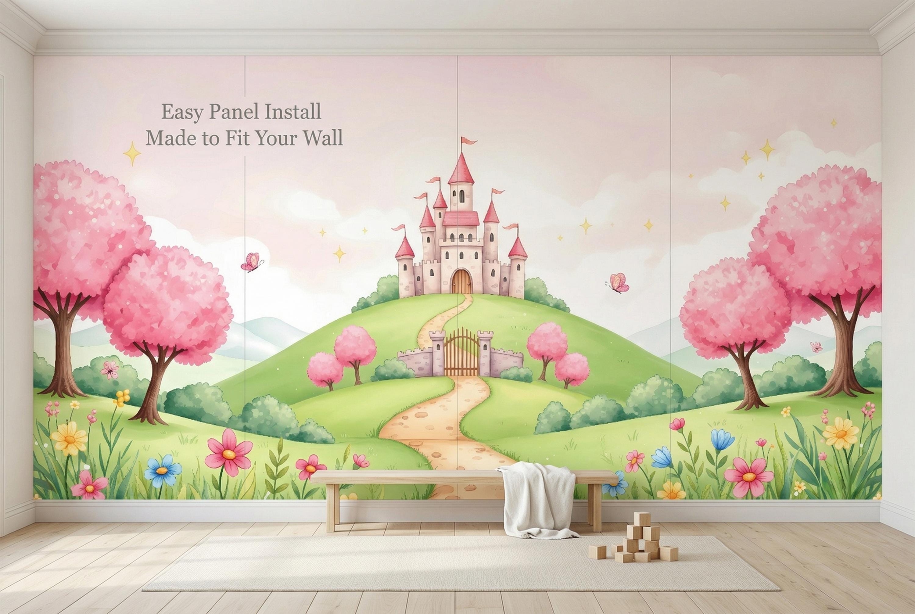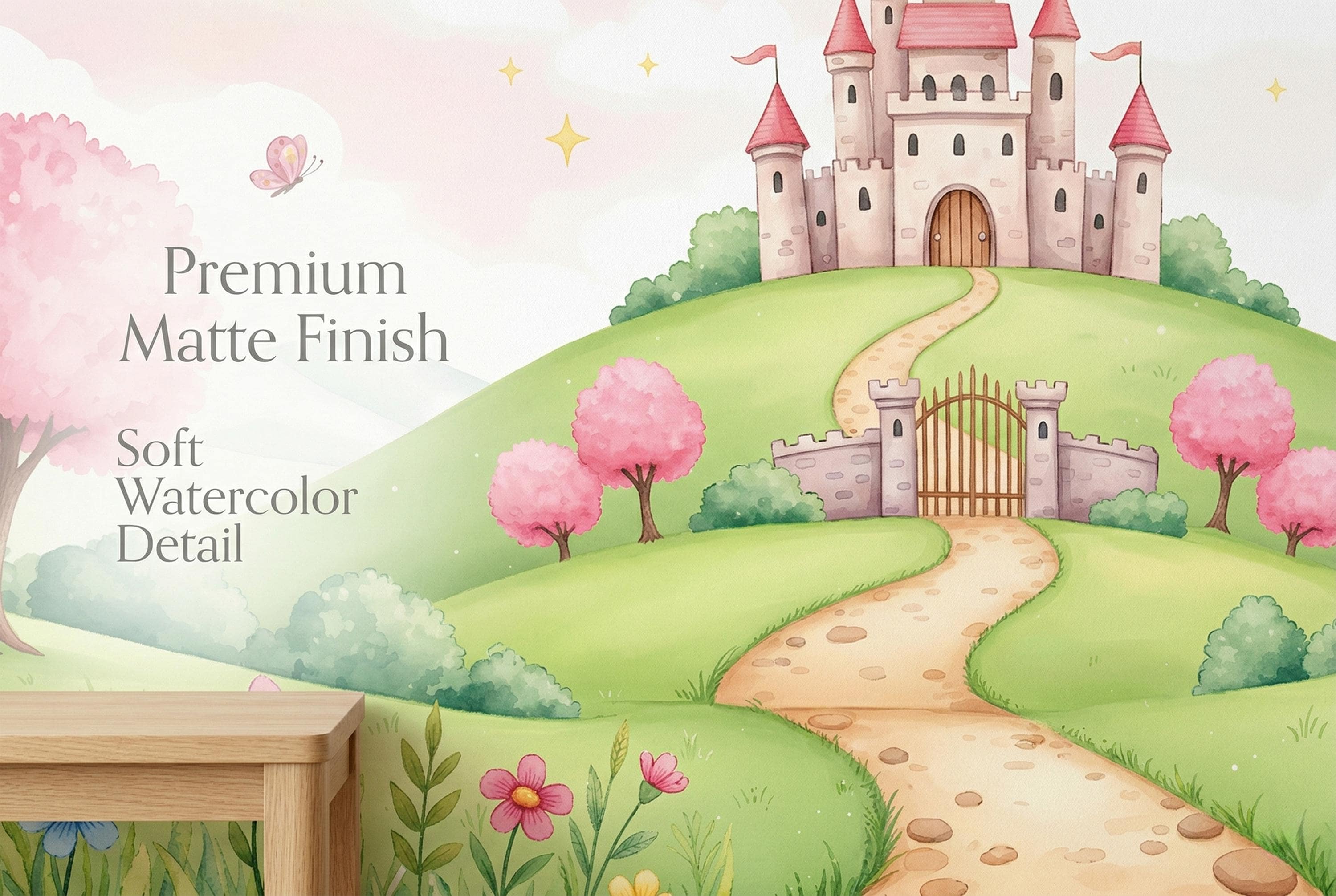 Imagine her face when she wakes up to a sun-lit castle on a green hill, pink cherry trees in full bloom, butterflies dancing in the breeze, and a winding cobblestone path leading straight to the palace gates. This dreamy watercolor mural makes that moment real — every single morning.