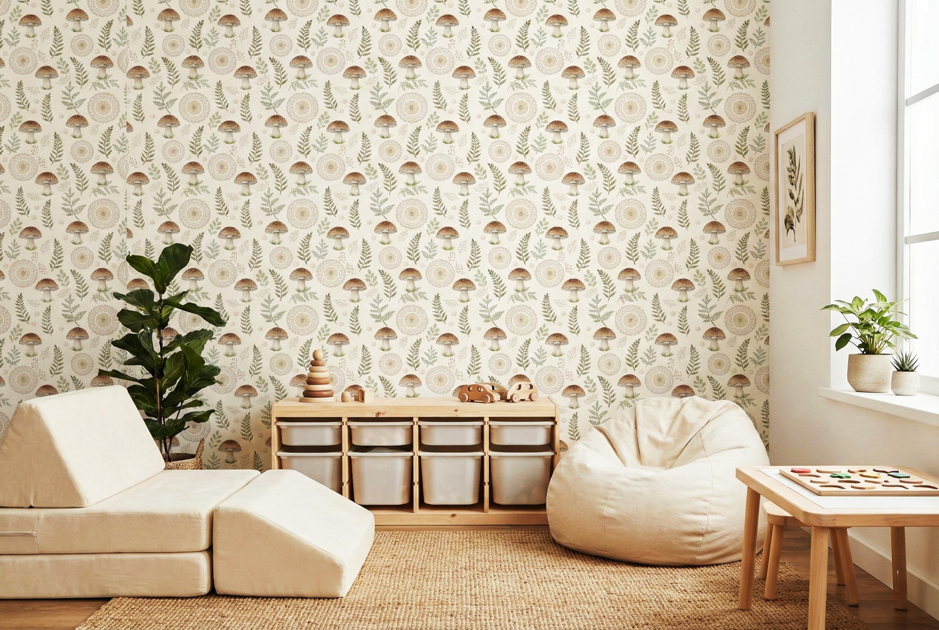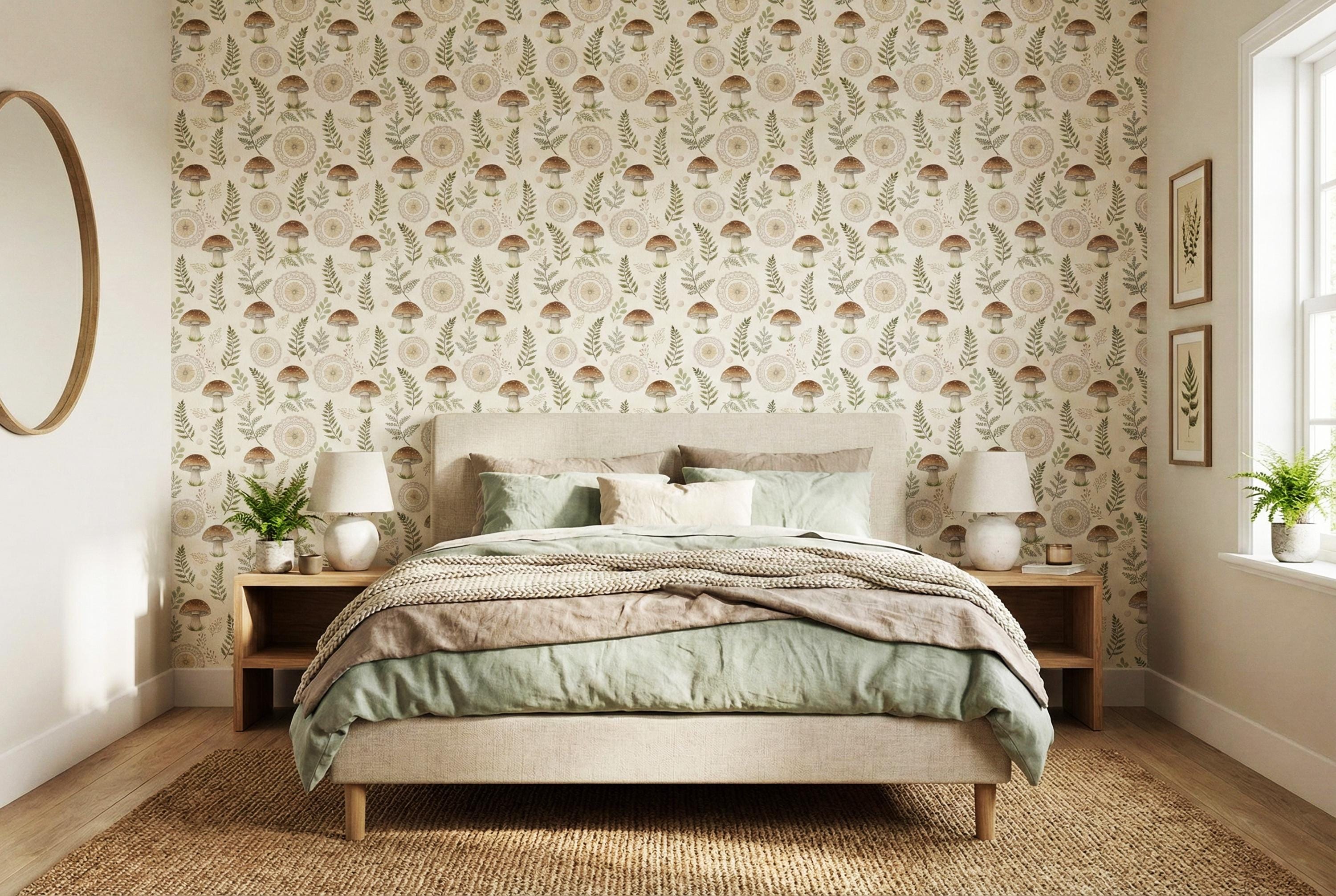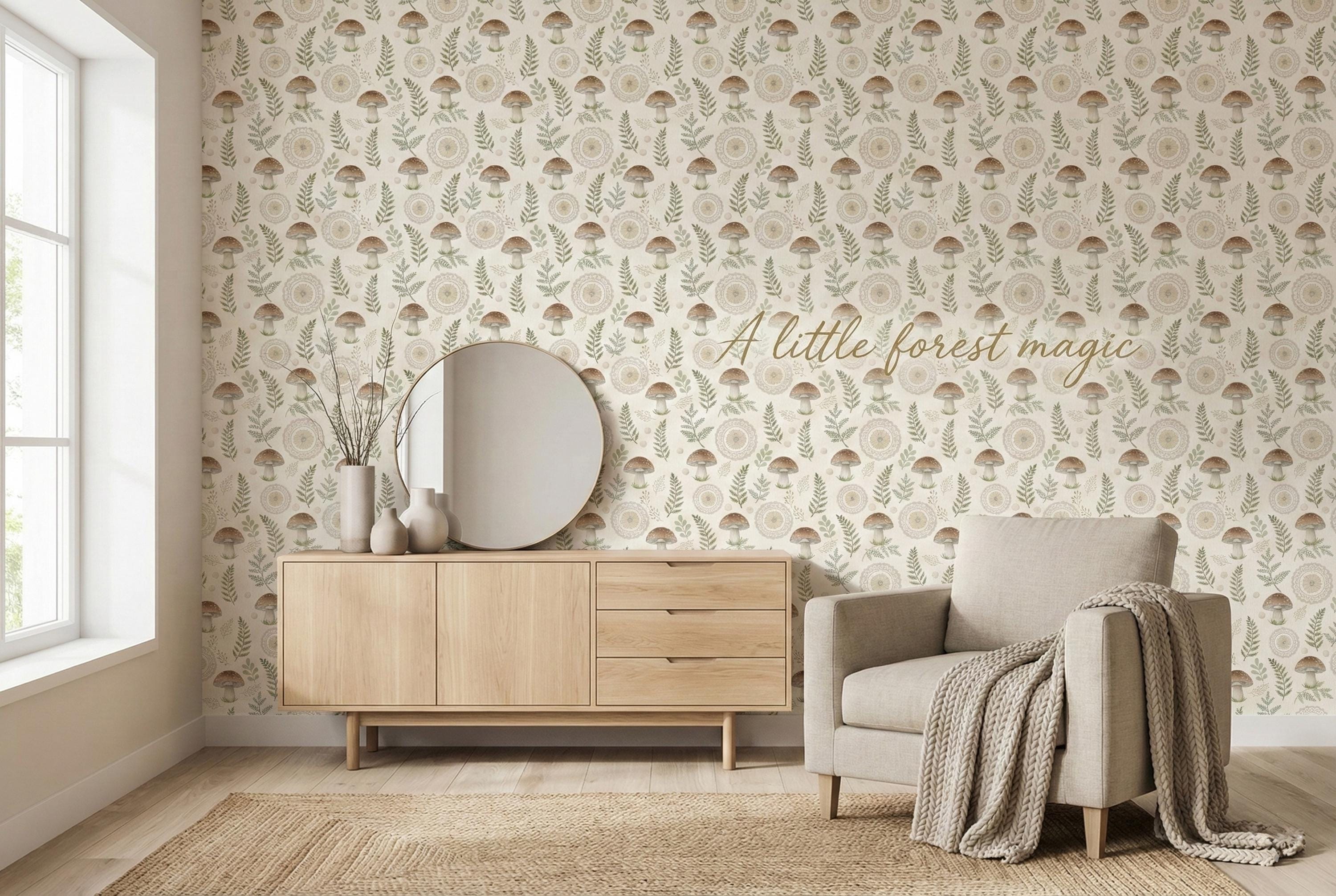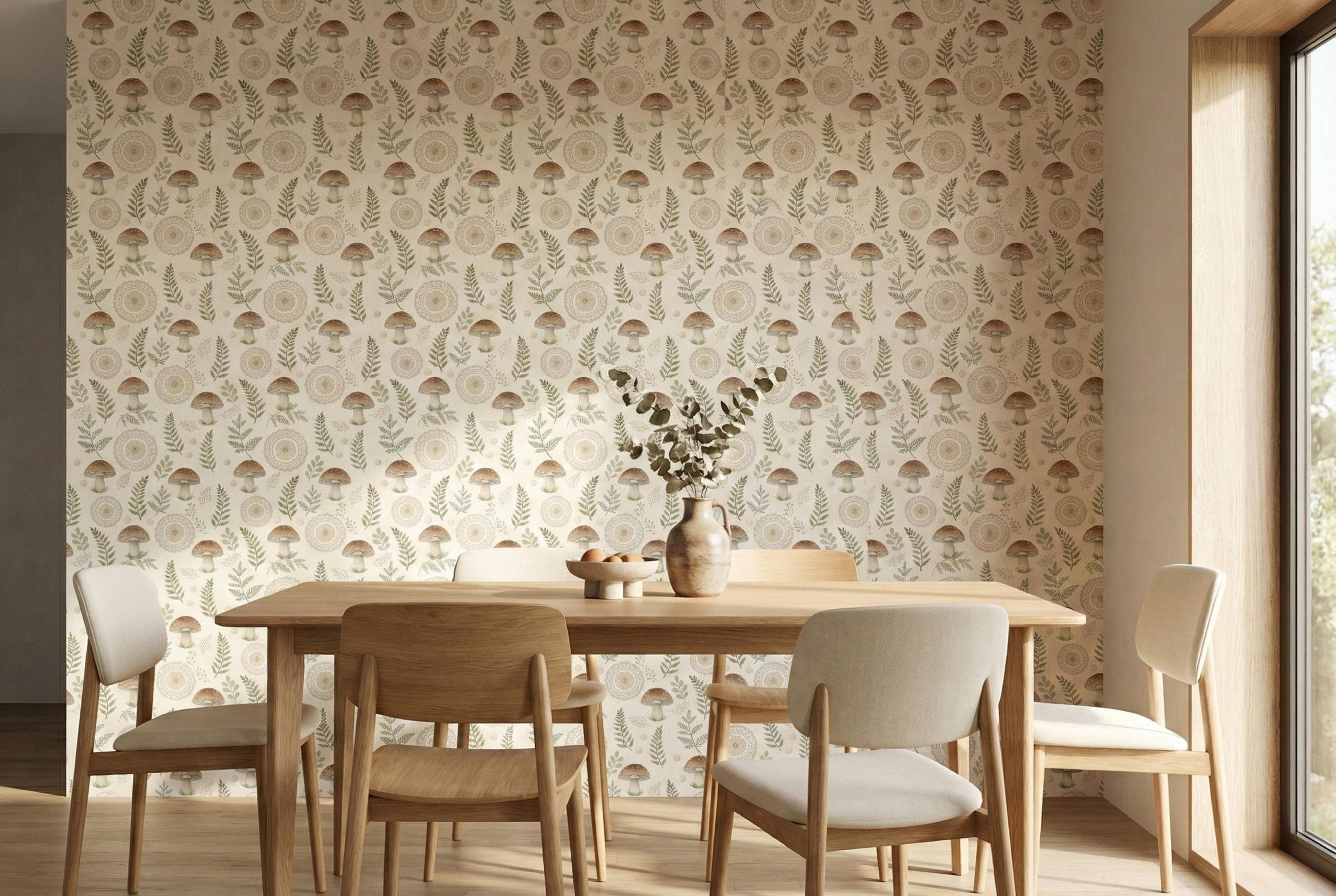 This woodland mushroom wallpaper features hand-drawn mushrooms, delicate botanical branches, and soft neutral tones arranged in a charming, seamless pattern. Inspired by forest walks, cottagecore living, and vintage botanical illustrations, this design creates a calm and whimsical atmosphere that feels warm and comforting.