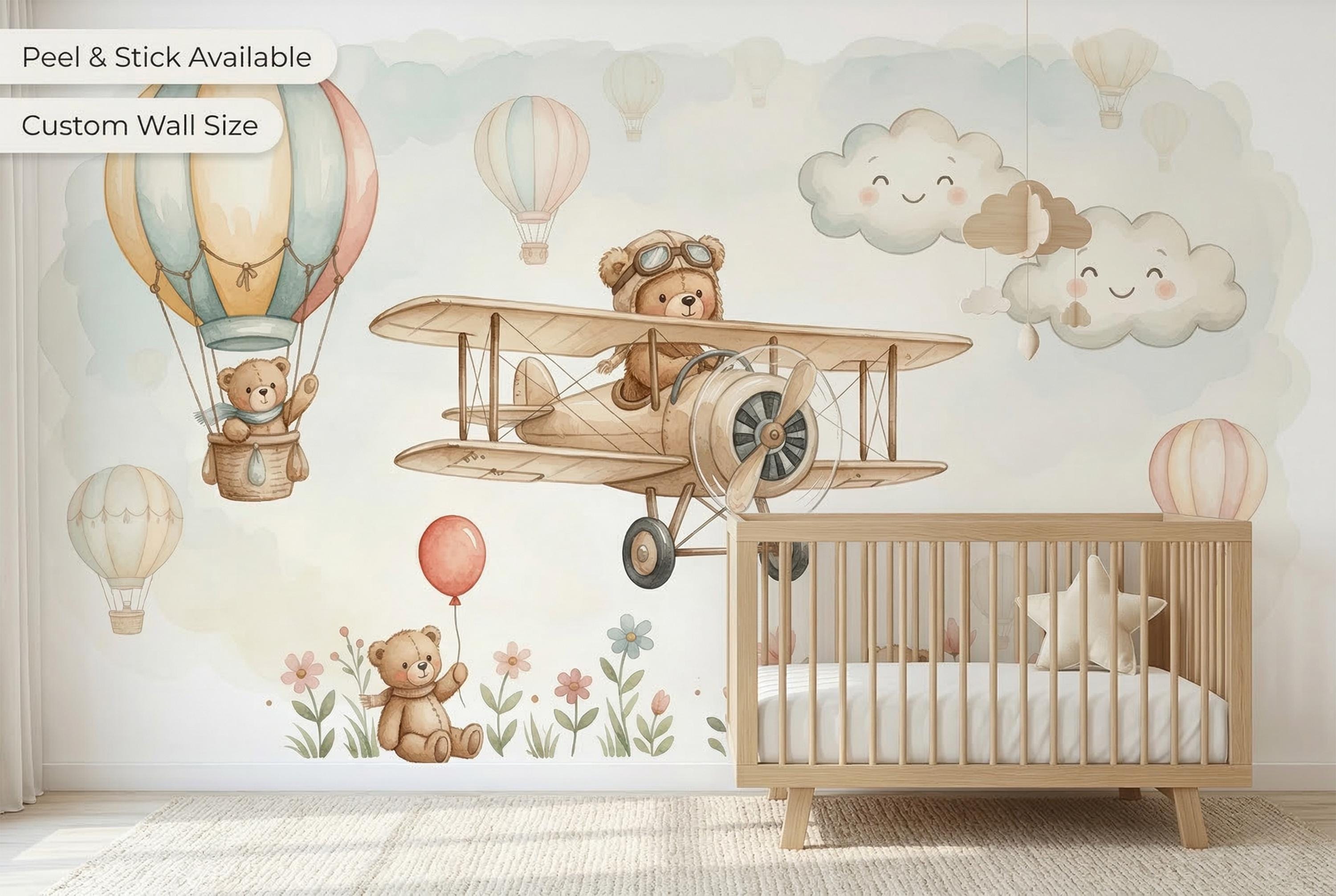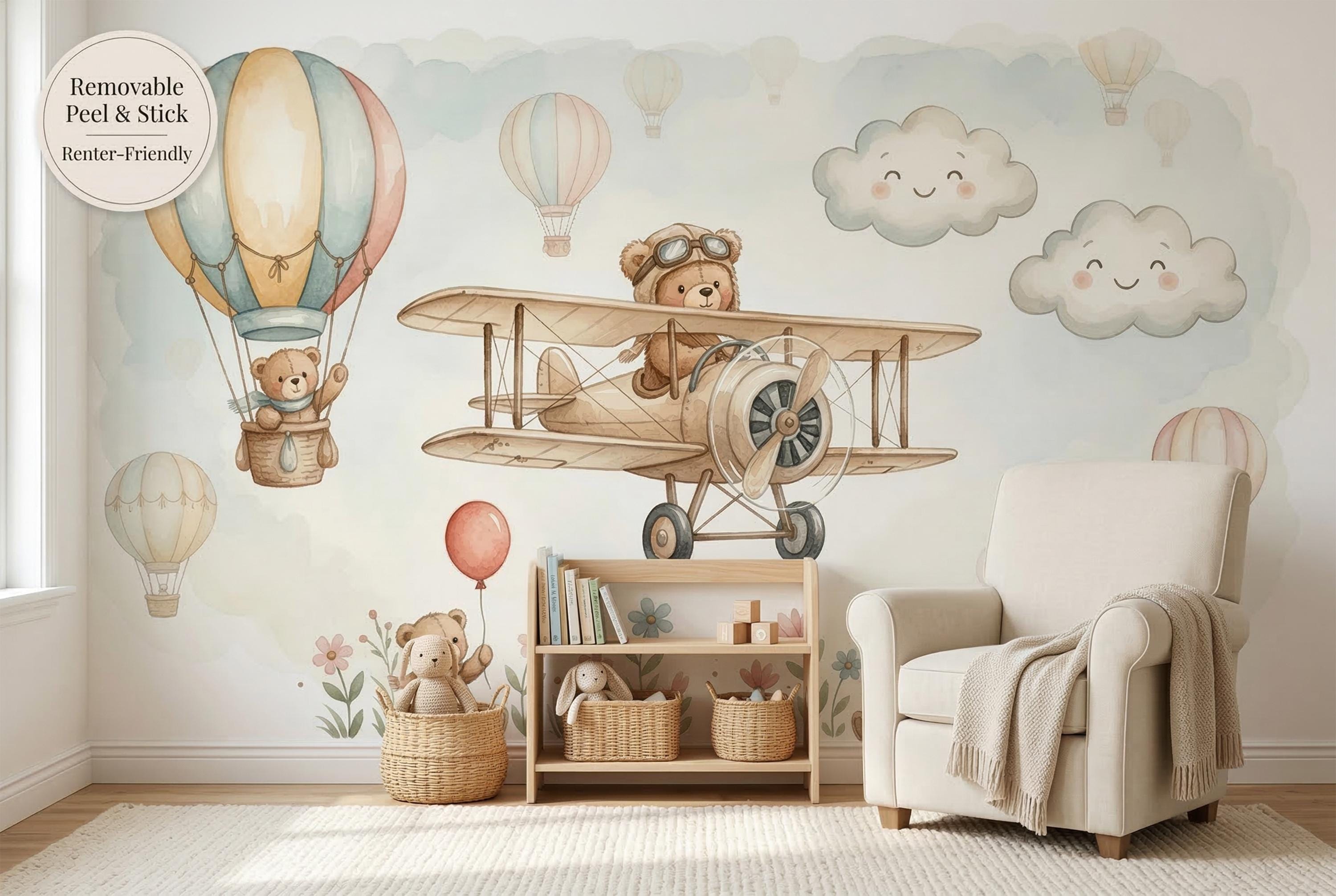 π» Teddy Bear Airplane Nursery Peel & Stick Wallpaper β Watercolor Hot Air Balloon Mural
