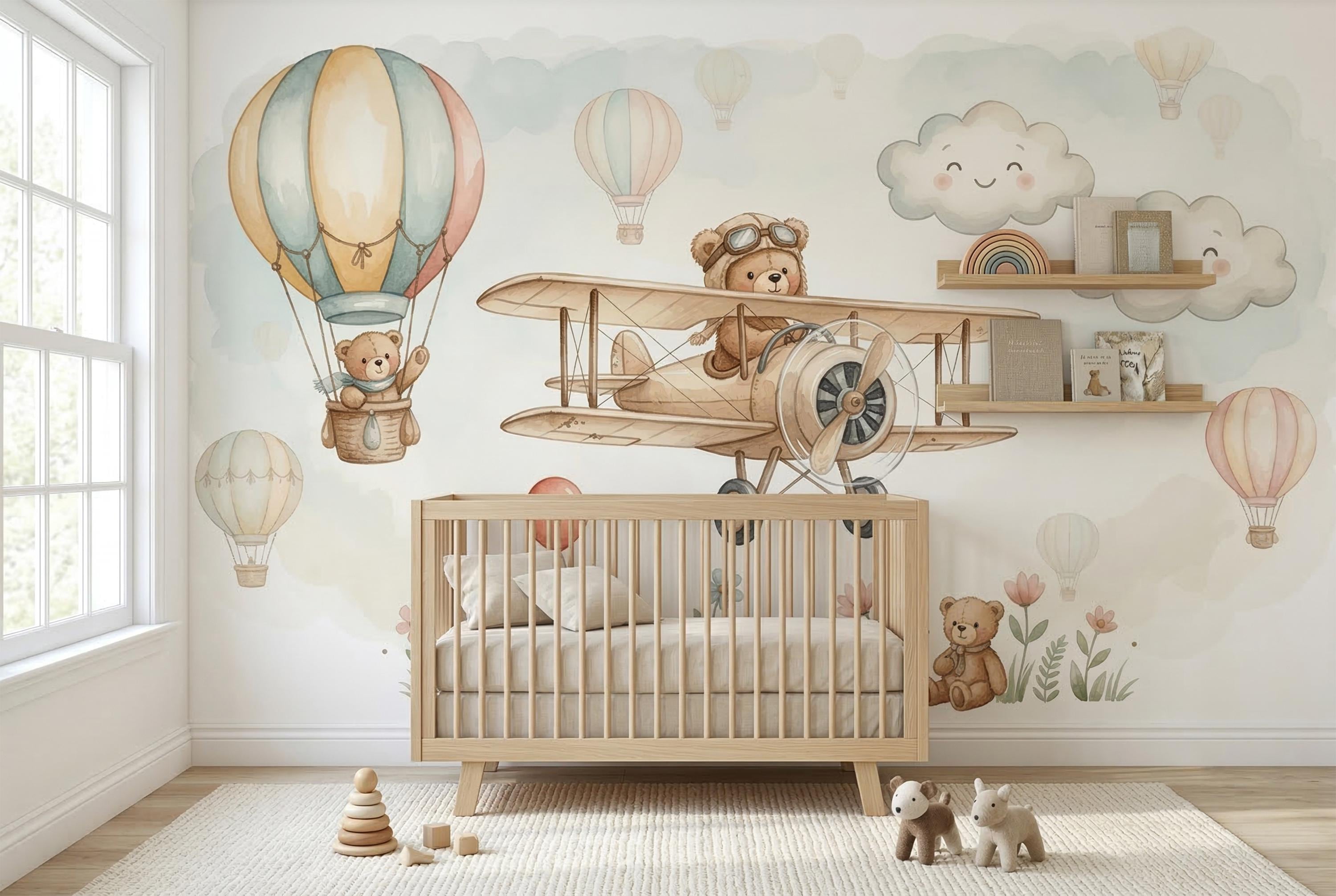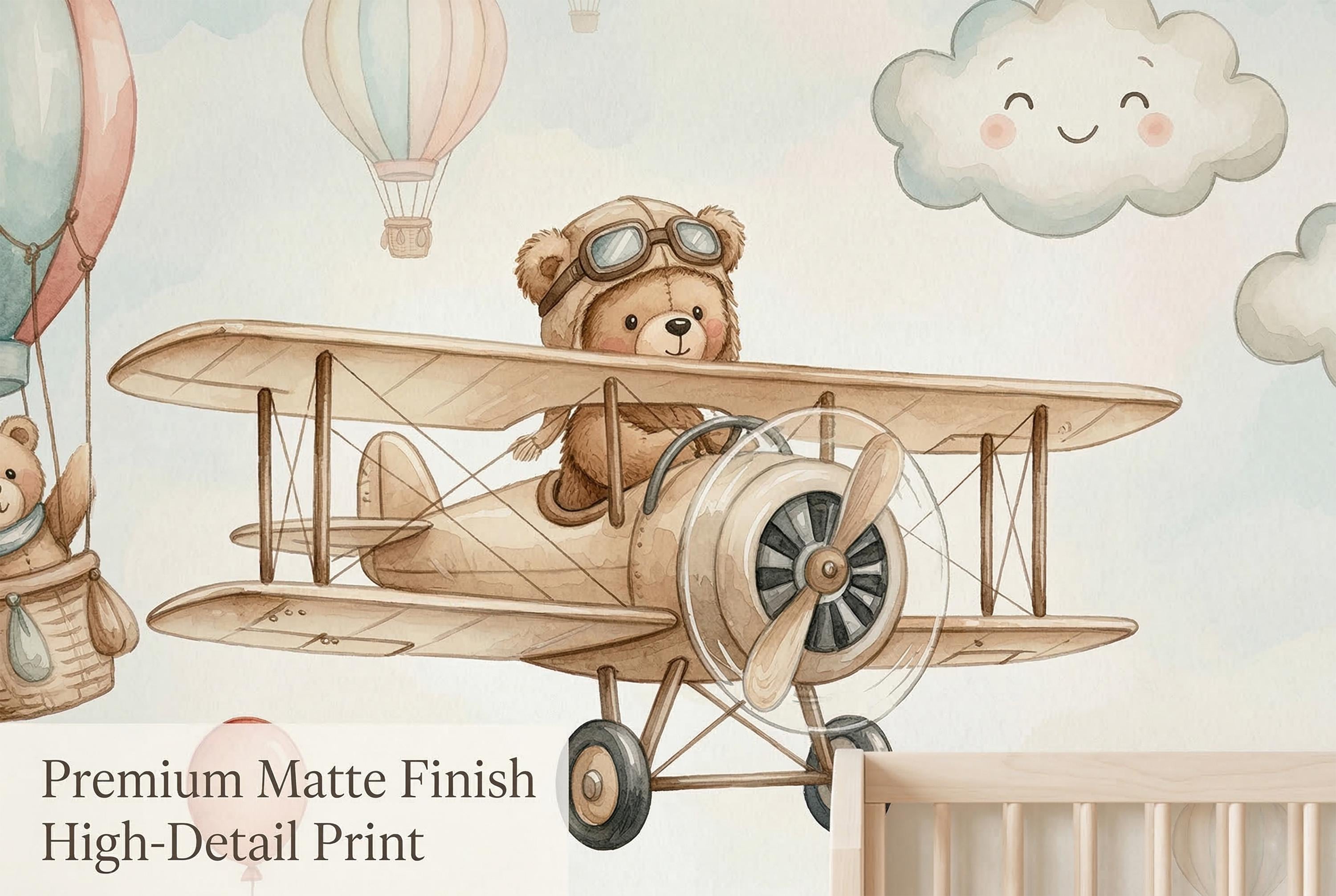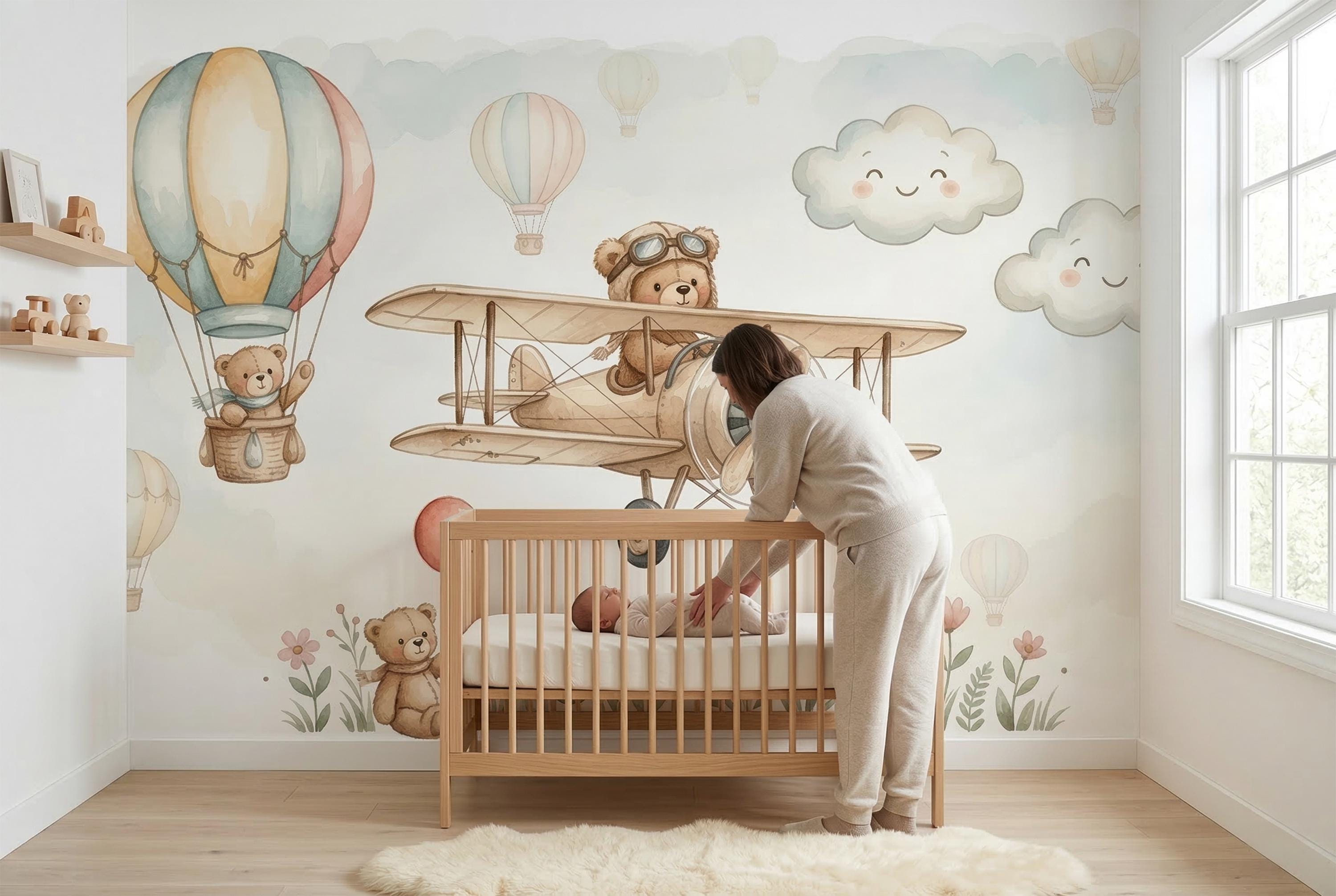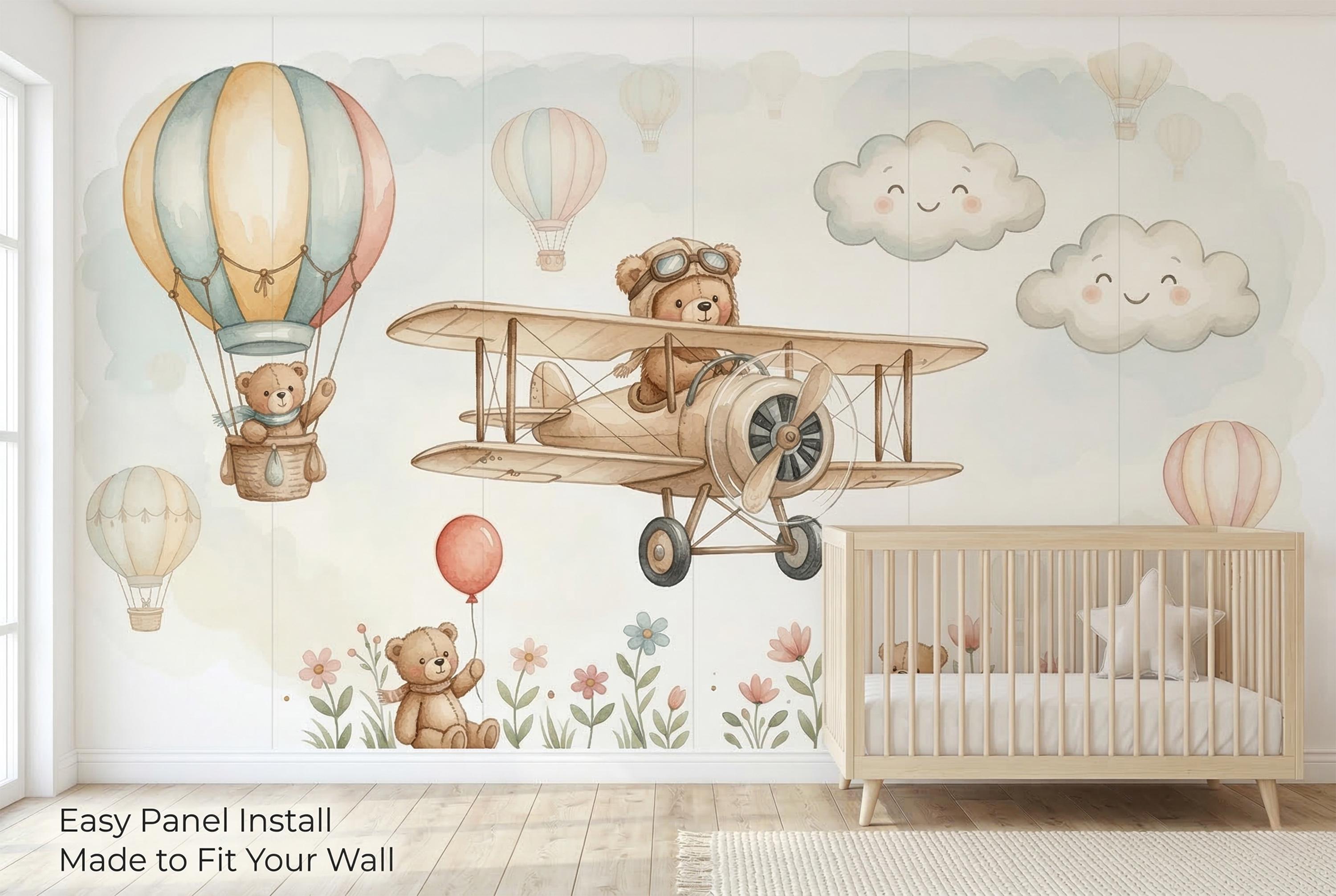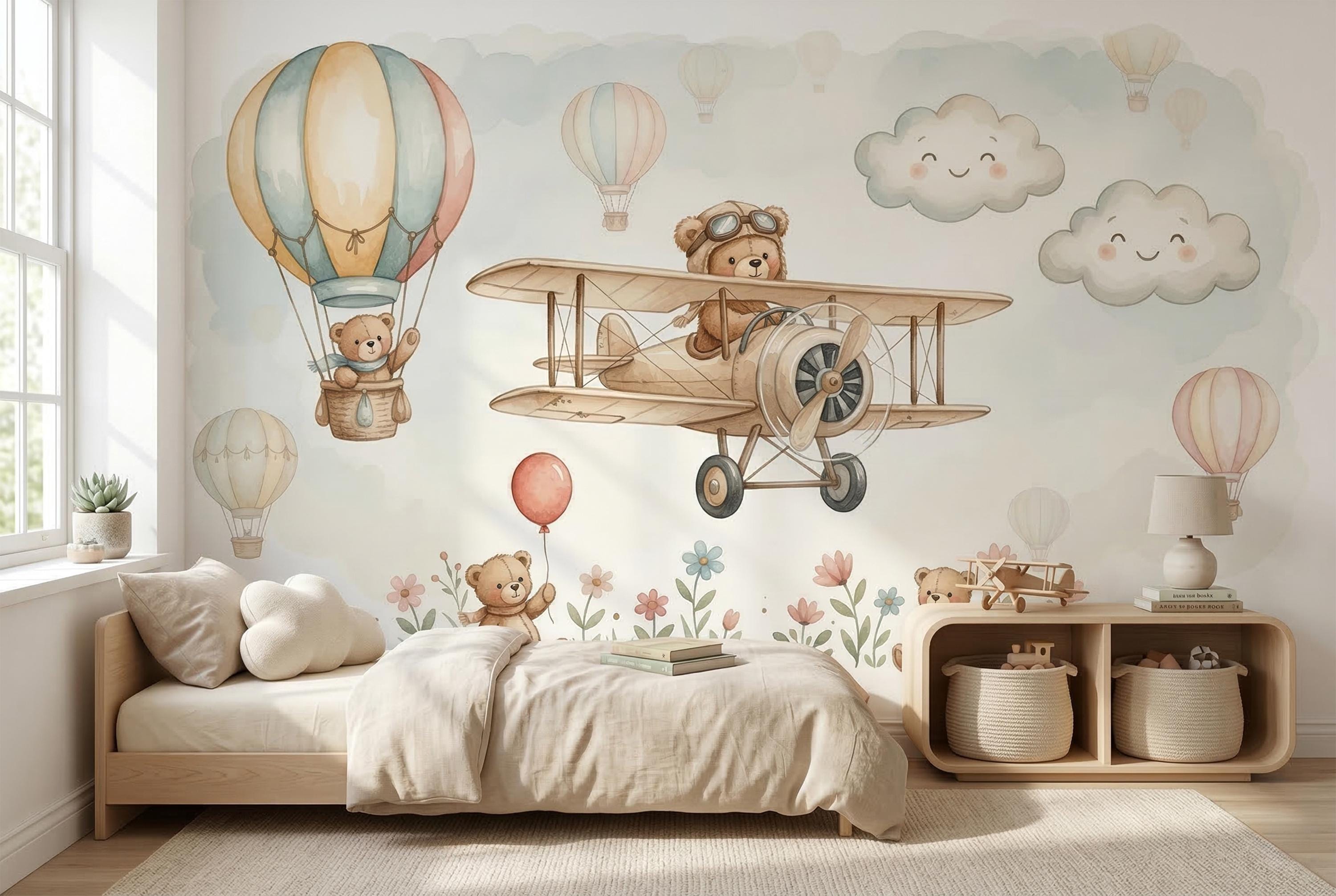 Welcome to the nursery every parent dreams of creating. This enchanting Watercolor Teddy Bear Airplane Wallpaper Mural by WallpaperPixi wraps your baby's room in the softest, most heartwarming scene imaginable β a brave little bear in aviator goggles pilots a vintage wooden biplane across a dreamy sky, while a fellow bear waves from a pastel hot air balloon basket overhead. Smiling rosy-cheeked clouds drift by, a cheerful red balloon floats free, and along the bottom, three sweet bears sit among watercolor wildflowers in pink, coral, and blue.