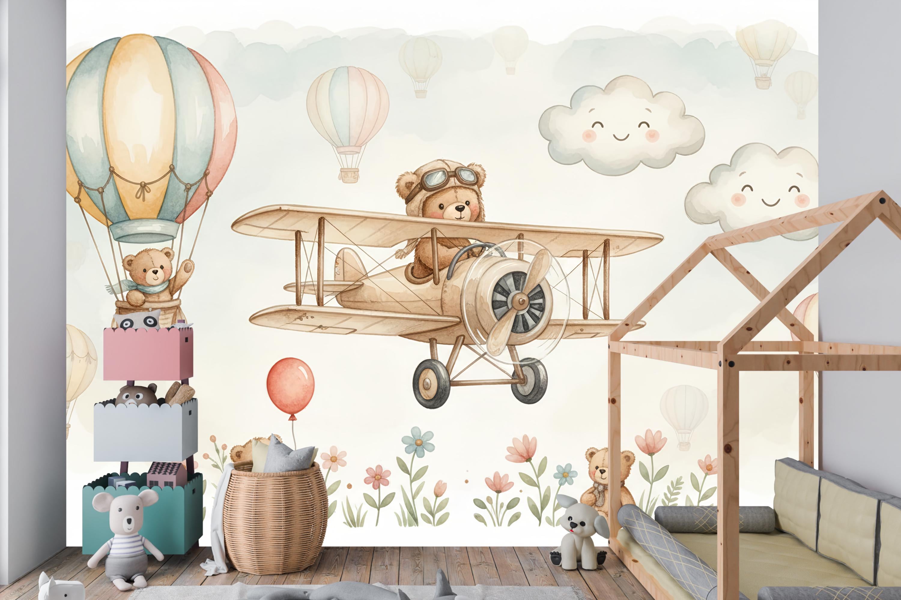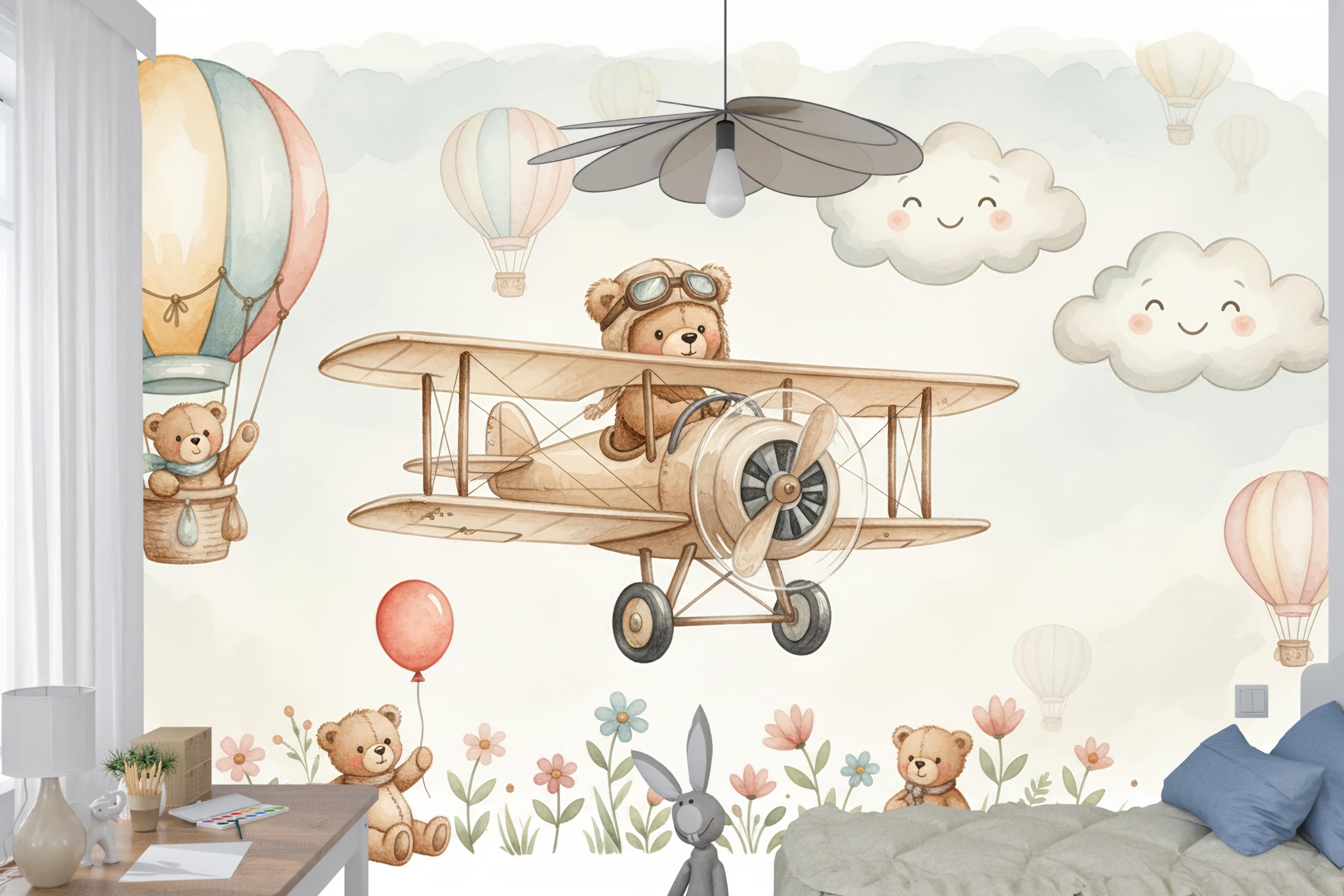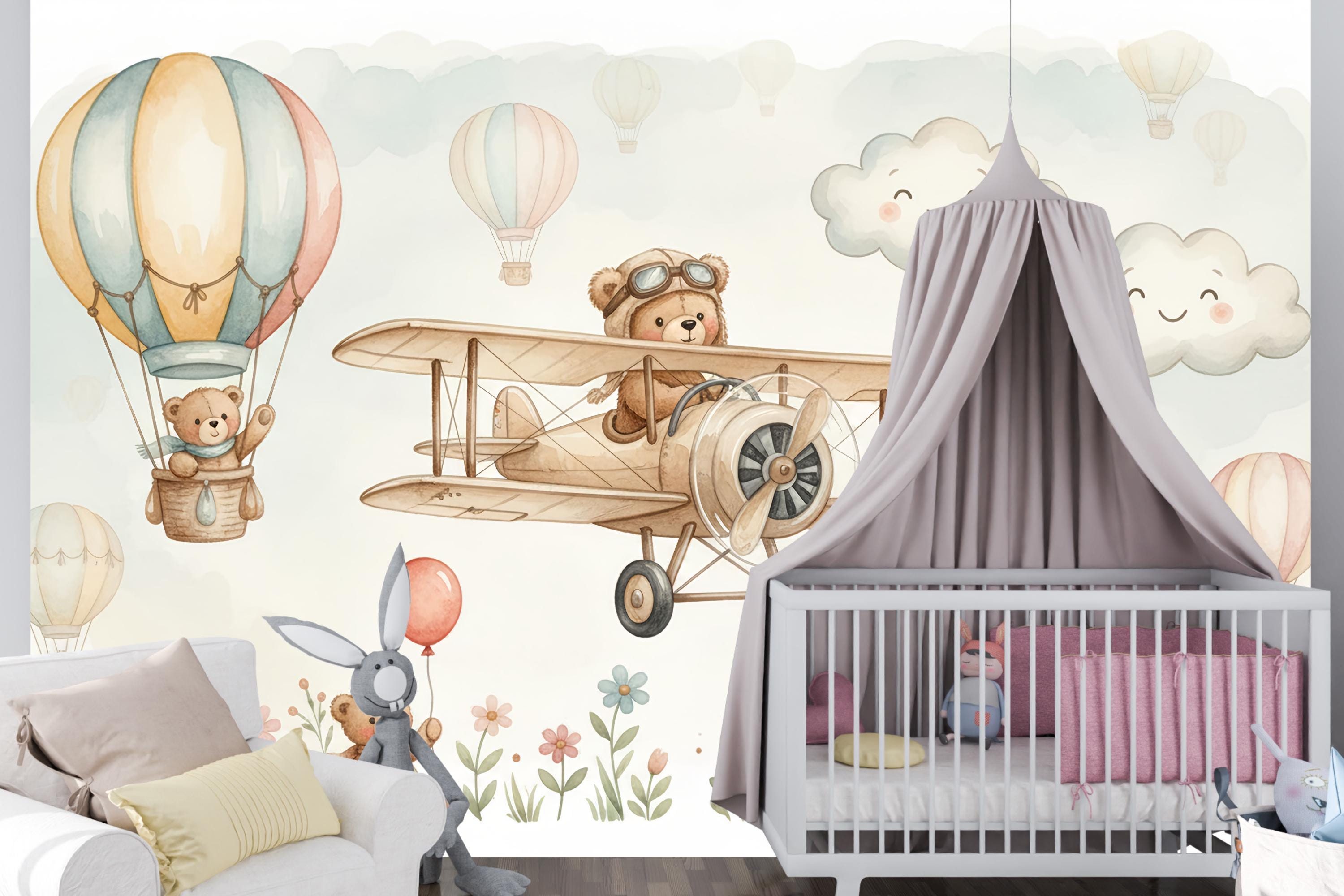 This Teddy Bear Aviation Nursery Wallpaper Mural turns your baby’s room into a dreamy sky filled with pastel balloons, vintage airplanes, smiling clouds, and adorable bears ready for takeoff. Gentle watercolor tones create a calm, storybook atmosphere — perfect for newborns, toddlers, and growing imaginations.