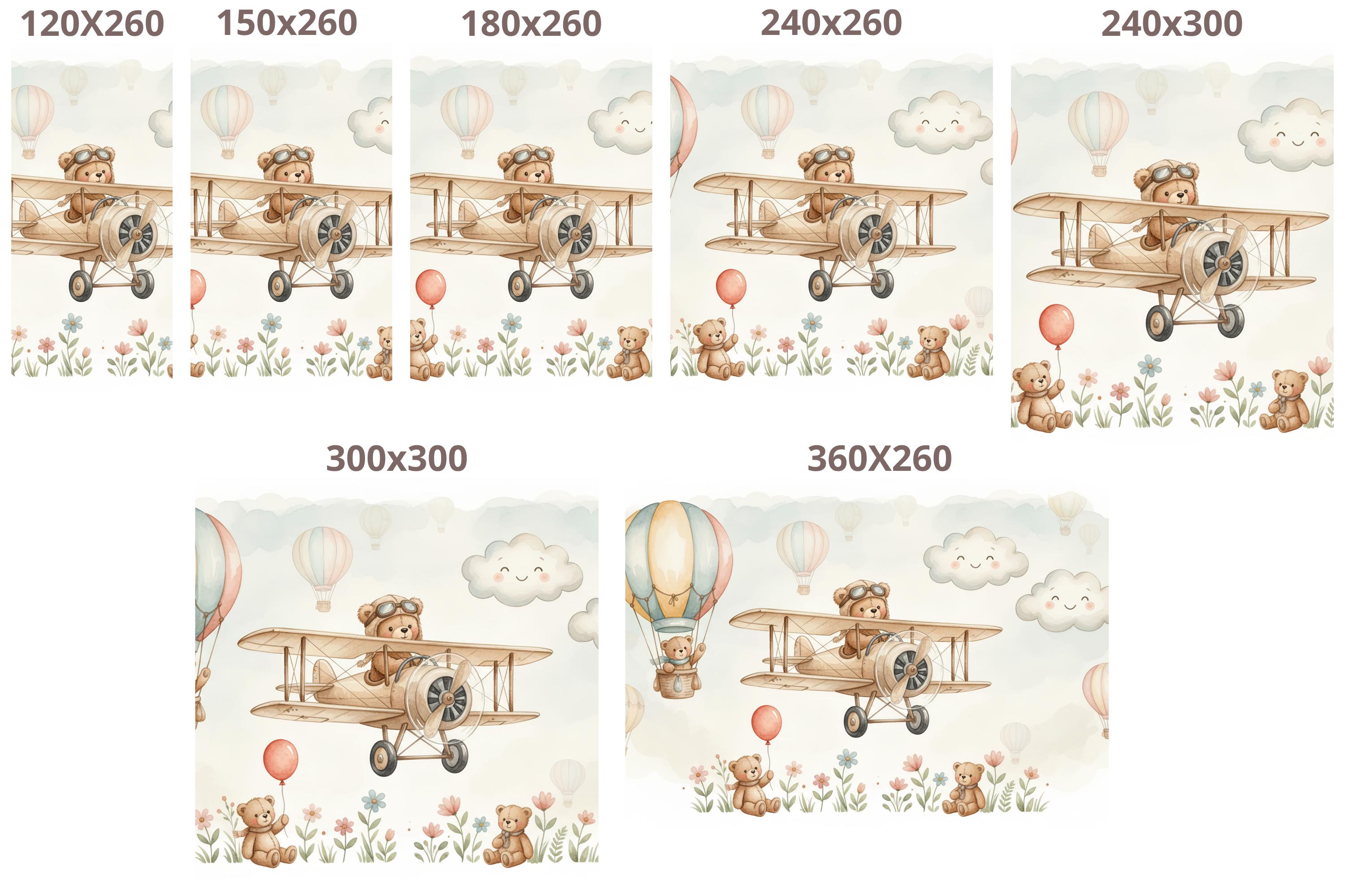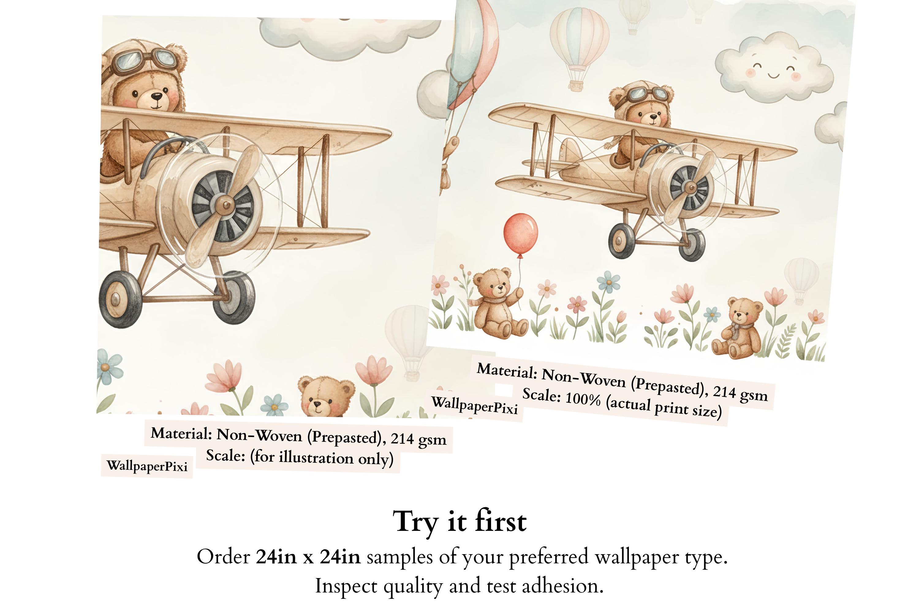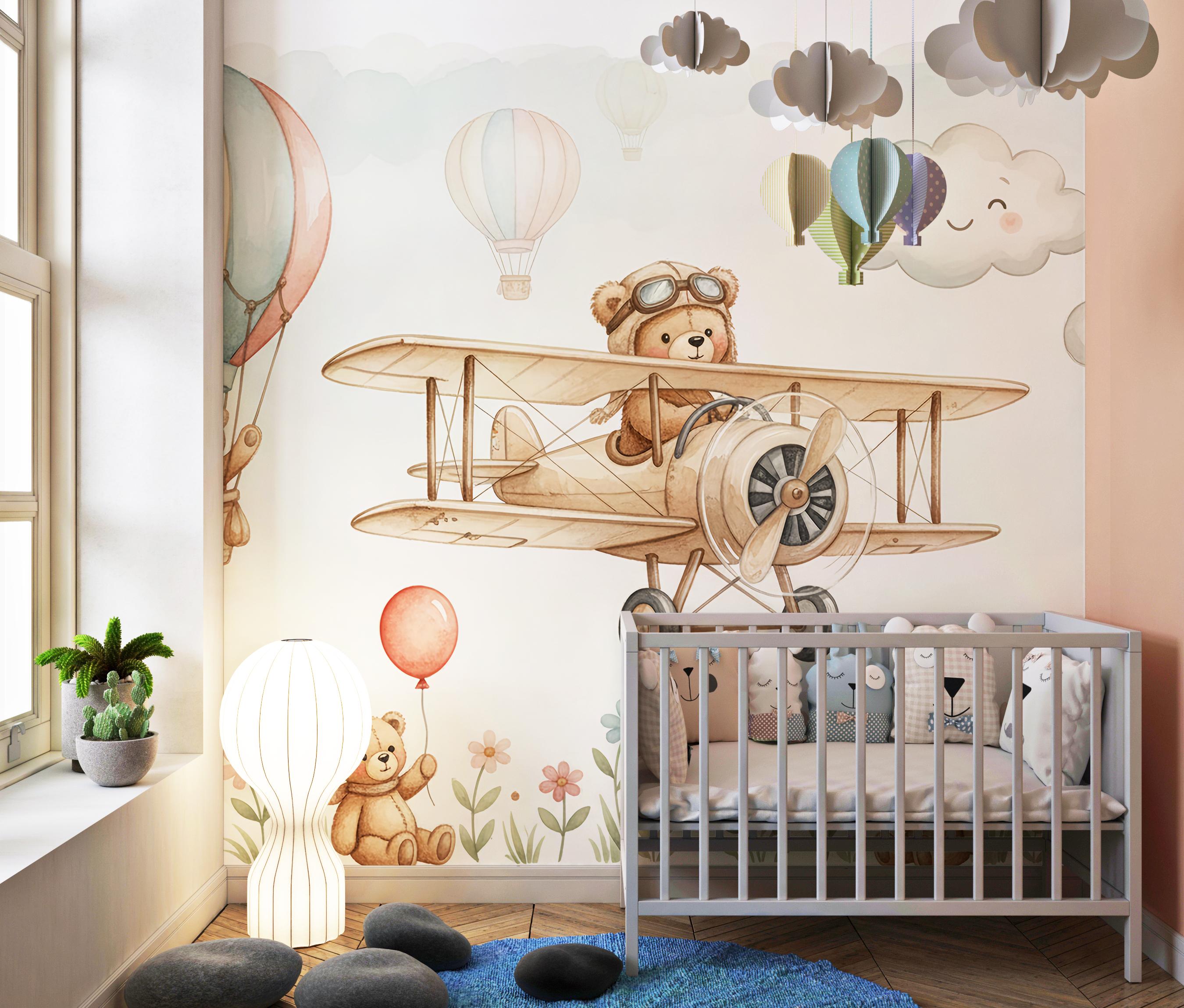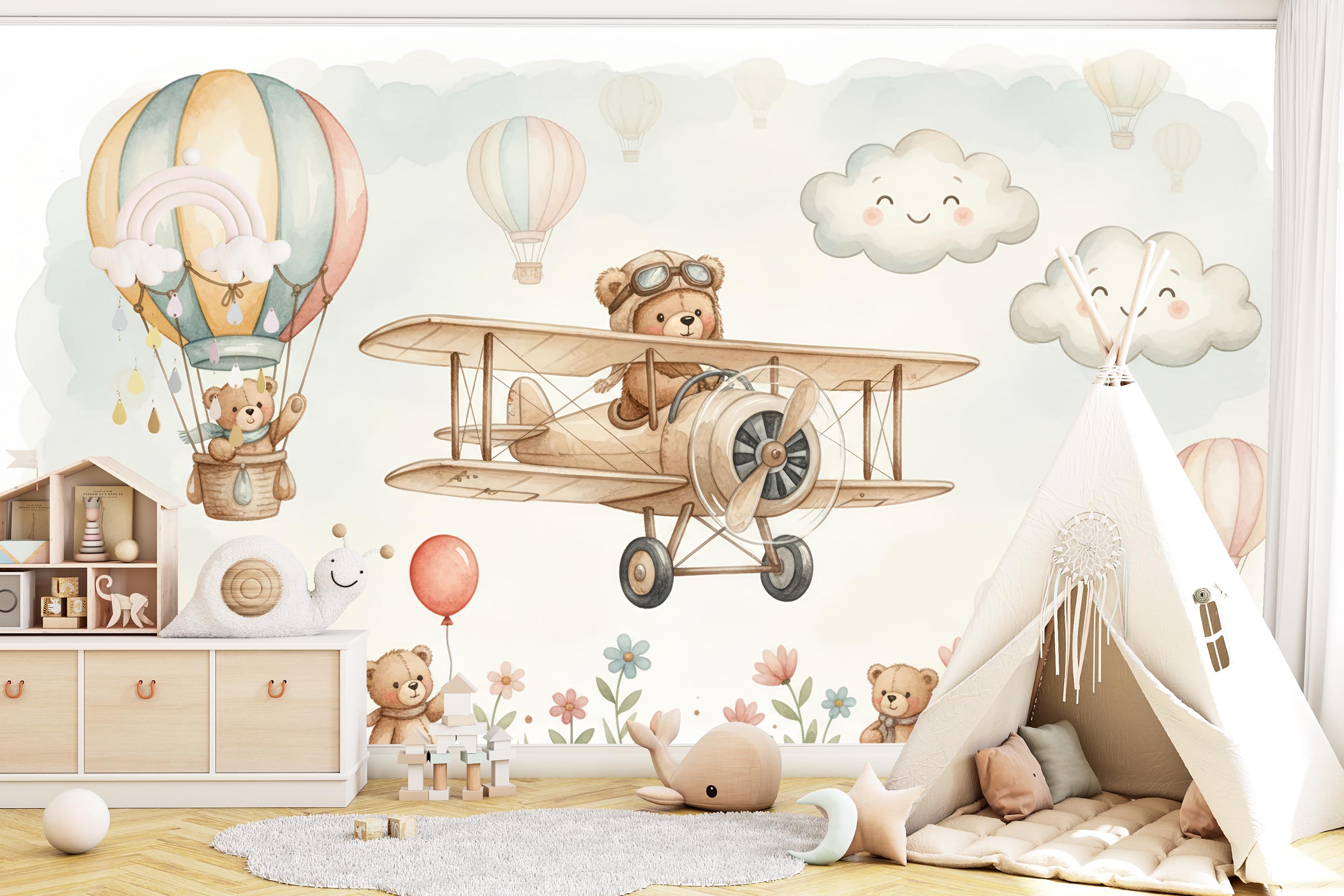 This Teddy Bear Aviation Nursery Wallpaper Mural turns your baby’s room into a dreamy sky filled with pastel balloons, vintage airplanes, smiling clouds, and adorable bears ready for takeoff. Gentle watercolor tones create a calm, storybook atmosphere — perfect for newborns, toddlers, and growing imaginations.