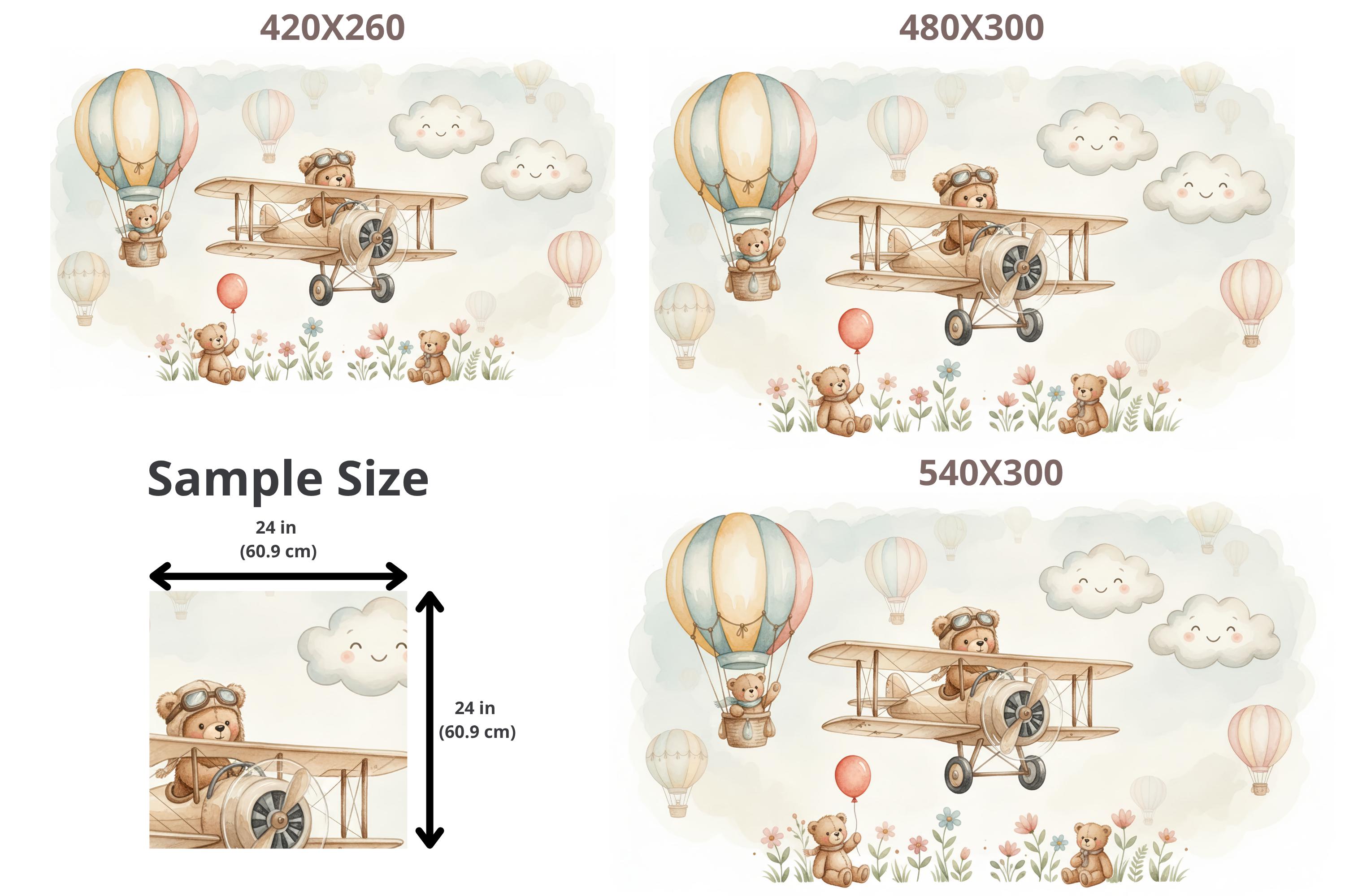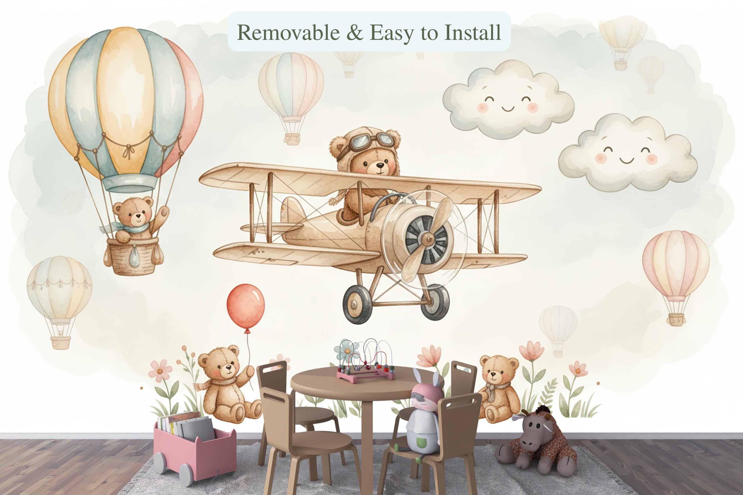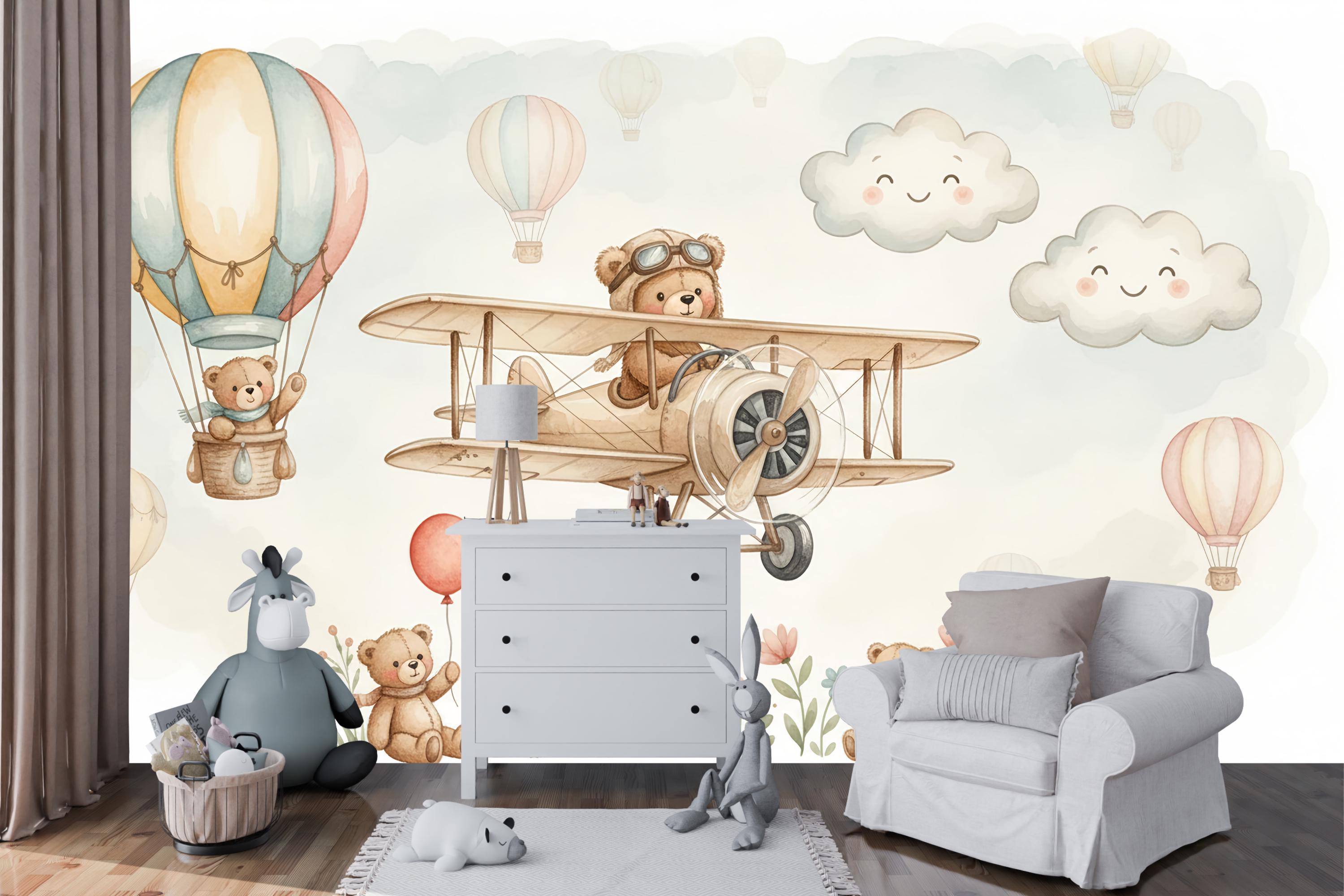 Designed to inspire wonder, this mural captures the joy of tiny adventures. Each teddy bear invites your child into a gentle world where the sky is welcoming, clouds are smiling, and dreams feel close enough to touch.