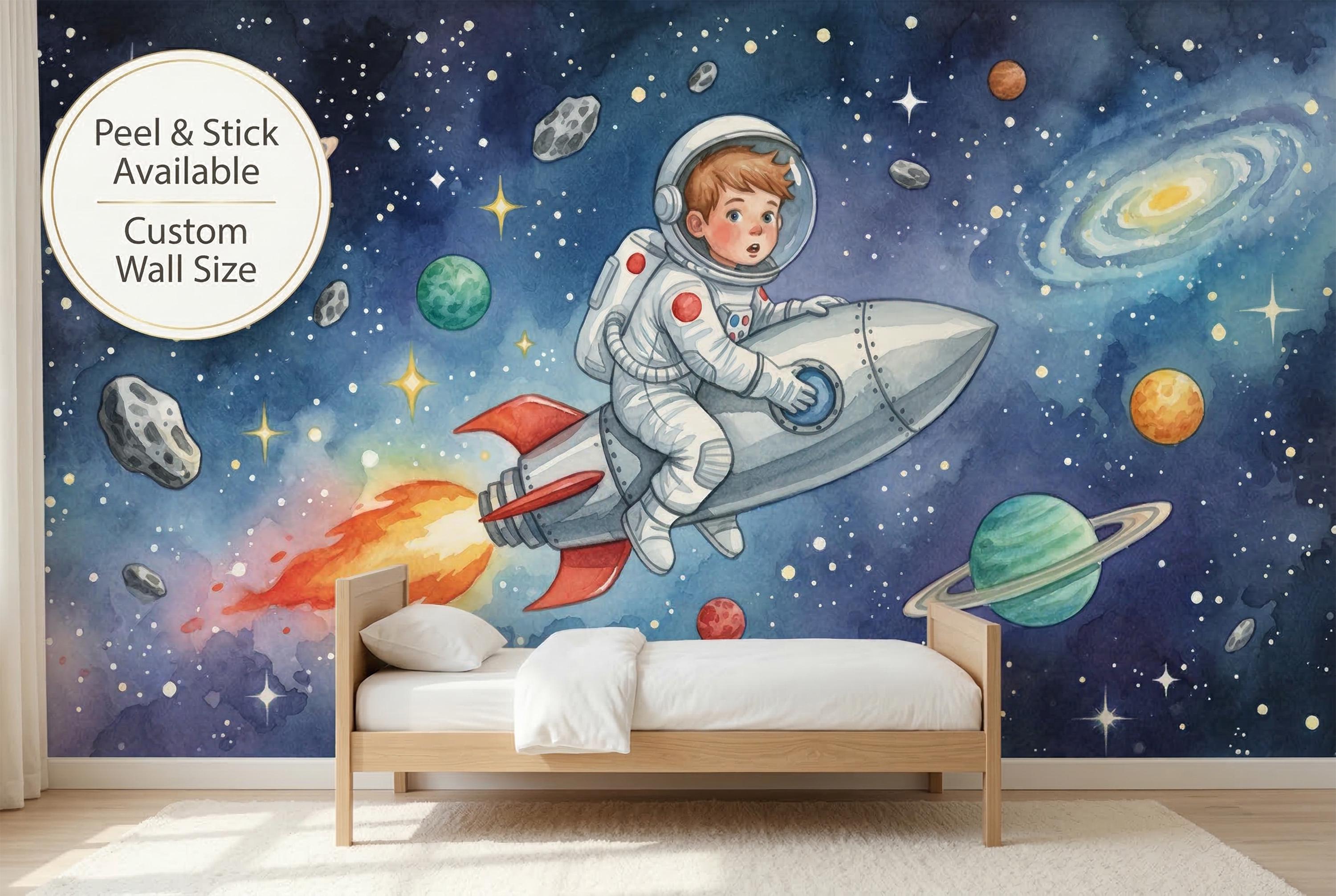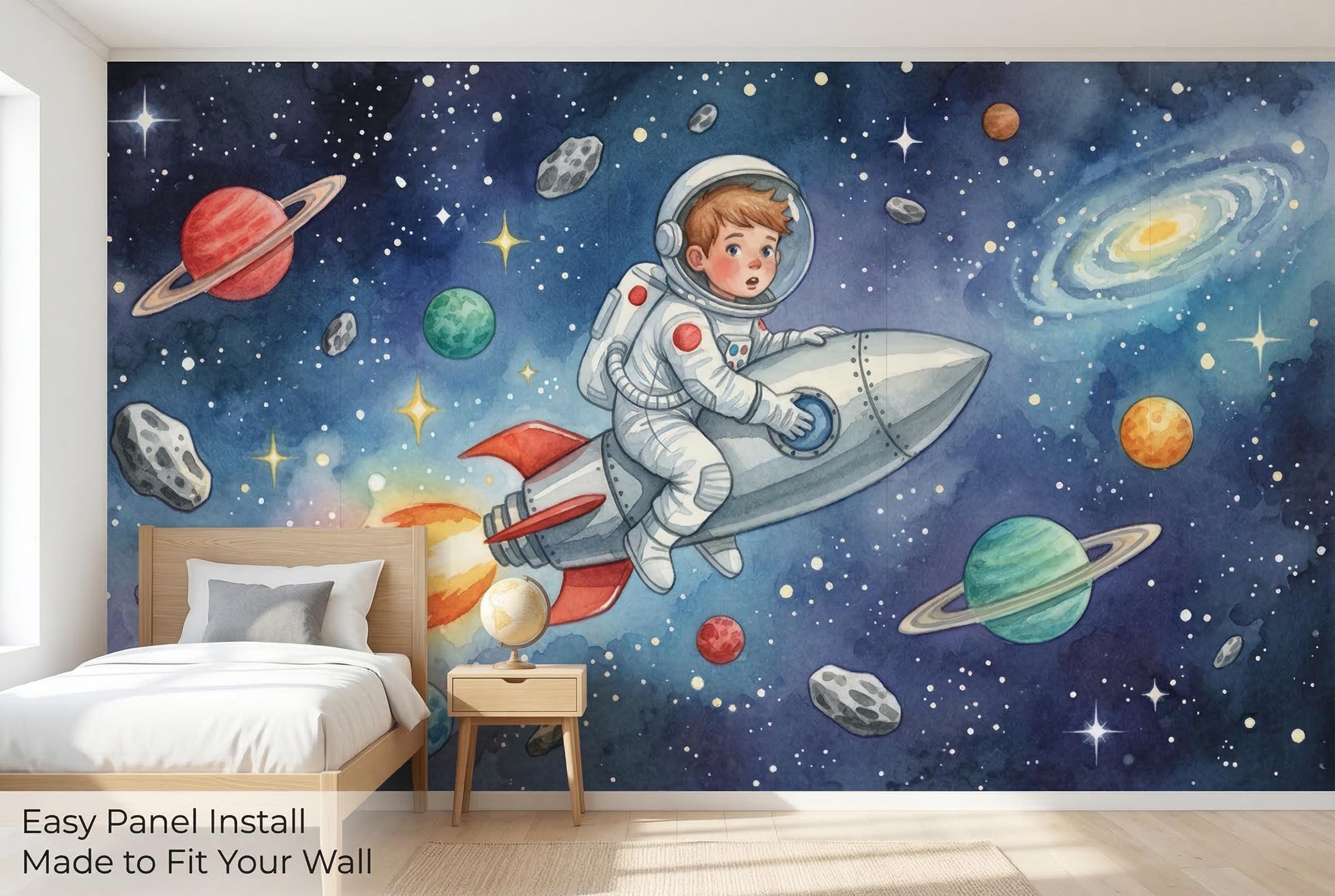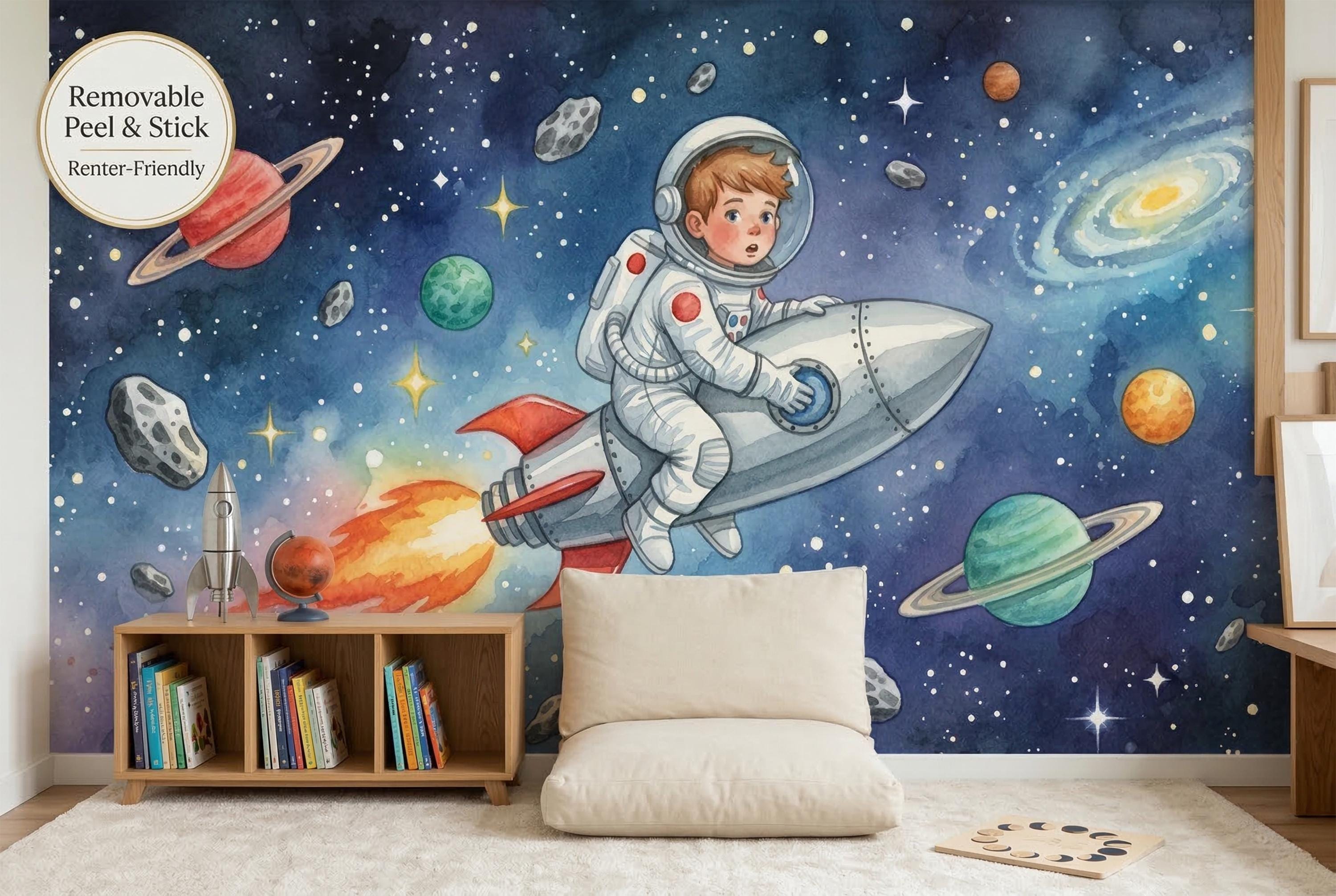 π Space Astronaut Boy Peel & Stick Wallpaper Mural β Watercolor Rocket Galaxy Kids