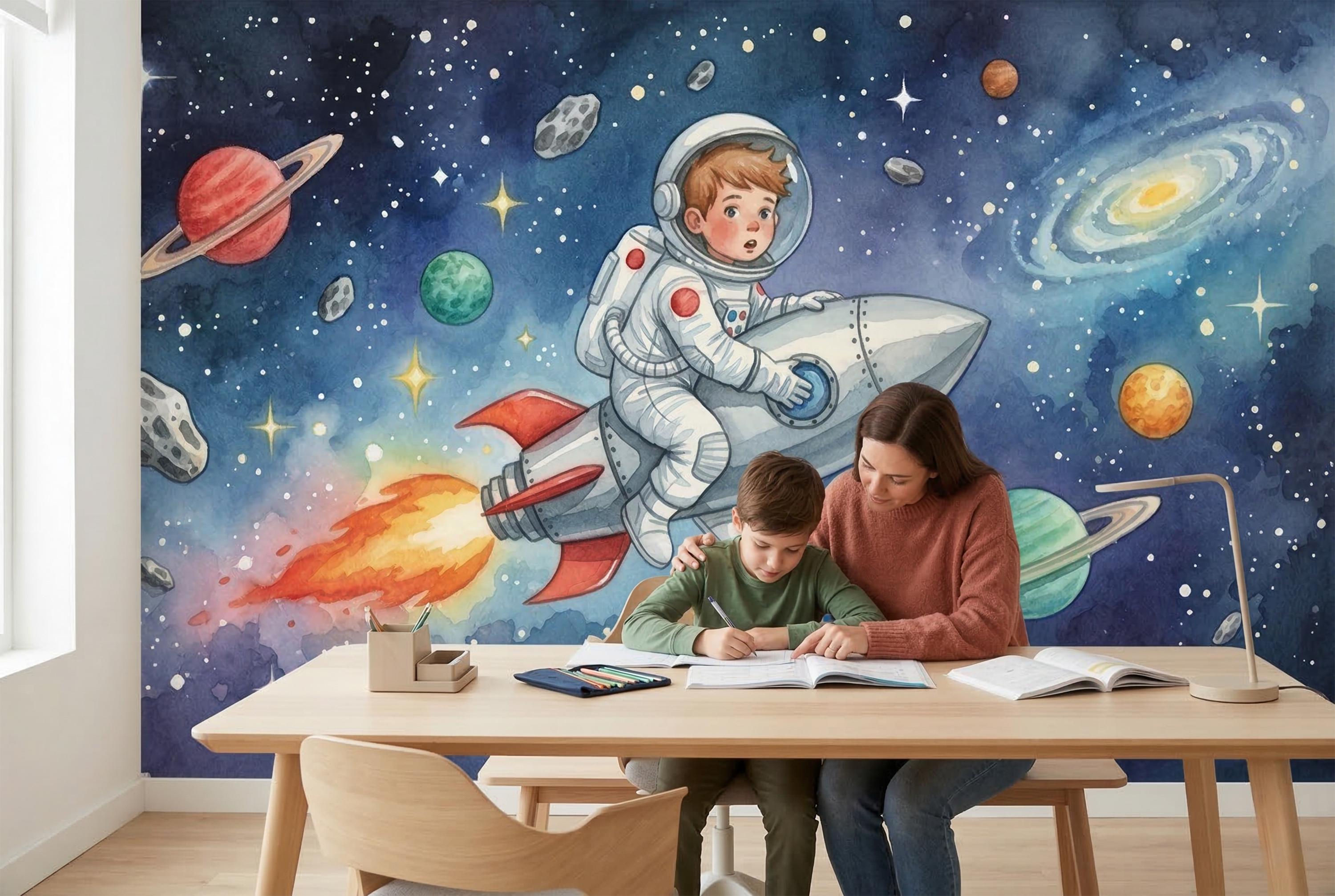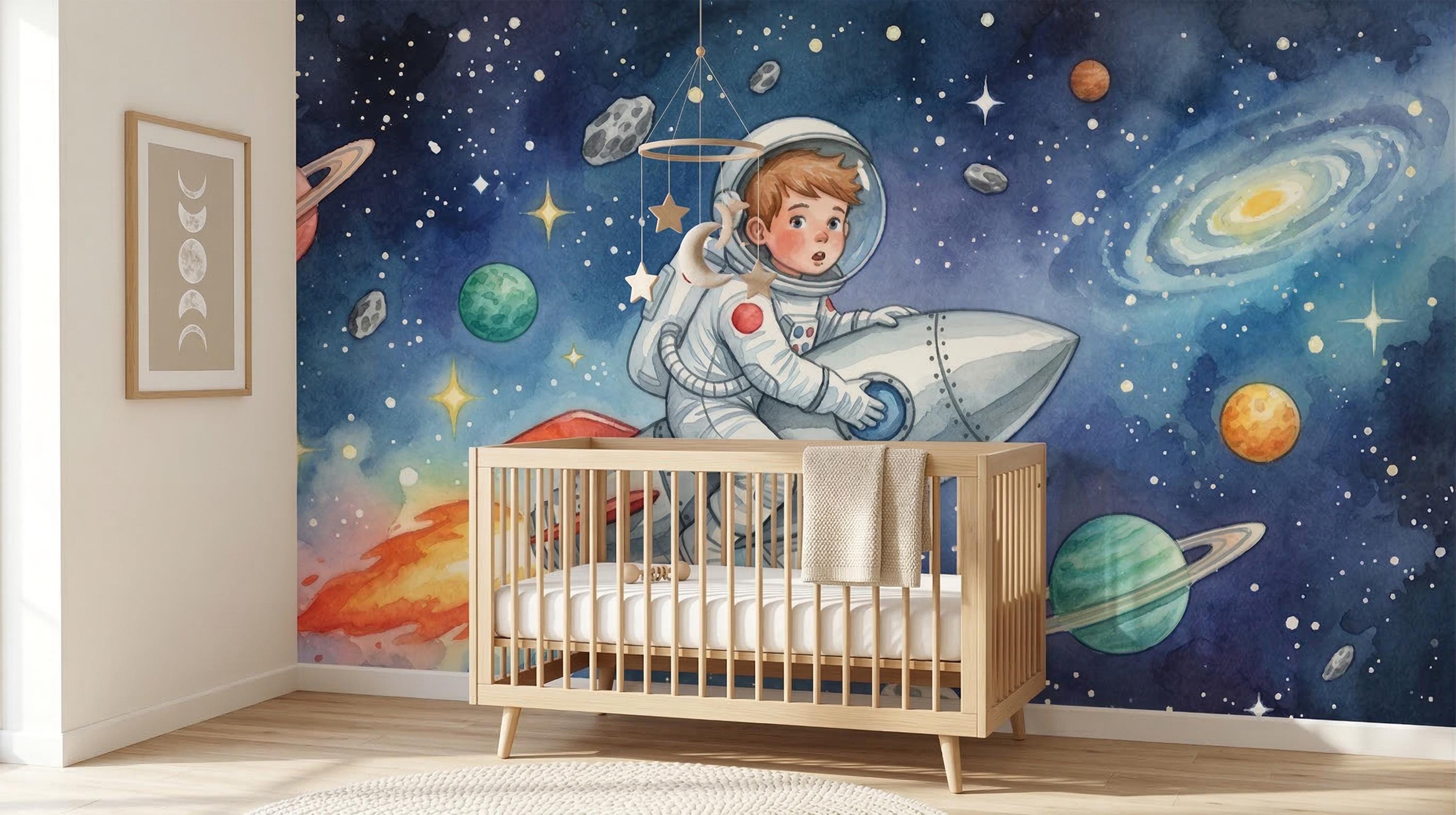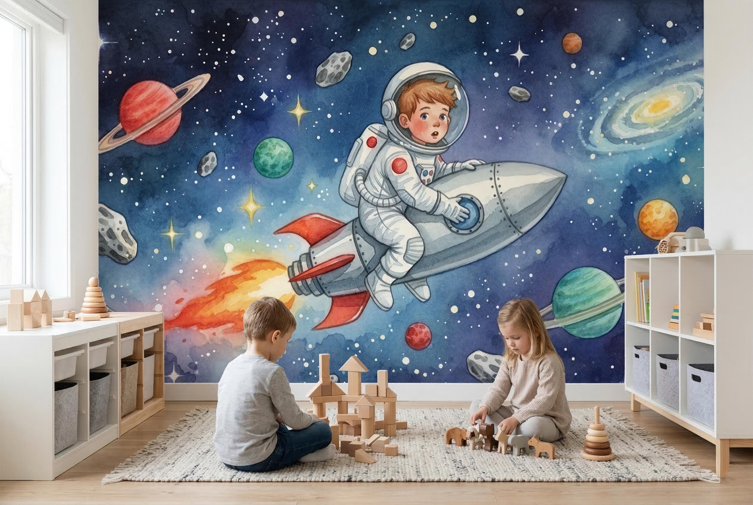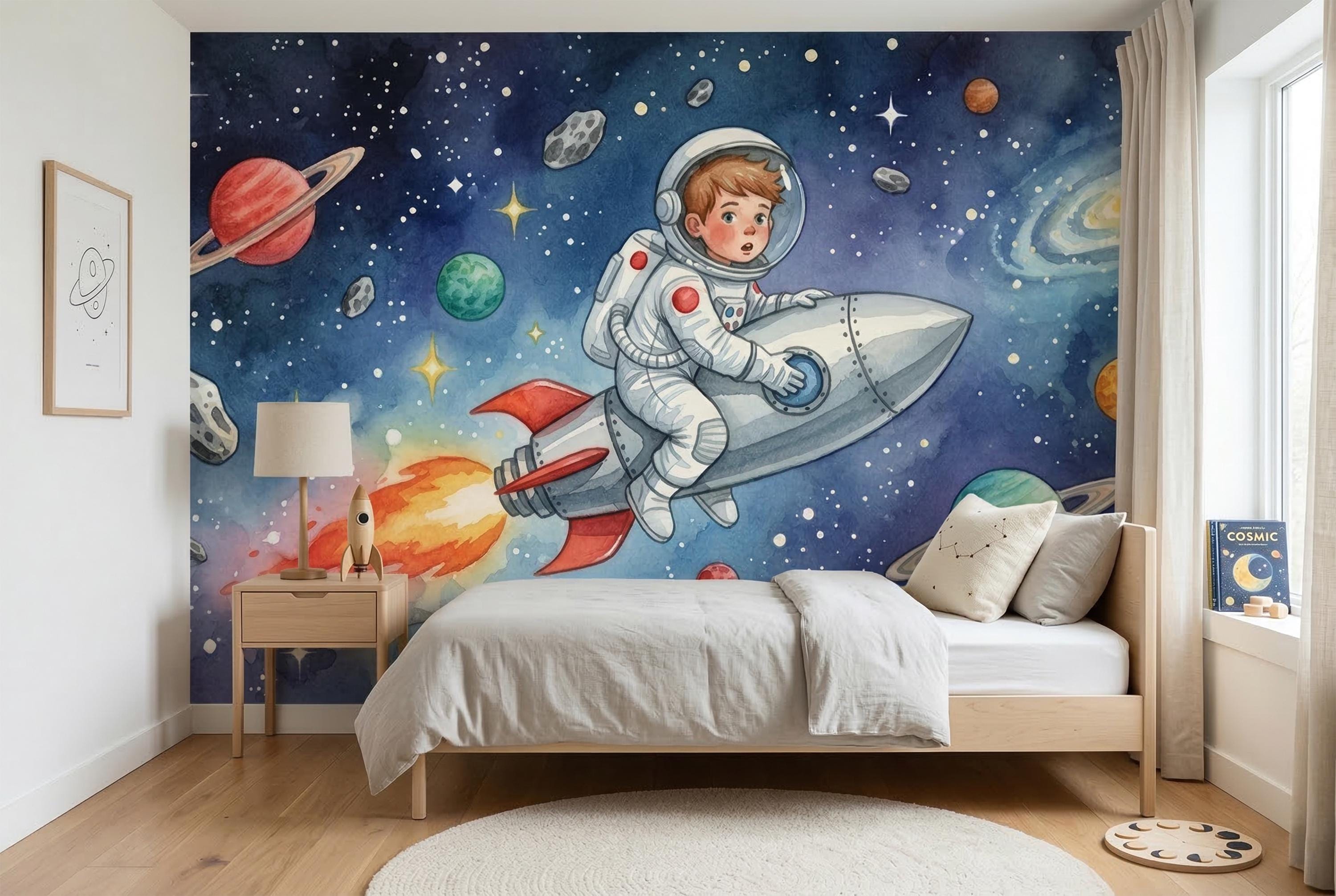 π Space Astronaut Boy Peel & Stick Wallpaper Mural β Watercolor Rocket Galaxy Kids