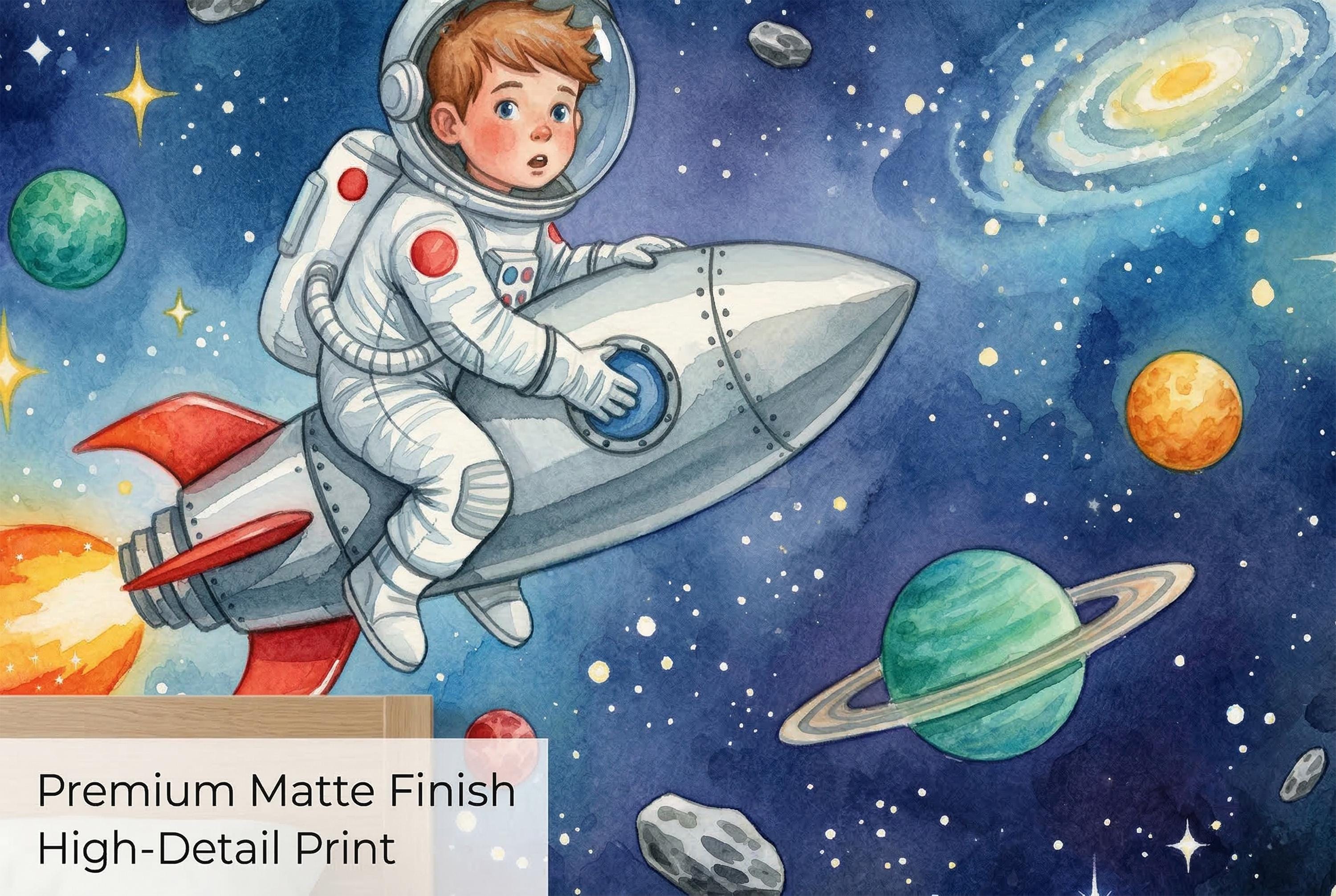 Space is the single most enduring theme in children's bedroom design β and this design rises above the category entirely. The watercolor technique gives it the feel of a handpainted storybook illustration rather than a mass-produced print. Every planet, every star cluster, every detail rewards a closer look.
