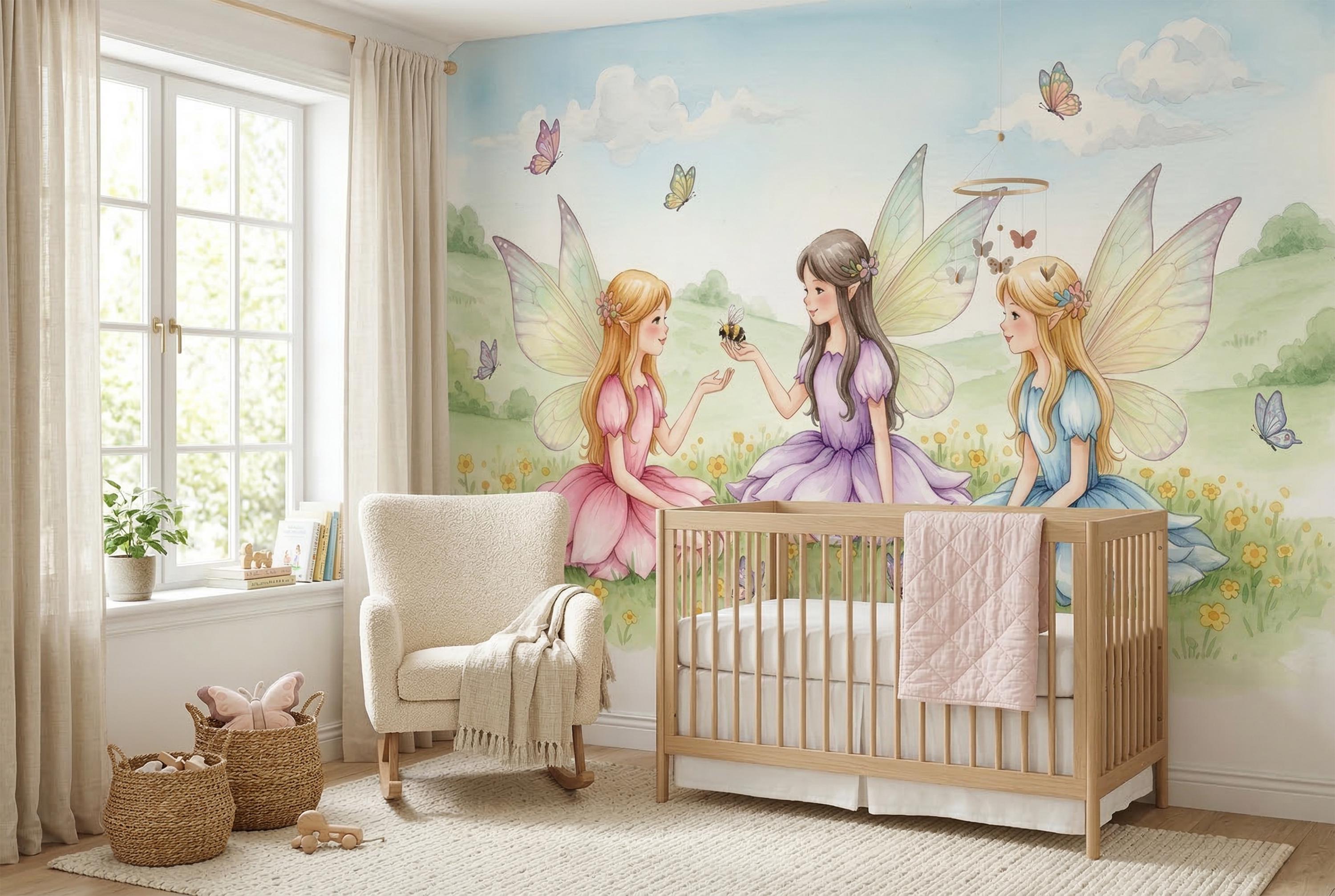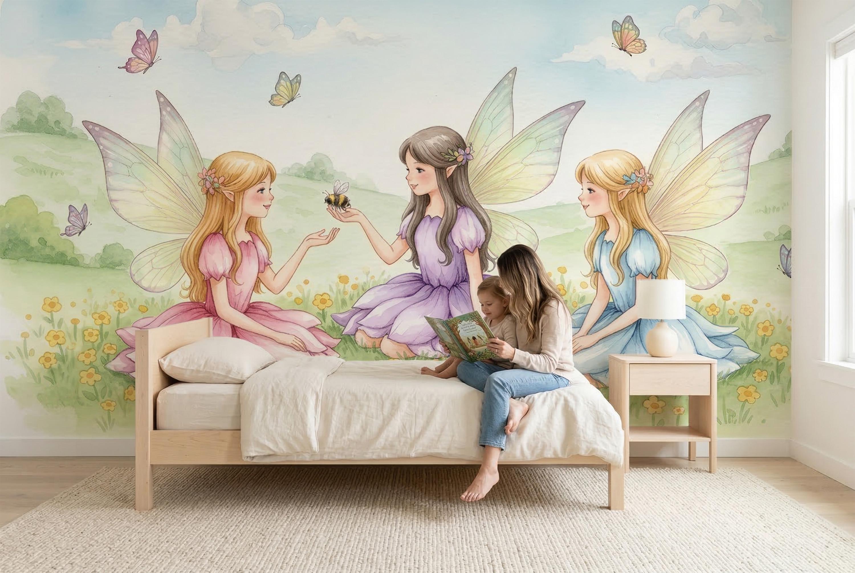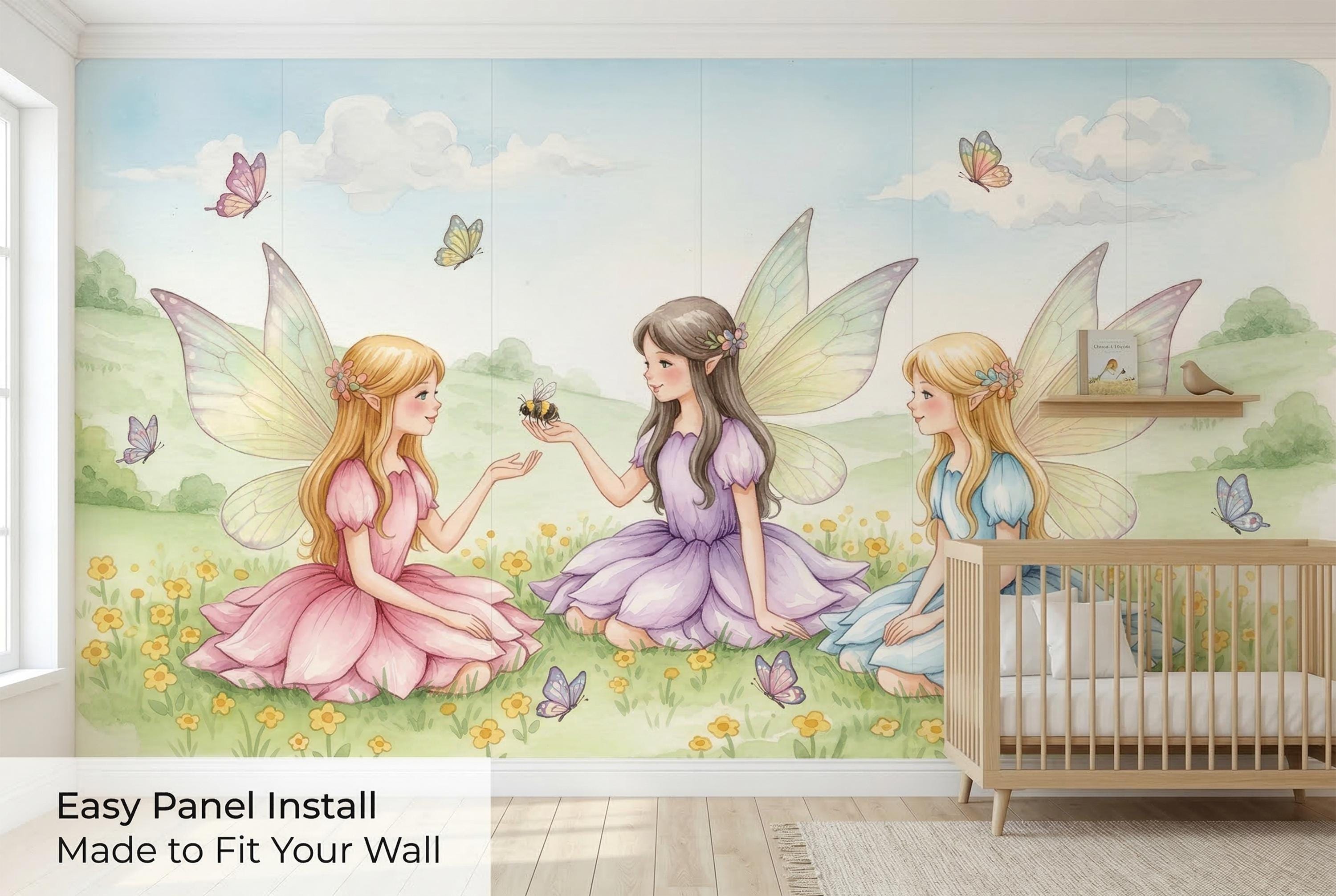 Turn your child’s room into a gentle storybook scene with this watercolor fairy wall mural. Three sweet fairies sit in a sunny meadow filled with tiny yellow flowers, butterflies, soft green hills, and a pale blue sky. Pastel dresses in pink, lavender, and light blue create a dreamy, calming mood that feels magical without being too bright.