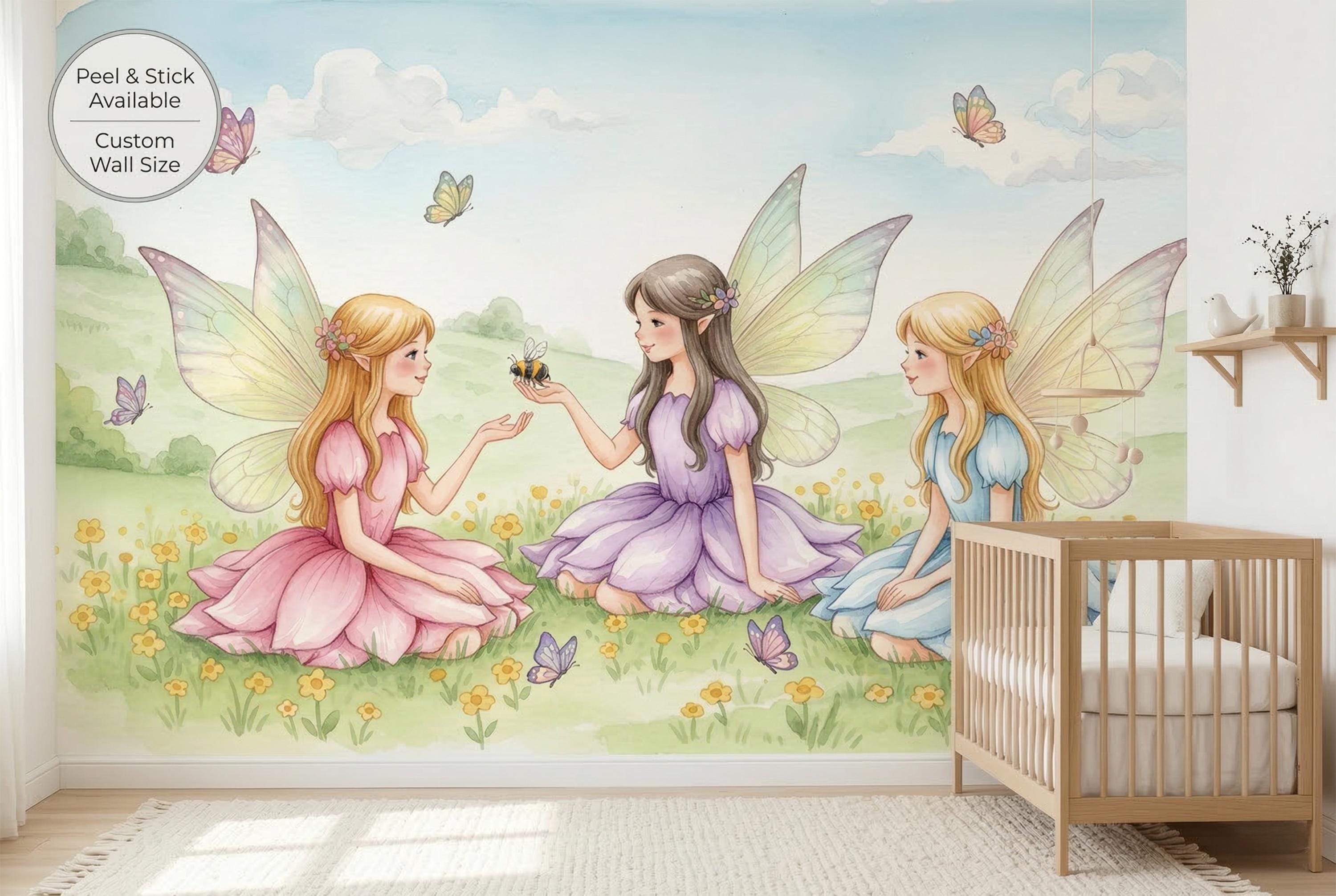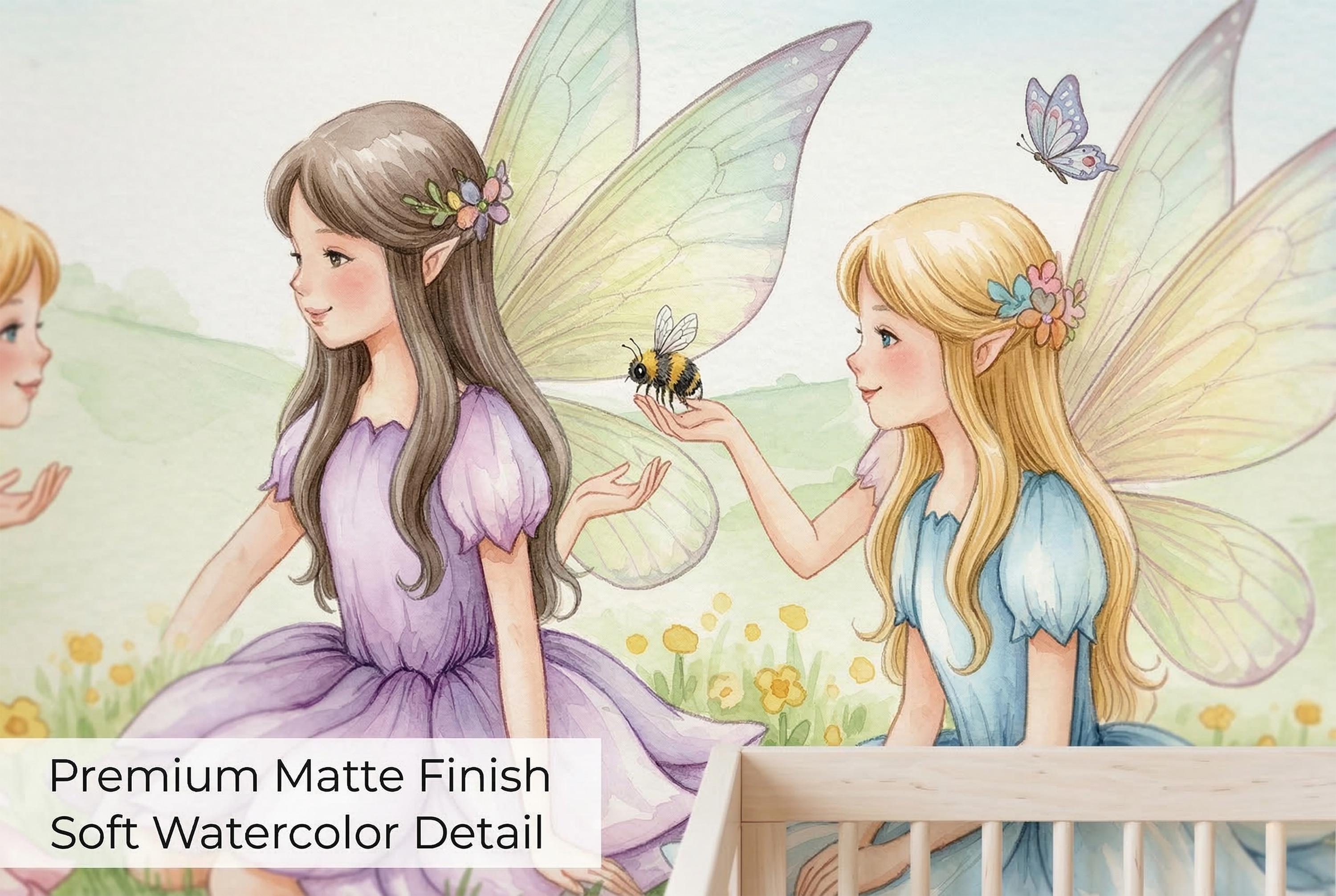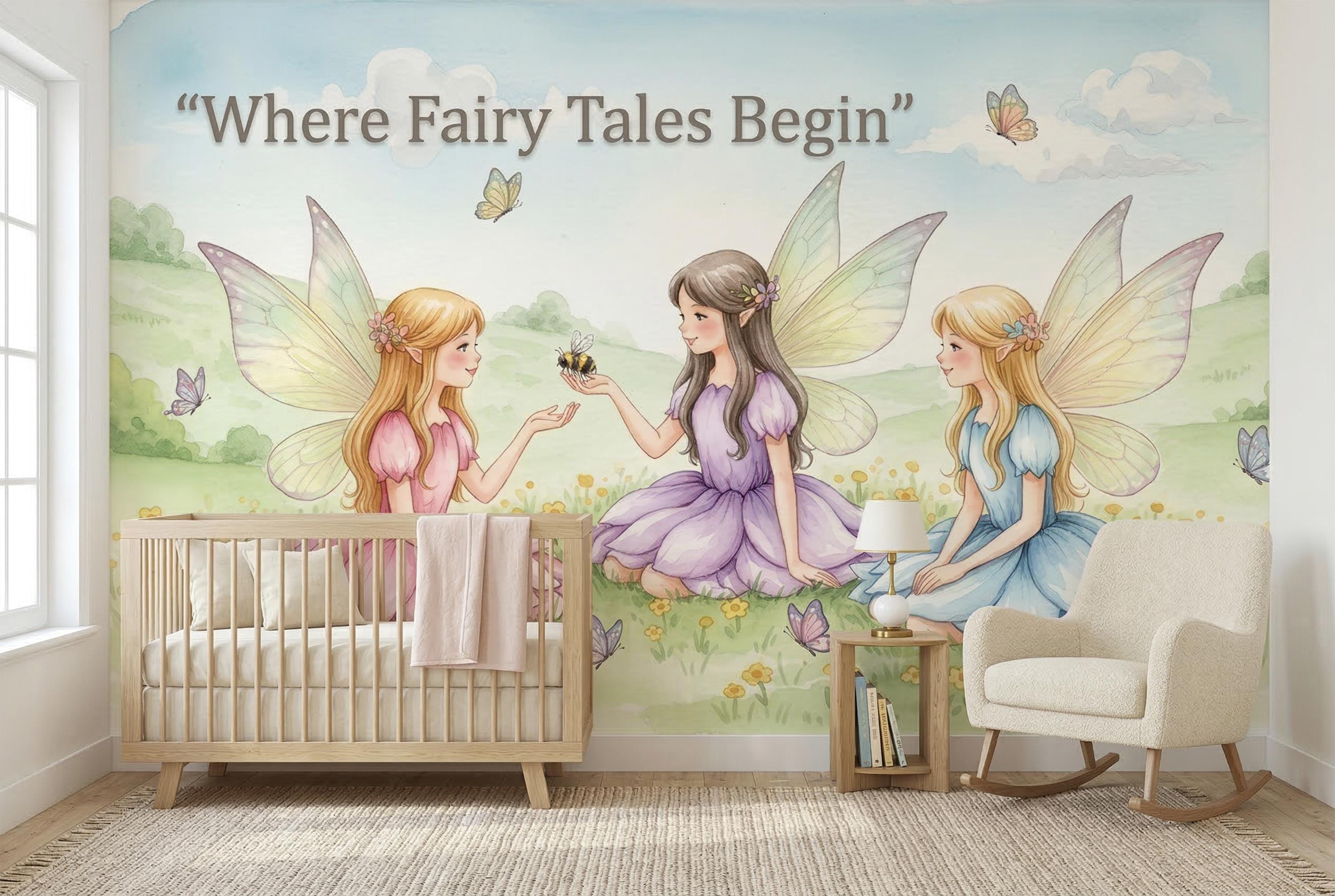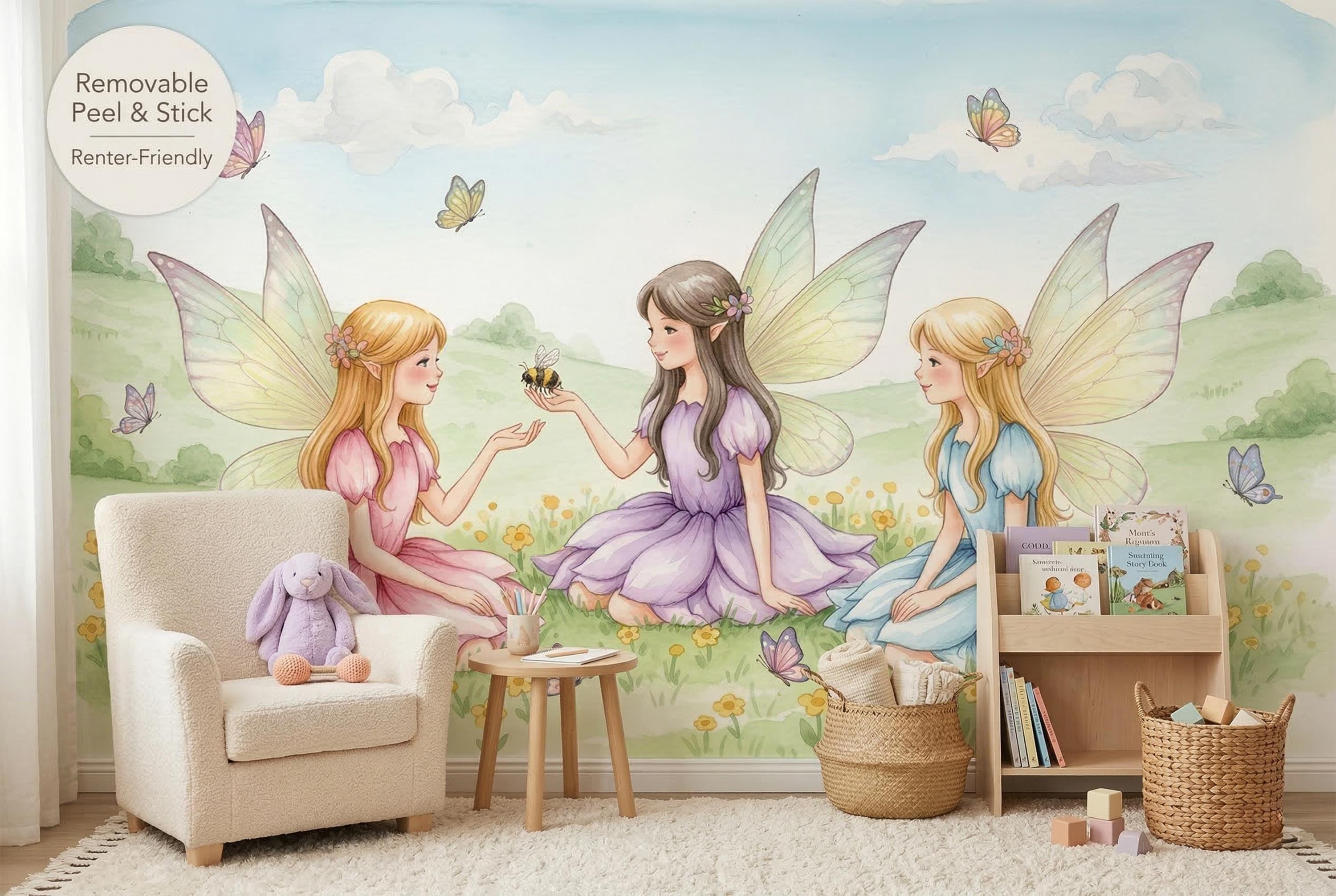 Turn your child’s room into a gentle storybook scene with this watercolor fairy wall mural. Three sweet fairies sit in a sunny meadow filled with tiny yellow flowers, butterflies, soft green hills, and a pale blue sky. Pastel dresses in pink, lavender, and light blue create a dreamy, calming mood that feels magical without being too bright.