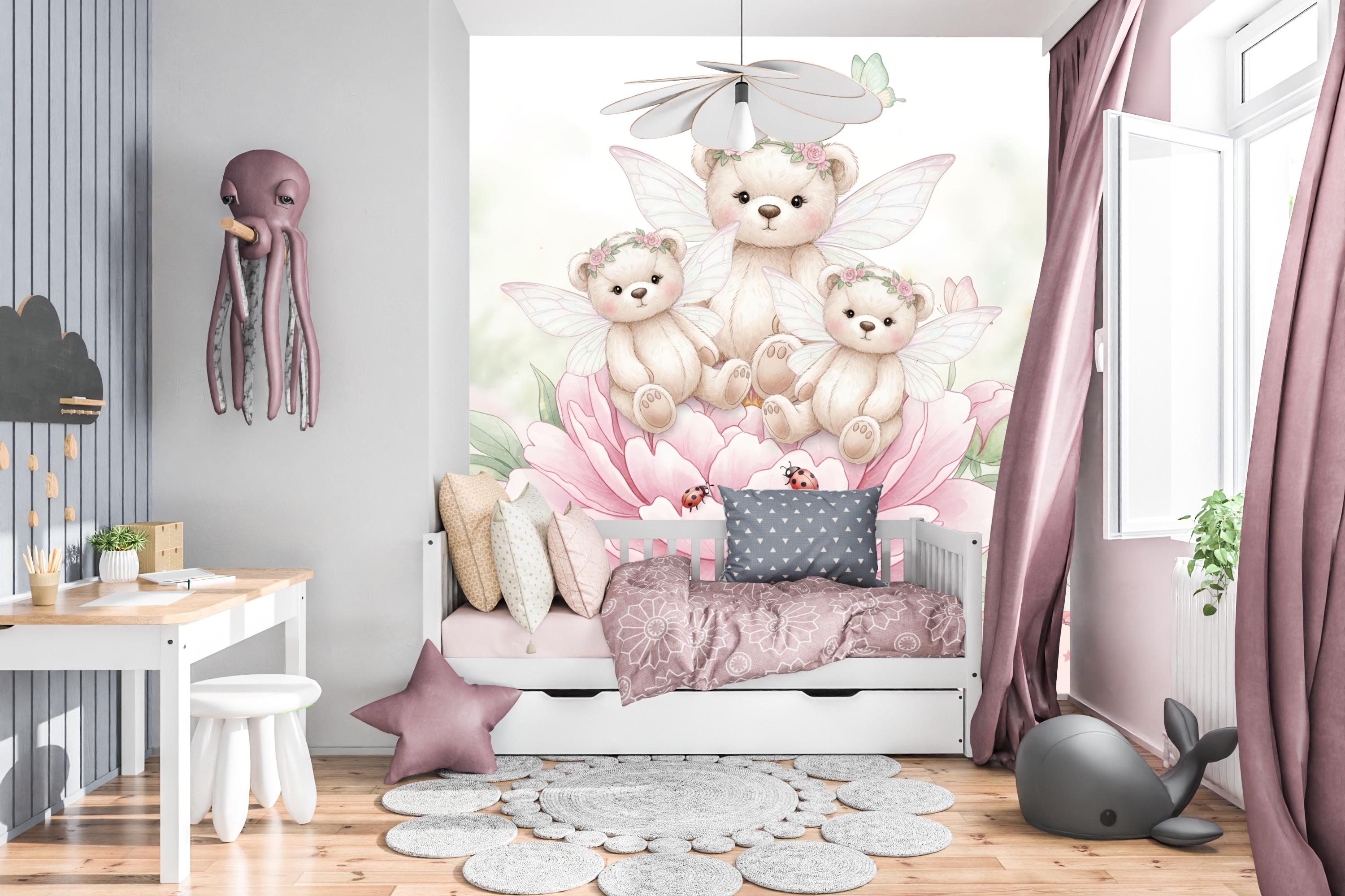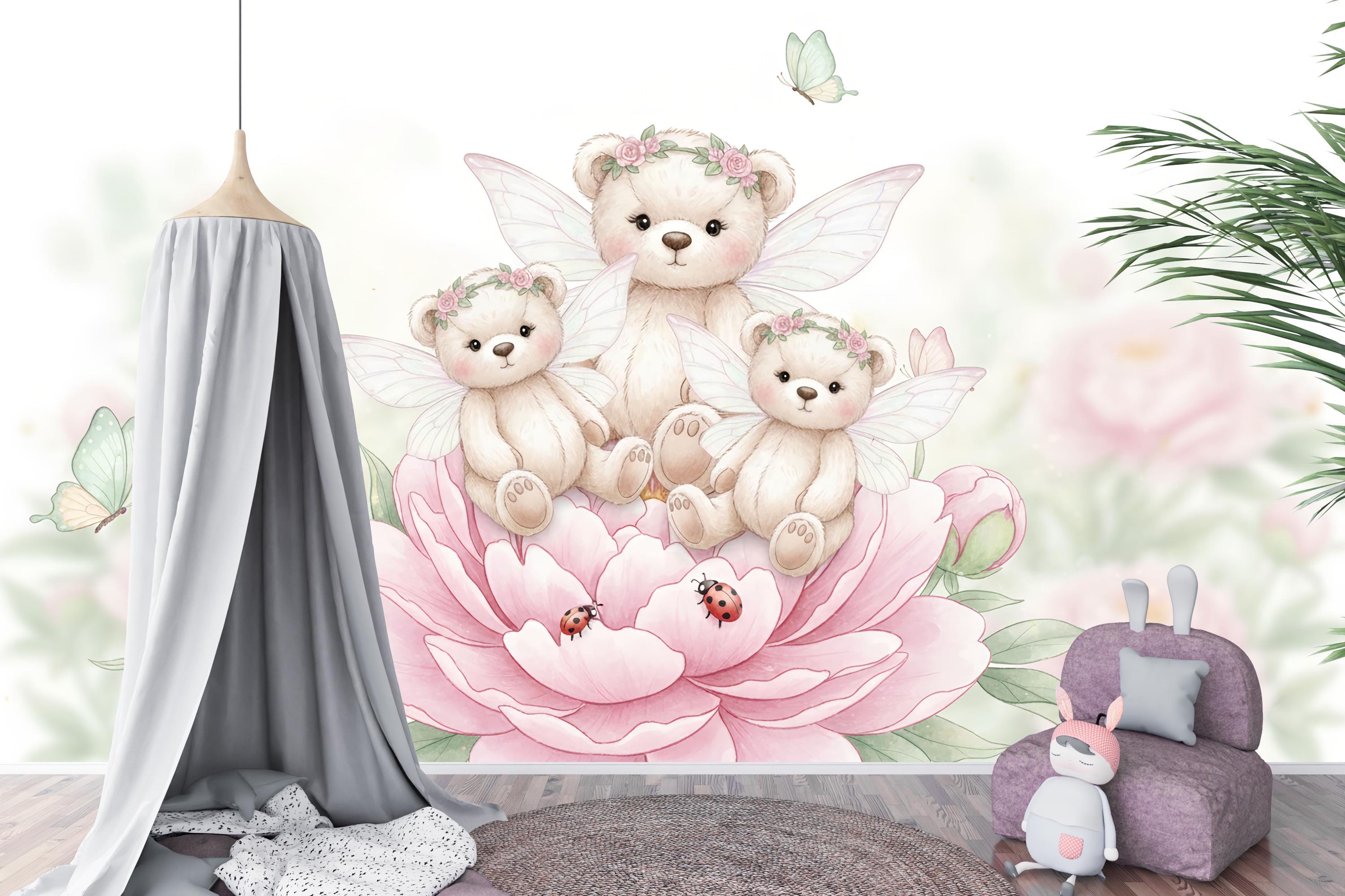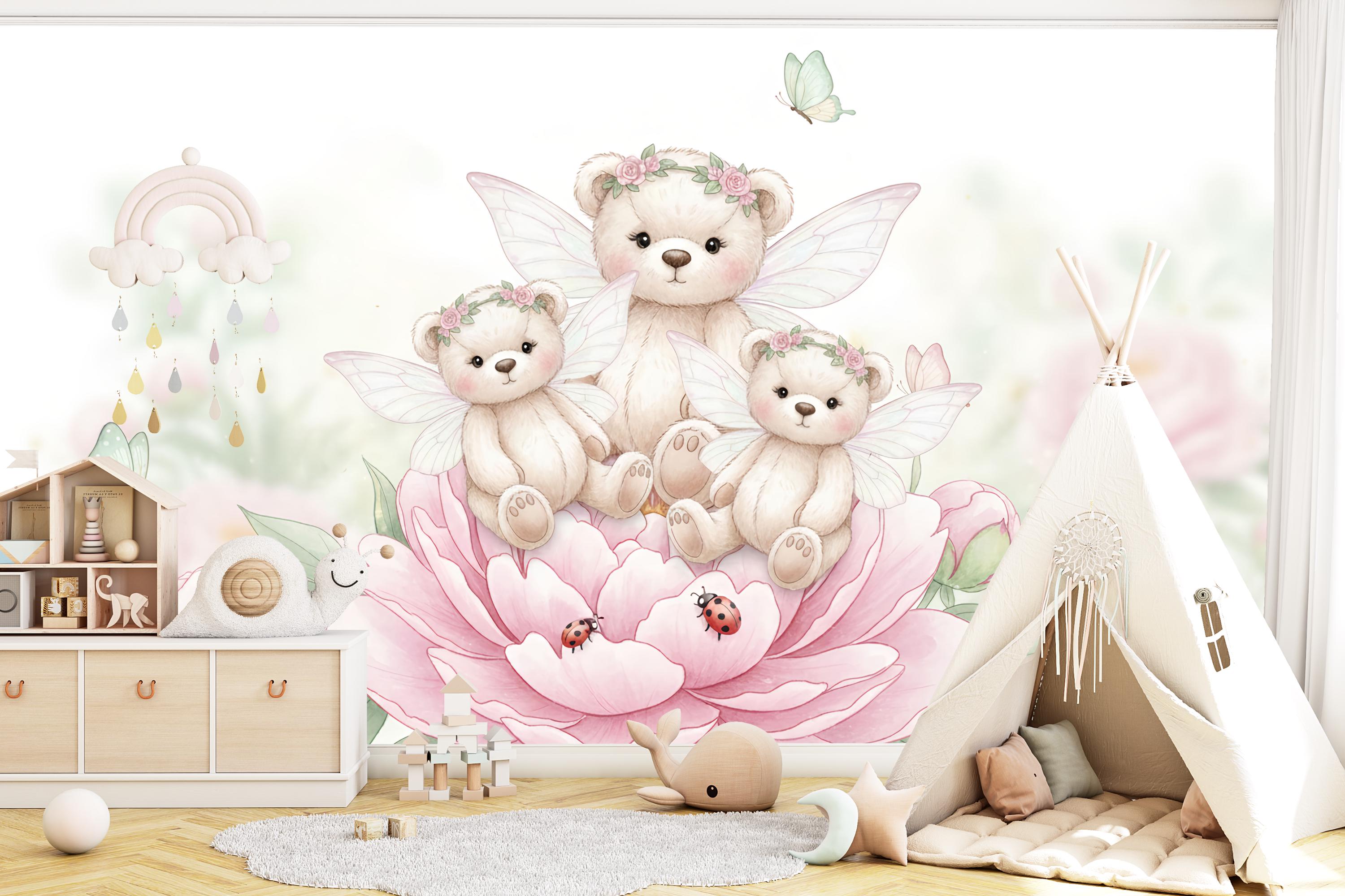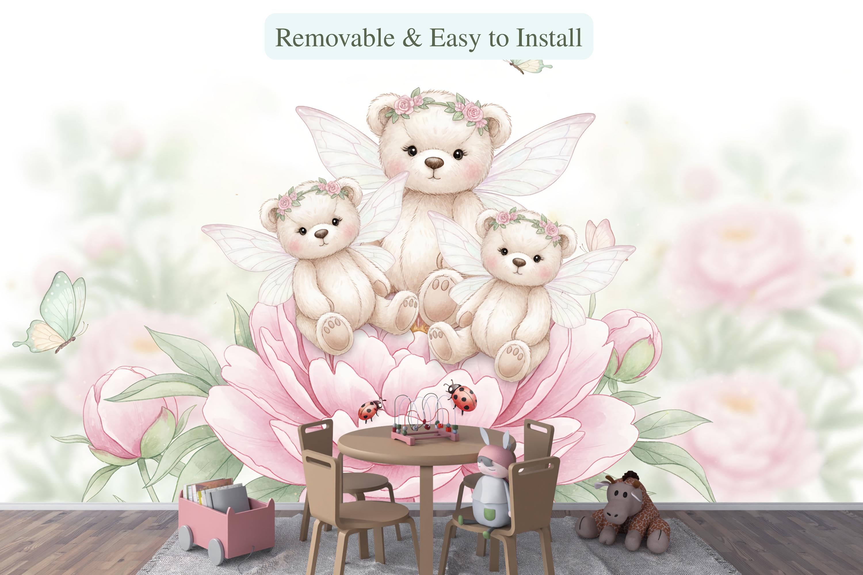 Watch their imagination take flight as three adorable teddy bear fairies, complete with flower crowns and delicate wings, rest on a dreamy, soft pink peony. This whimsical nursery wall mural creates a serene and nurturing atmosphere, instantly transforming a baby girl's room or playroom into an enchanted garden. Our easy-to-apply peel and stick wallpaper makes creating this magical space a breeze, turning a simple wall into a stunning storybook centerpiece.