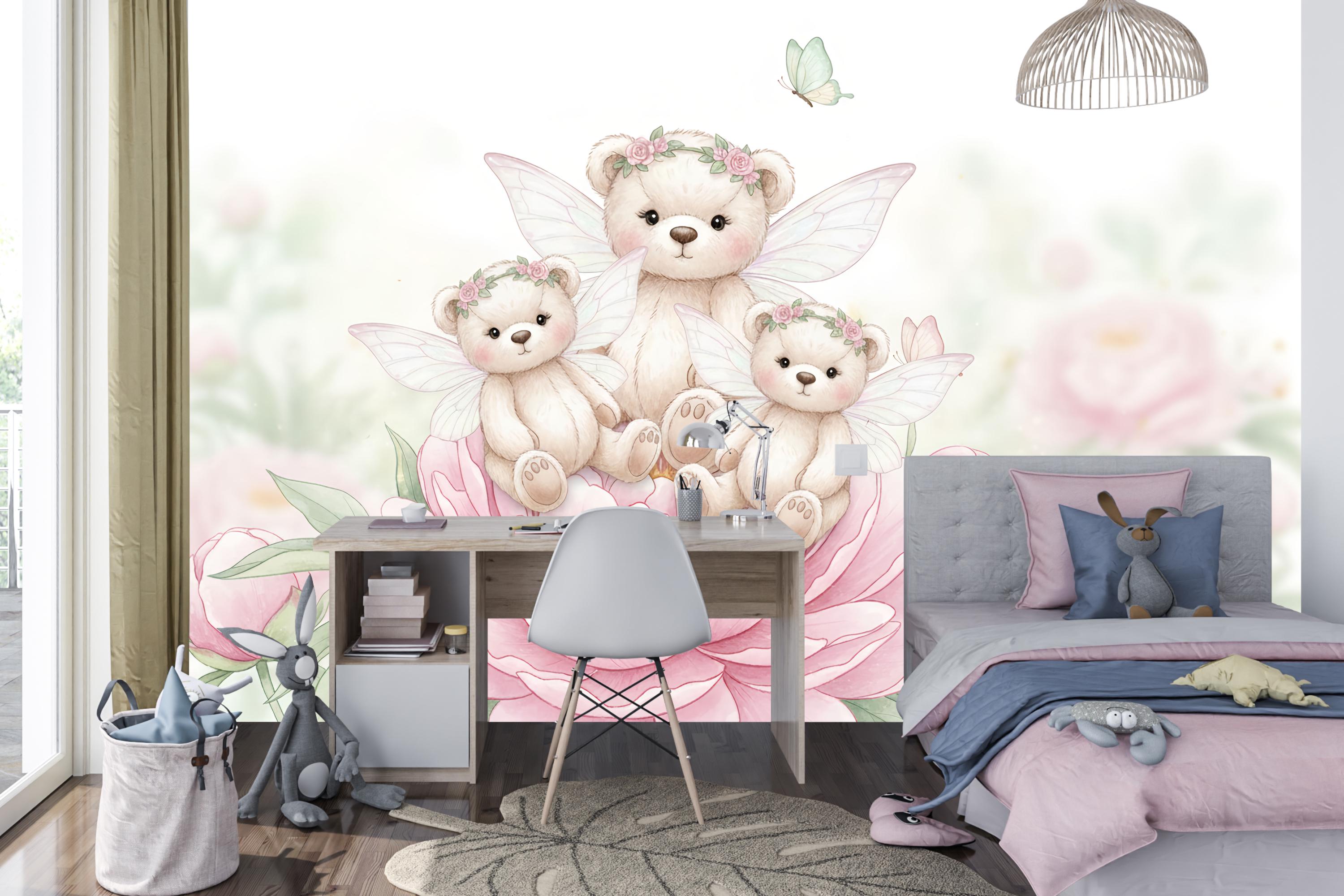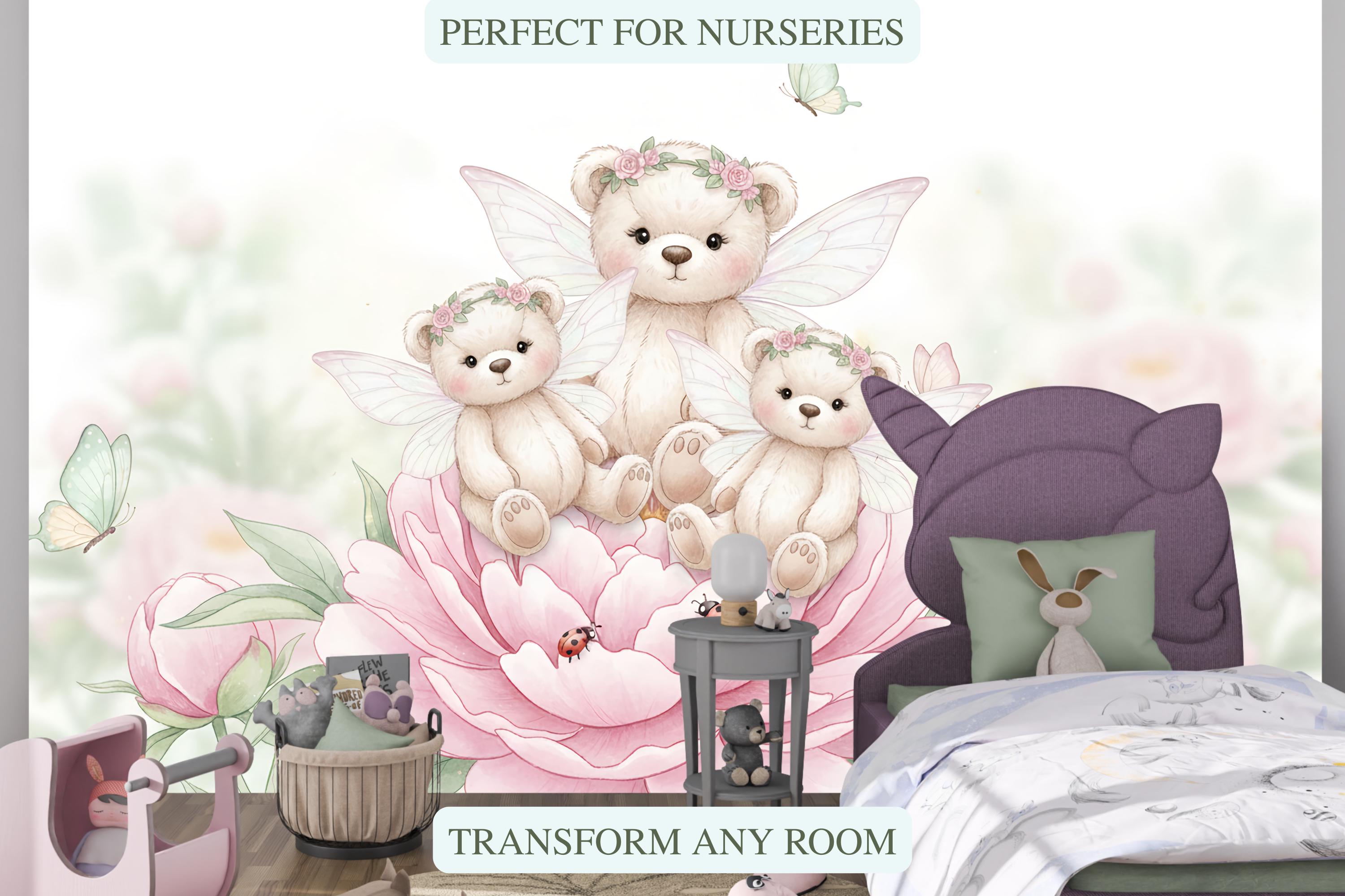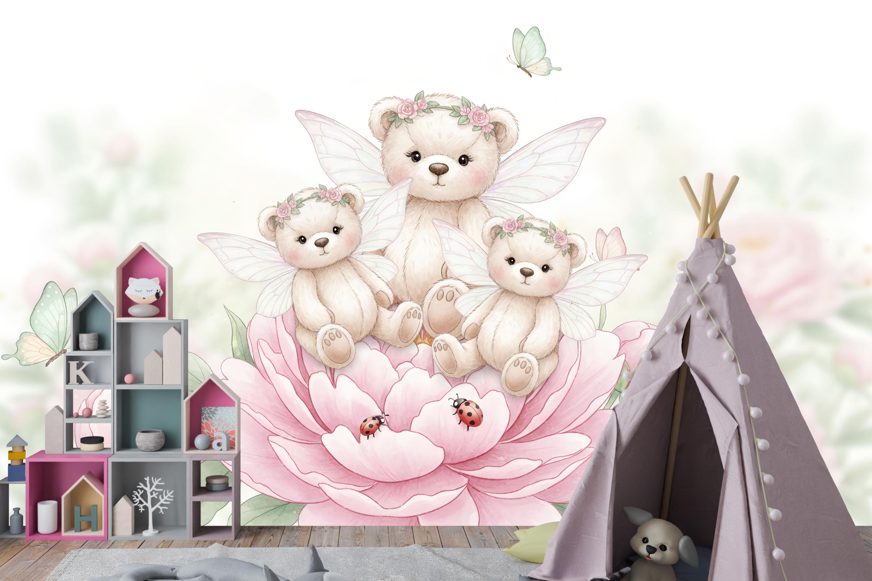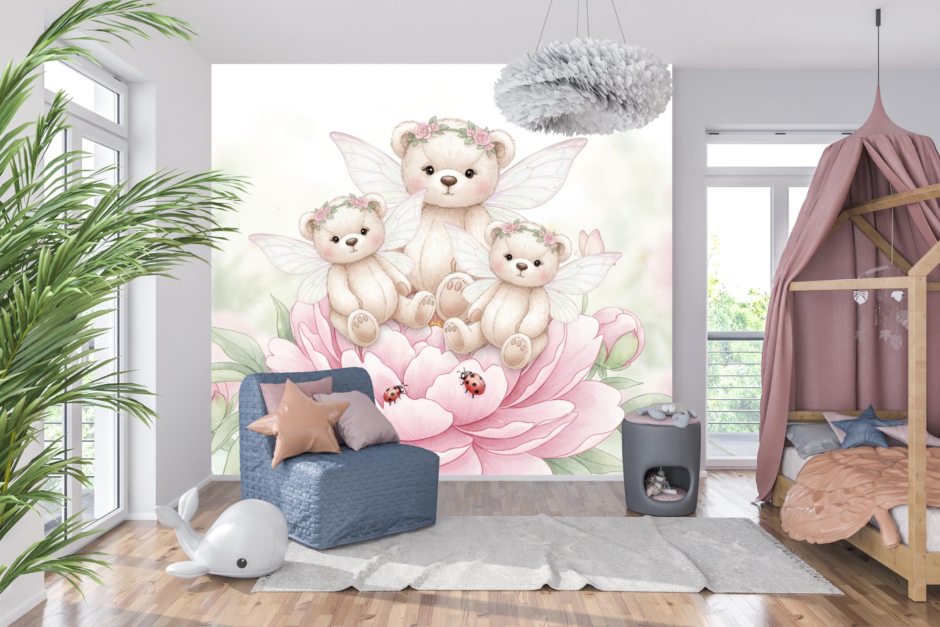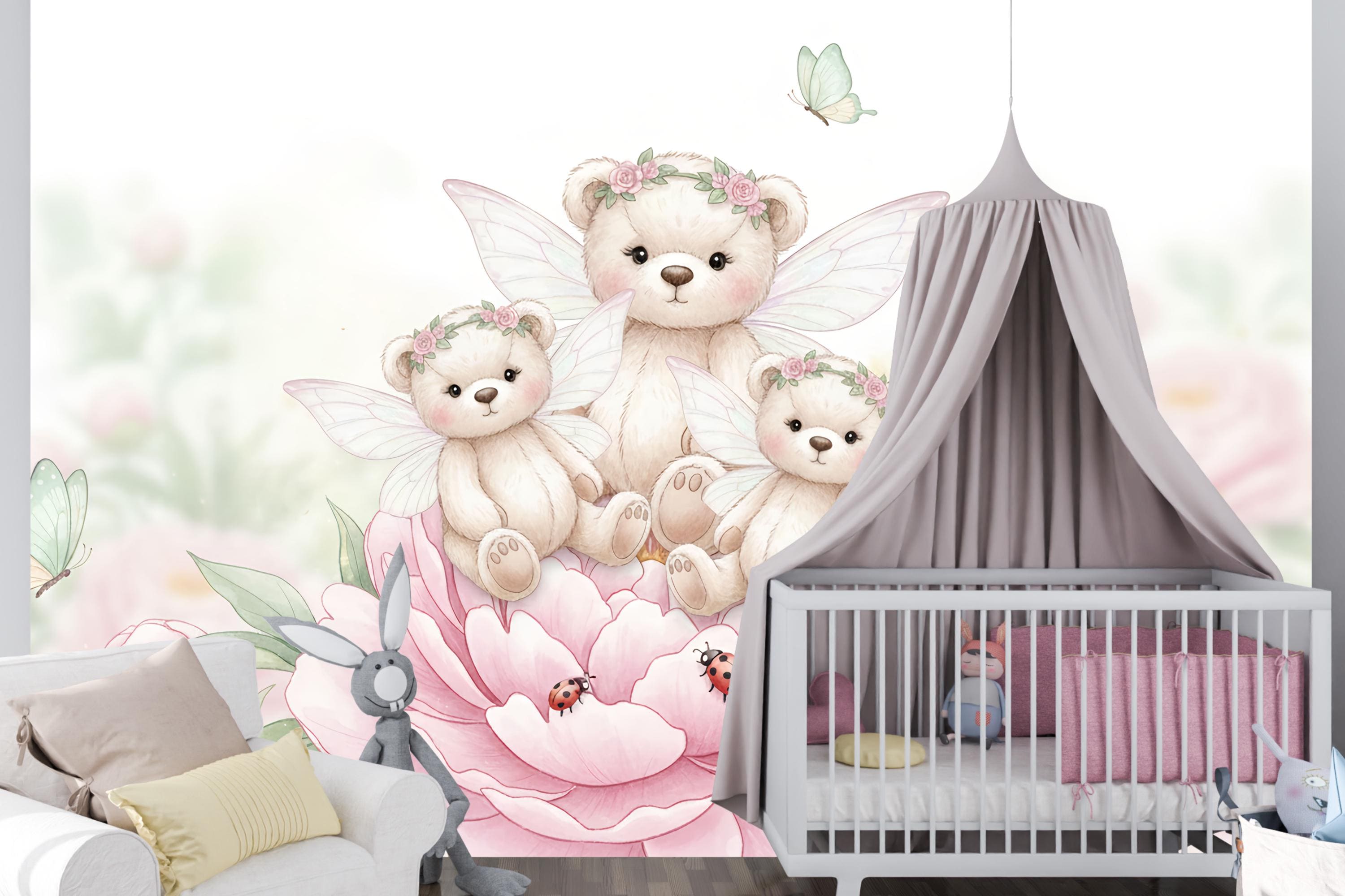 Watch their imagination take flight as three adorable teddy bear fairies, complete with flower crowns and delicate wings, rest on a dreamy, soft pink peony. This whimsical nursery wall mural creates a serene and nurturing atmosphere, instantly transforming a baby girl's room or playroom into an enchanted garden. Our easy-to-apply peel and stick wallpaper makes creating this magical space a breeze, turning a simple wall into a stunning storybook centerpiece.