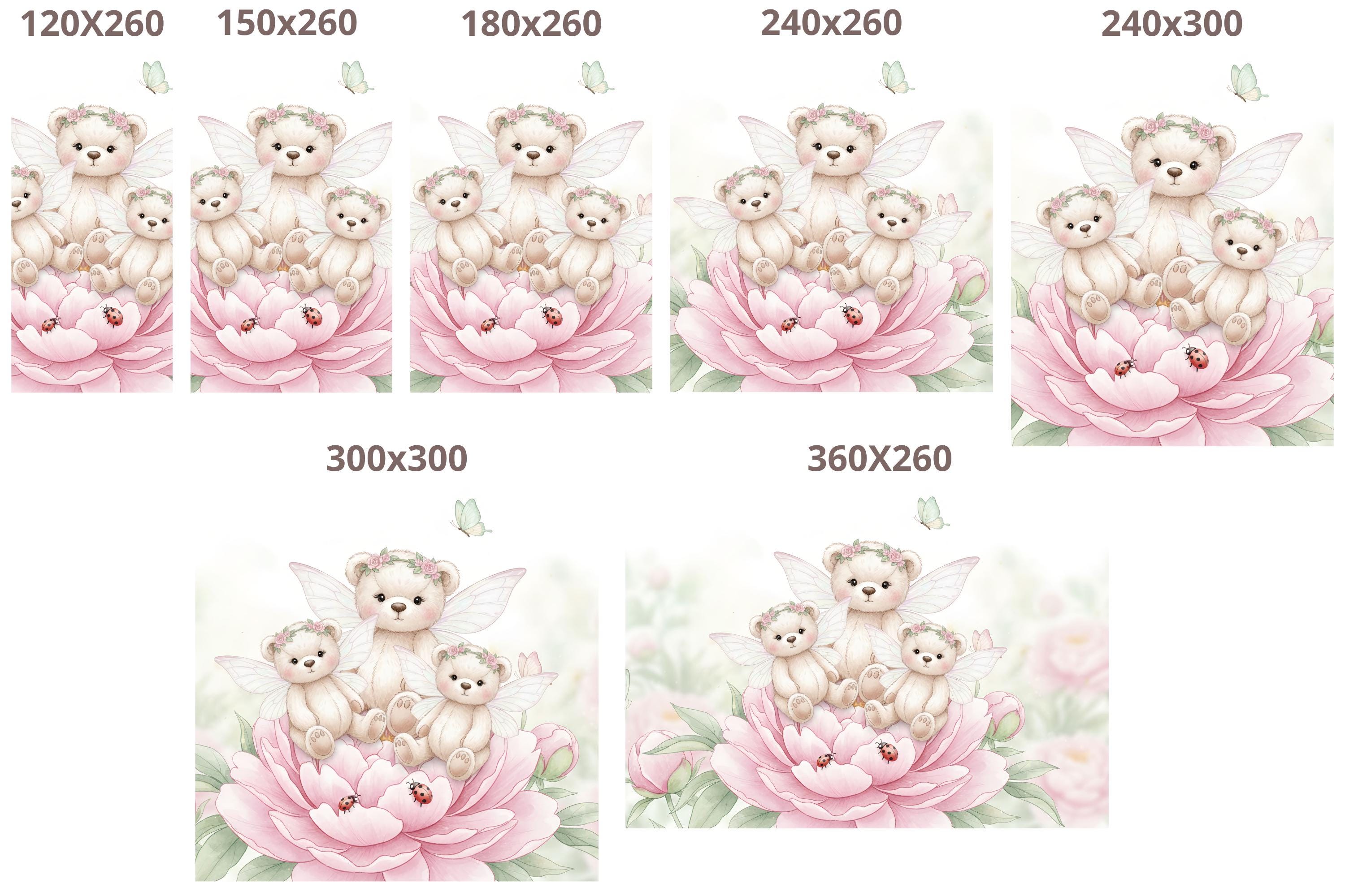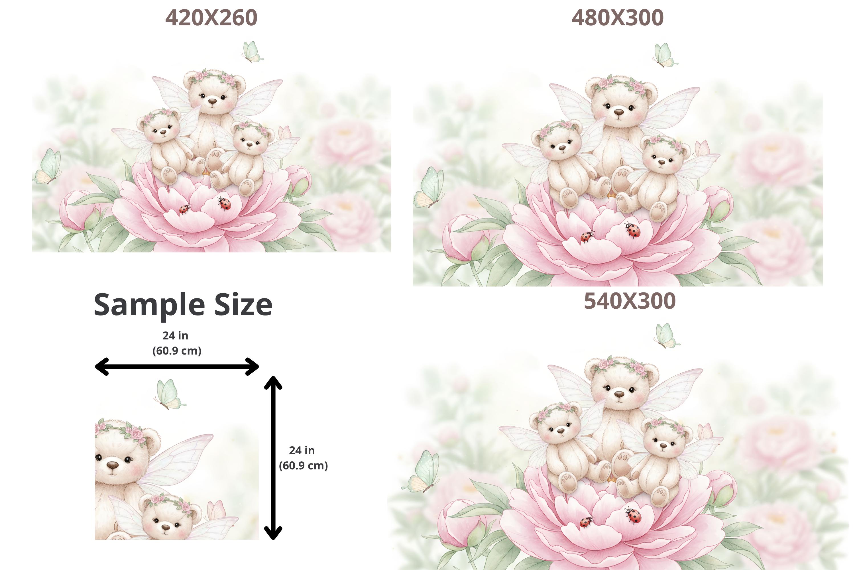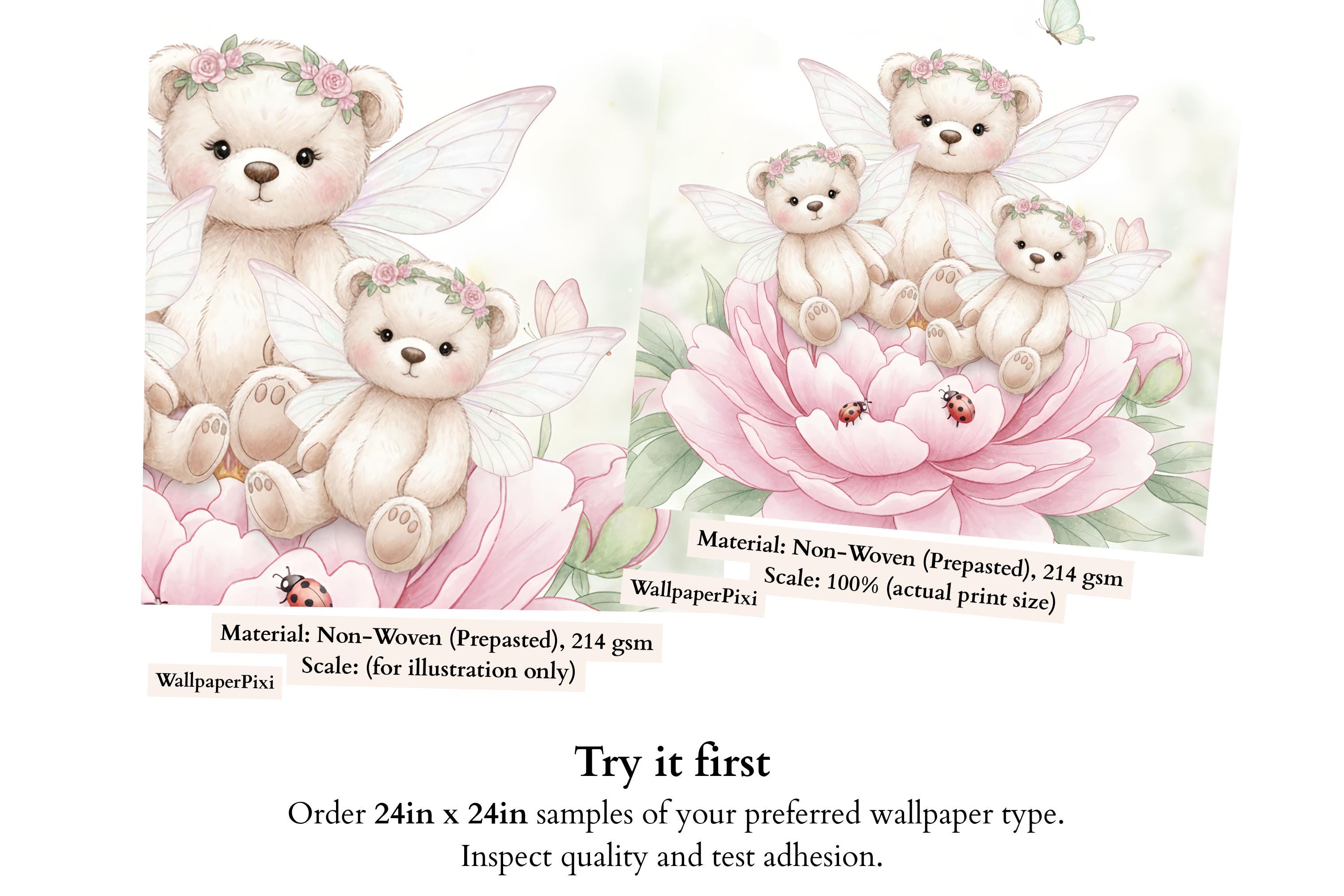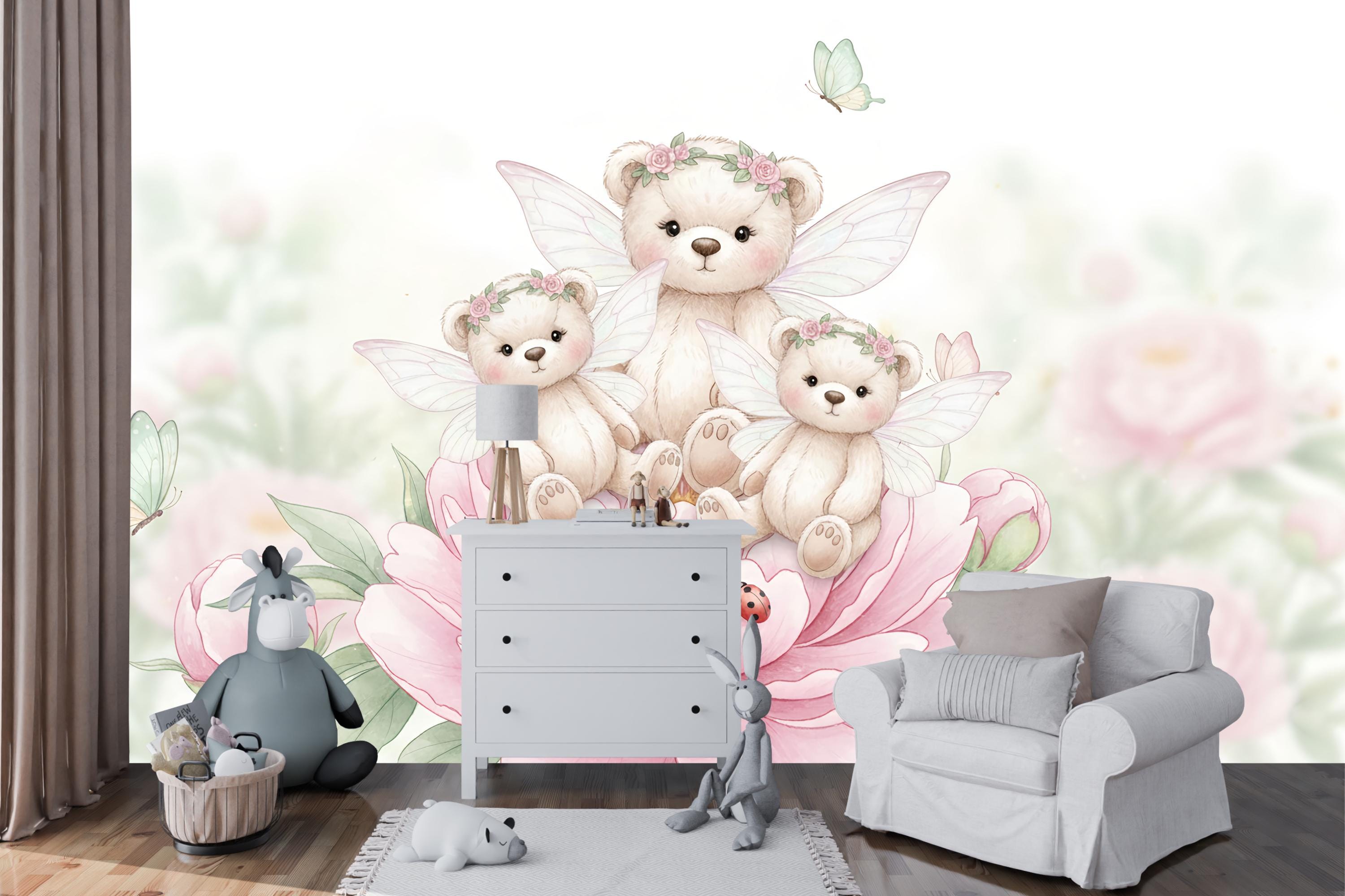 Watch their imagination take flight as three adorable teddy bear fairies, complete with flower crowns and delicate wings, rest on a dreamy, soft pink peony. This whimsical nursery wall mural creates a serene and nurturing atmosphere, instantly transforming a baby girl's room or playroom into an enchanted garden. Our easy-to-apply peel and stick wallpaper makes creating this magical space a breeze, turning a simple wall into a stunning storybook centerpiece.