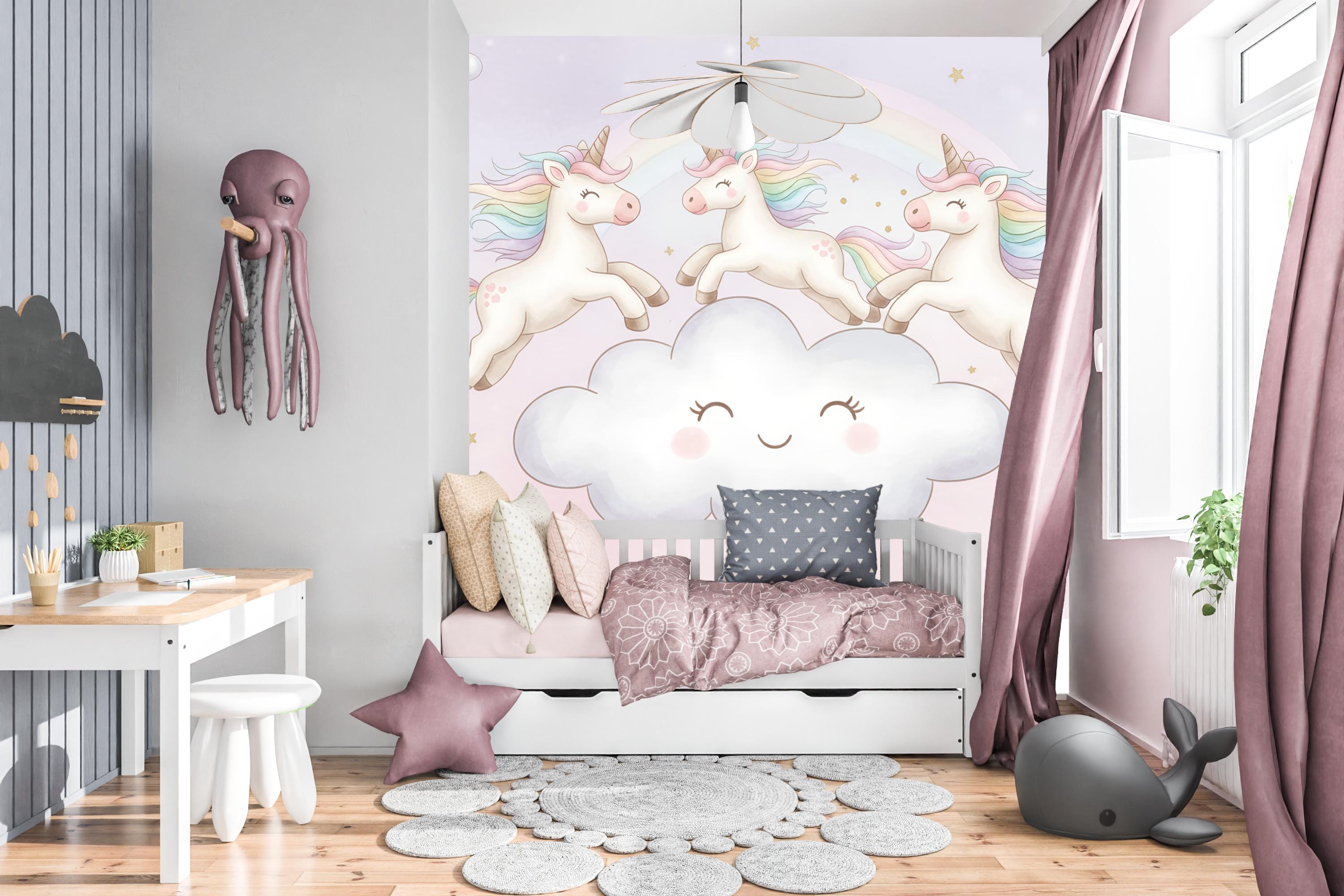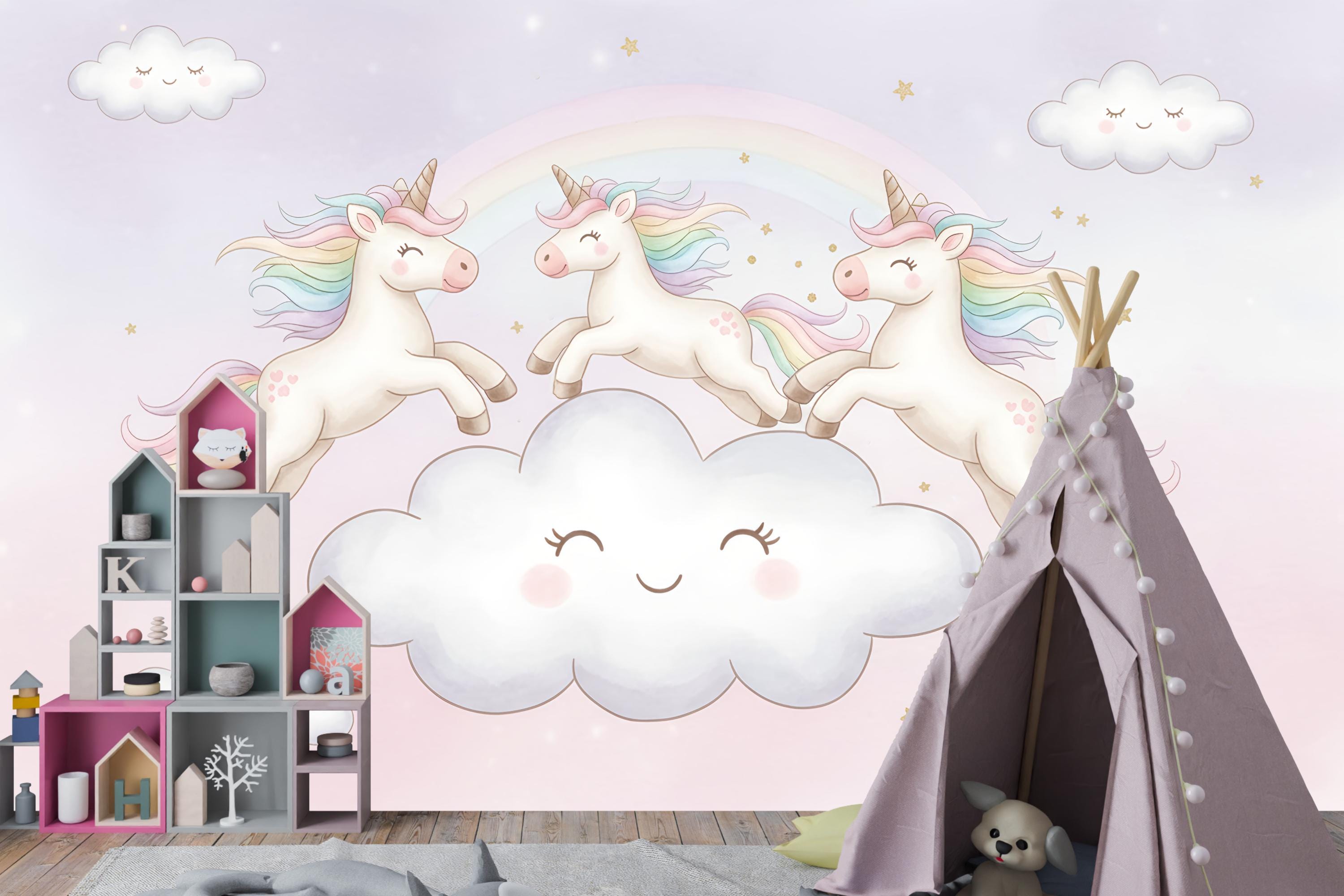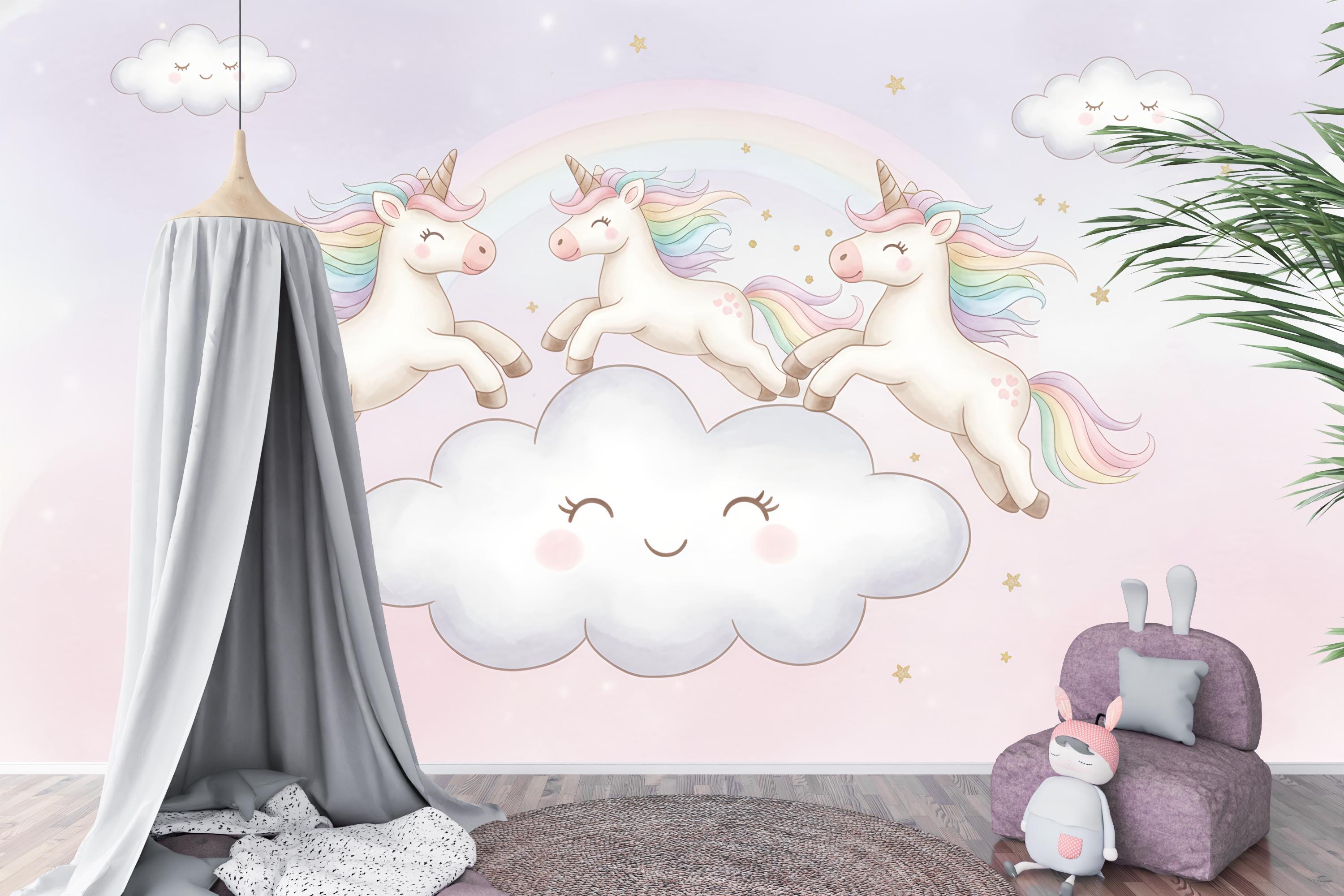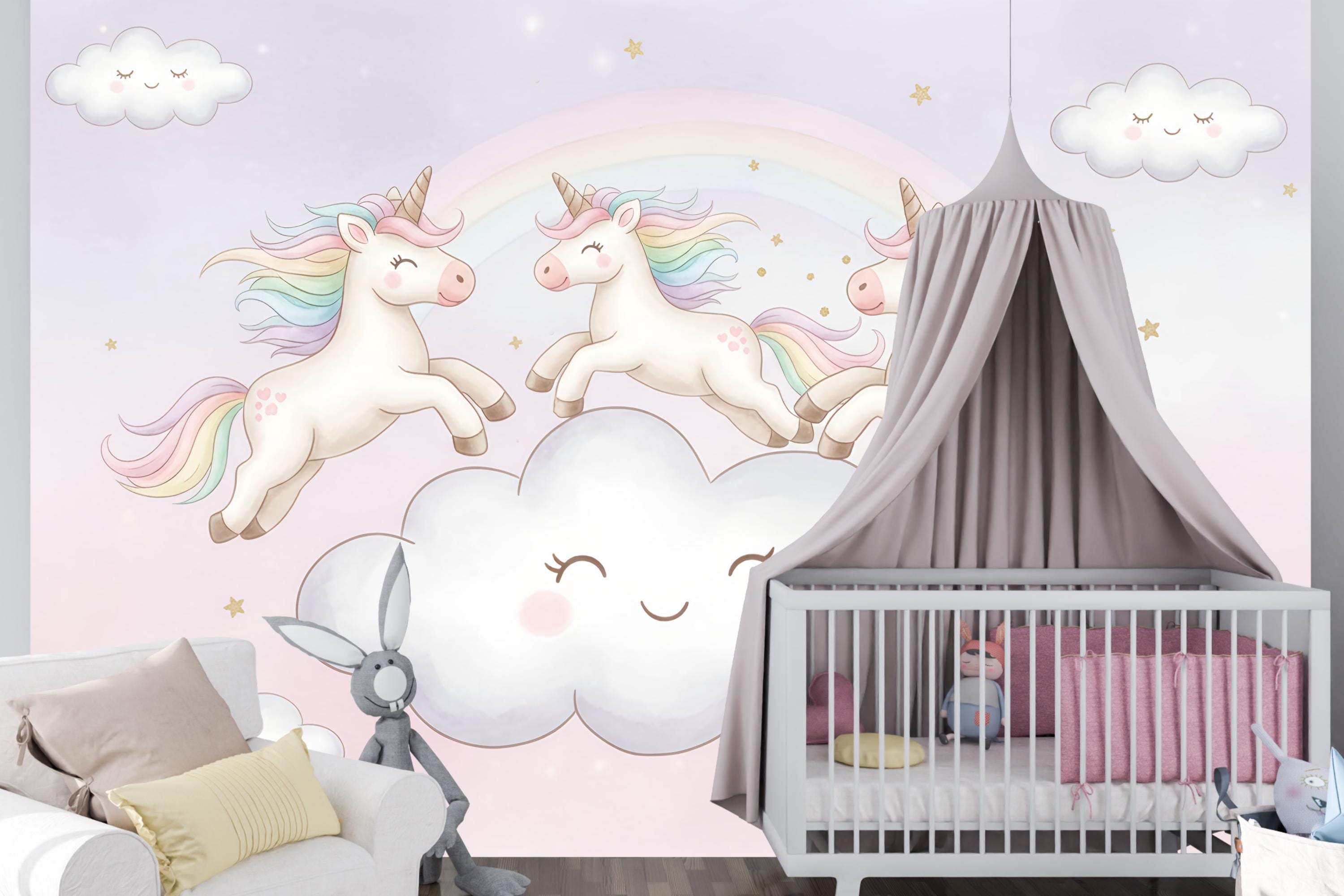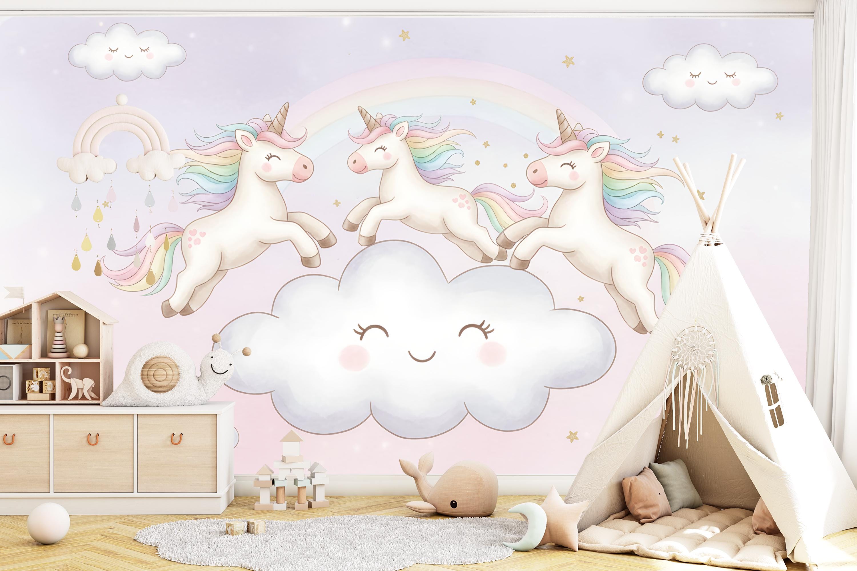 Unleash a cascade of color and enchantment in your child's room with our dreamy unicorn cloud wallpaper.