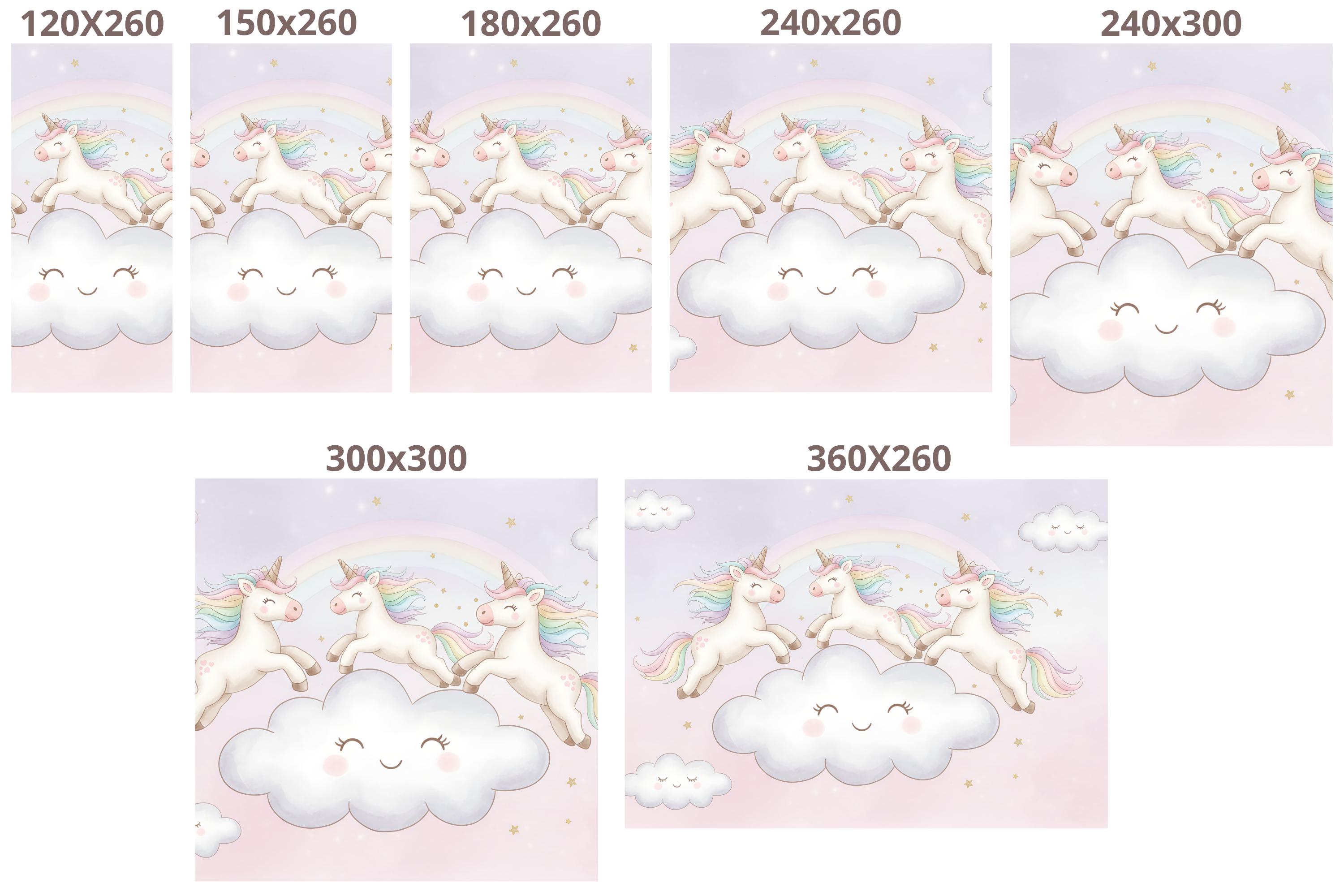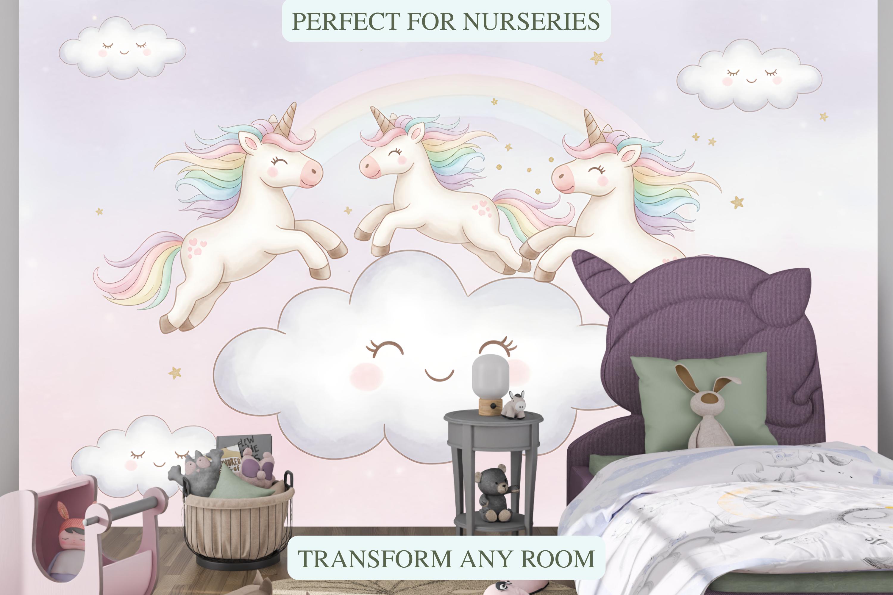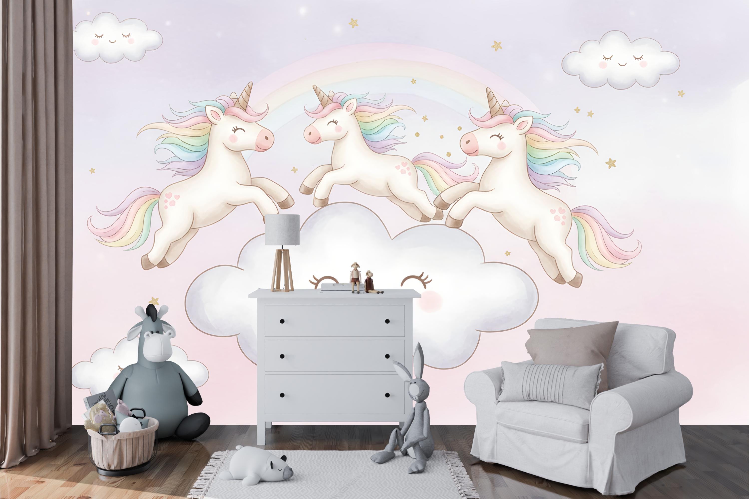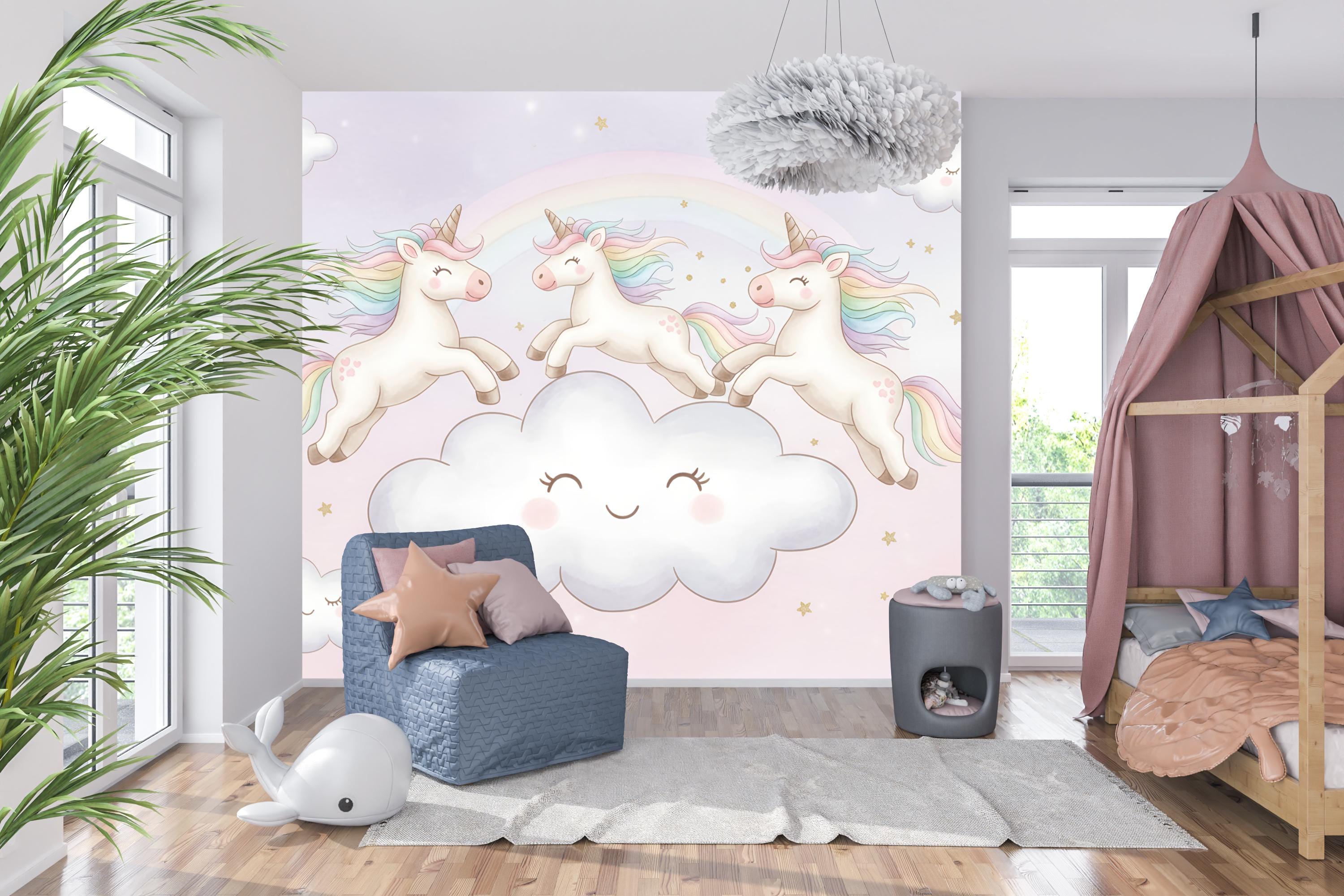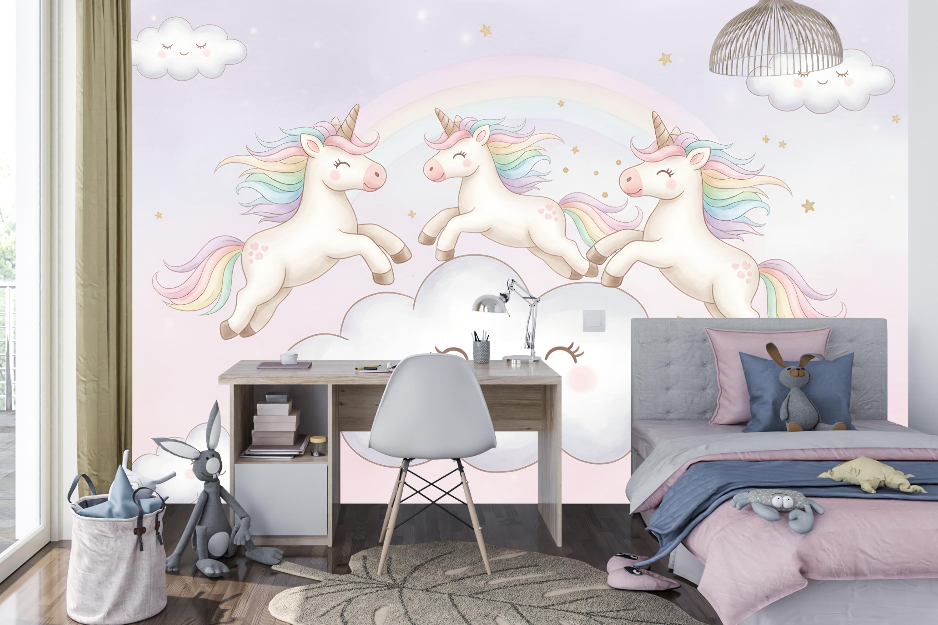 Unleash a cascade of color and enchantment in your child's room with our dreamy unicorn cloud wallpaper.