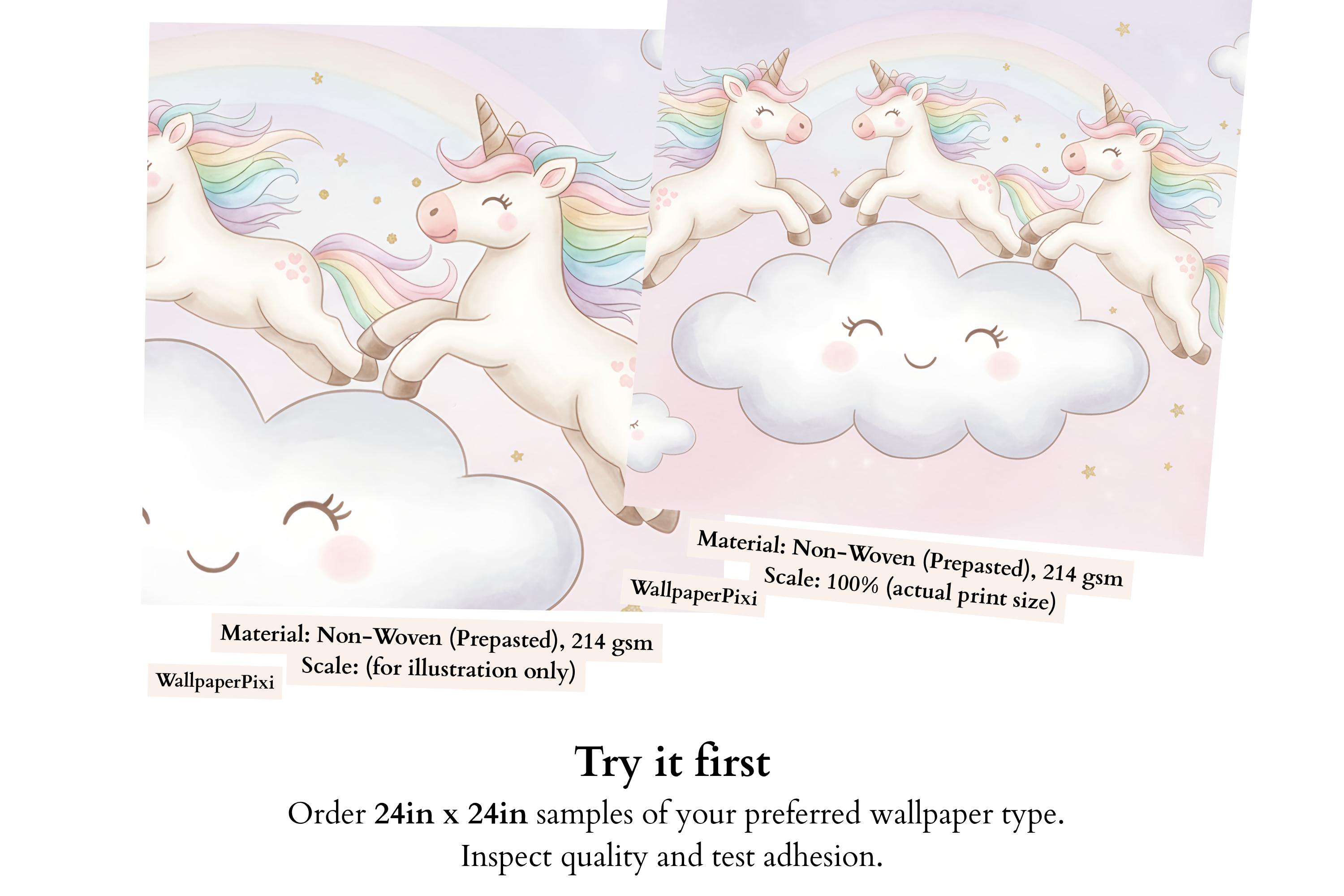 Each custom-sized panel captures the joyful spirit and soft watercolor charm of this unique design, printed on premium, eco-friendly materials. This isn't just wallpaper; it's a durable, fade-resistant piece of art that invites endless imaginative play and sweet dreams. Give your child the gift of a truly magical space where unicorns roam and rainbows shine, a backdrop for countless cherished memories.