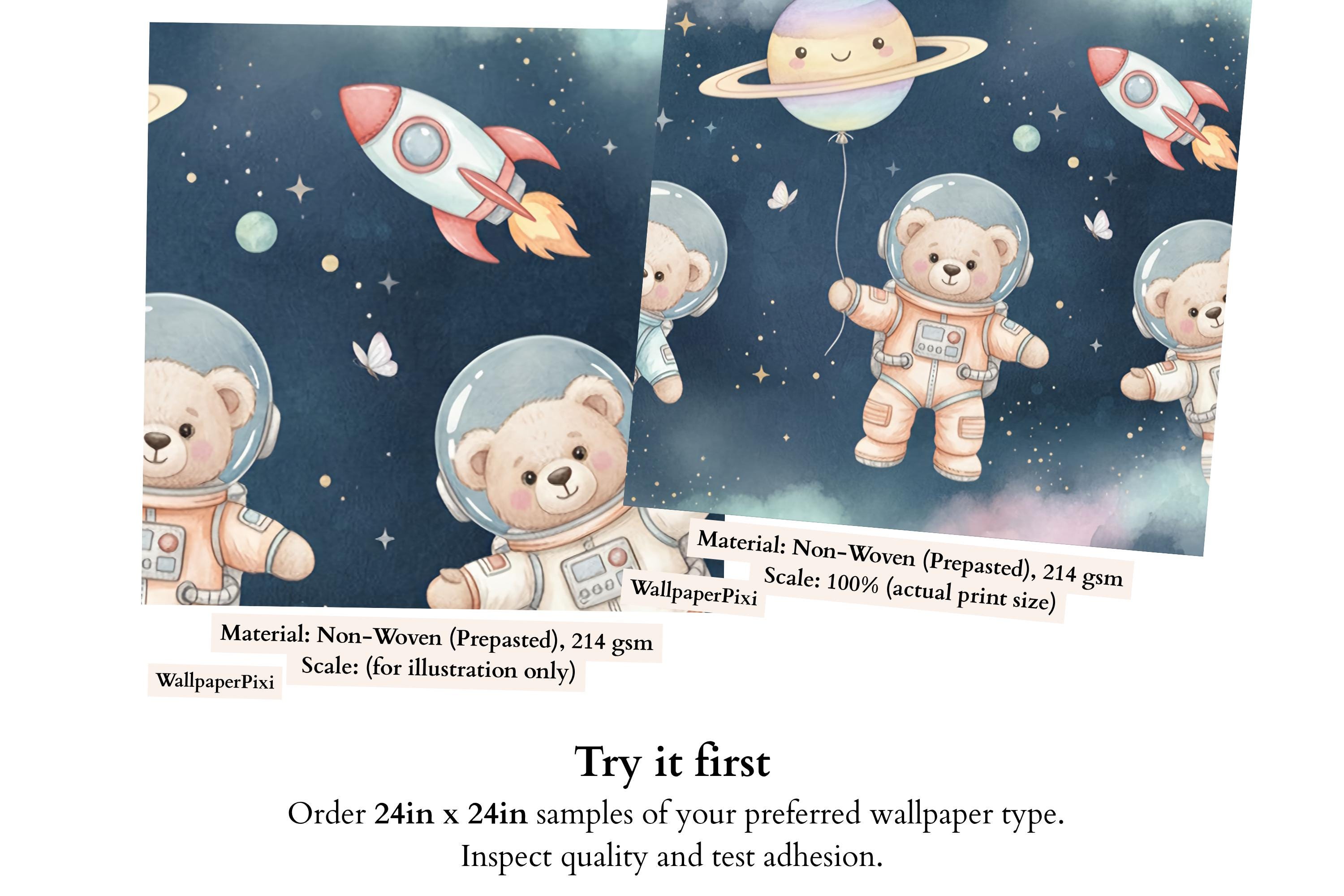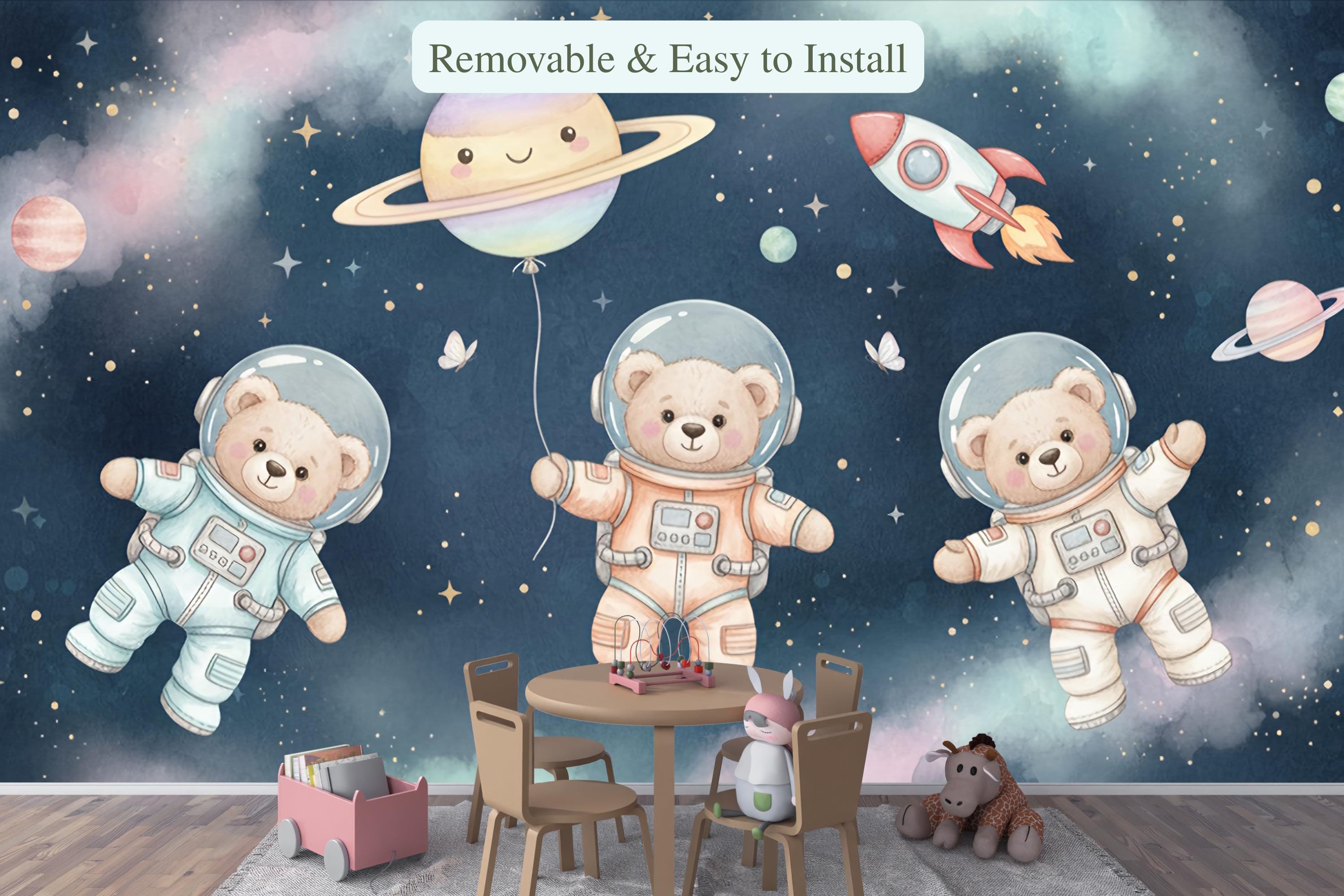 Our high-quality peel and stick kids wallpaper makes installation a breeze; this nursery peel stick material is durable and easy to apply. This Bear Wallpaper transforms the room into a living storybook wallpaper scene. Every peel and stick bear floats among soft, watercolor planets, creating a dreamy backdrop. It's the ideal Boys Wallpaper to inspire curiosity and sweet dreams.