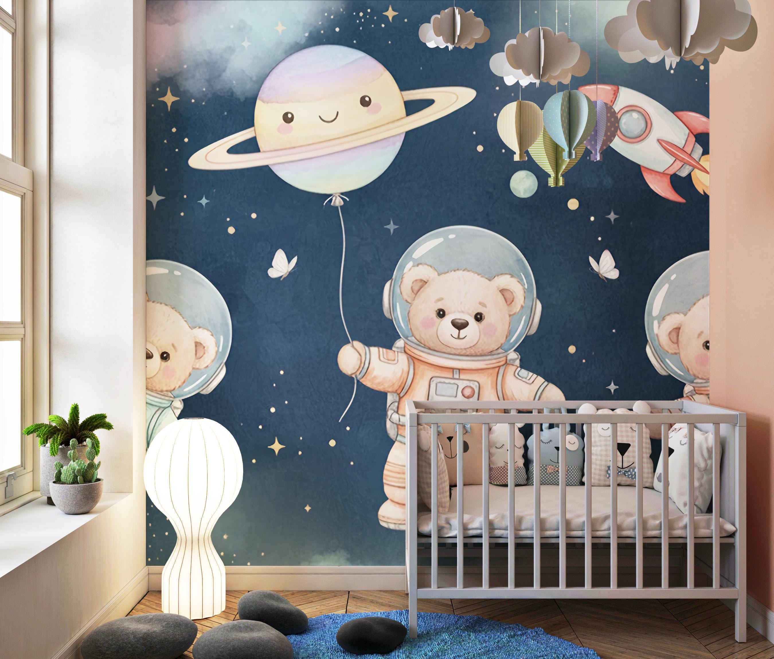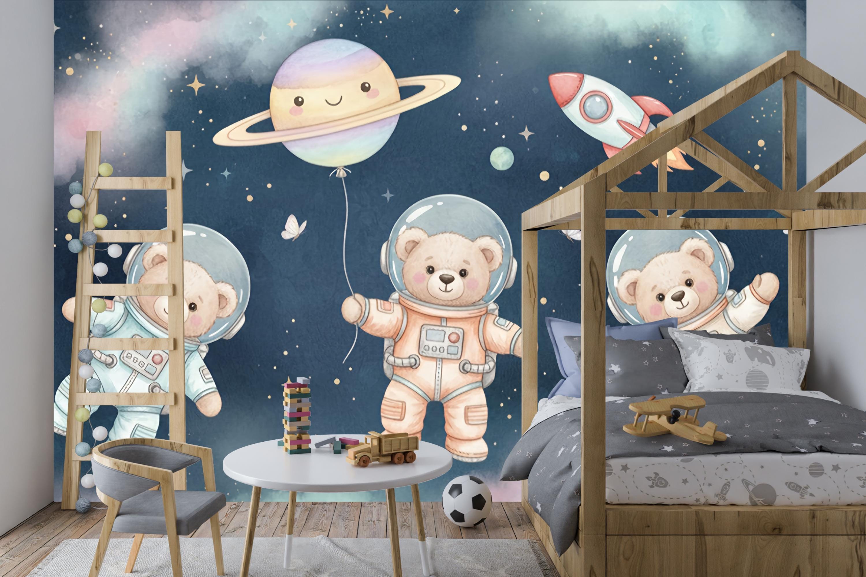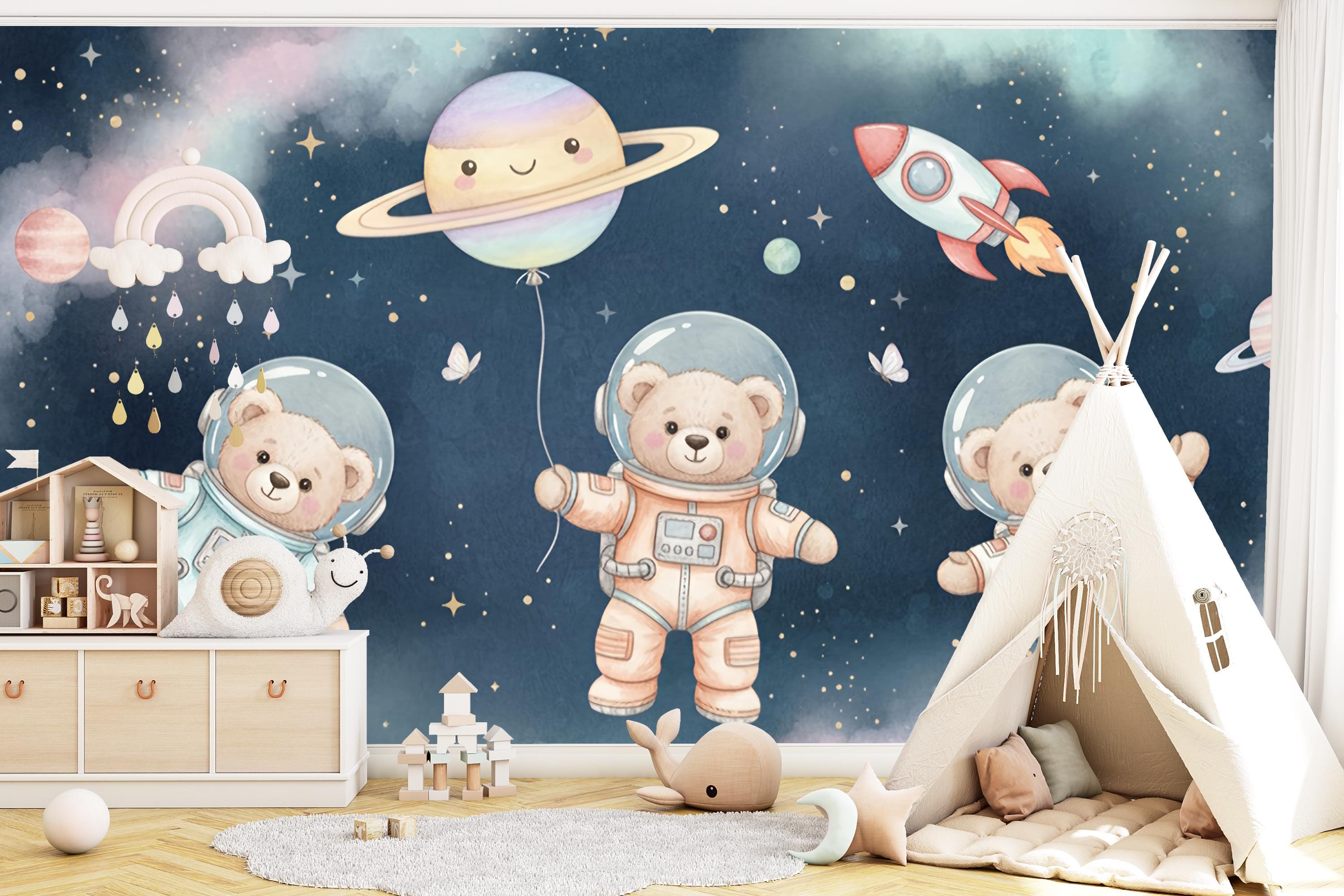 This charming nursery wall mural turns any Baby Boy Room into a cosmic dream, featuring adorable bears on a Teddy Bear Space mission. Far more than just an astronaut wall decal, this full space kids mural creates an immersive universe, making it the perfect boys room wallpaper for your little explorer.