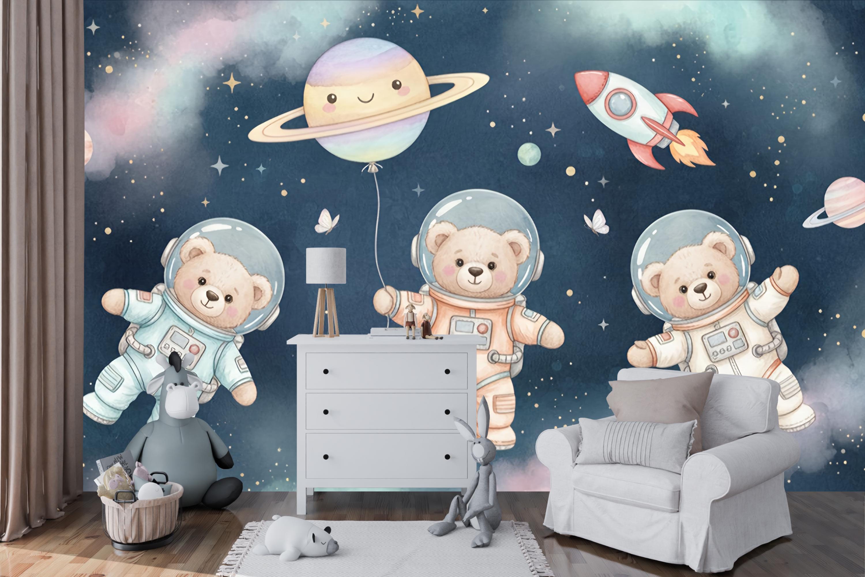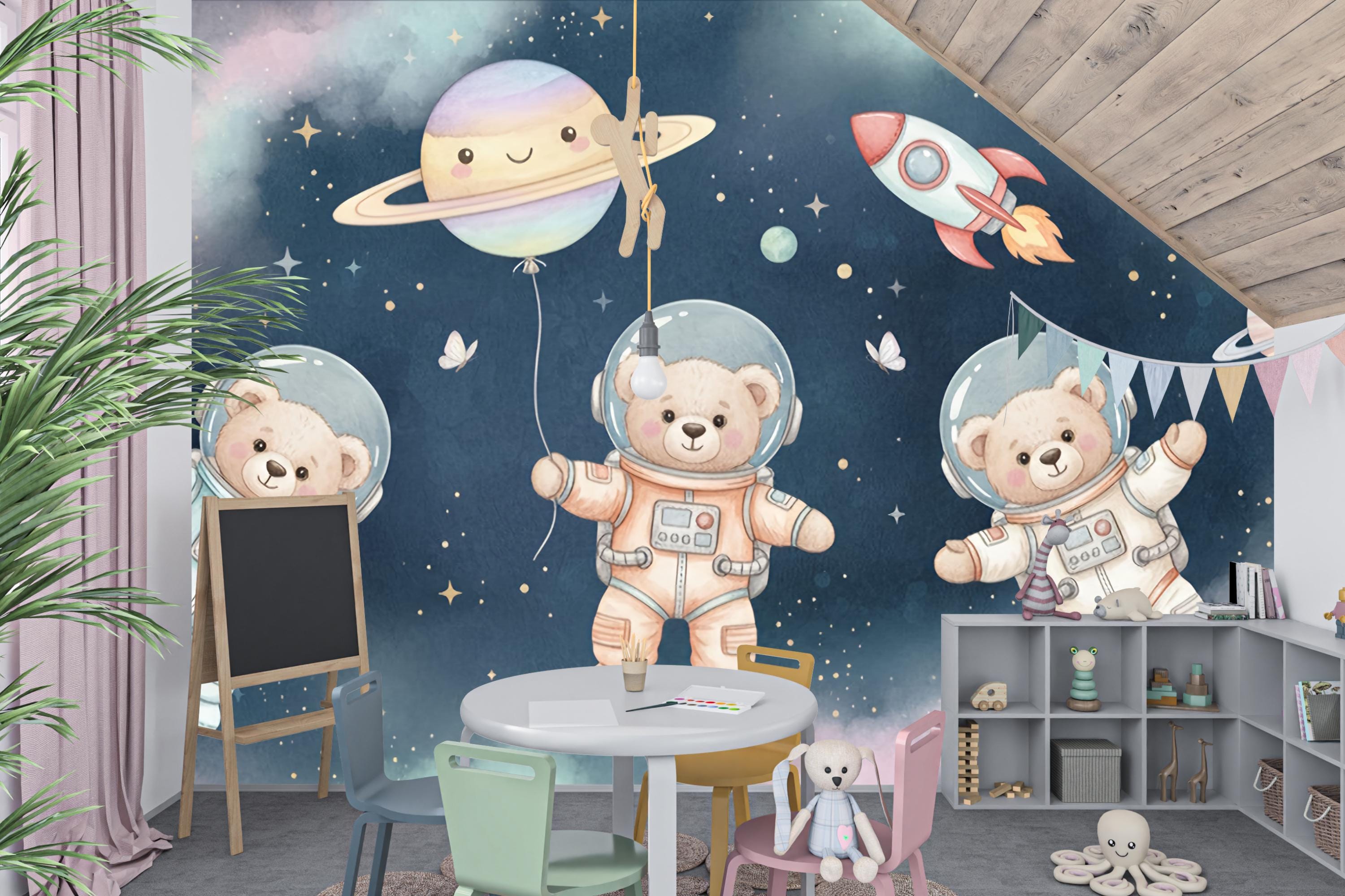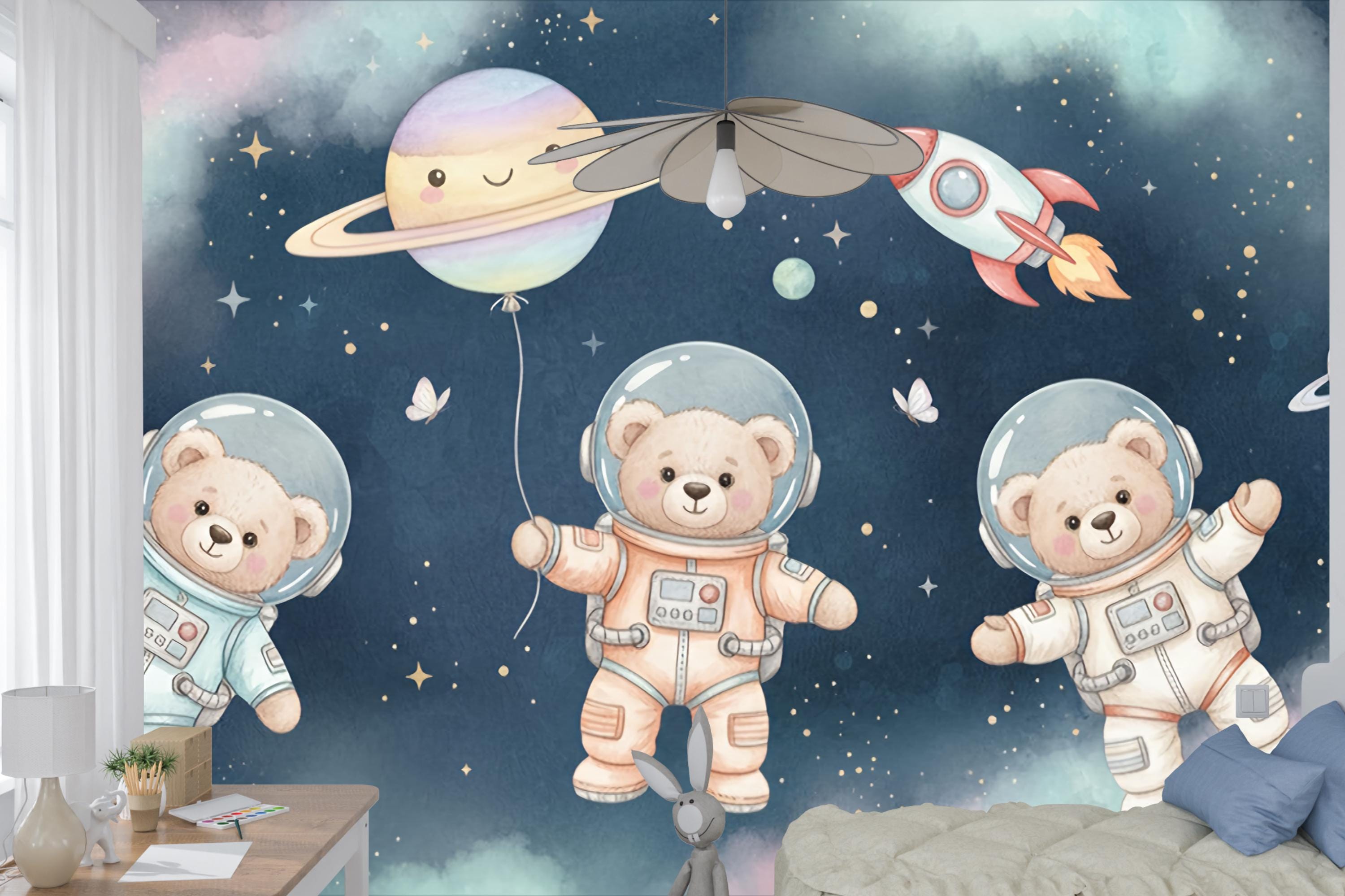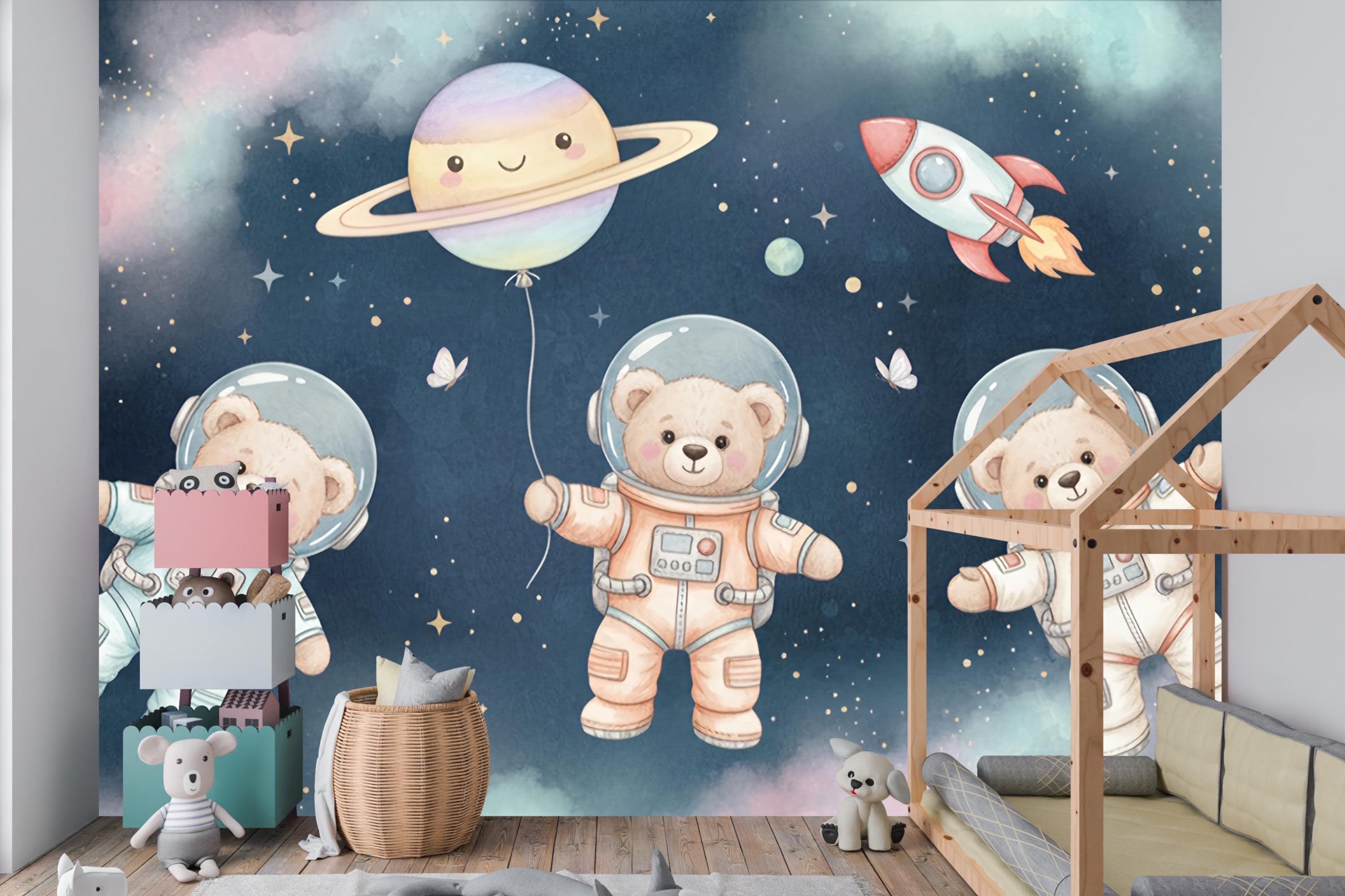 This charming nursery wall mural turns any Baby Boy Room into a cosmic dream, featuring adorable bears on a Teddy Bear Space mission. Far more than just an astronaut wall decal, this full space kids mural creates an immersive universe, making it the perfect boys room wallpaper for your little explorer.