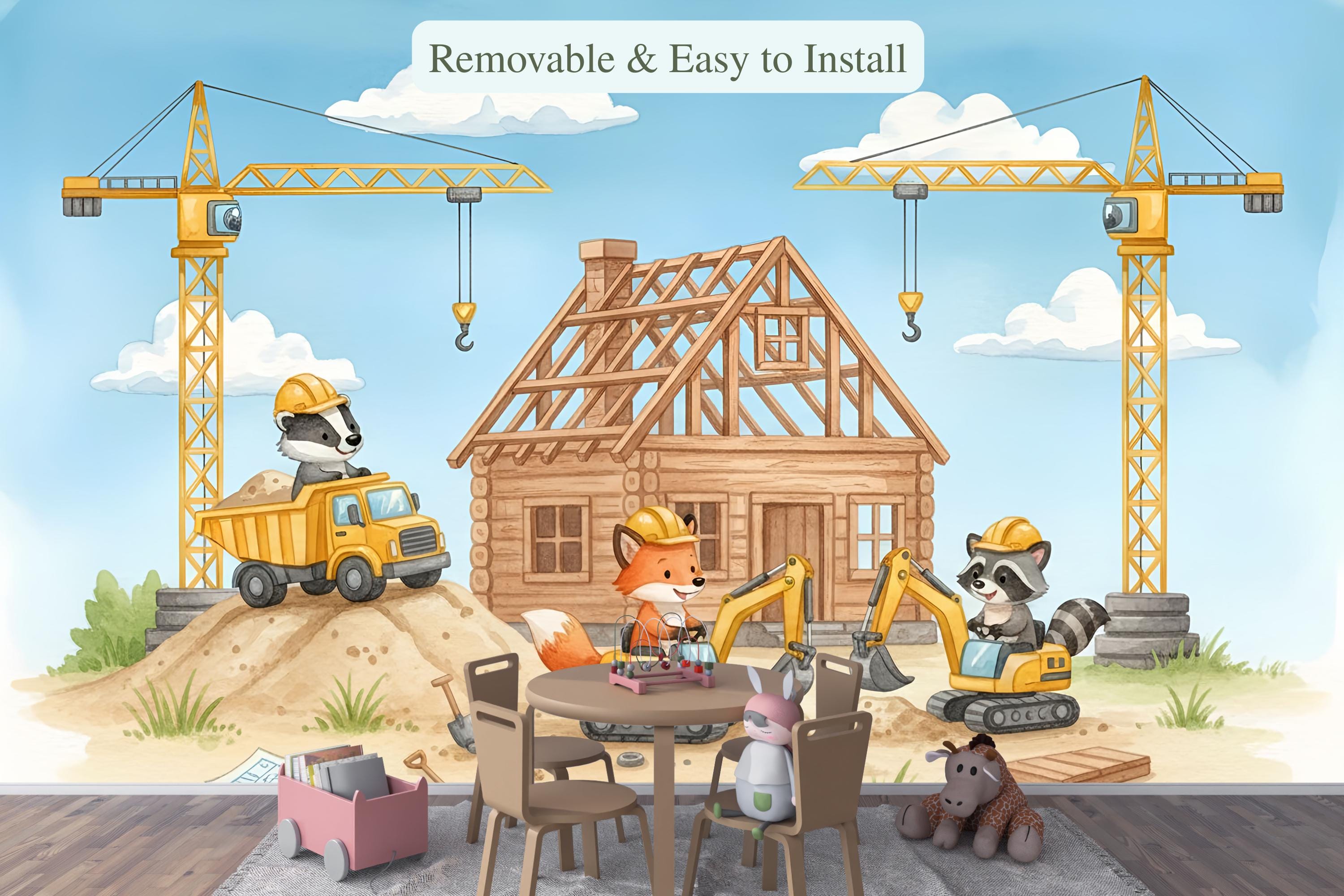 Watch as a team of charming forest animals – a busy badger in a dump truck, a focused fox on an excavator, and a diligent raccoon on another digger – work together to build a cozy wooden house. Towering cranes add to the excitement, creating a lively construction site scene under a bright, cloudy sky. This vibrant boys room mural transforms any little builder's bedroom, playroom, or nursery wall decor into an engaging, imaginative world. Our premium peel and stick wallpaper makes creating this bustling scene wonderfully simple and mess-free.