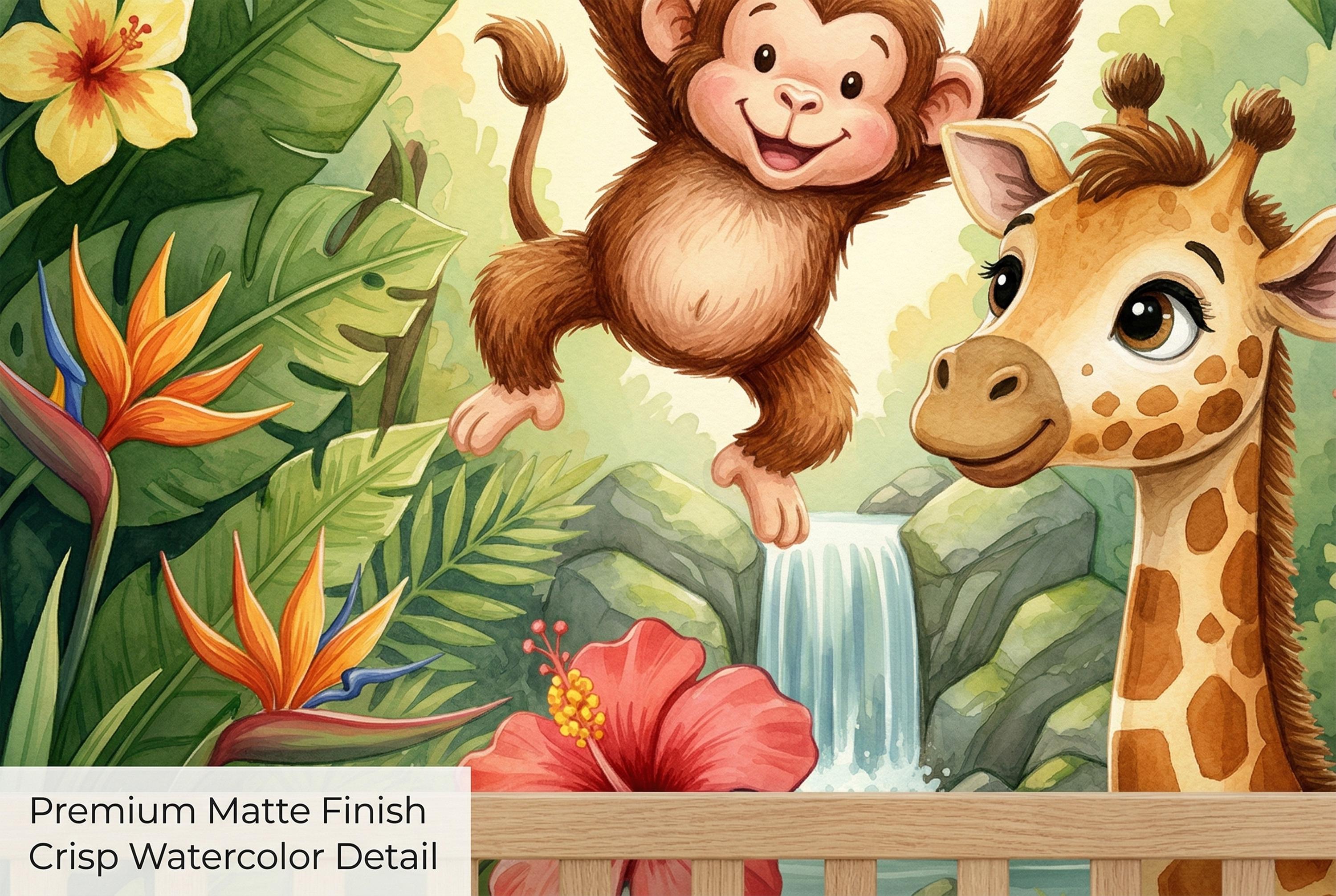 This jungle animals peel and stick mural by WallpaperPixi puts your child right in the heart of the most exciting place on earth. A cheeky baby monkey swings from a jungle vine with a grin that says he owns the place, while a wide-eyed lion cub sits below and a young giraffe leans in curiously from the right. Behind them, a sparkling waterfall tumbles over moss-covered rocks into a clear pool — the whole scene framed by an abundant tropical canopy of monstera leaves, palm fronds, and an explosion of exotic blooms: red and yellow hibiscus, vivid orange heliconia, pink flowers, and bird of paradise in full display.