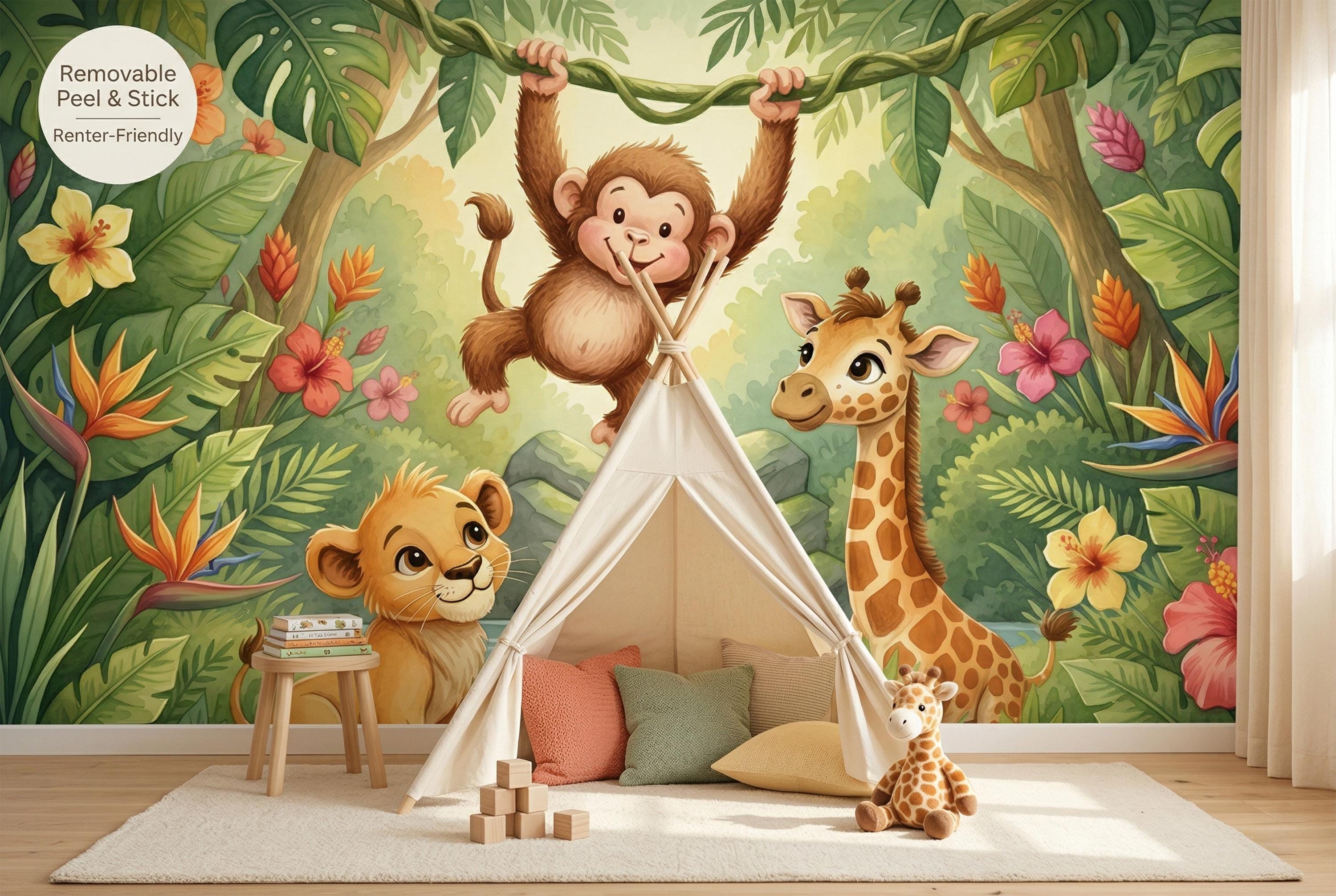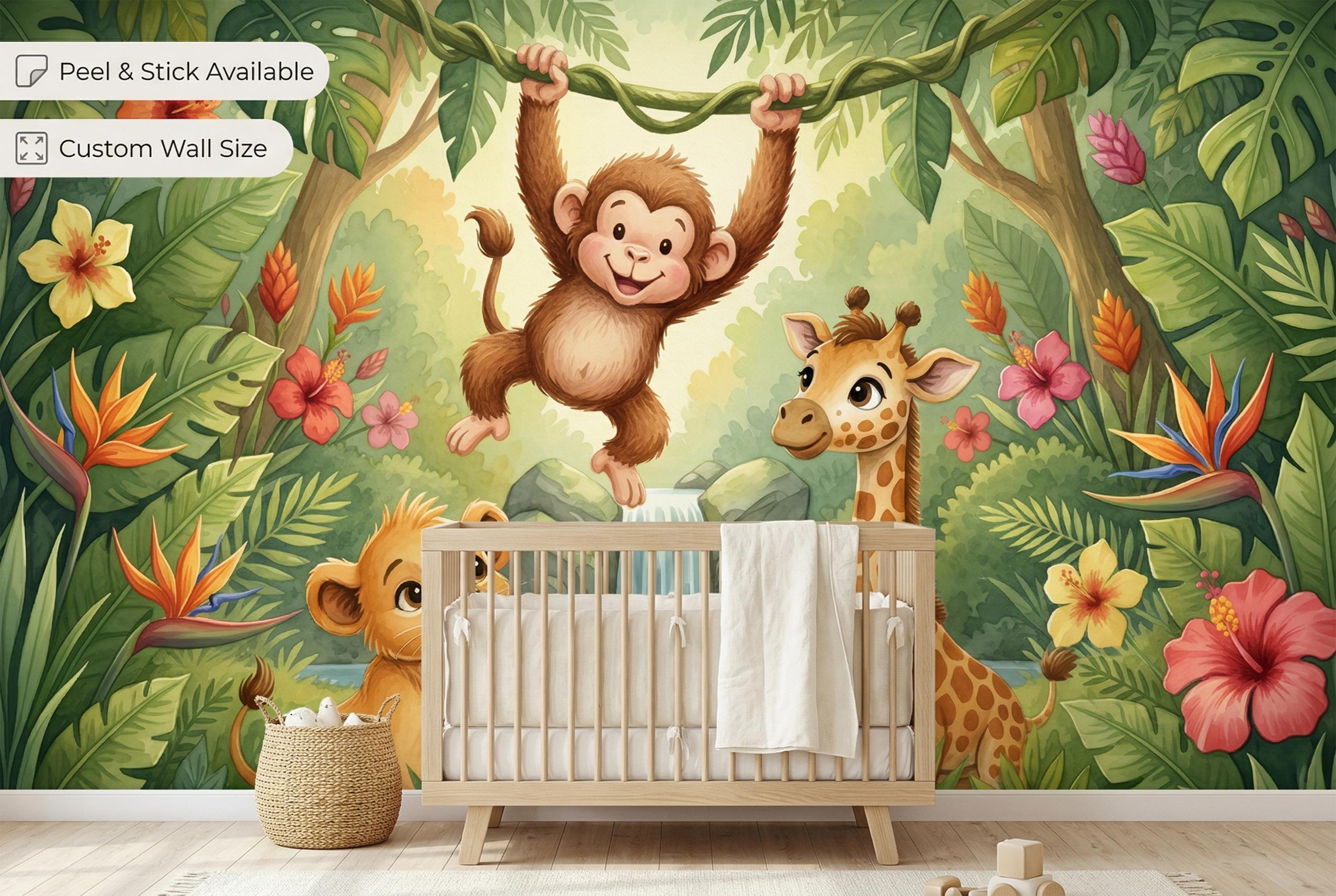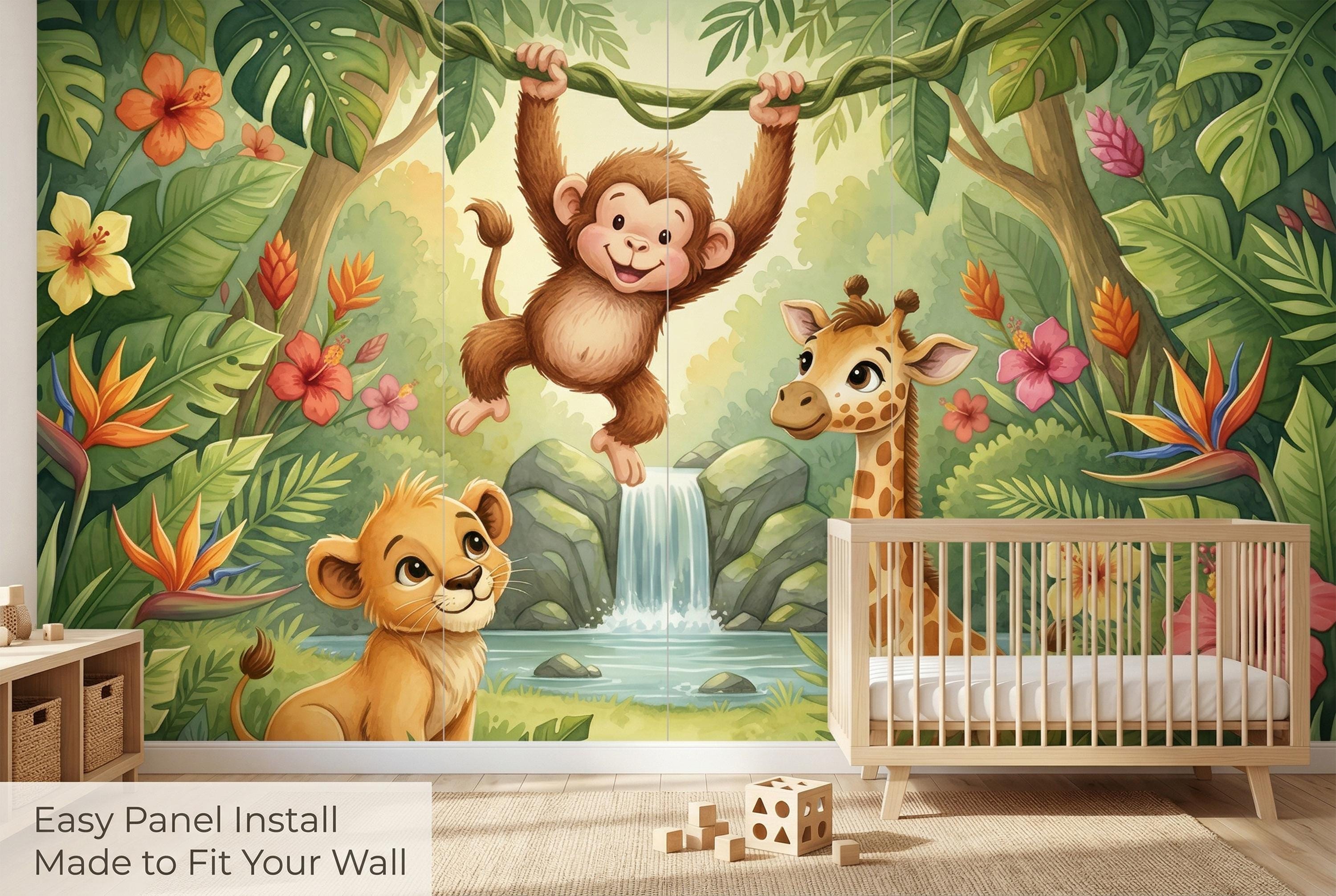 Looking for a baby safari wallpaper that works for boys, girls, or a gender-neutral nursery? This jungle animal mural is the answer. As a savannah animals wallpaper with a tropical jungle twist, it bridges both safari and jungle themes in one immersive scene.