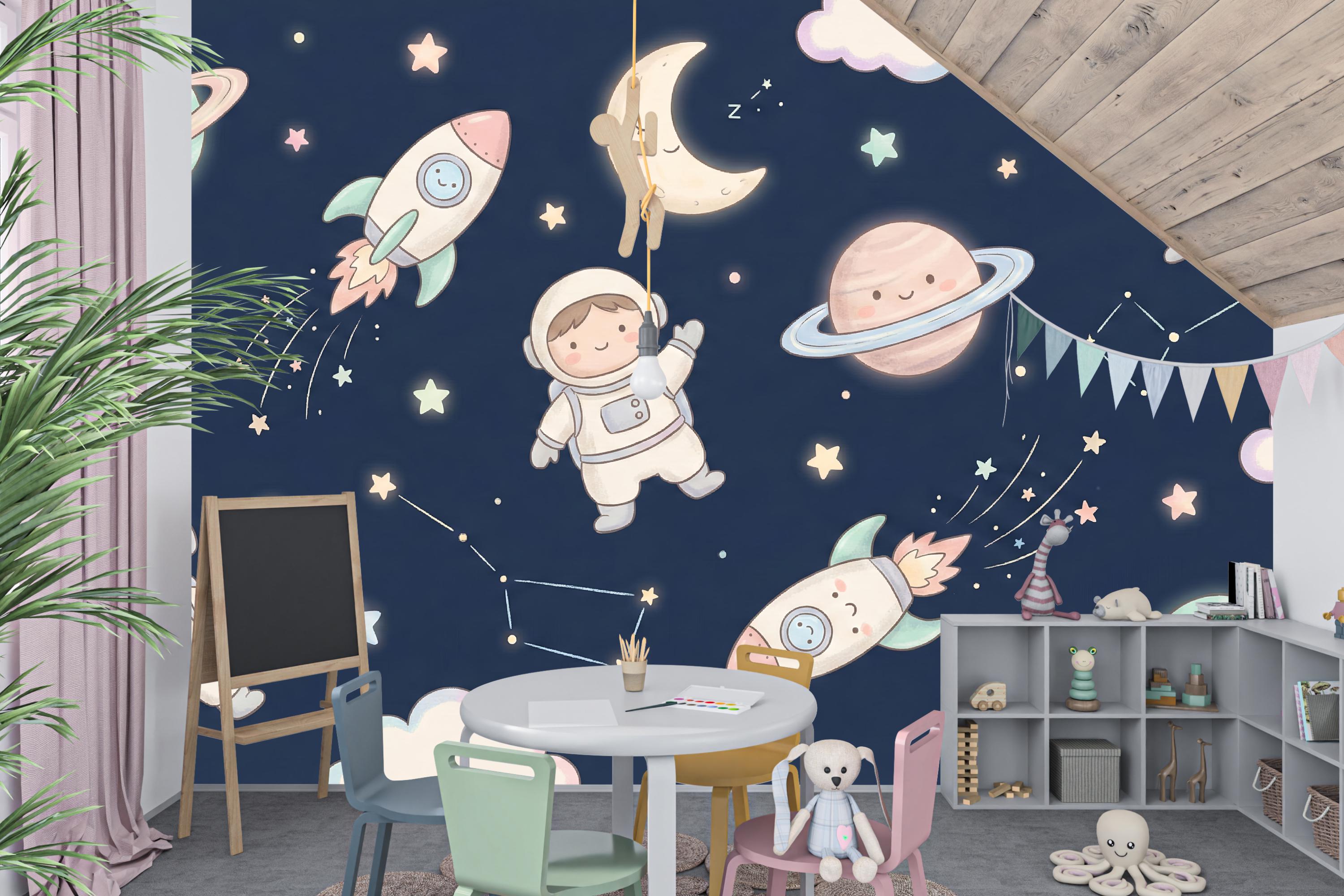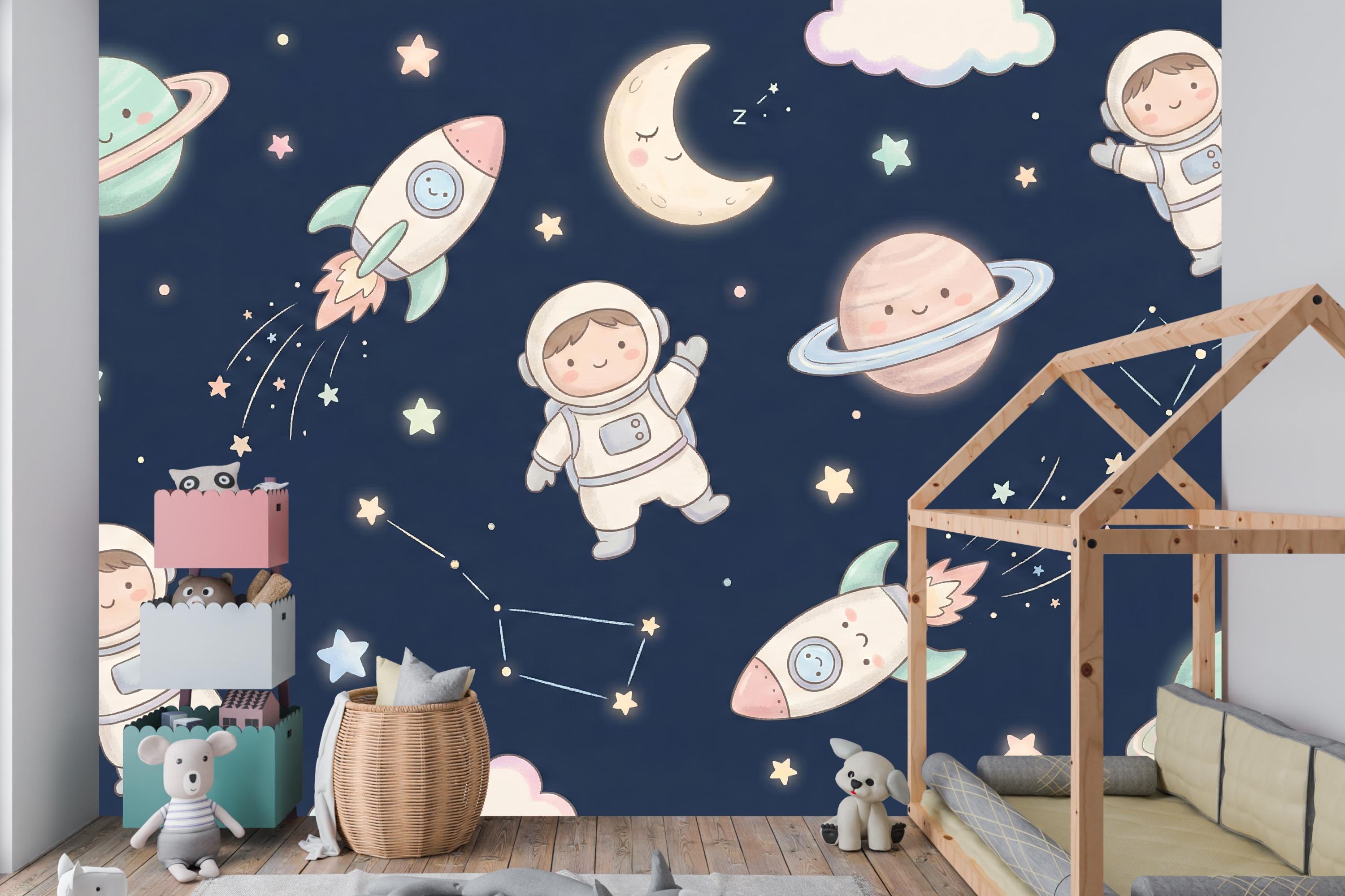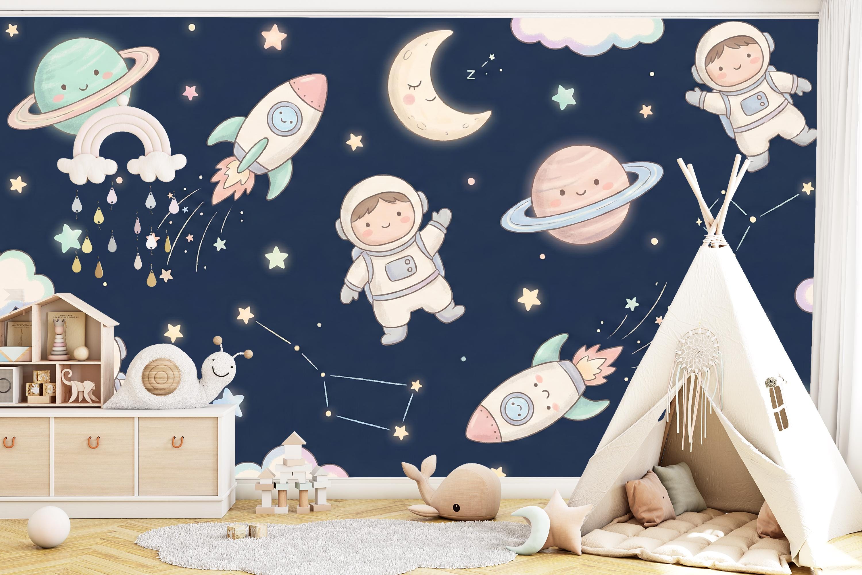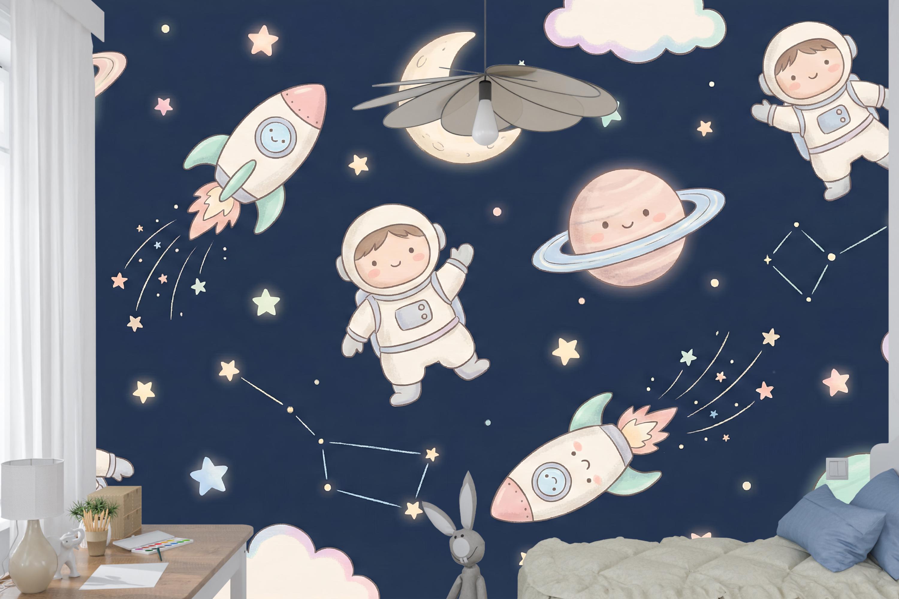 Transform your child's room into a universe of wonder with our enchanting "Galactic Dreamers" wallpaper. Imagine their eyes lighting up as they drift off to sleep, surrounded by friendly astronauts, smiling planets, and rockets zooming through a galaxy of soft, glowing stars. This isn't just wallpaper; it's a portal to nightly adventures and endless imagination.