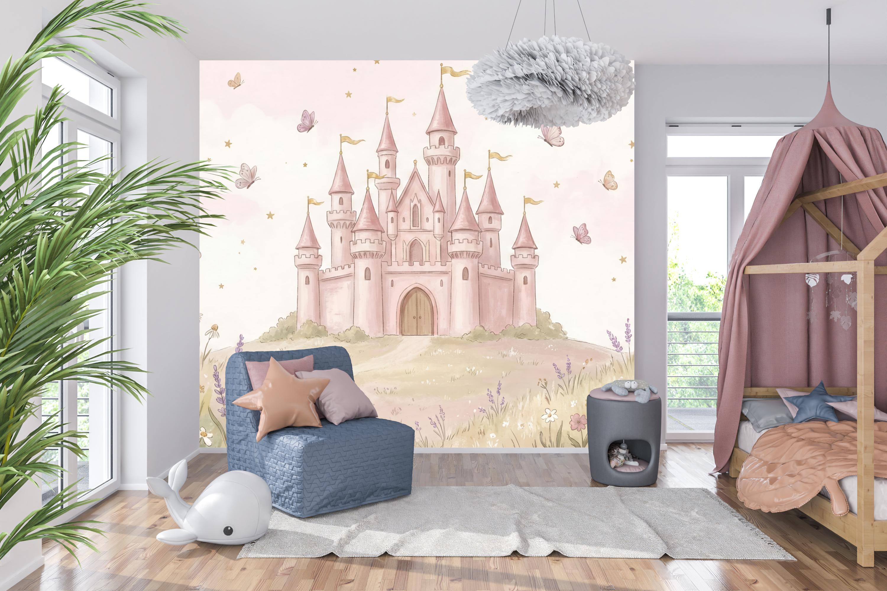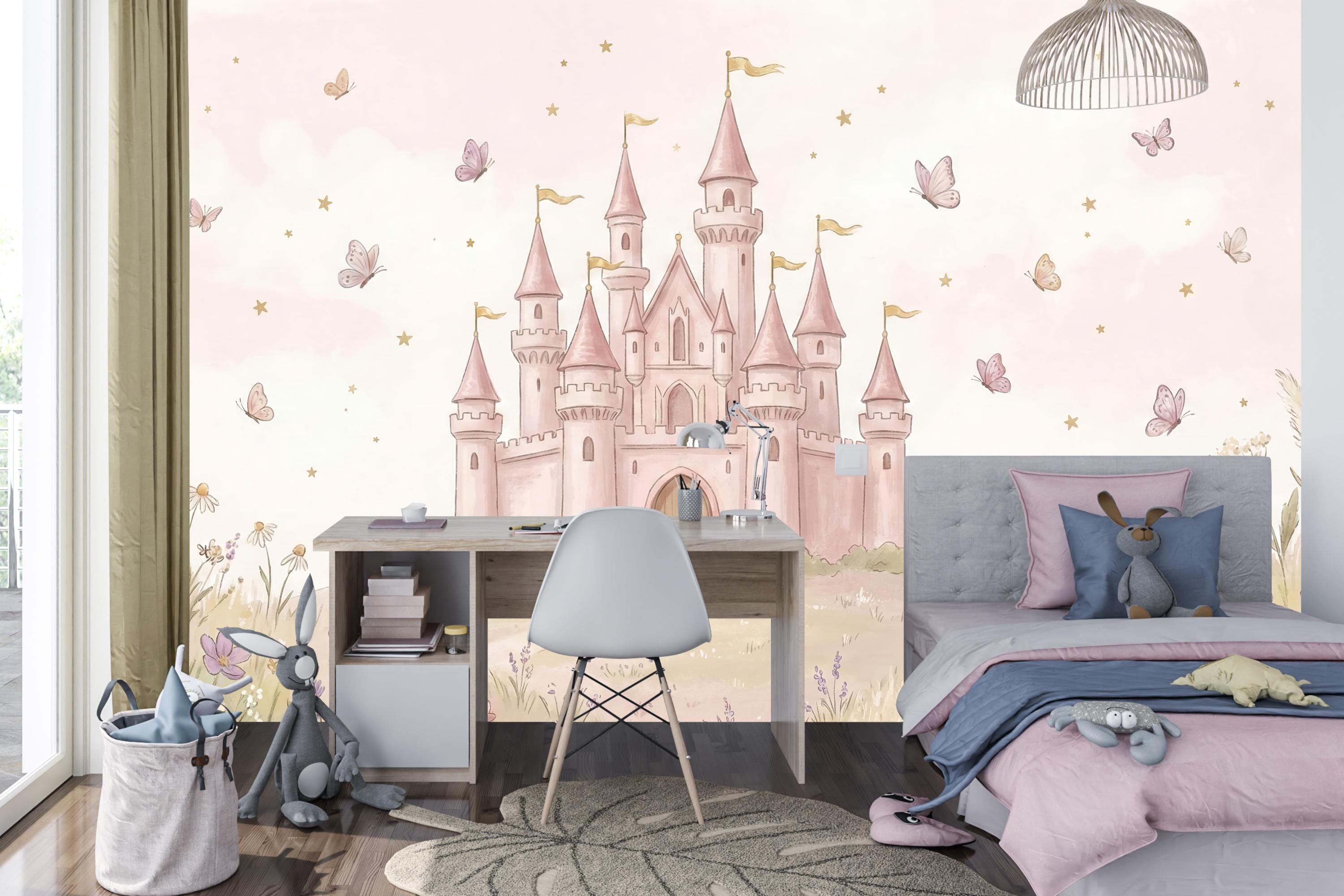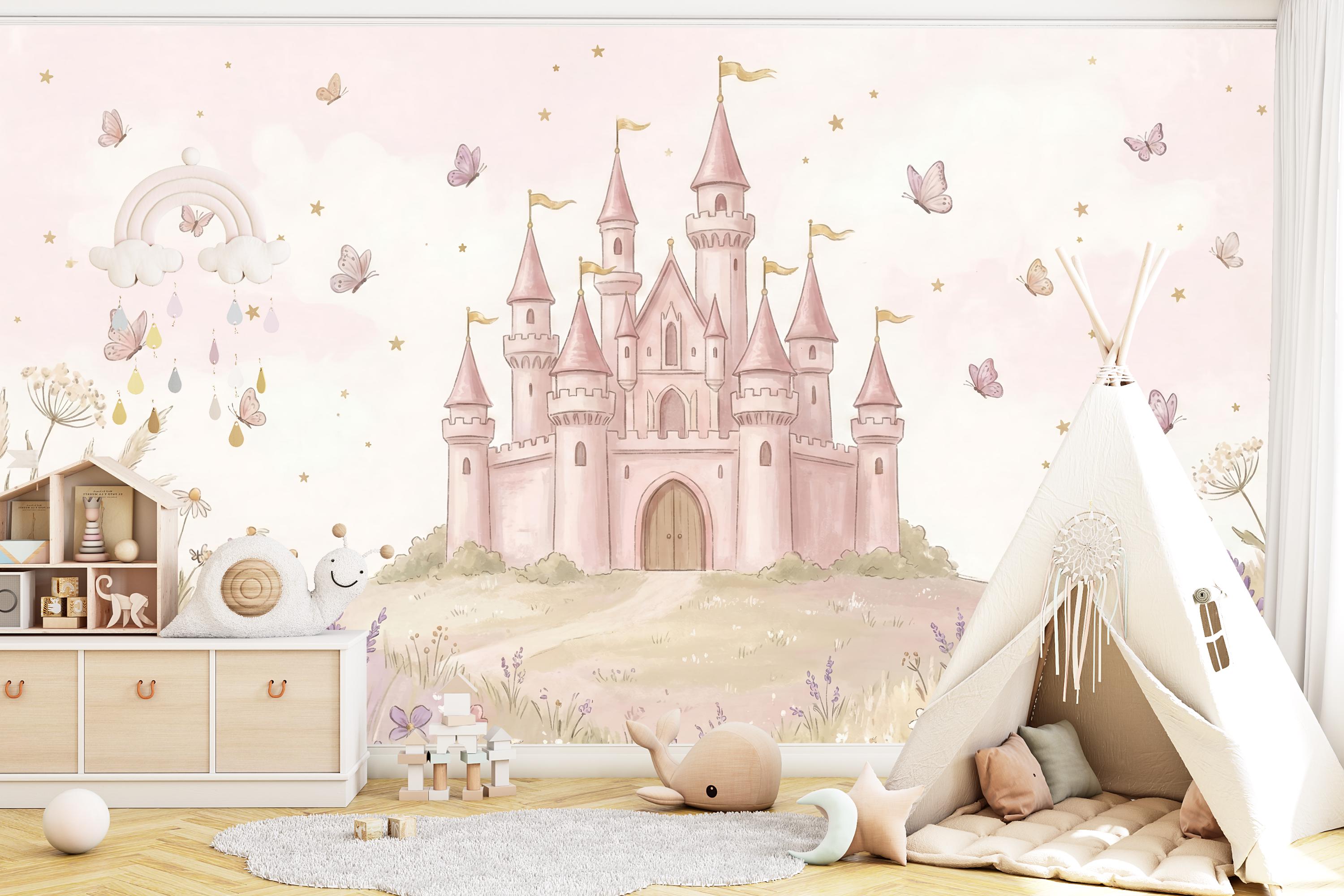 Create a magical kingdom for your little princess with our enchanting "Royal Rose Castle" wallpaper. This isn't just a wall covering; it's a portal to a world of fairy tales and sweet dreams. Imagine her delight as she gazes upon a magnificent pink castle perched on a rolling hill, surrounded by a meadow of soft wildflowers, lavender, and fluttering butterflies. The gentle watercolor style and warm pink sky filled with tiny stars create a soothing, whimsical atmosphere perfect for sleep and play.