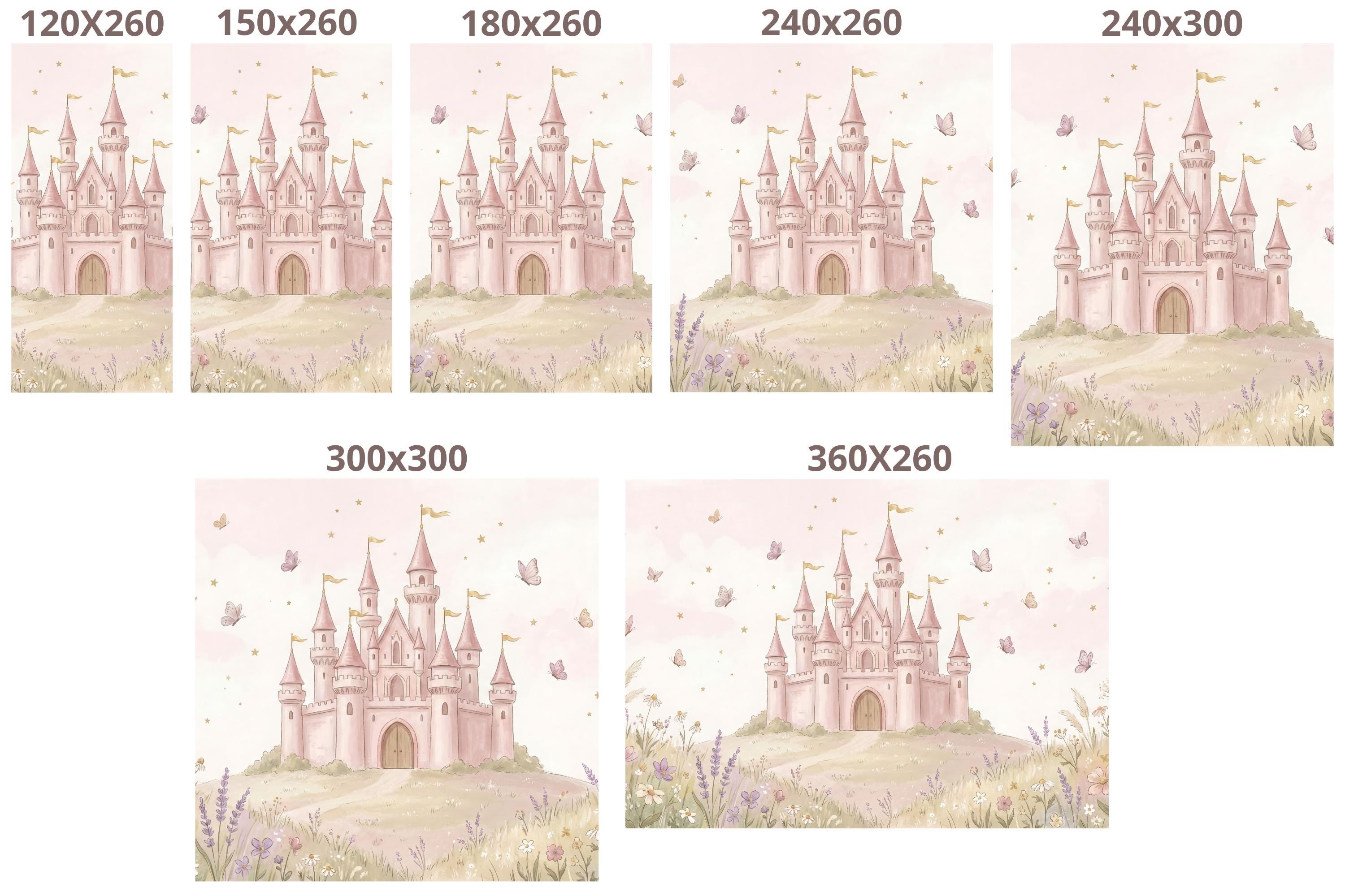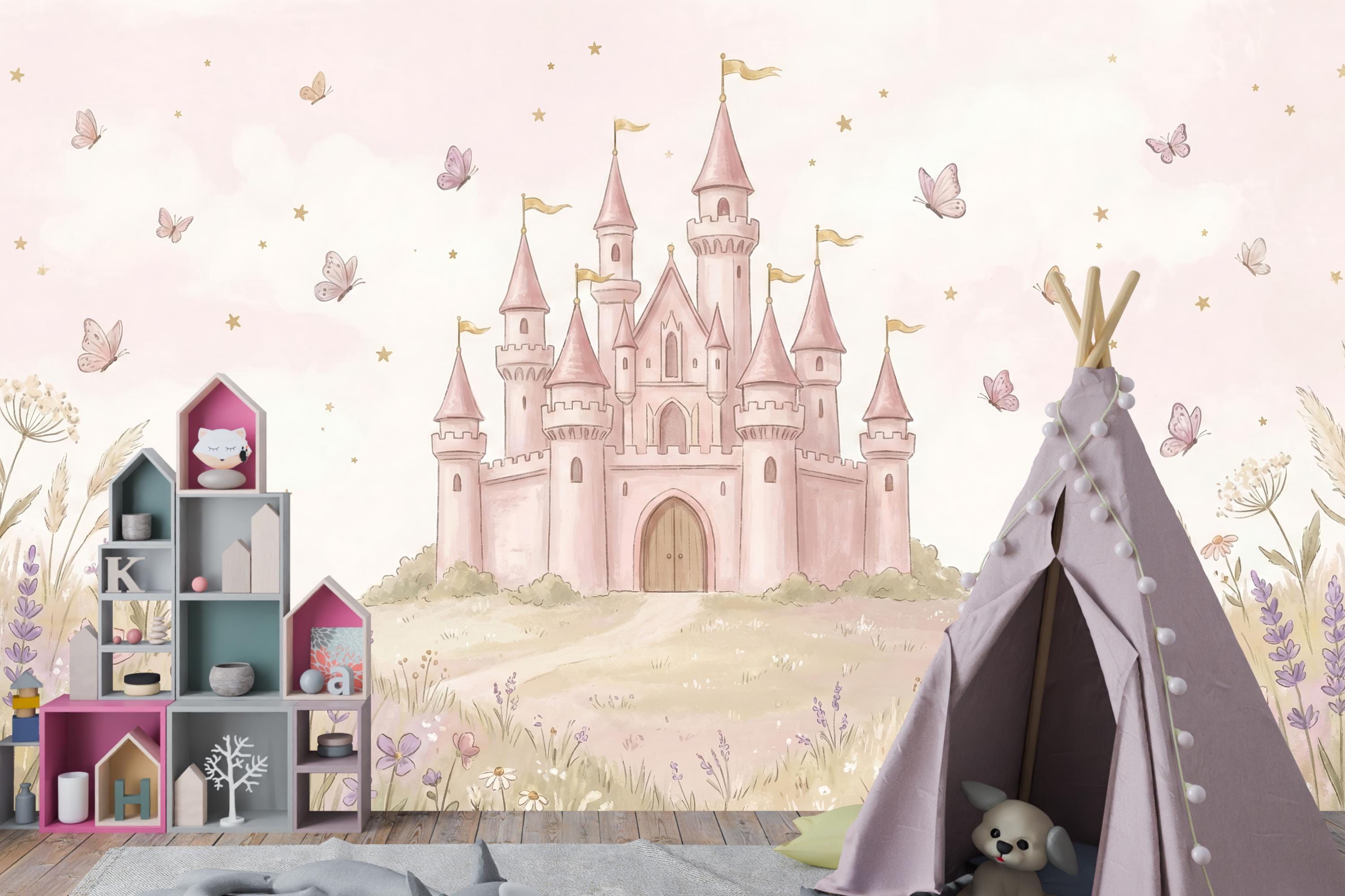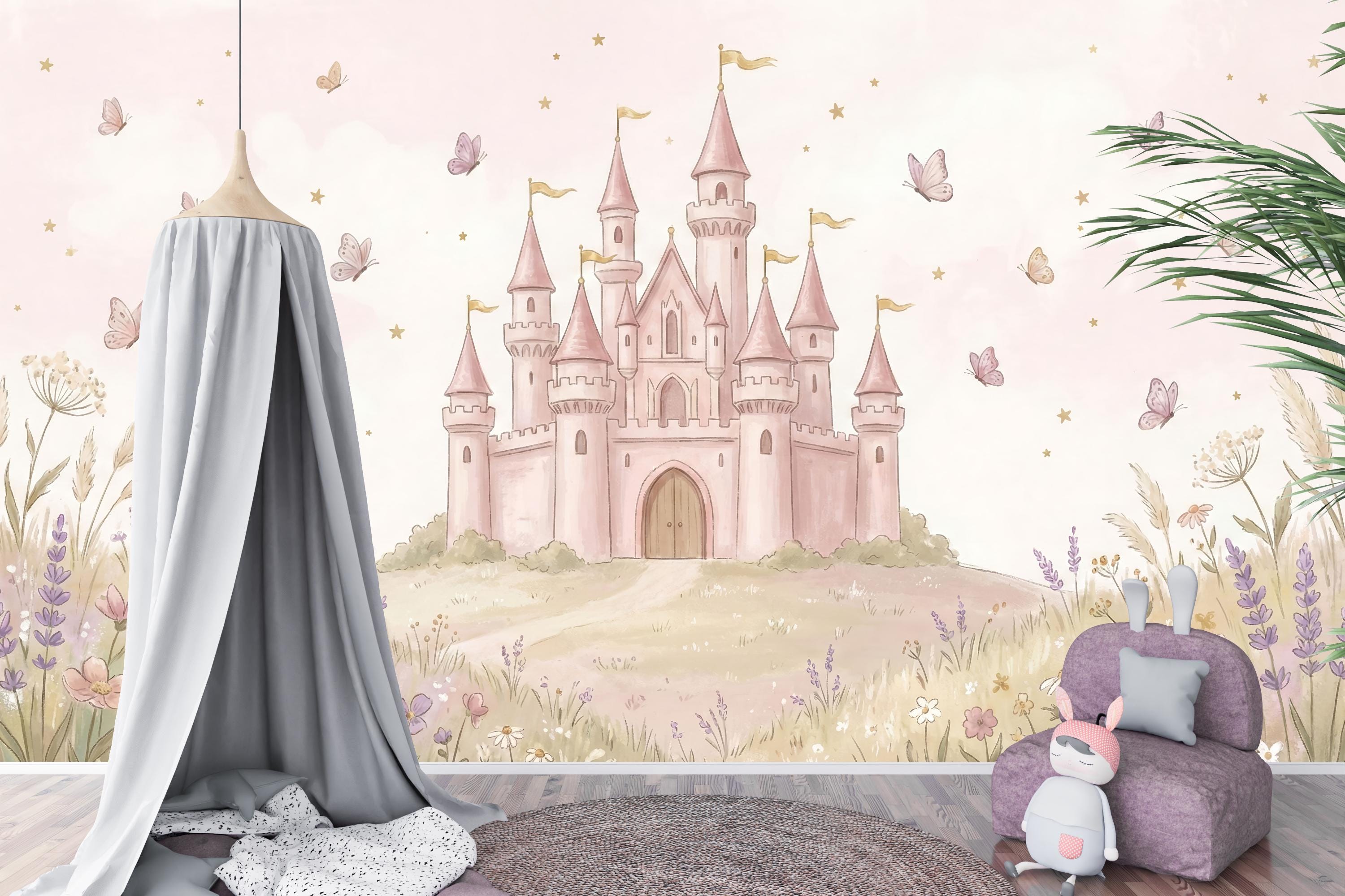 Create a magical kingdom for your little princess with our enchanting "Royal Rose Castle" wallpaper. This isn't just a wall covering; it's a portal to a world of fairy tales and sweet dreams. Imagine her delight as she gazes upon a magnificent pink castle perched on a rolling hill, surrounded by a meadow of soft wildflowers, lavender, and fluttering butterflies. The gentle watercolor style and warm pink sky filled with tiny stars create a soothing, whimsical atmosphere perfect for sleep and play.