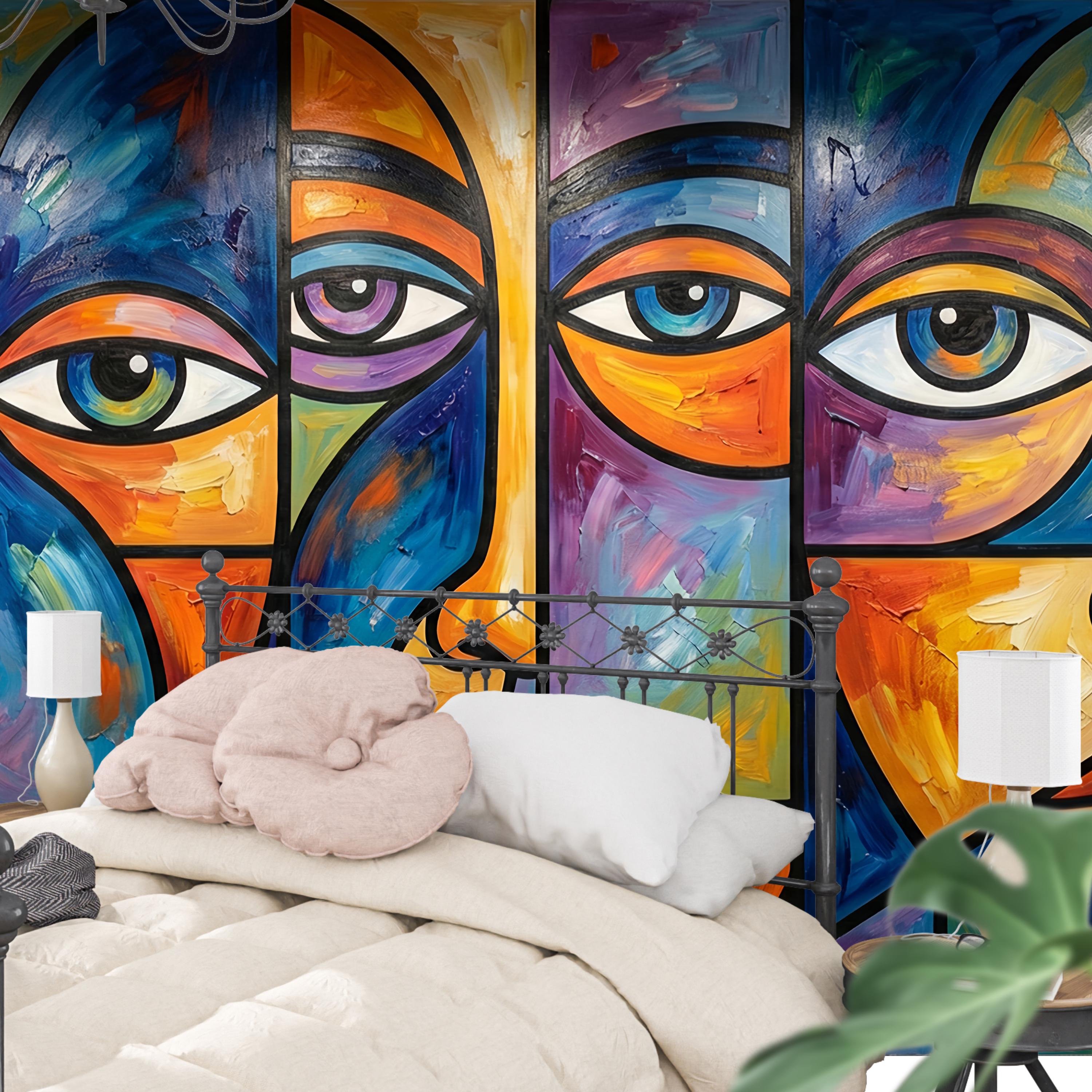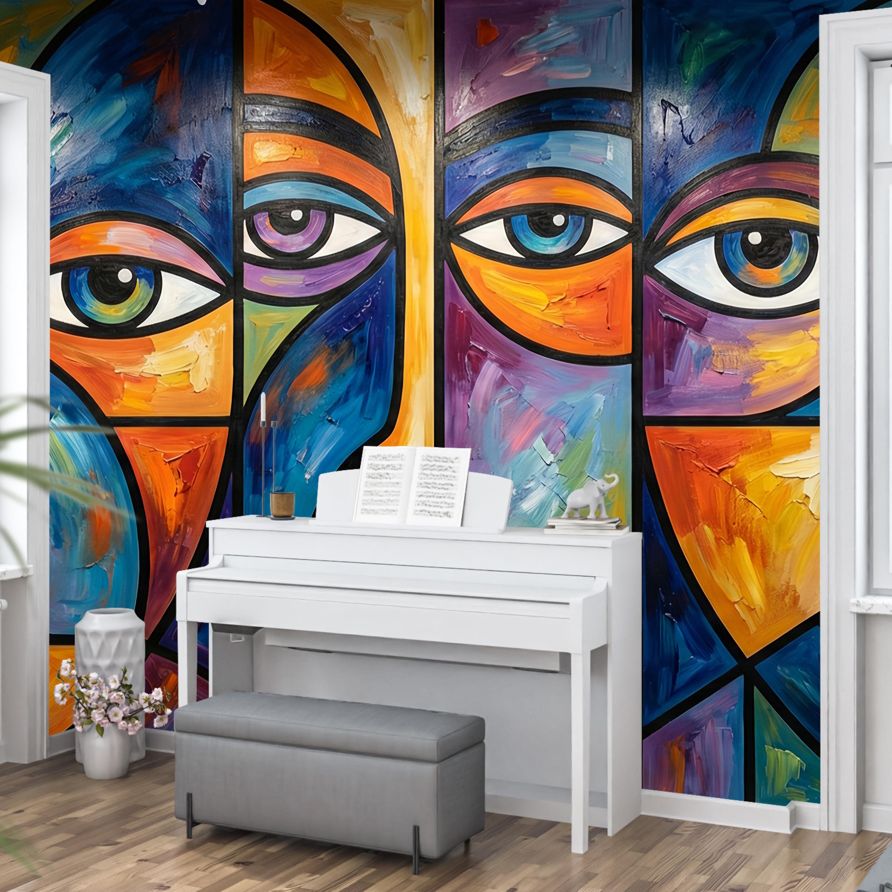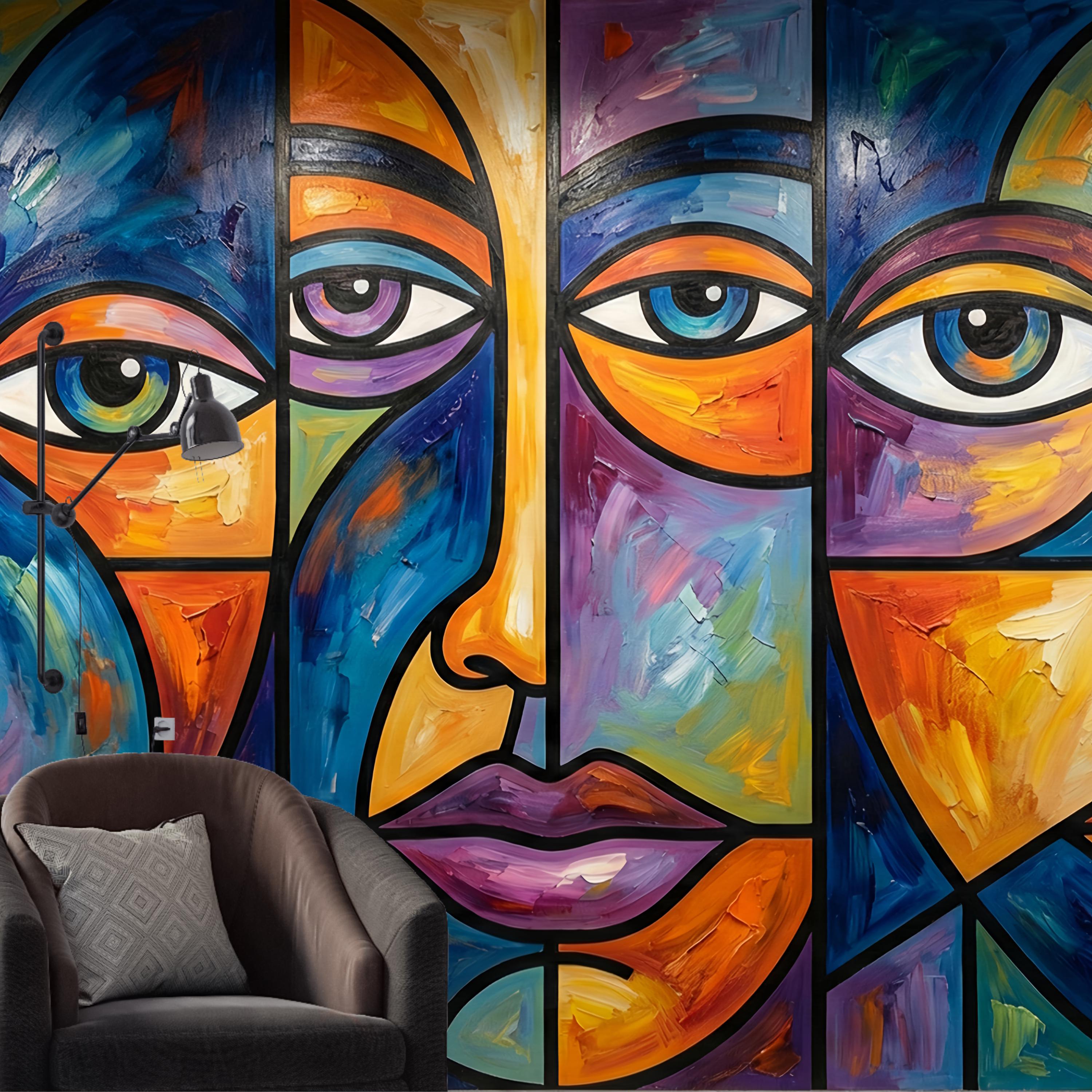 Inspired by Picasso-esque cubism and the vibrant energy of stained glass, this mural features fragmented portraits rendered in deep blues, fiery oranges, and rich purples. The high-quality print perfectly captures the texture of thick, impasto oil brushstrokes, giving your walls depth and artistic credibility.