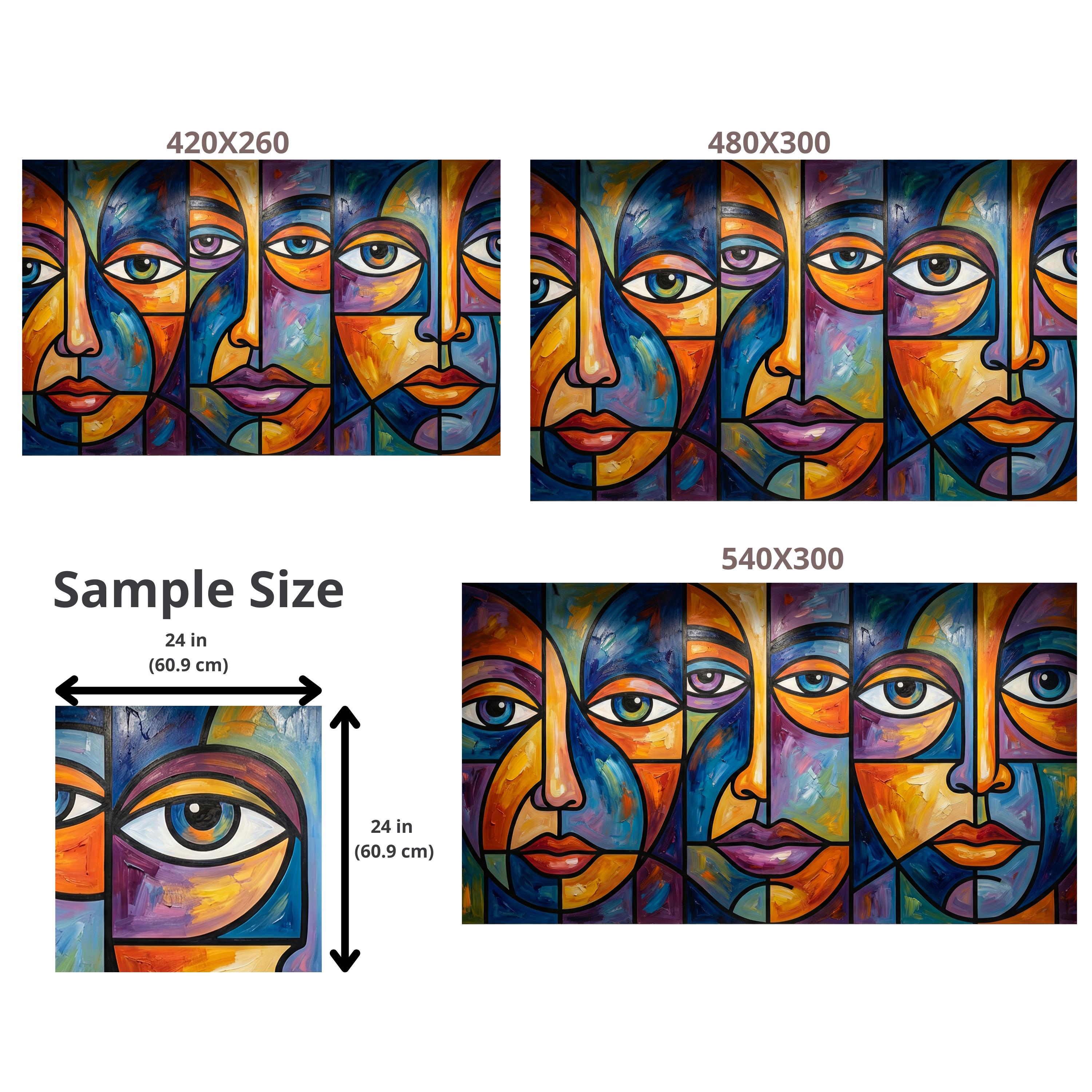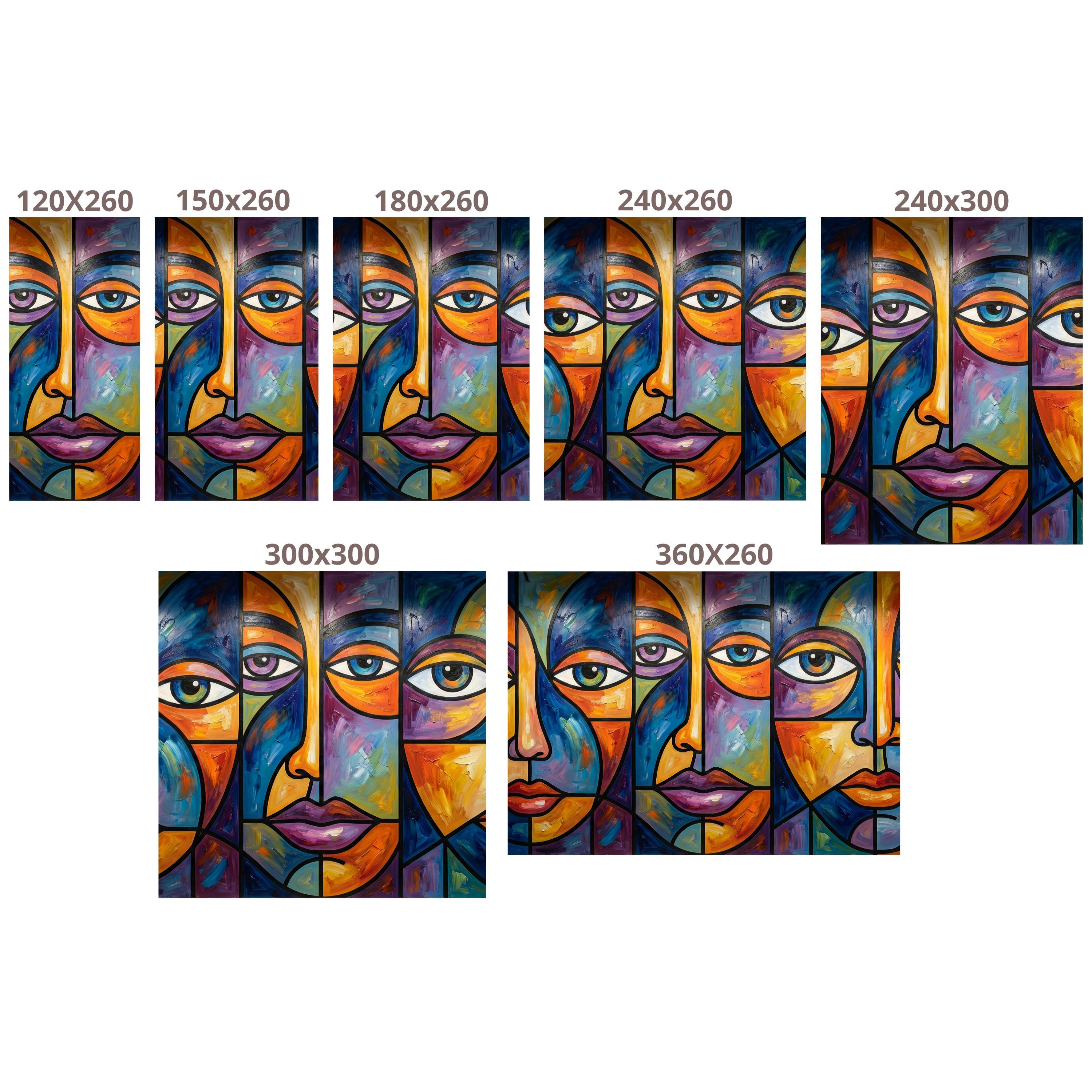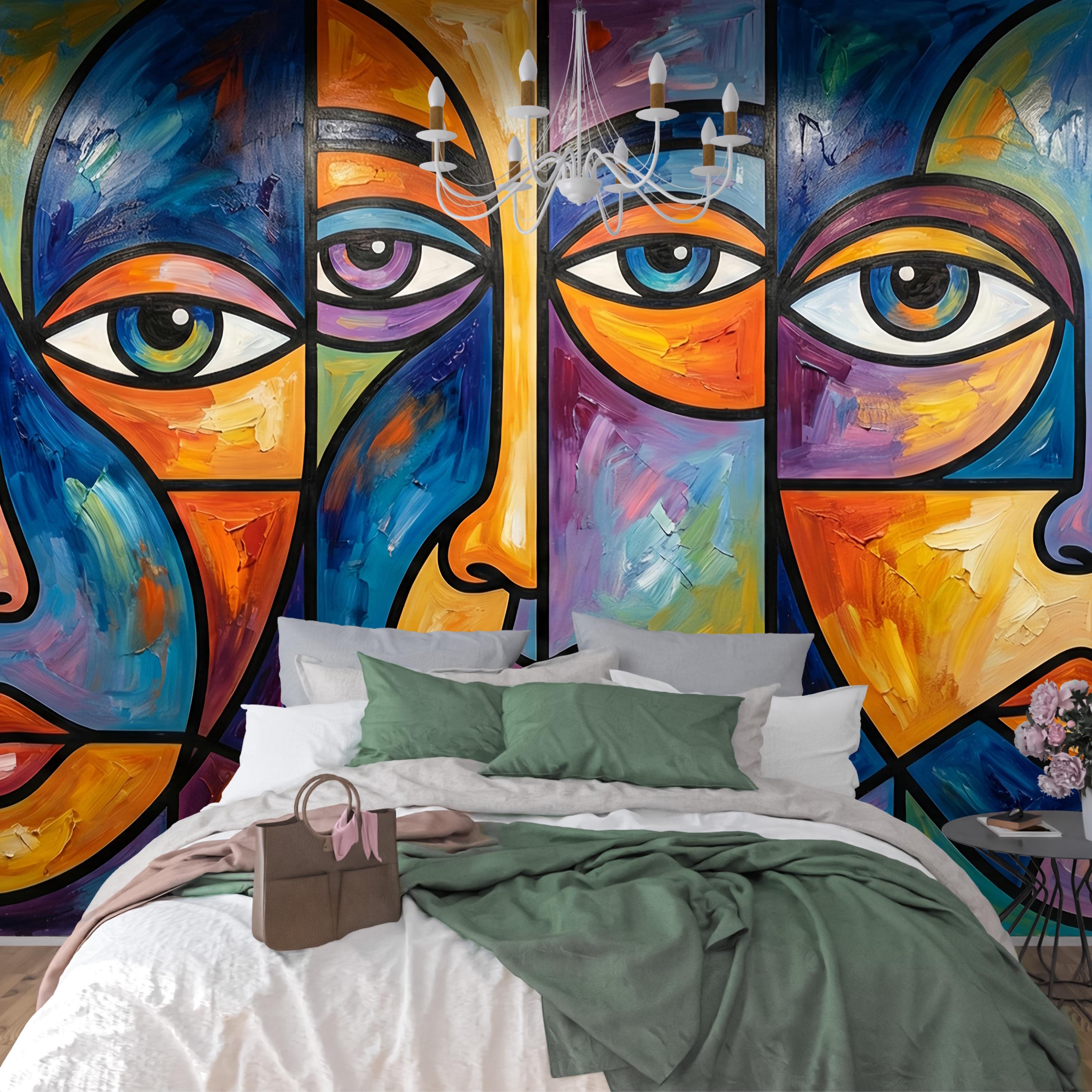 Inspired by Picasso-esque cubism and the vibrant energy of stained glass, this mural features fragmented portraits rendered in deep blues, fiery oranges, and rich purples. The high-quality print perfectly captures the texture of thick, impasto oil brushstrokes, giving your walls depth and artistic credibility.