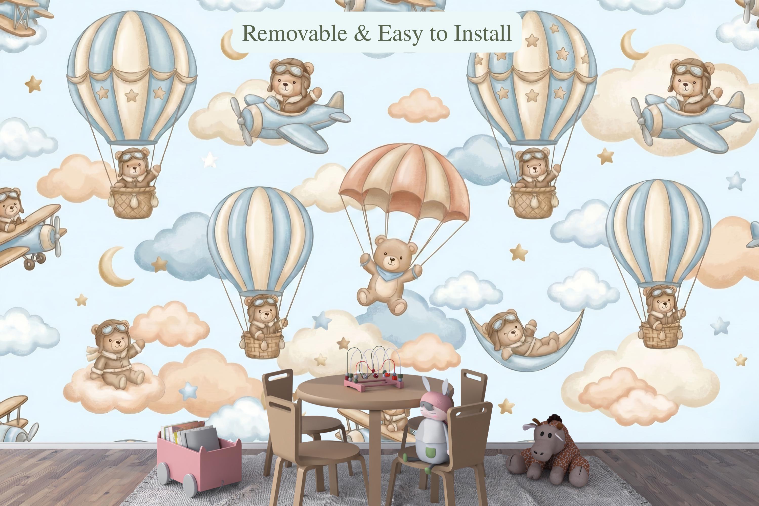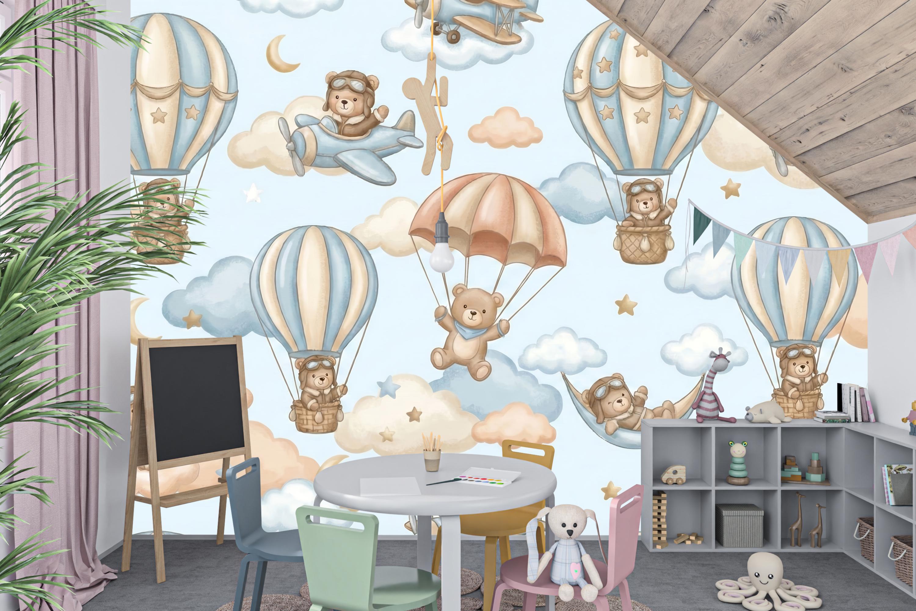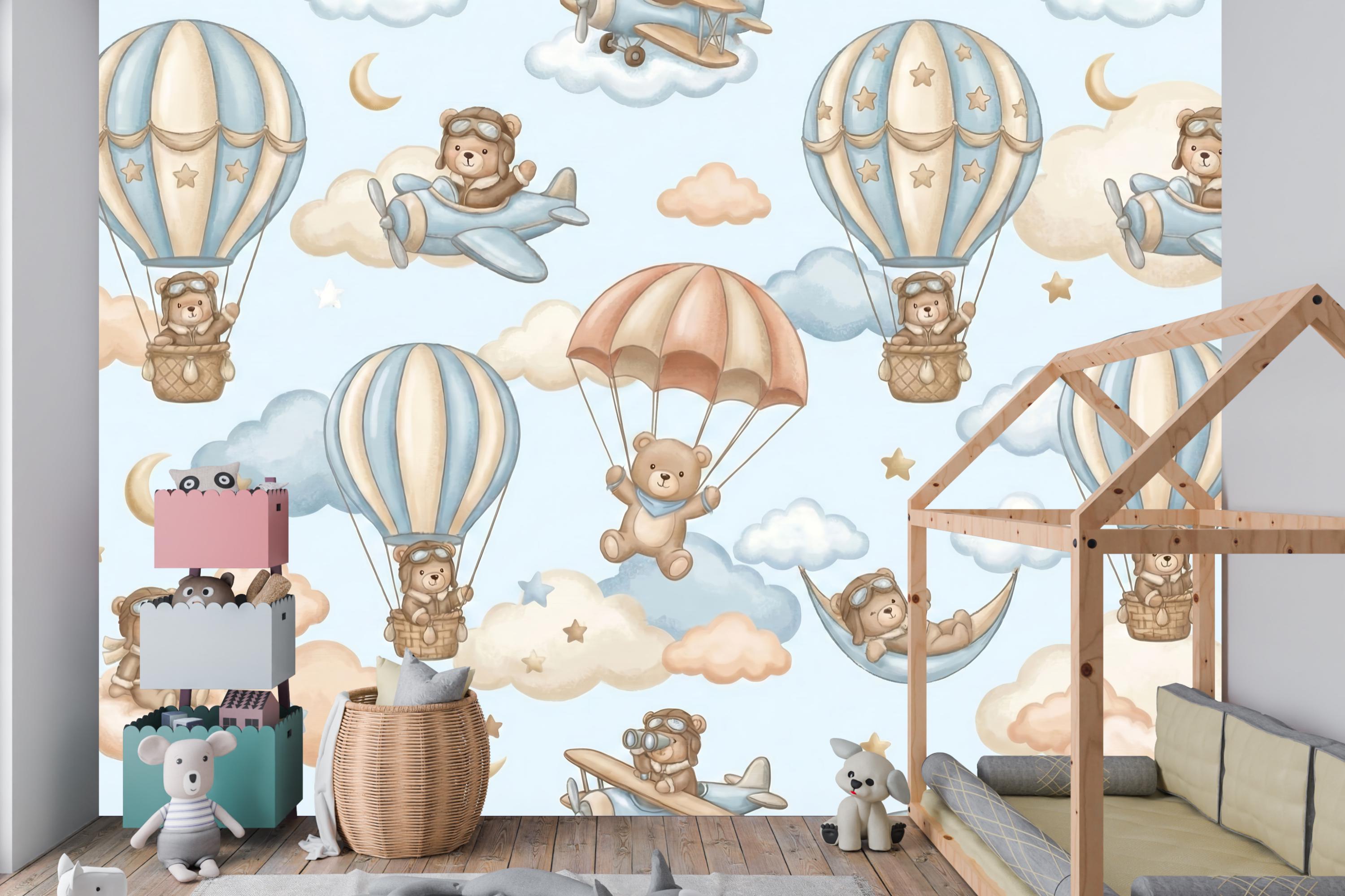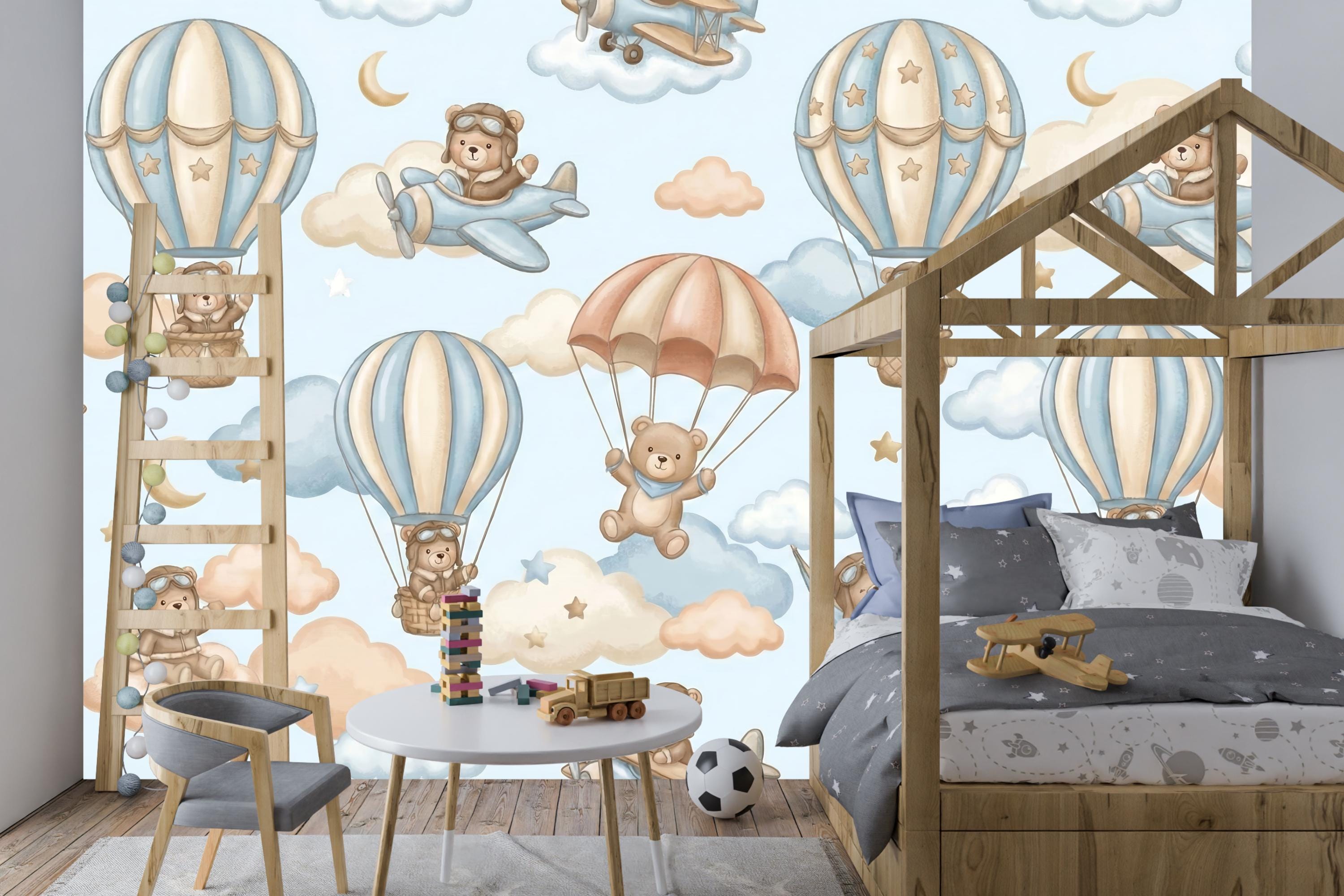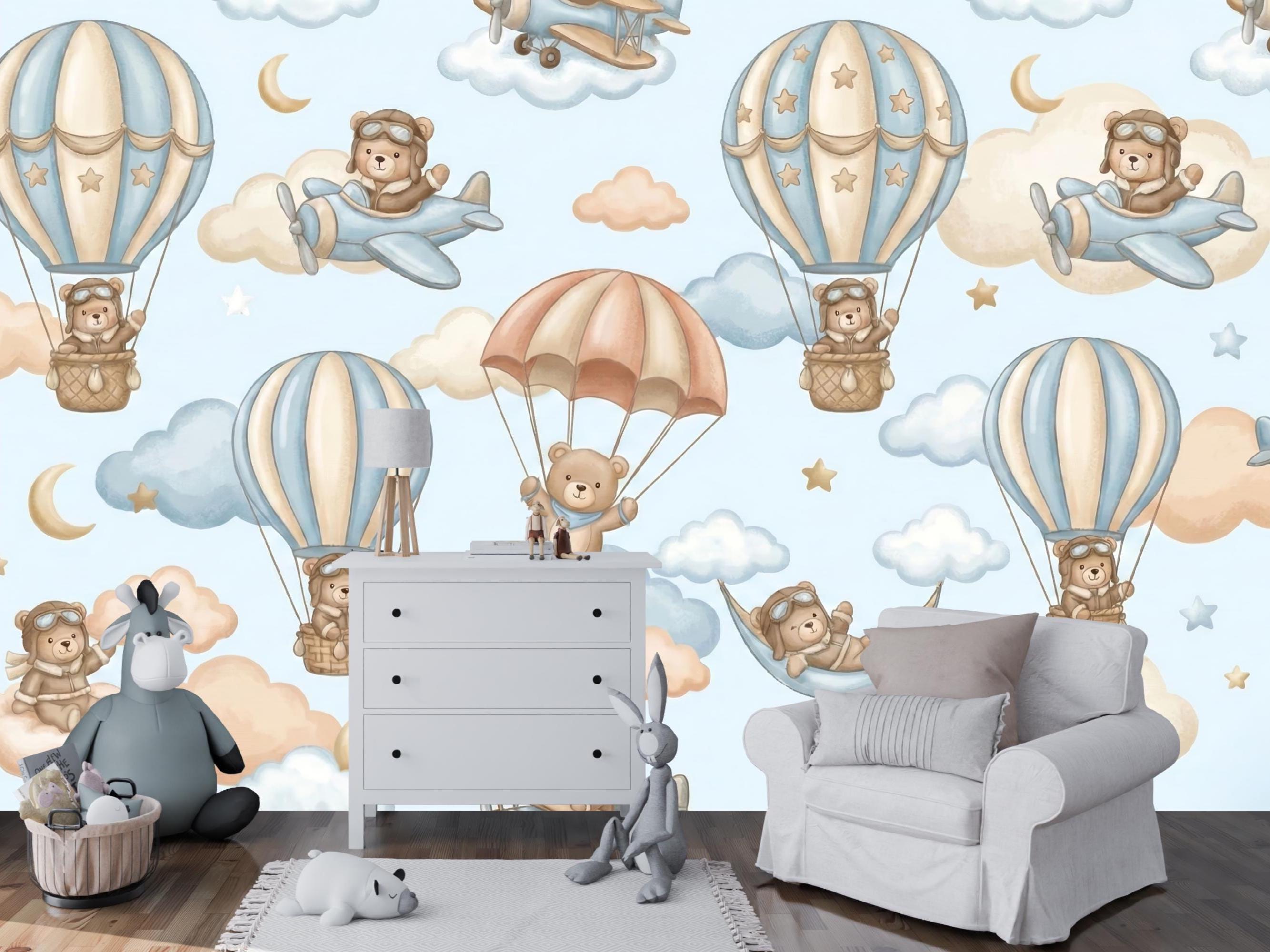 Ready for takeoff? Let your little one soar among the clouds with this adorable Aviator Bear Theme mural. This design captures the spirit of adventure, featuring a charming Pilot Teddy Bear navigating the skies in vintage planes and whimsical hot air balloon rides.