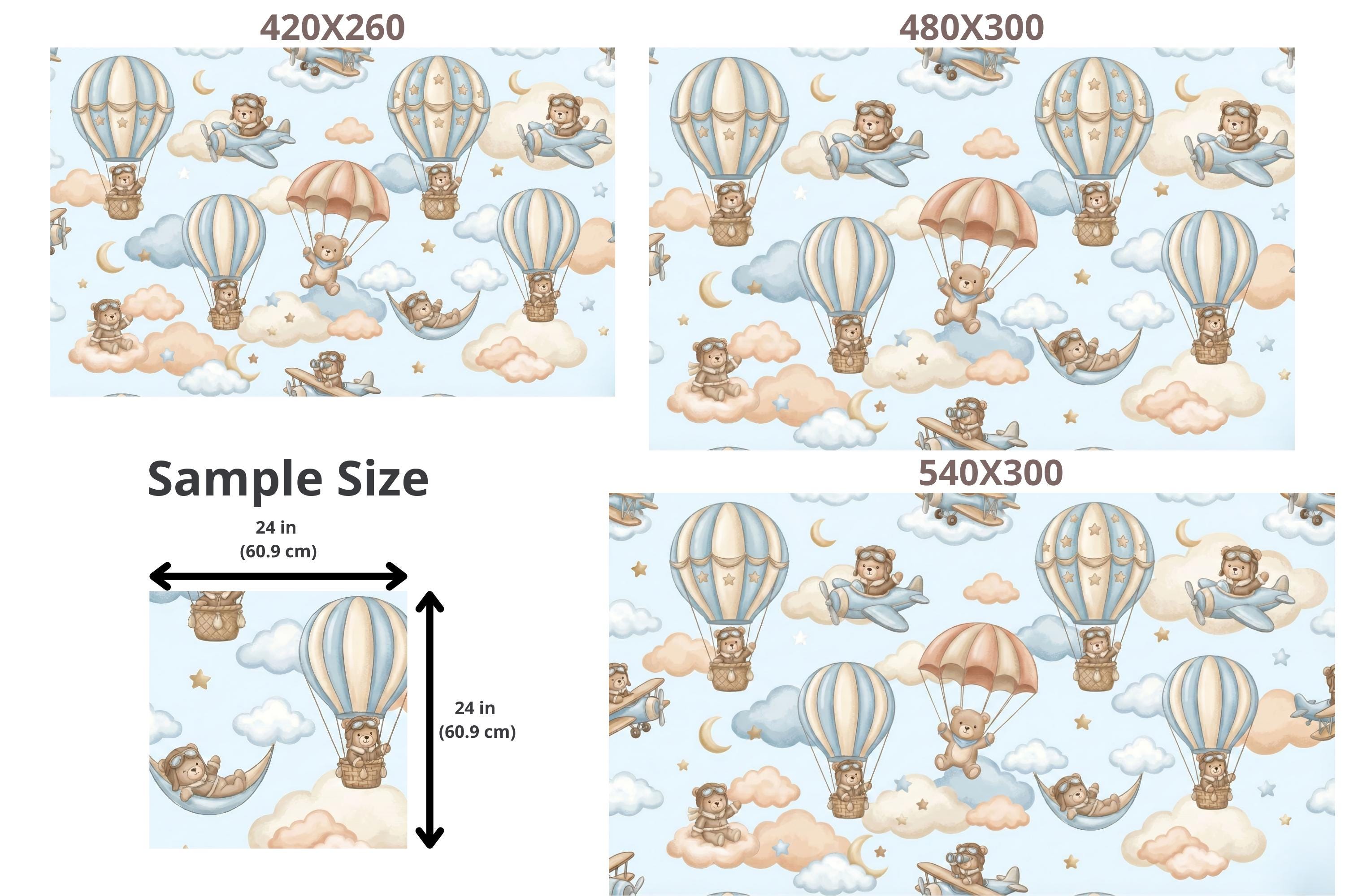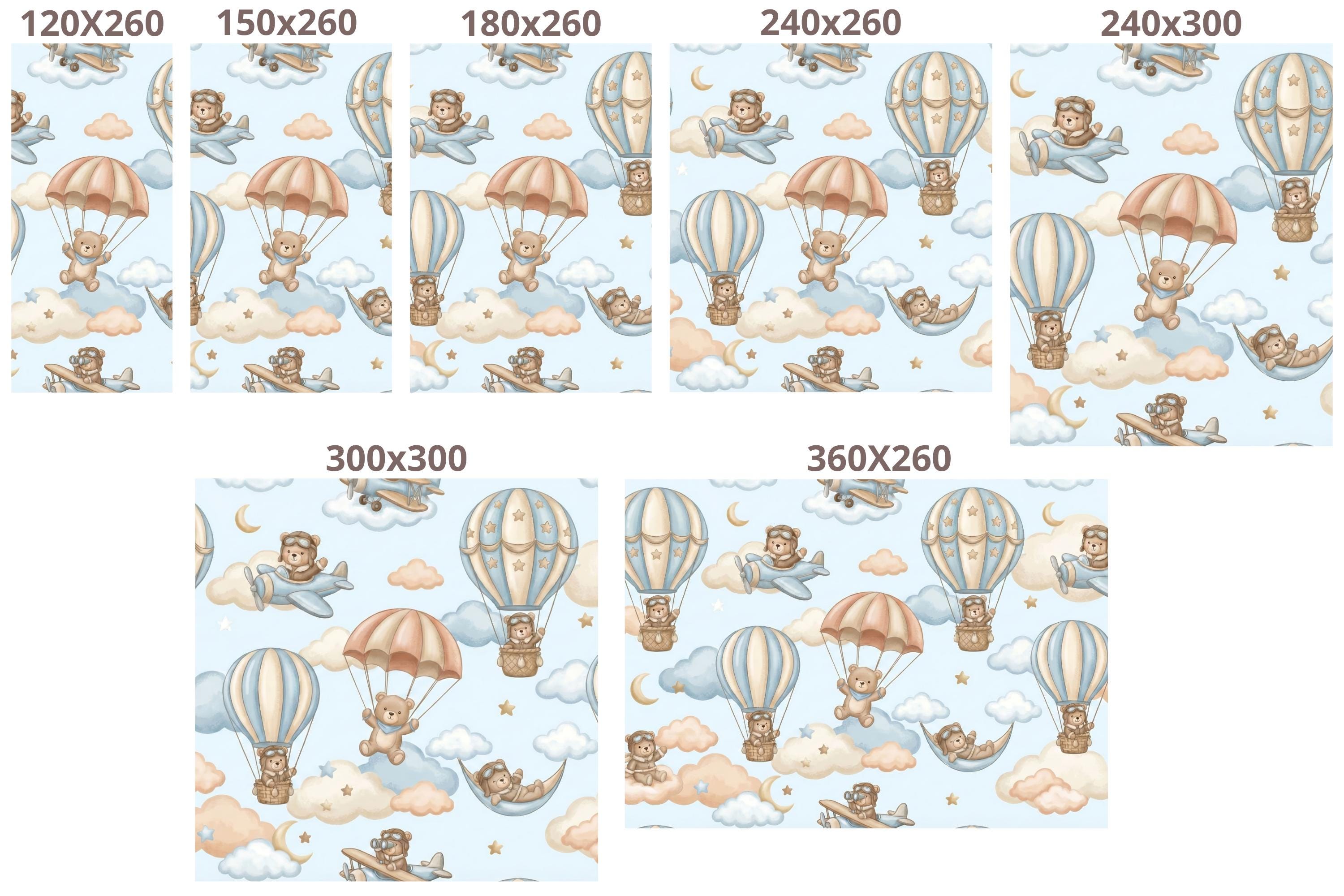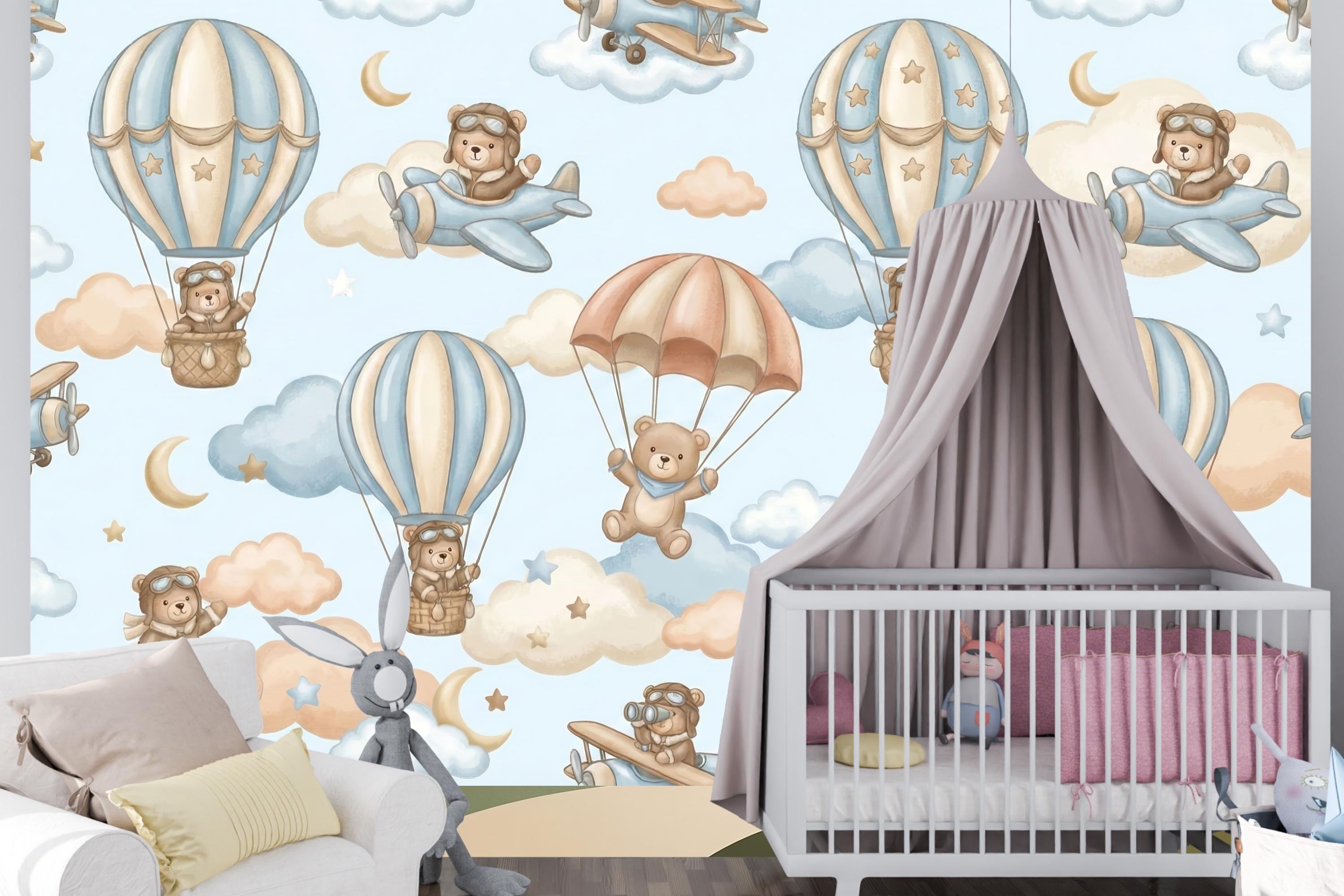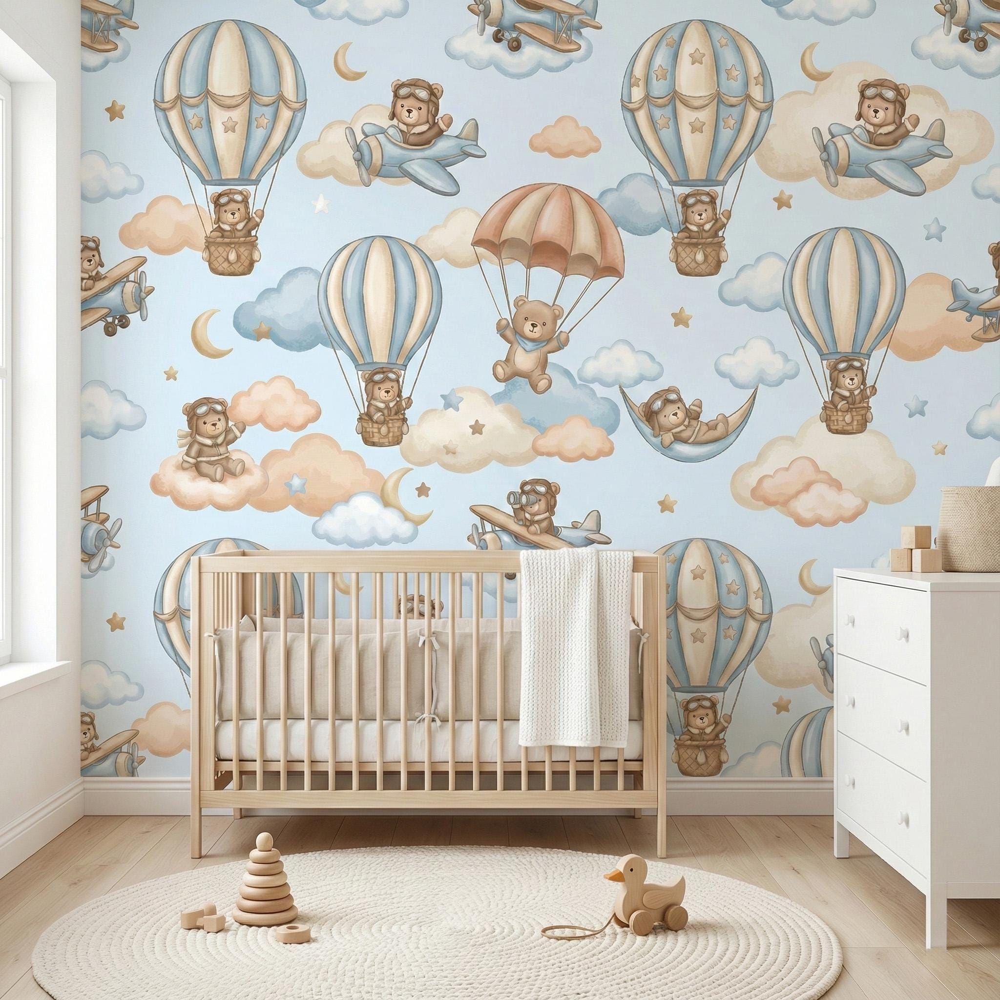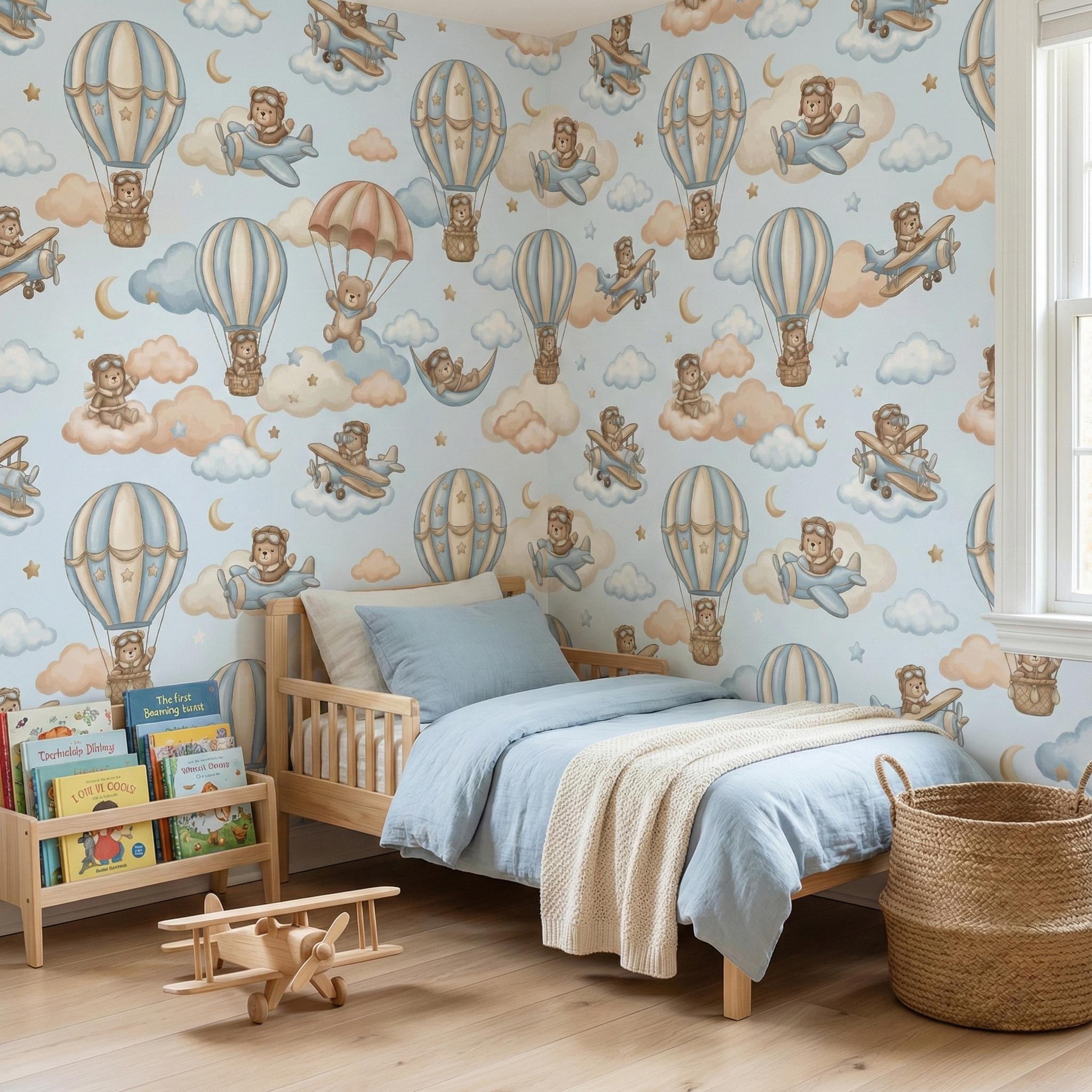 Ready for takeoff? Let your little one soar among the clouds with this adorable Aviator Bear Theme mural. This design captures the spirit of adventure, featuring a charming Pilot Teddy Bear navigating the skies in vintage planes and whimsical hot air balloon rides.