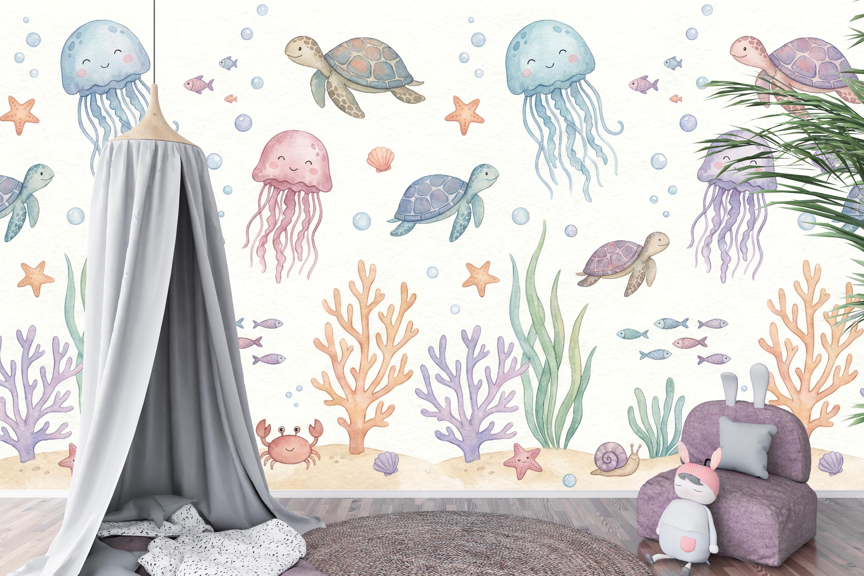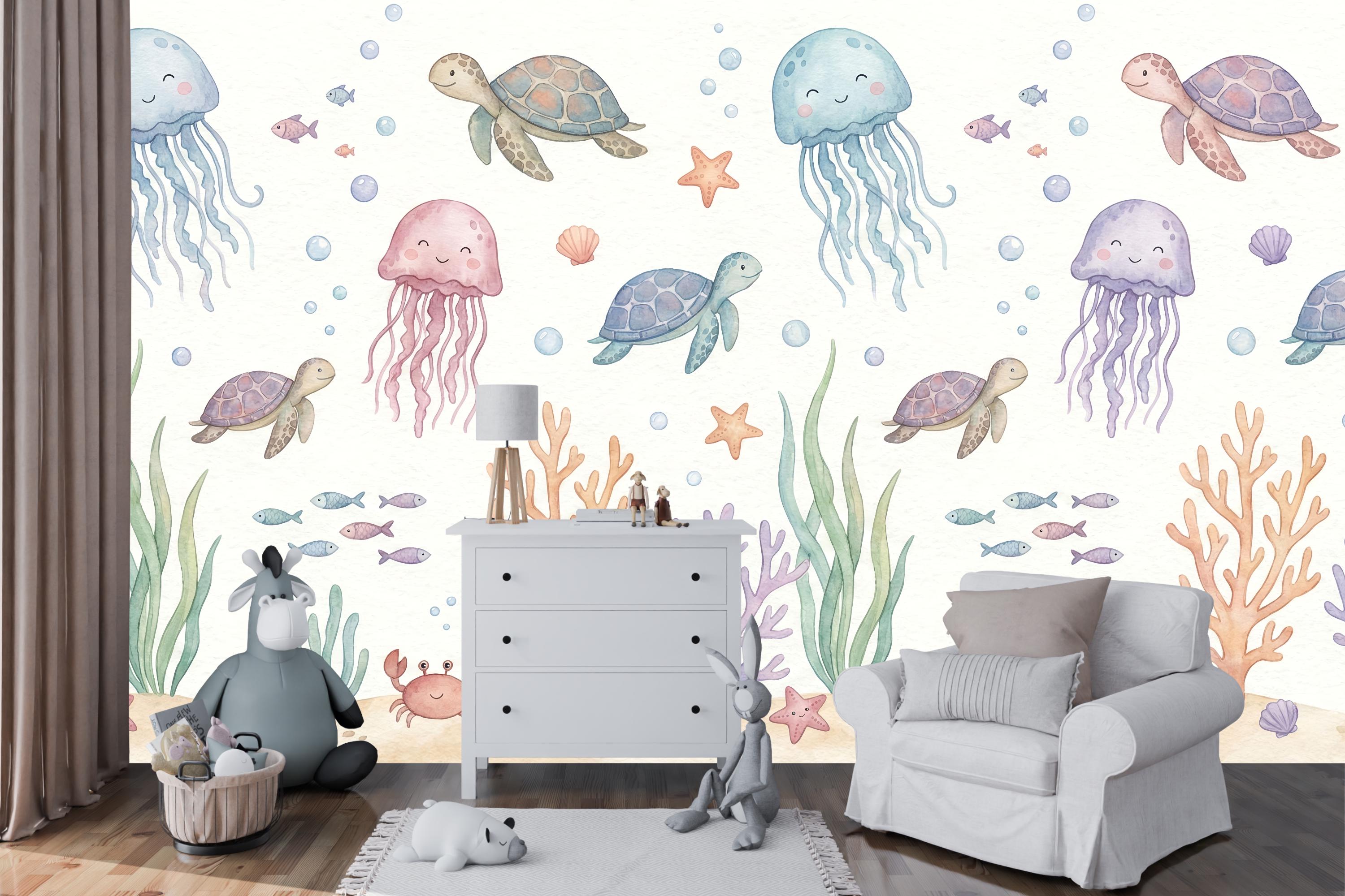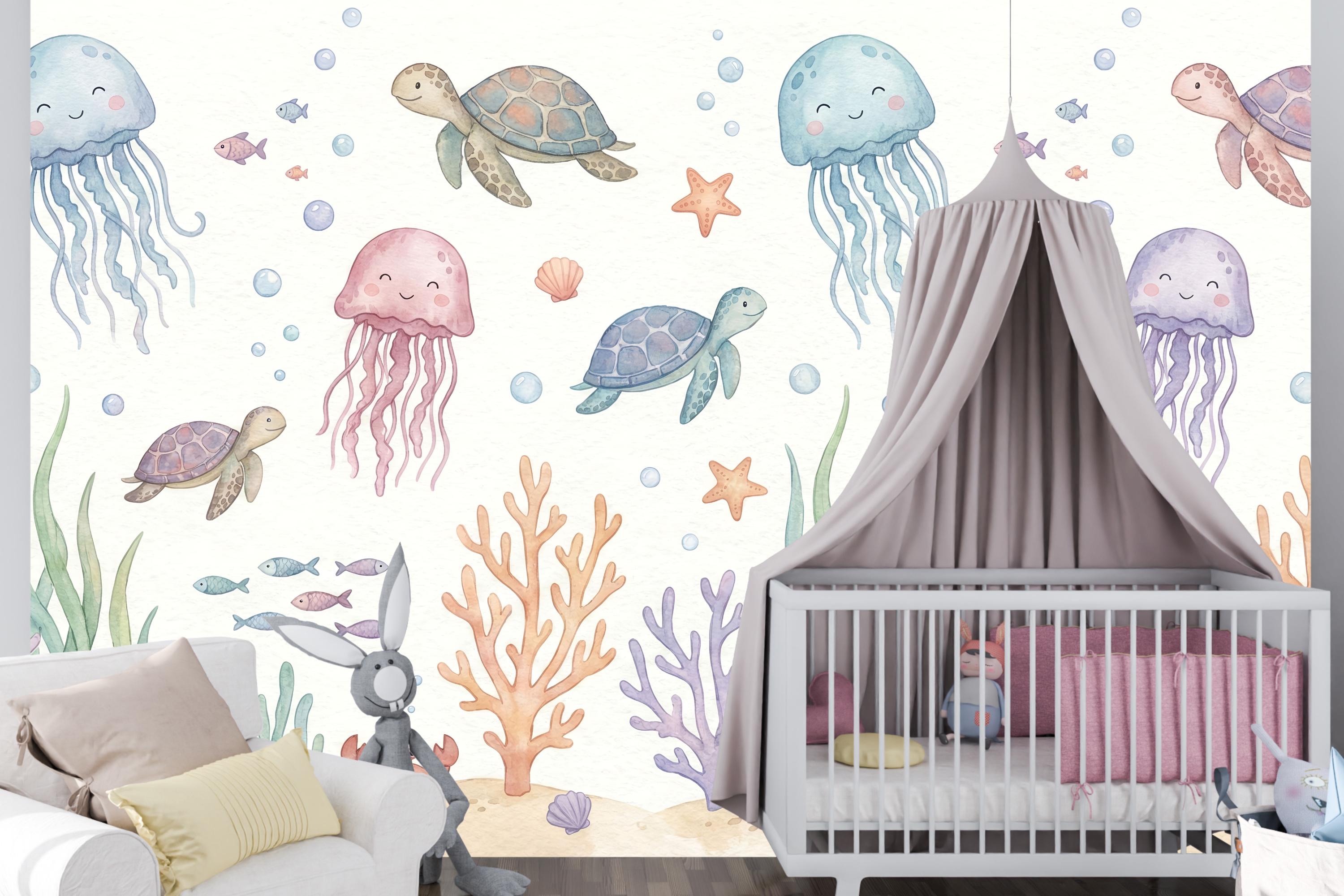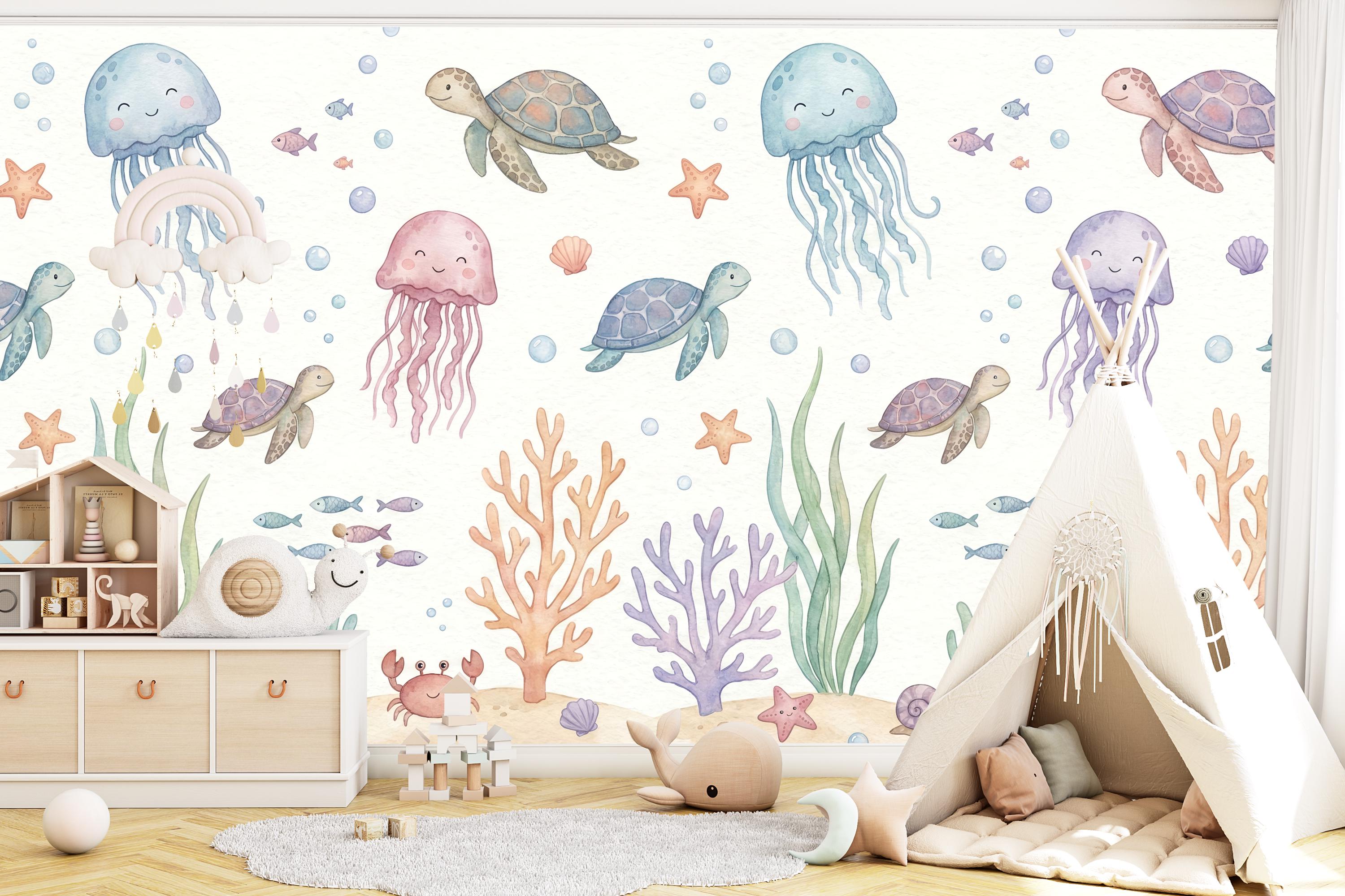 Imagine your child waking up to the friendly smiles of drifting jellyfish, gliding sea turtles, and busy little crabs. The soft pastel palette of calming blues, gentle pinks, and warm corals creates a soothing atmosphere perfect for sleep, play, and imagination. This isn't just wallpaper; it's the backdrop for your child's first adventures.