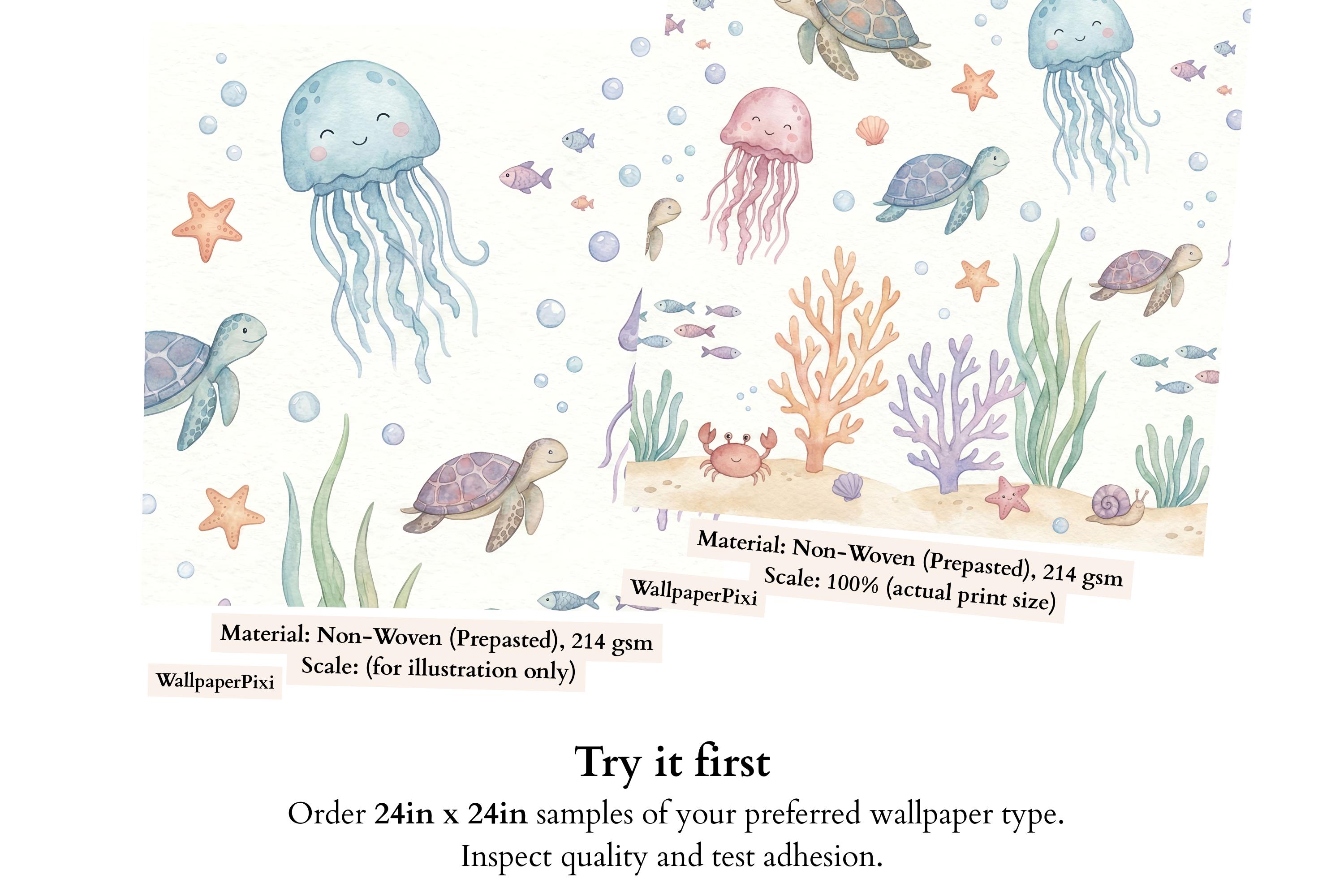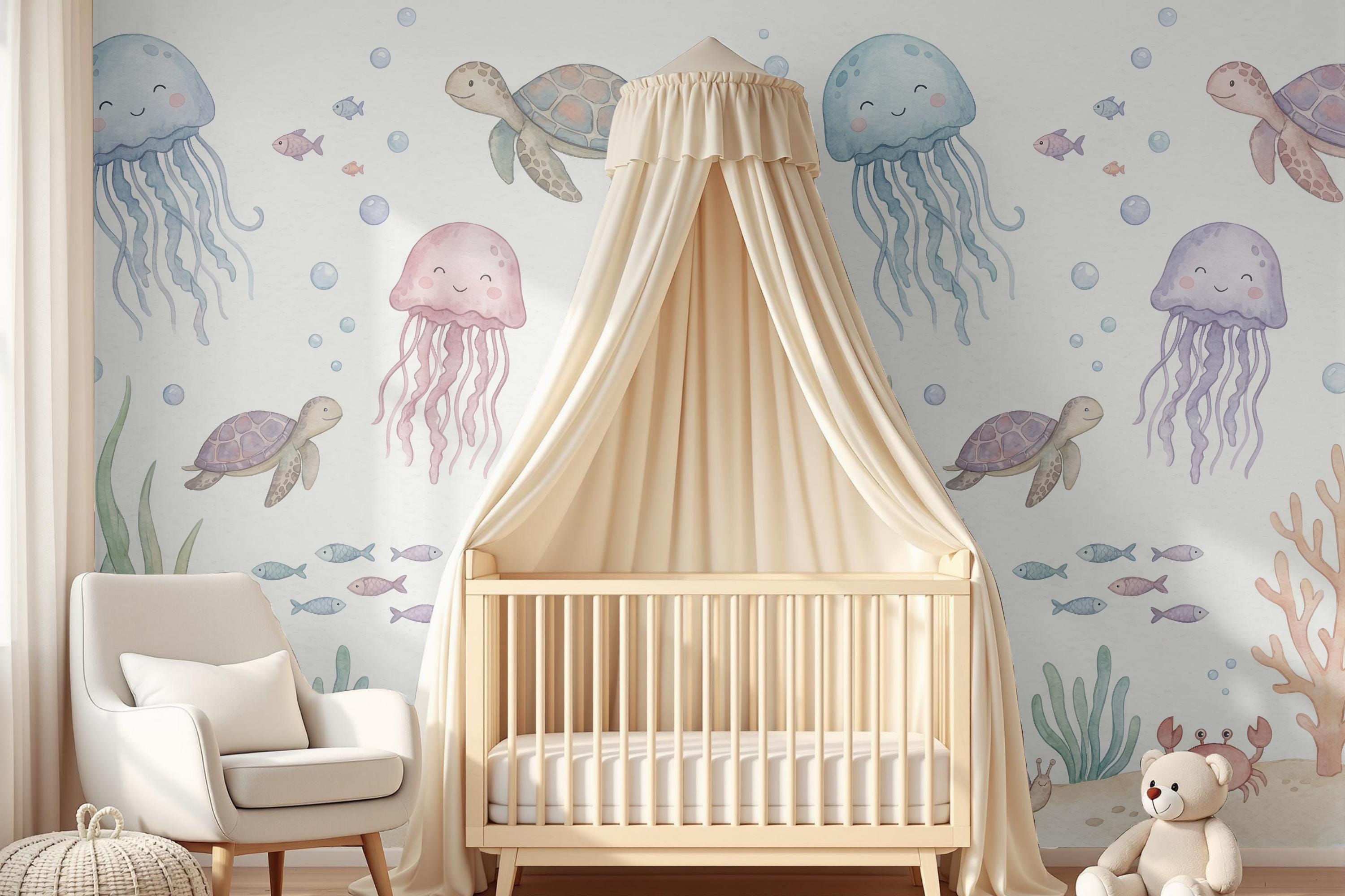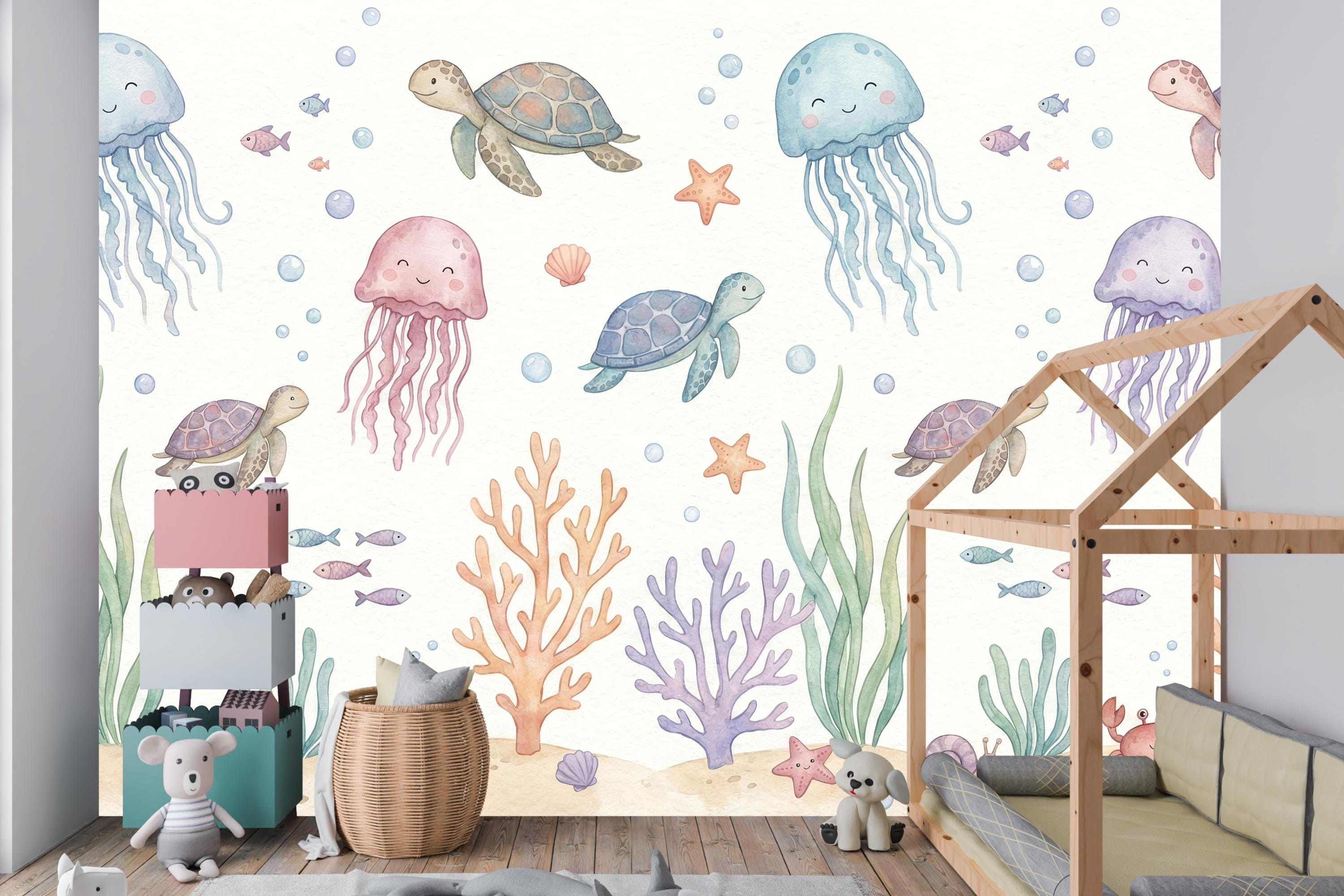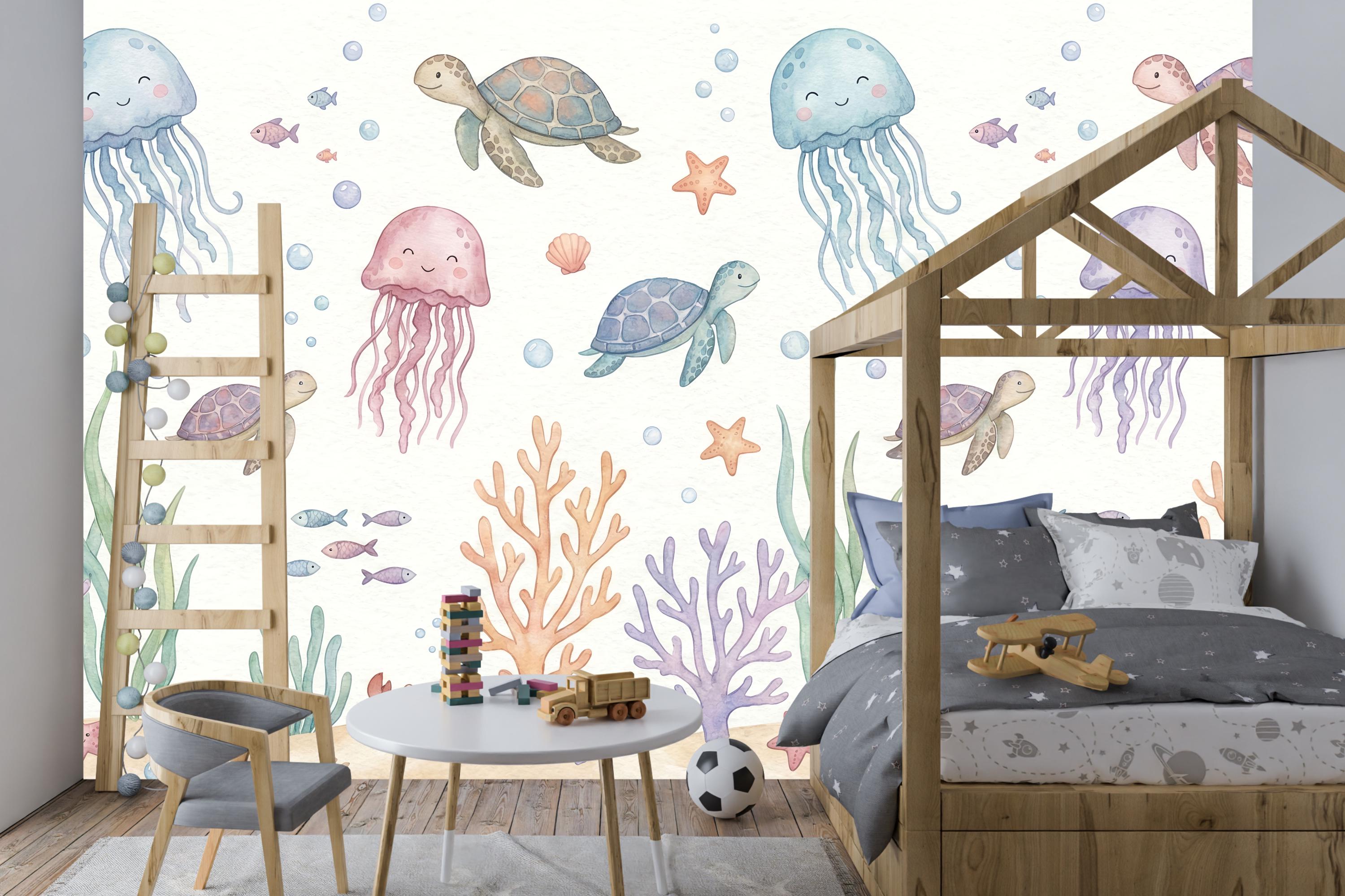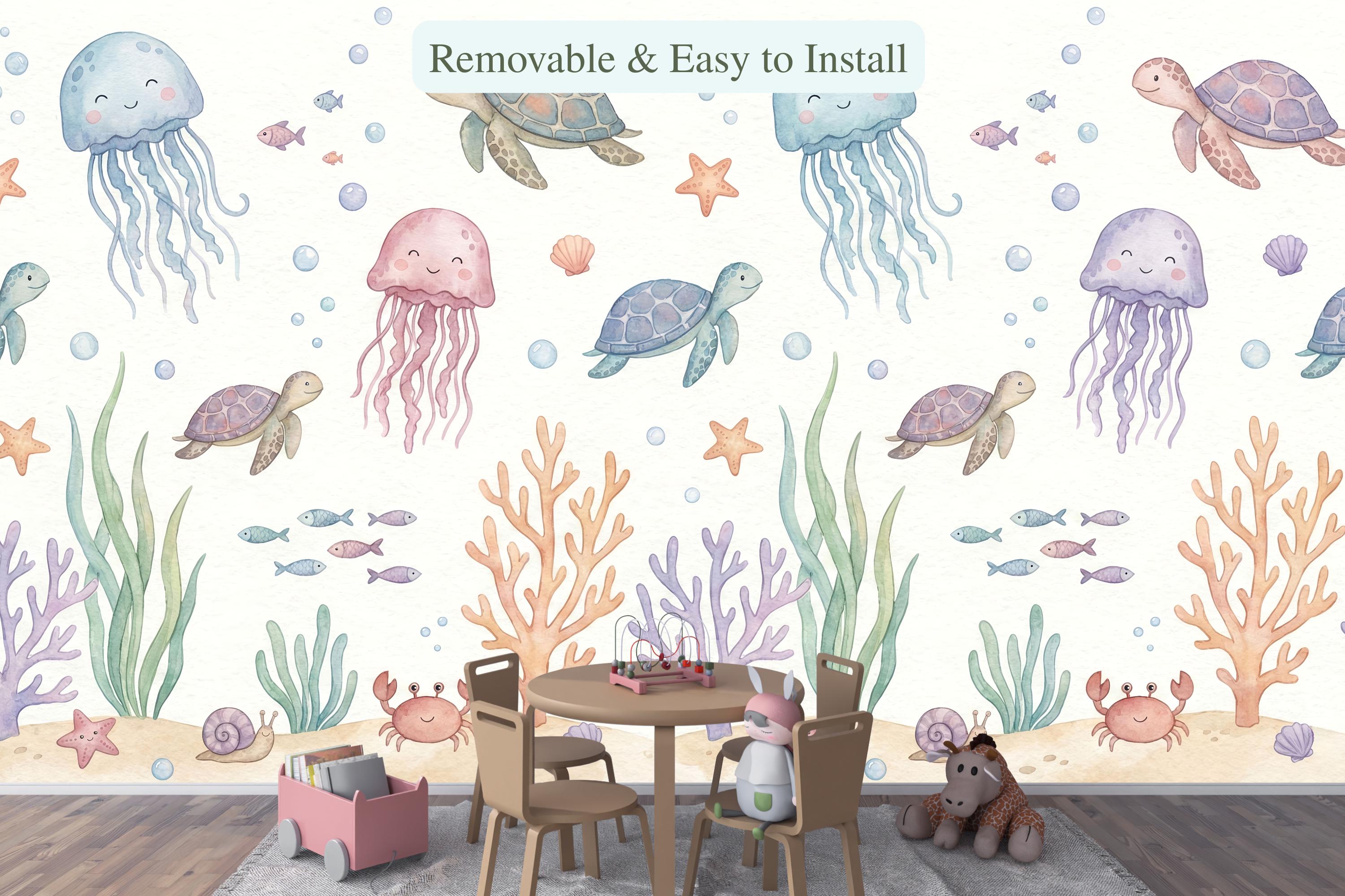 Imagine your child waking up to the friendly smiles of drifting jellyfish, gliding sea turtles, and busy little crabs. The soft pastel palette of calming blues, gentle pinks, and warm corals creates a soothing atmosphere perfect for sleep, play, and imagination. This isn't just wallpaper; it's the backdrop for your child's first adventures.