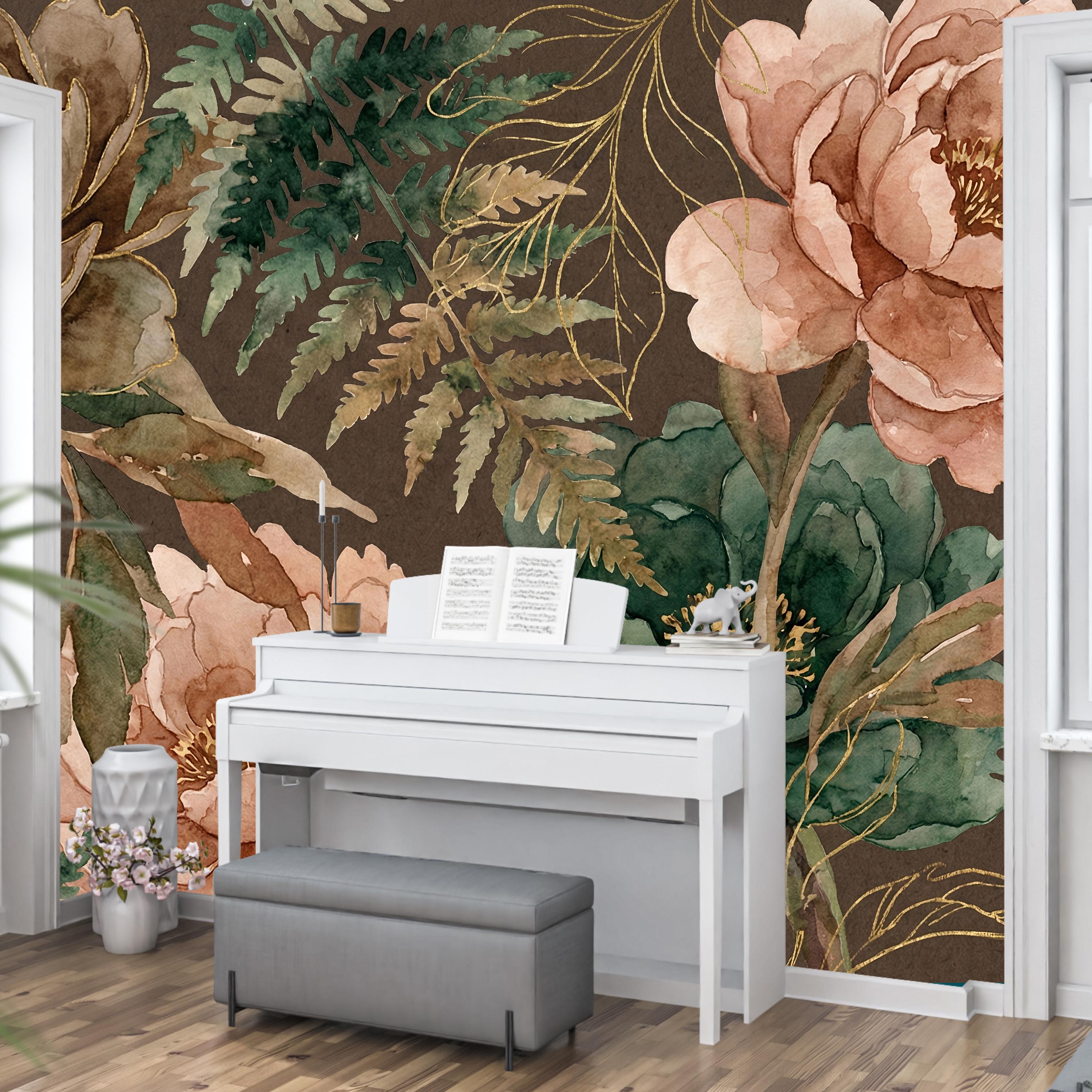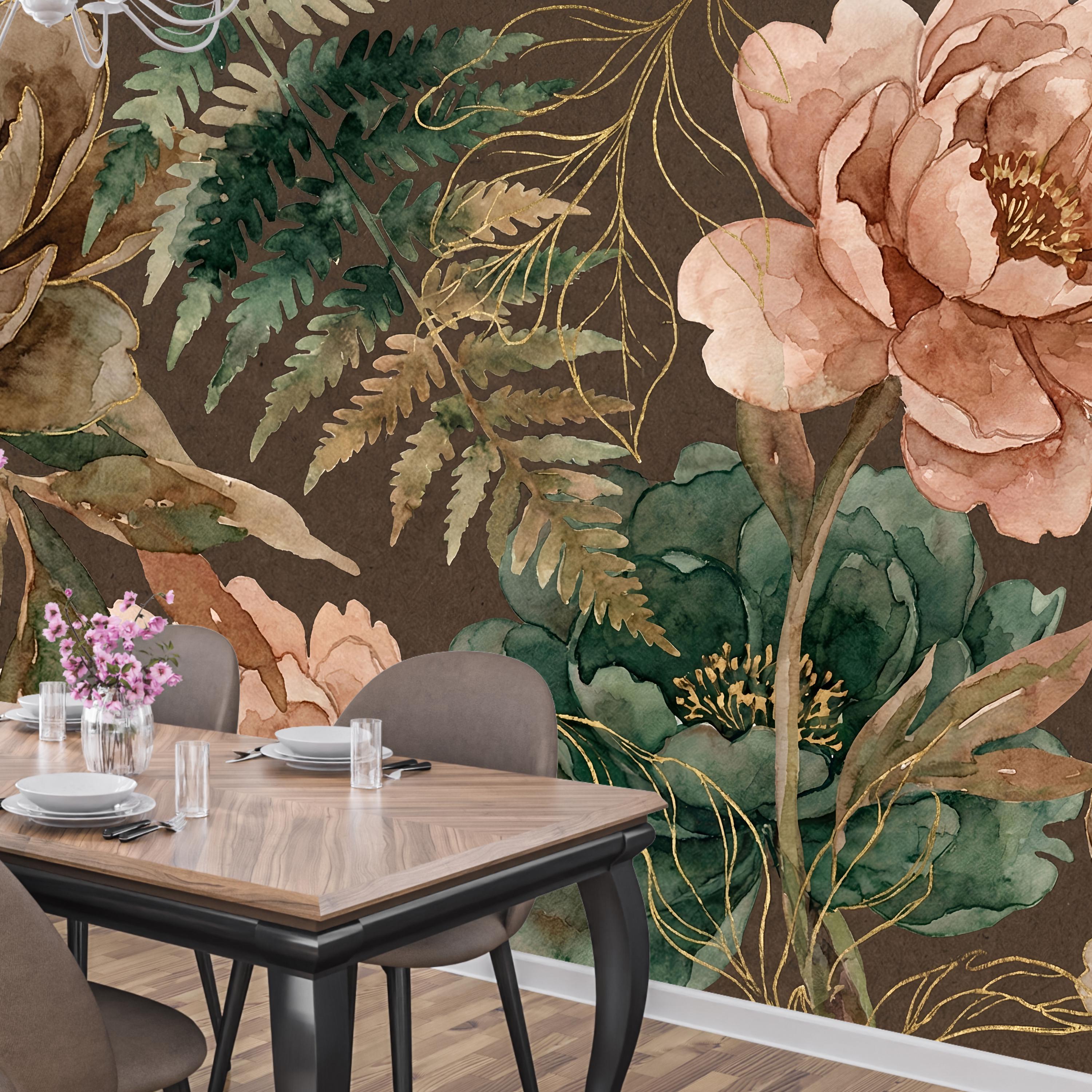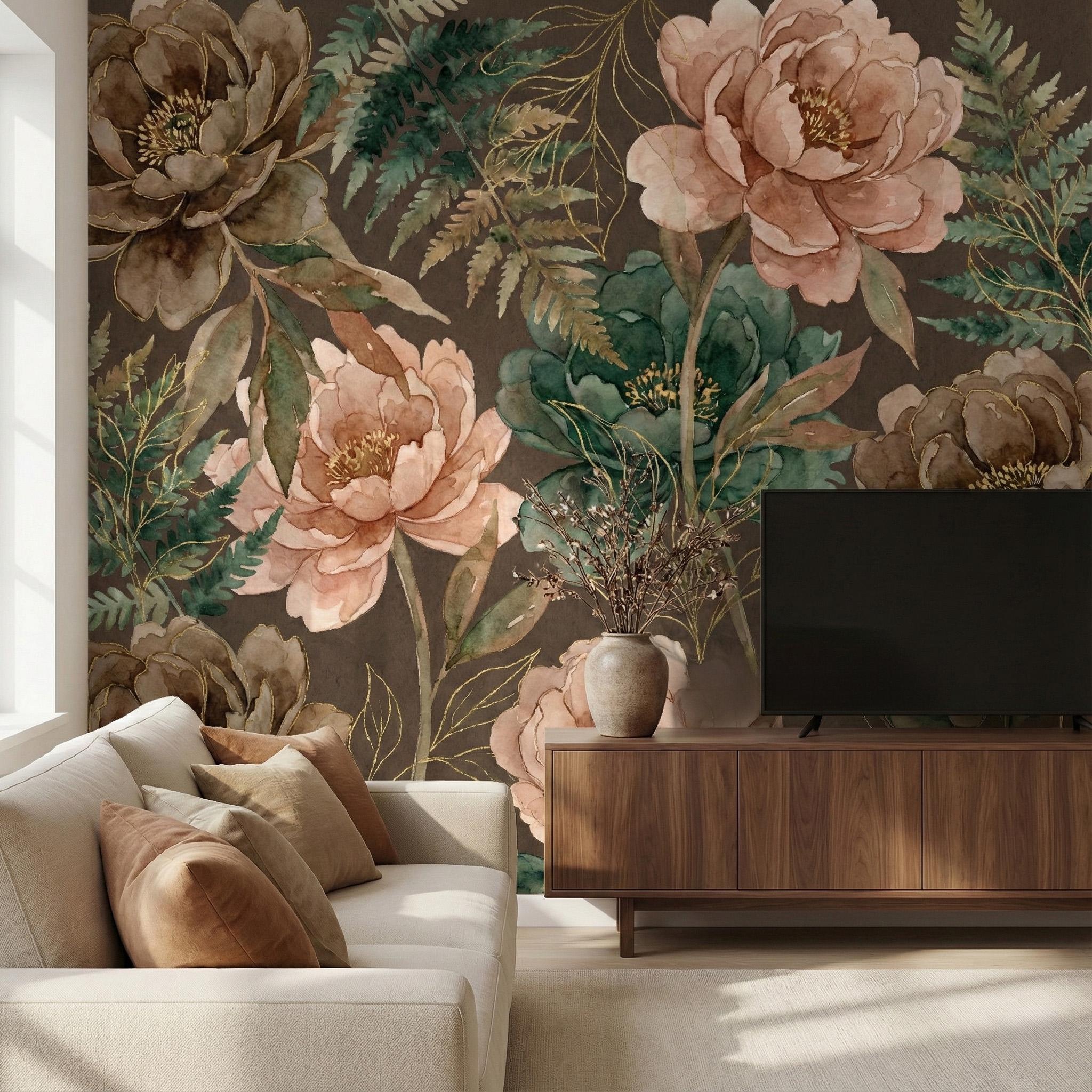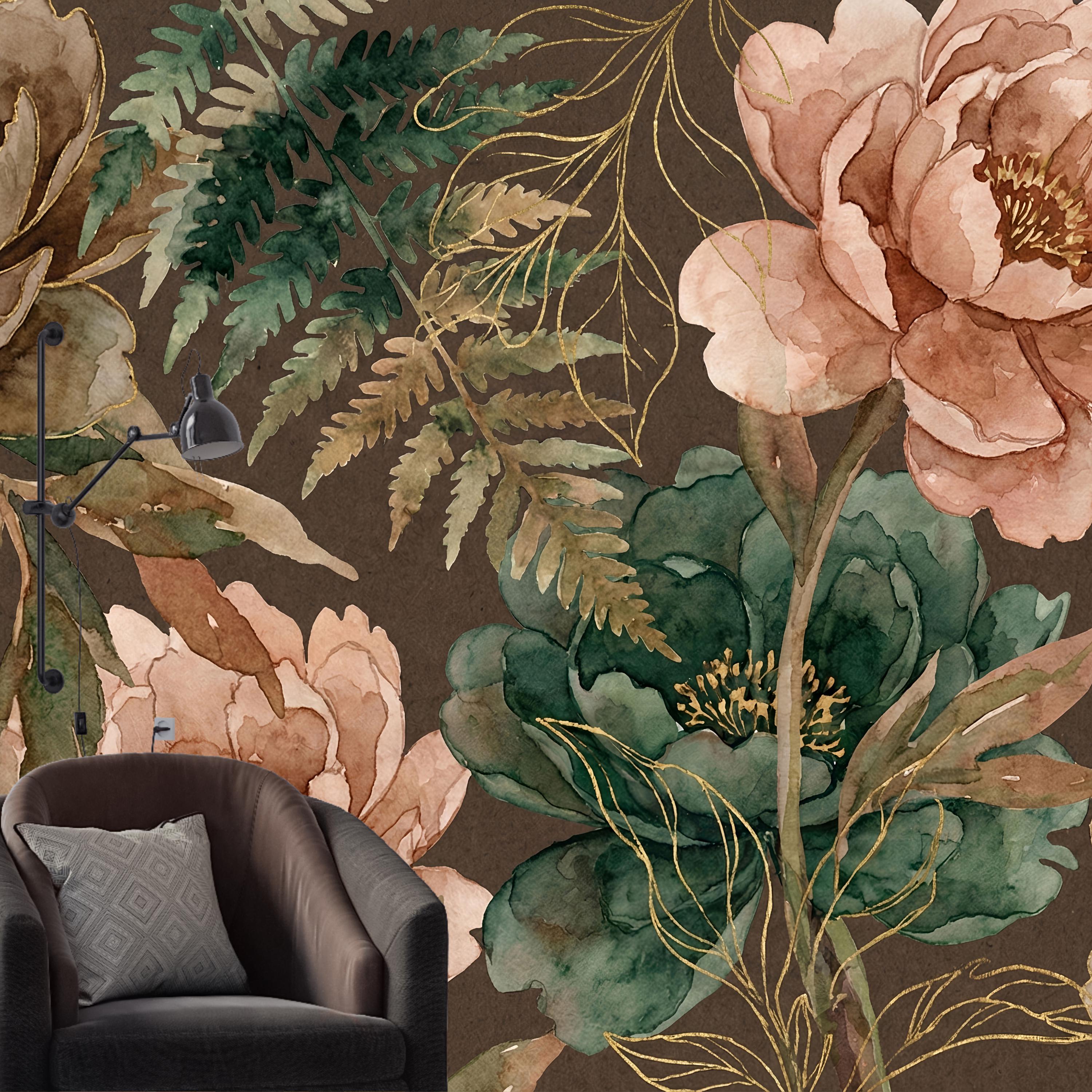 The artwork features a breathtaking Vintage Peony Mural with intricate gold line art details and lush foliage. The palette creates a warm Earth Tone Wallpaper effect, highlighted by large Dusty Pink Peony blooms that pop against the dark chocolate and bronze background. It is the definition of Luxury Wallpaper—bold, artistic, and timeless.