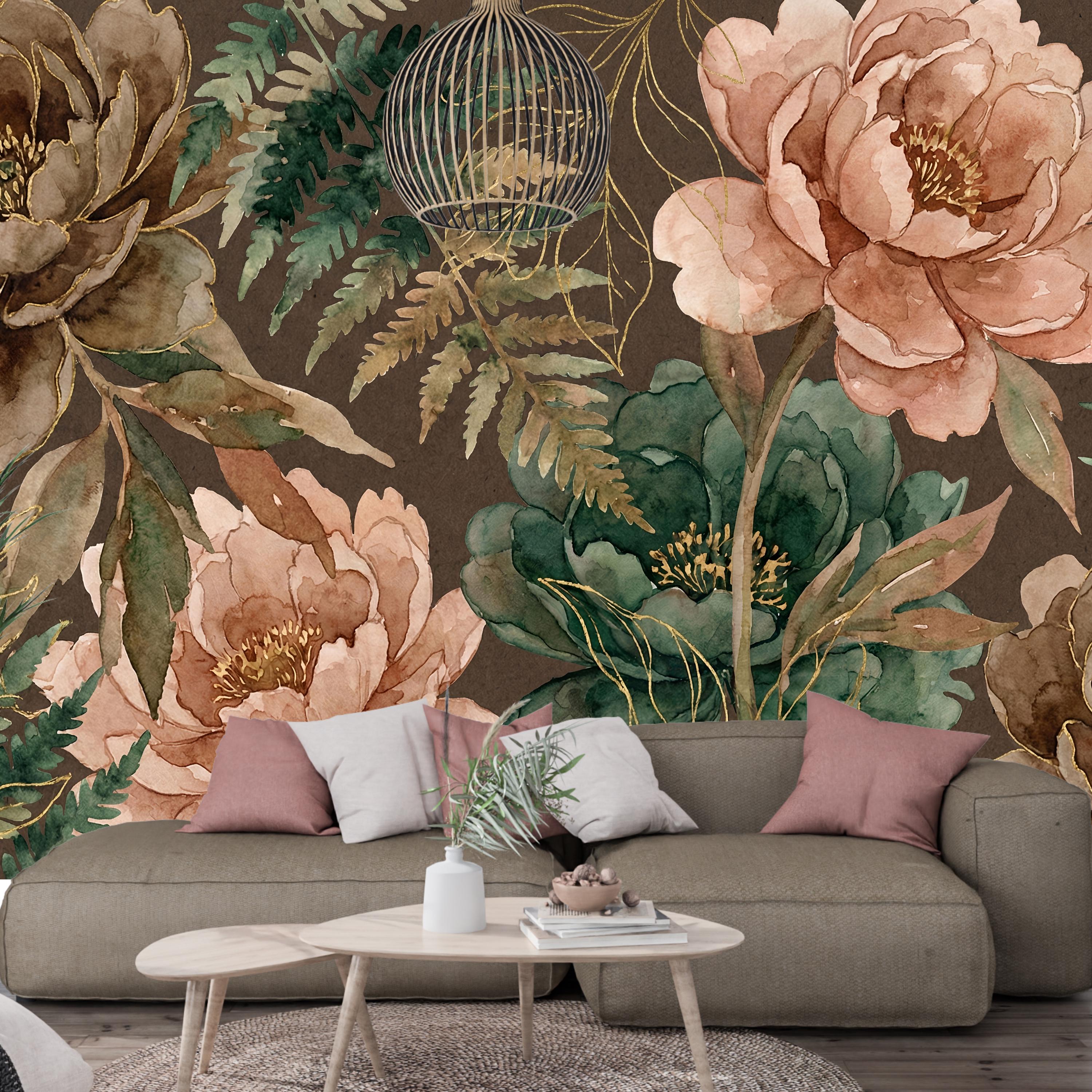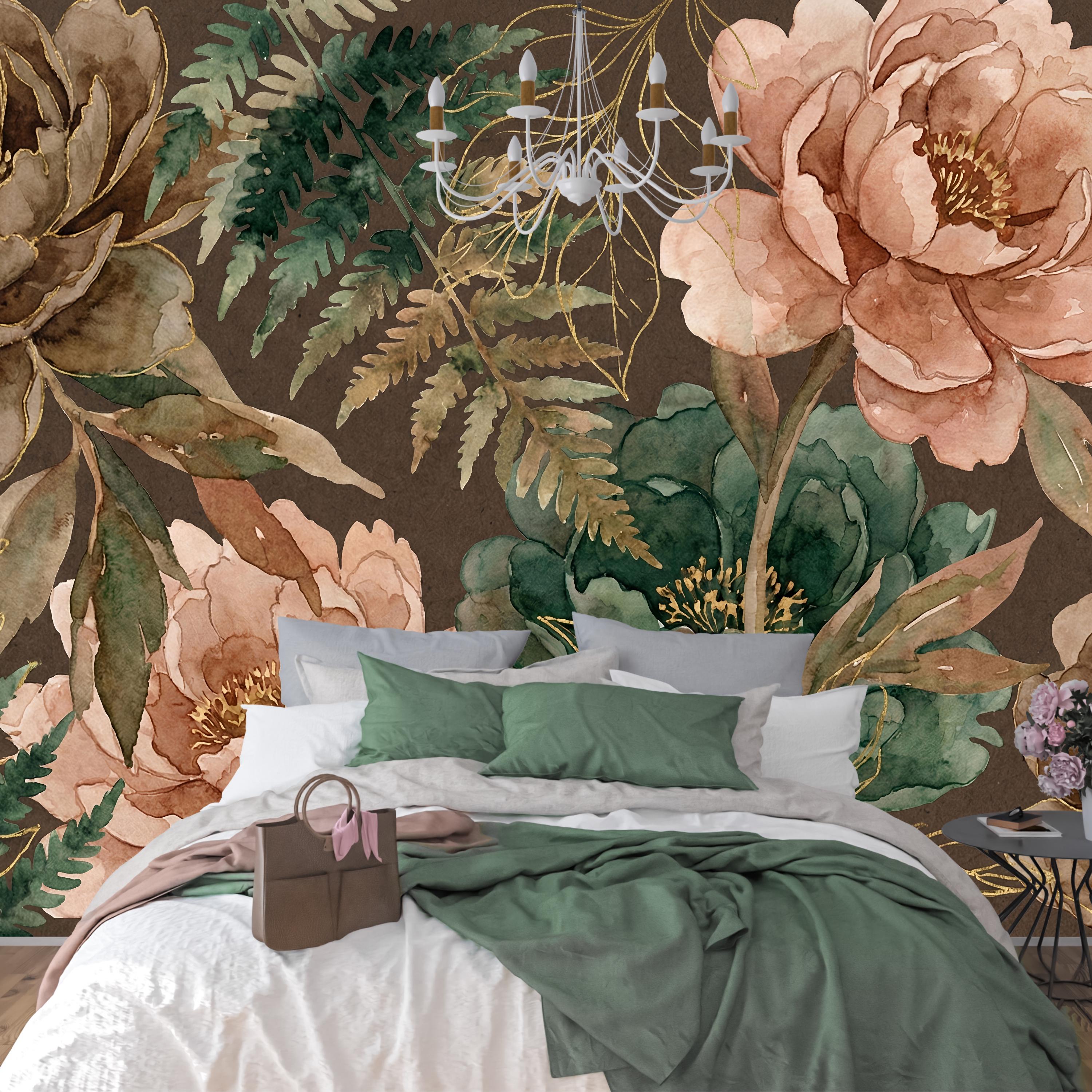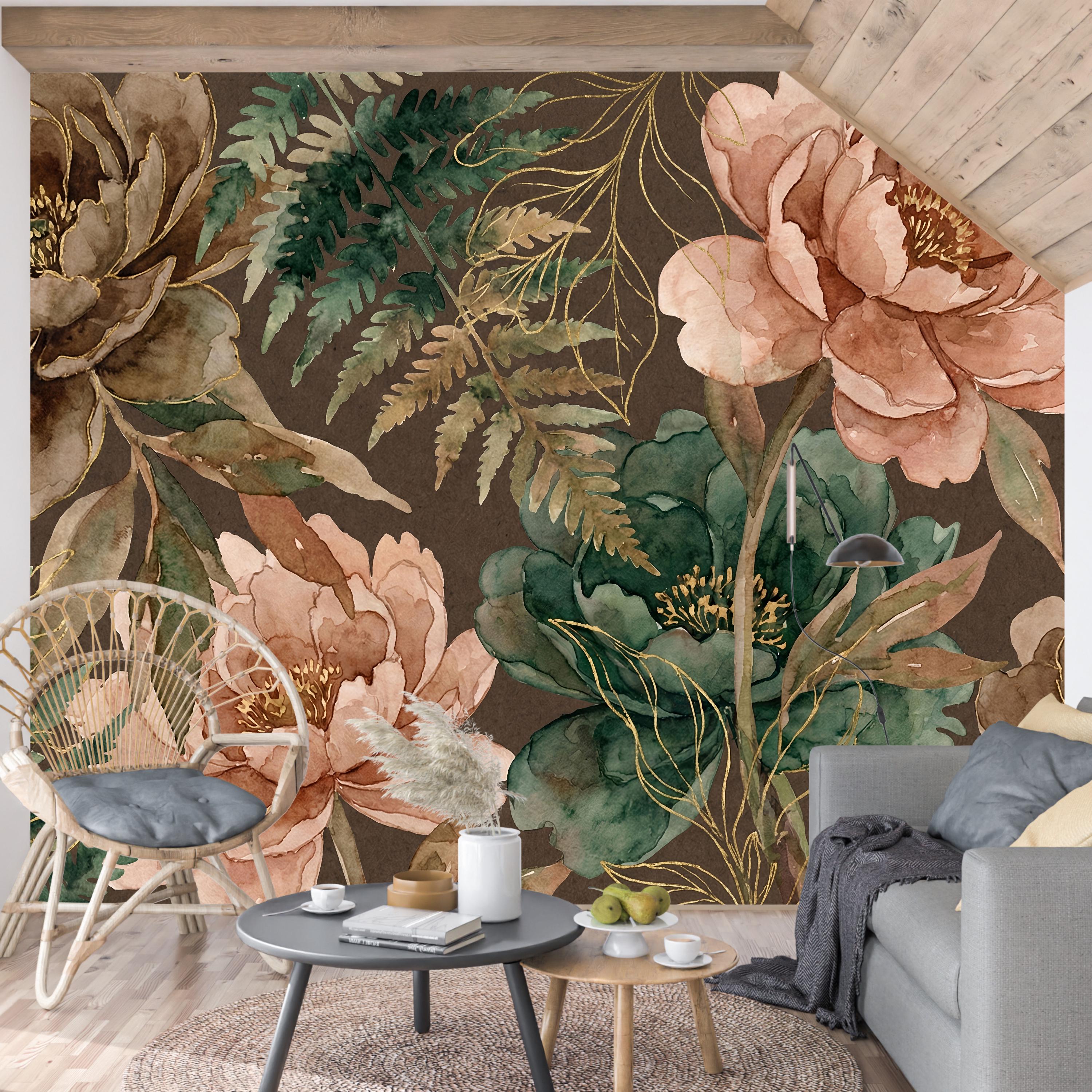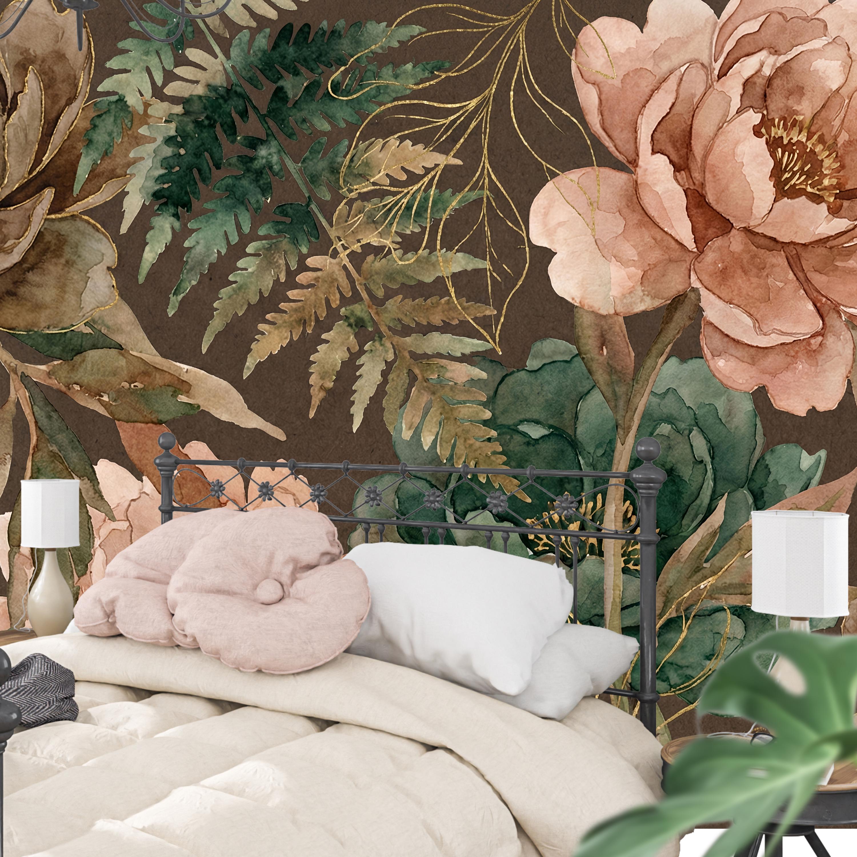 The artwork features a breathtaking Vintage Peony Mural with intricate gold line art details and lush foliage. The palette creates a warm Earth Tone Wallpaper effect, highlighted by large Dusty Pink Peony blooms that pop against the dark chocolate and bronze background. It is the definition of Luxury Wallpaper—bold, artistic, and timeless.